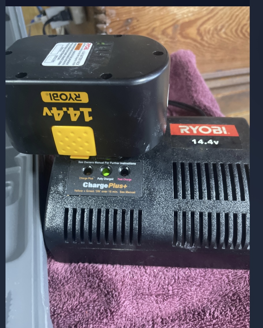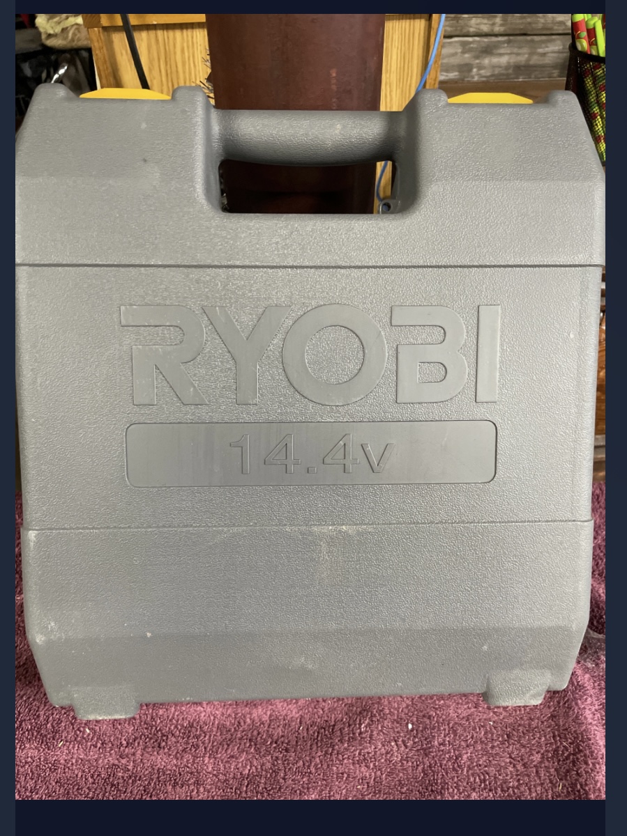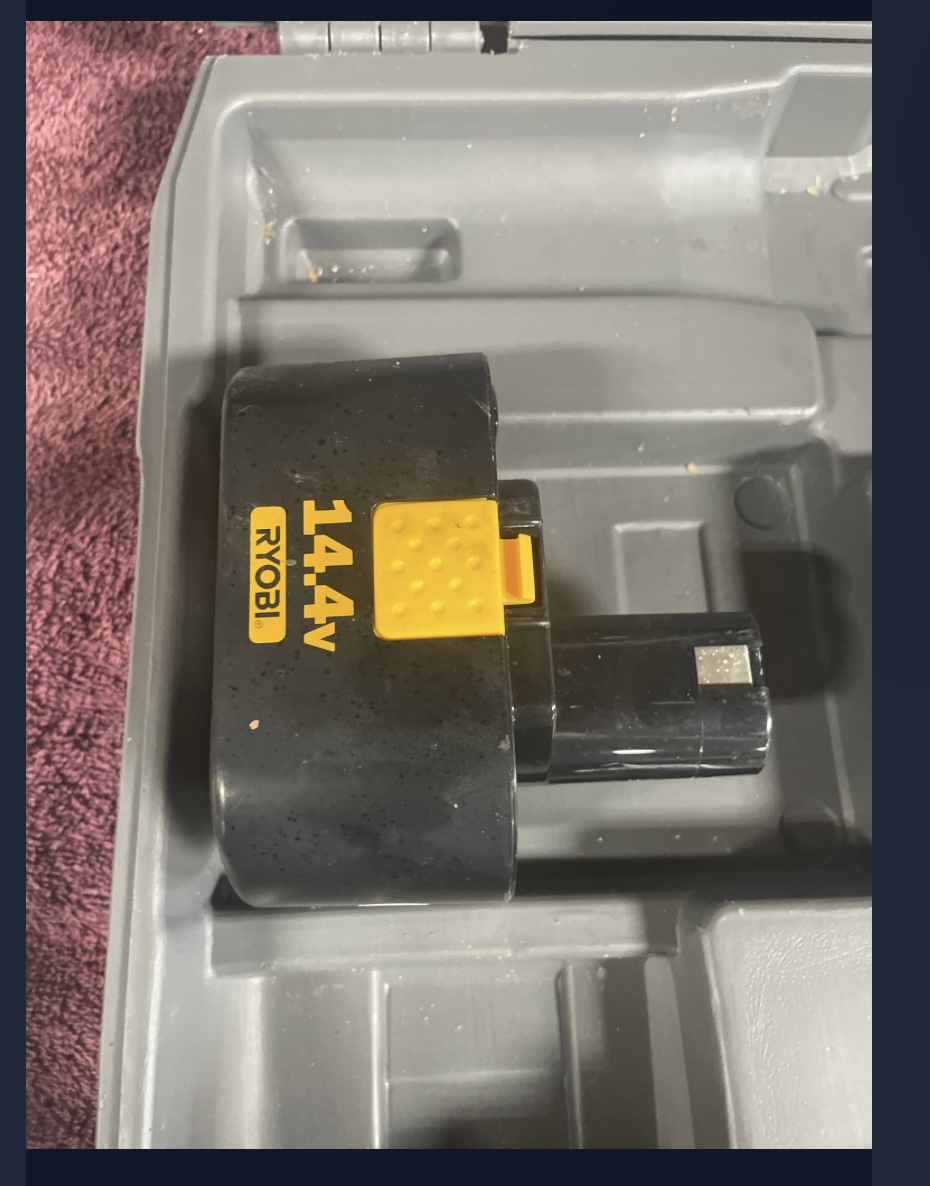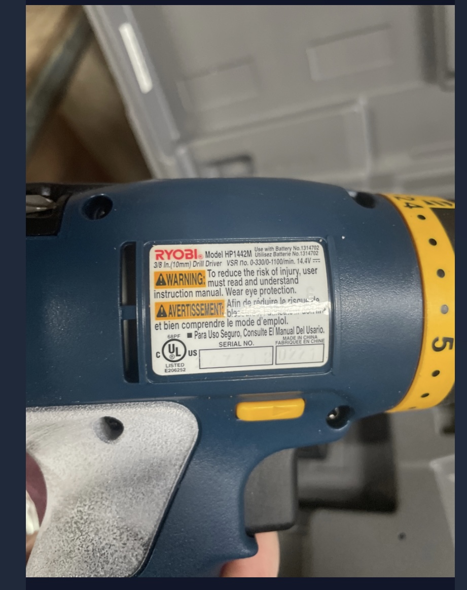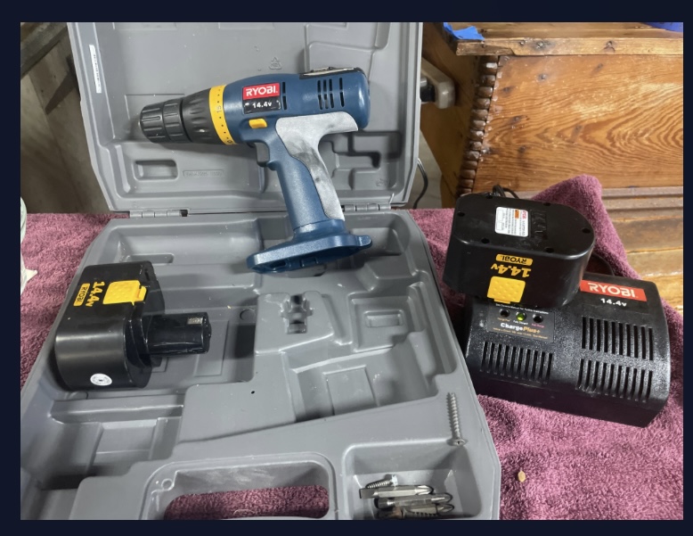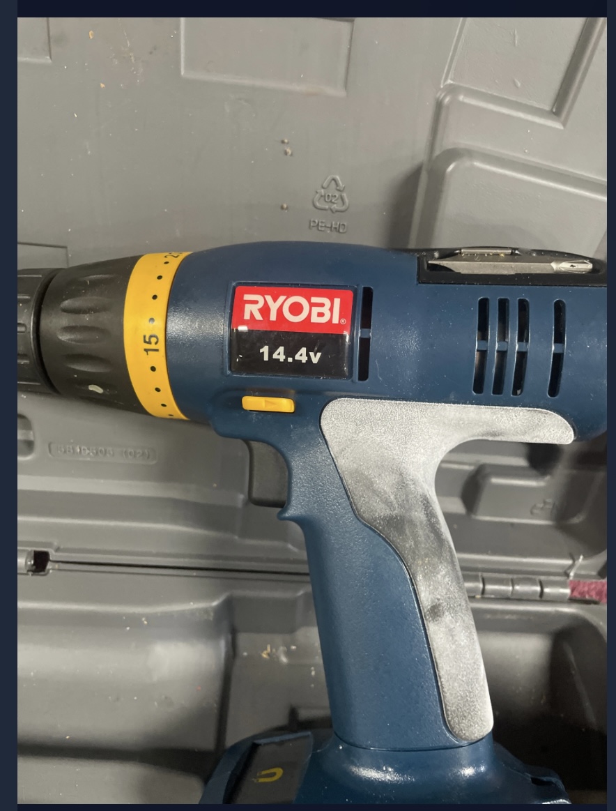 A blue and grey Ryobi Model HP1442M 14.4V 3/8 in. (10mm) Drill Driver with two 14.4V batteries, a 14.4V ChargePlus+ charger, and a grey 14.4V carrying case.