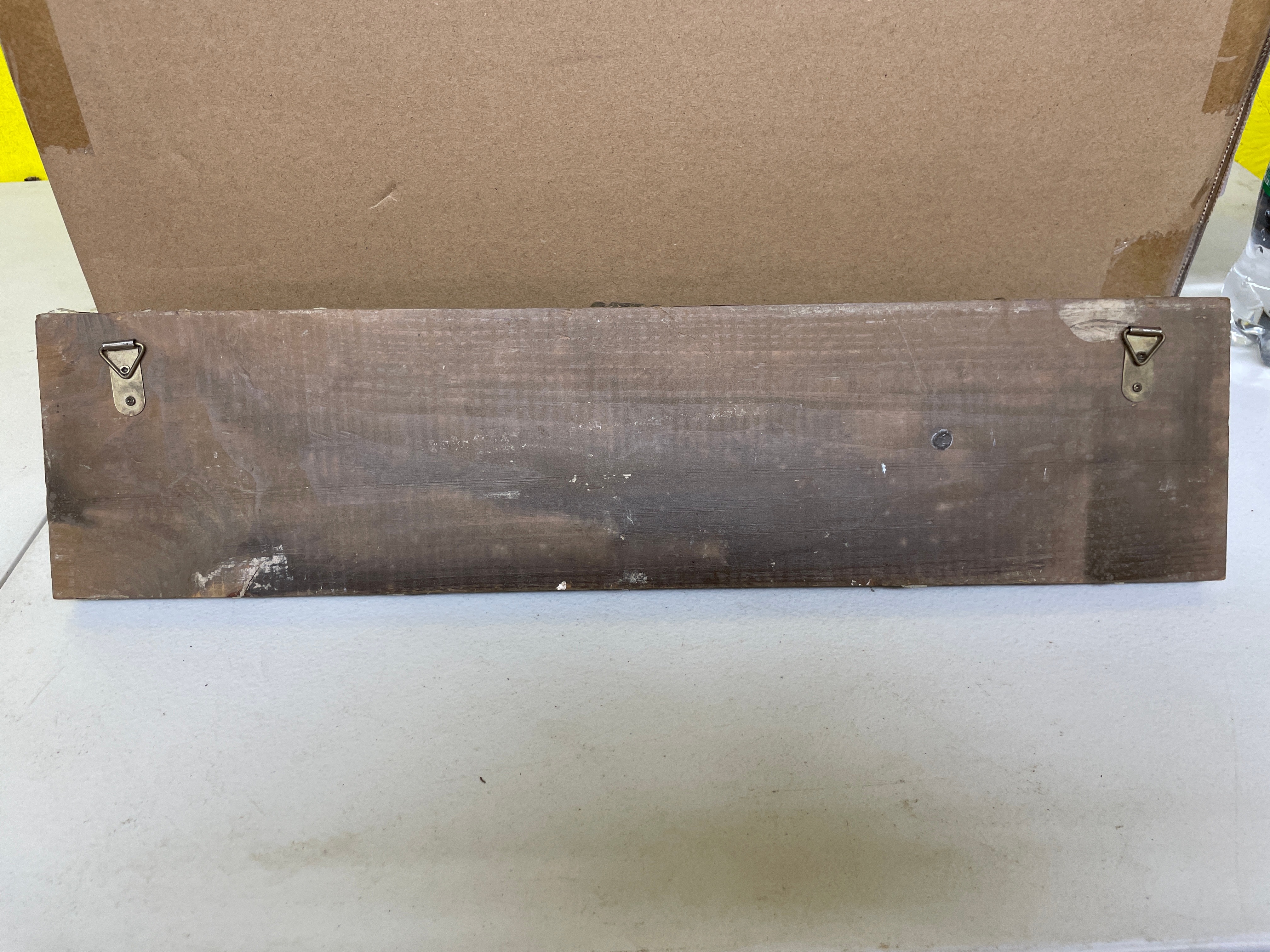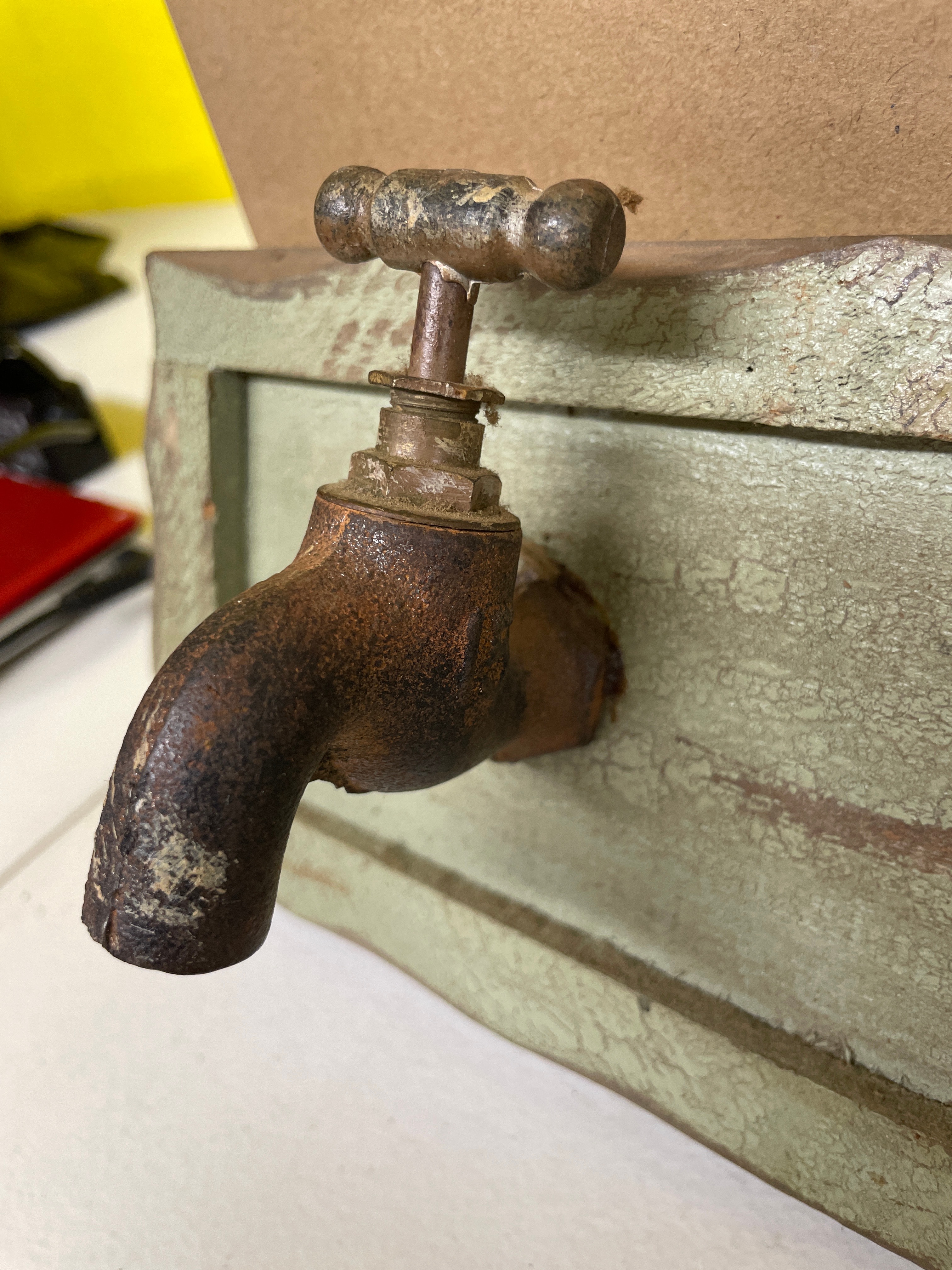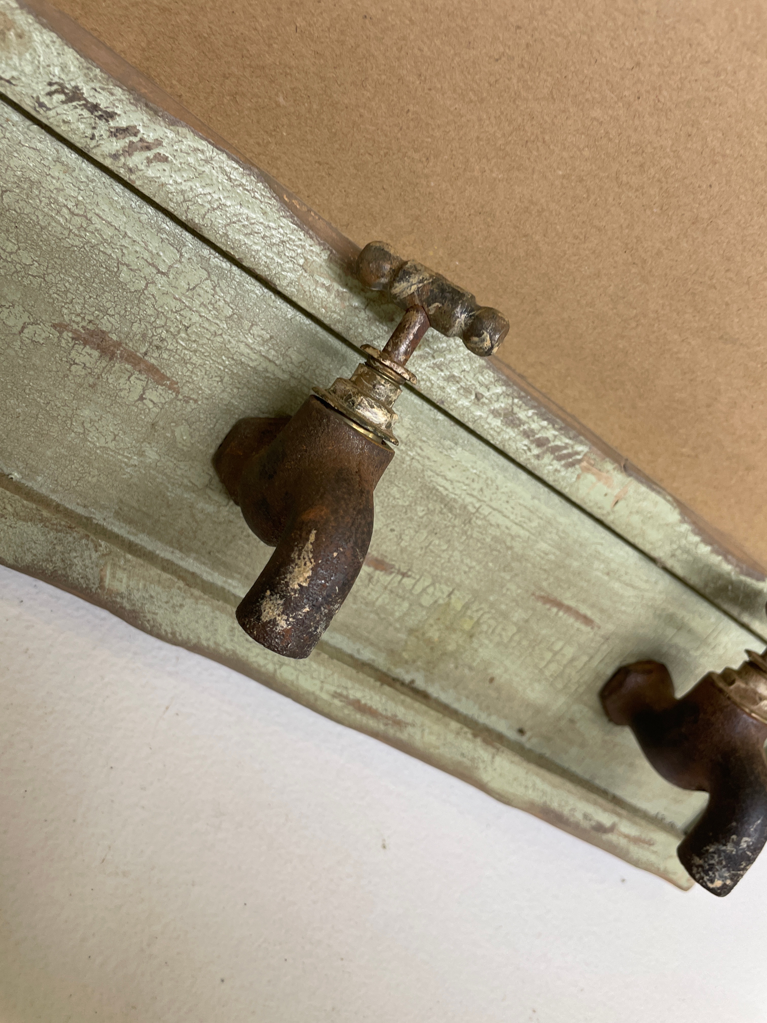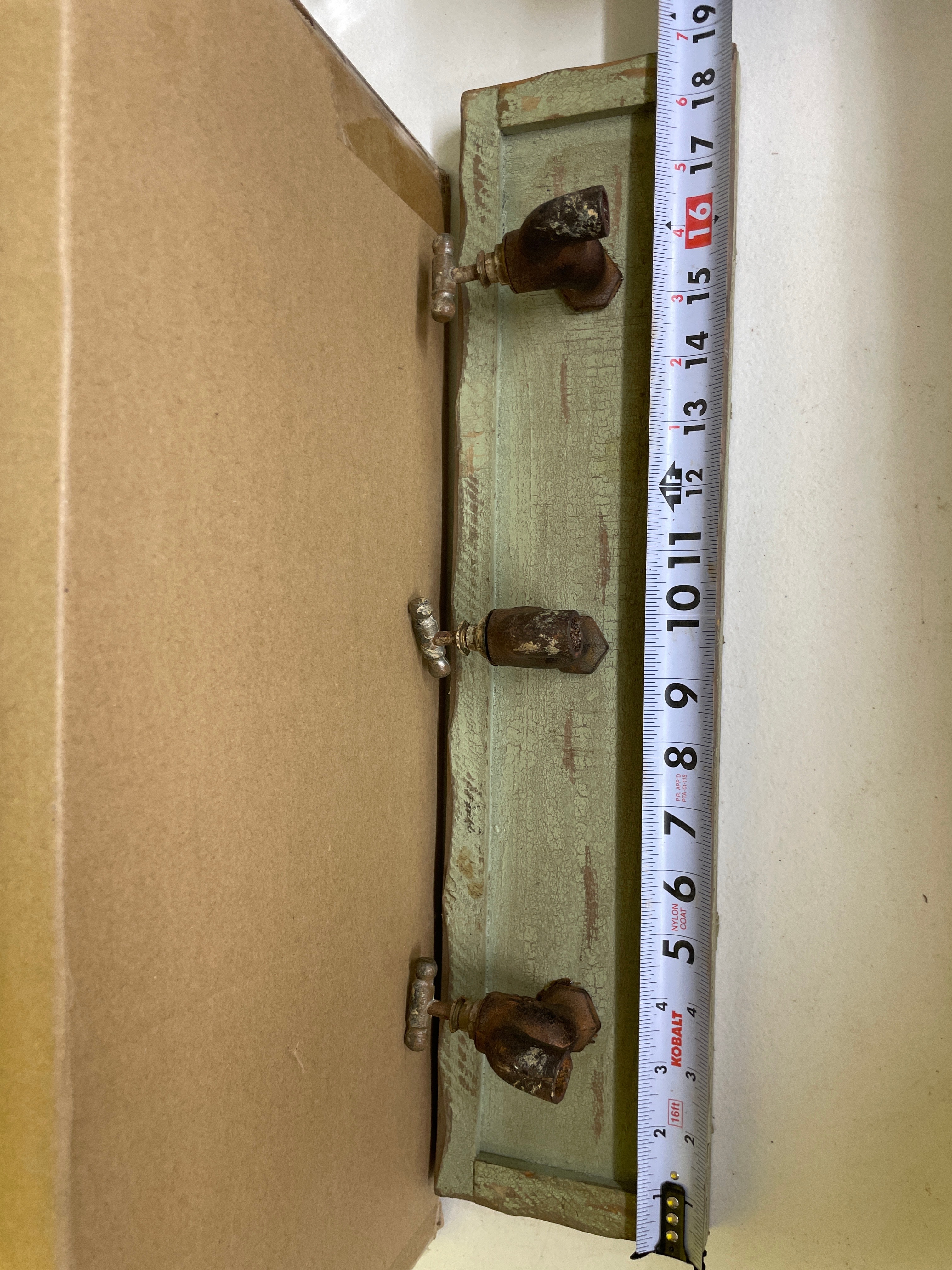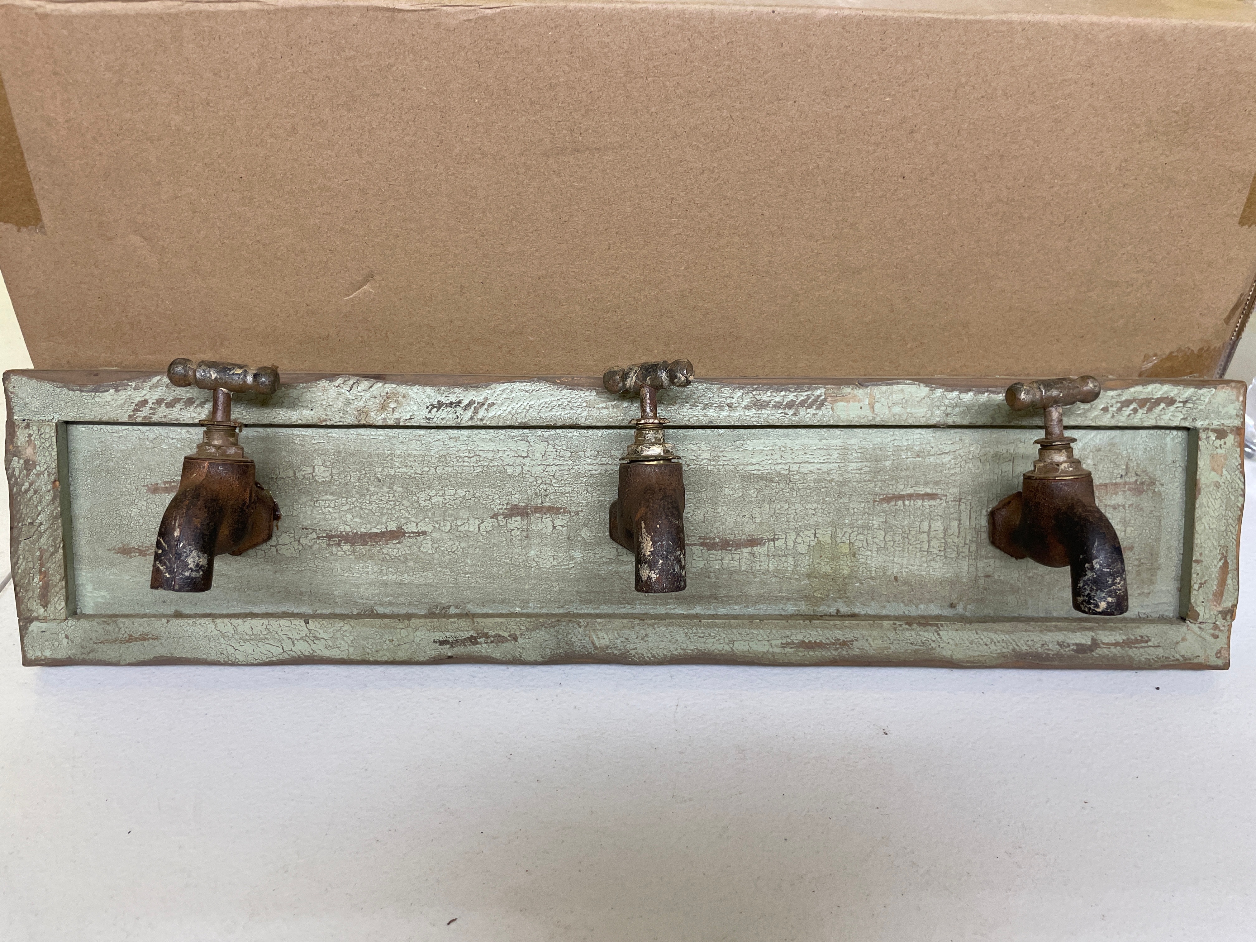 A single rustic wall rack, featuring a distressed light green wooden board with three brown metal spigots serving as hooks, measuring approximately 18.5 x 4.5 inches.
