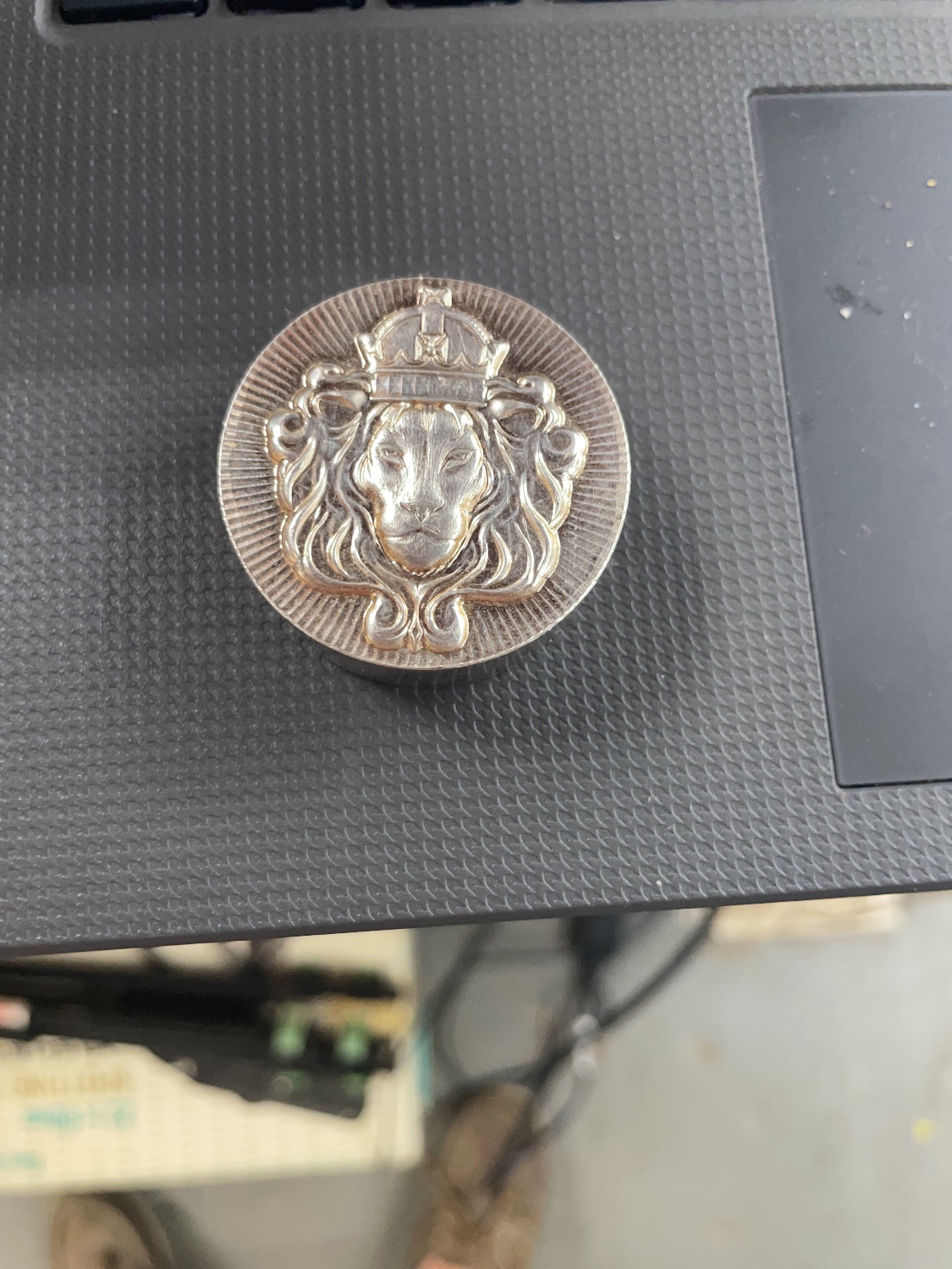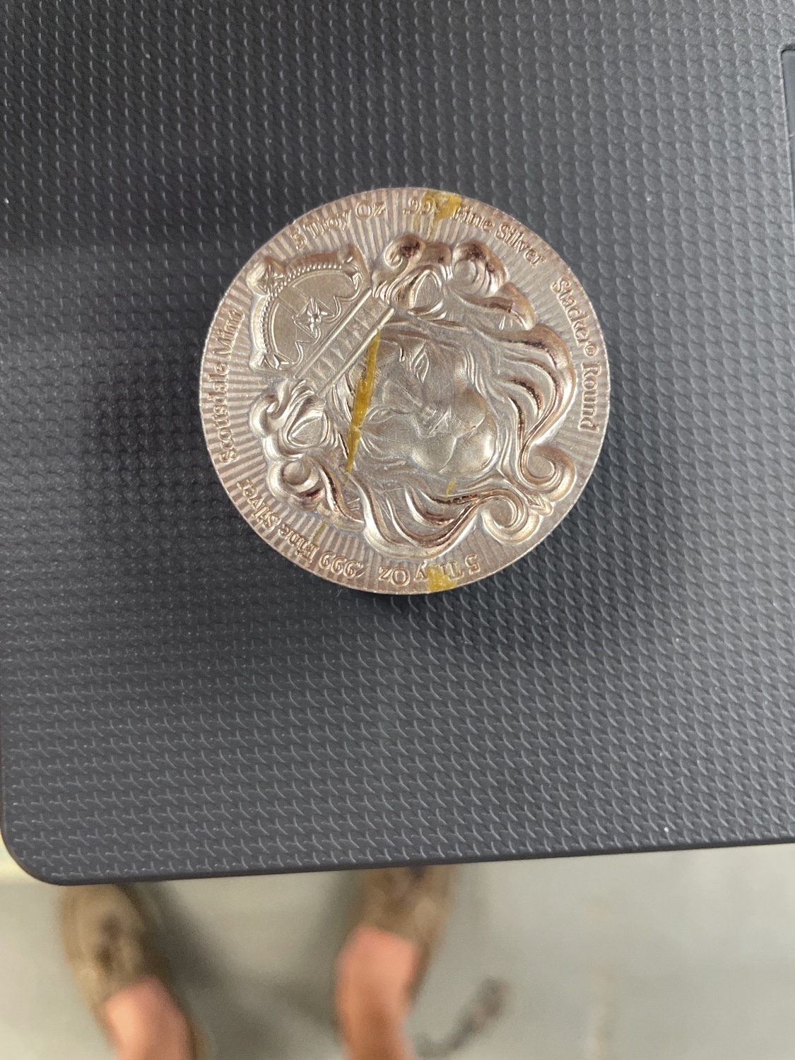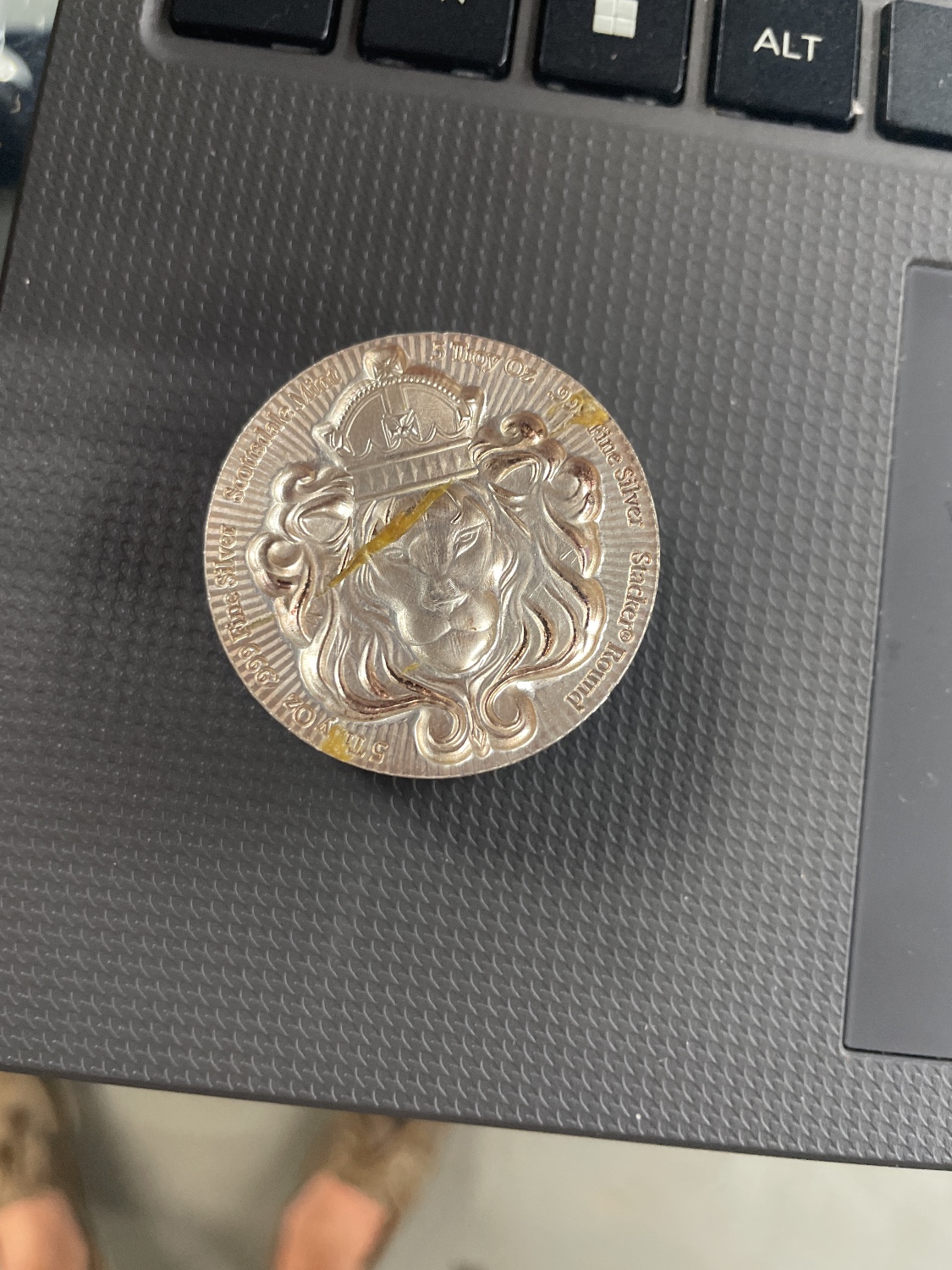 A silver-colored round depicting a crowned lion’s head, inscribed “SHINNING MINT 5 OZ 999 Fine Silver Stackers Round” and “2020”.