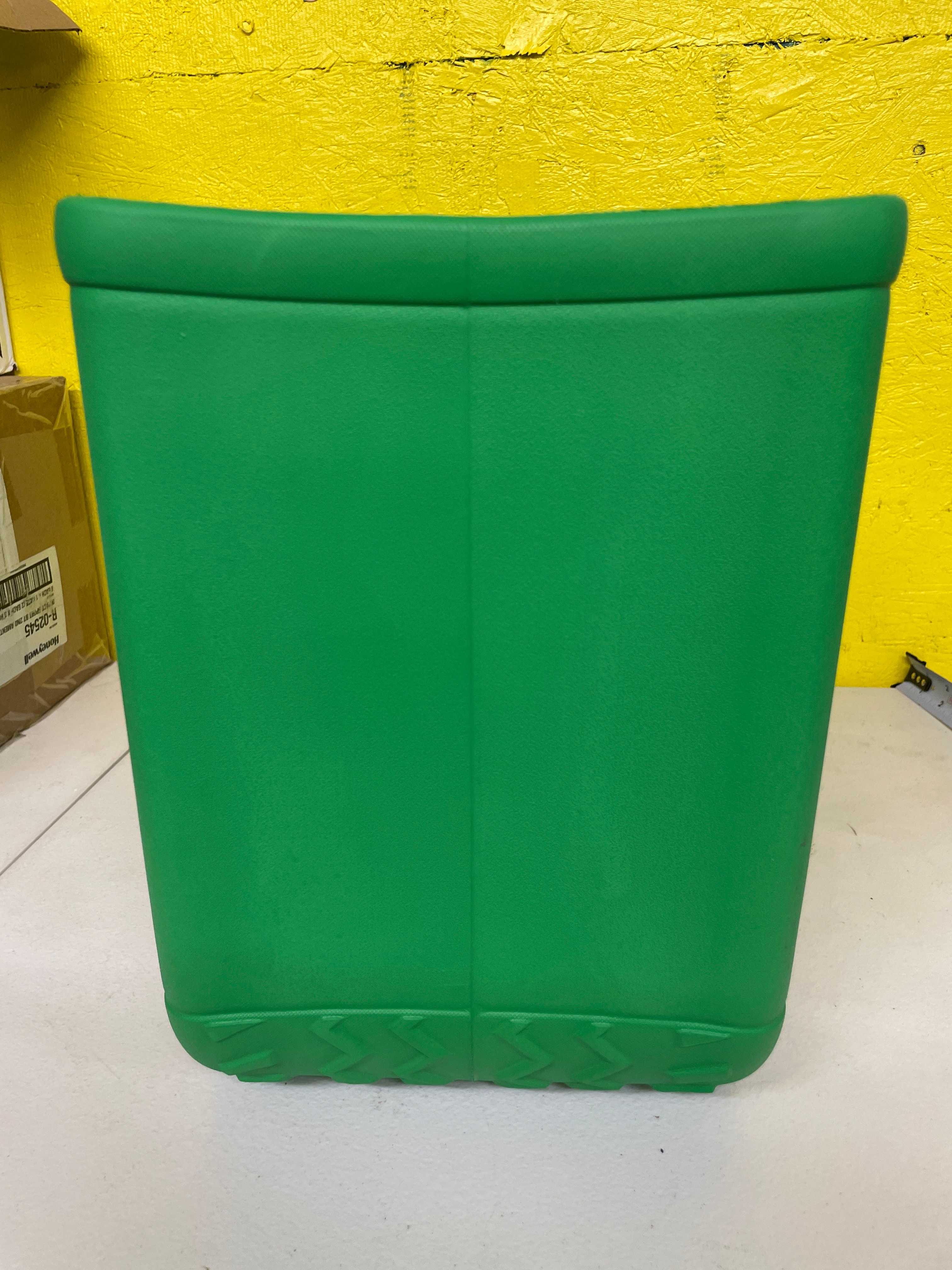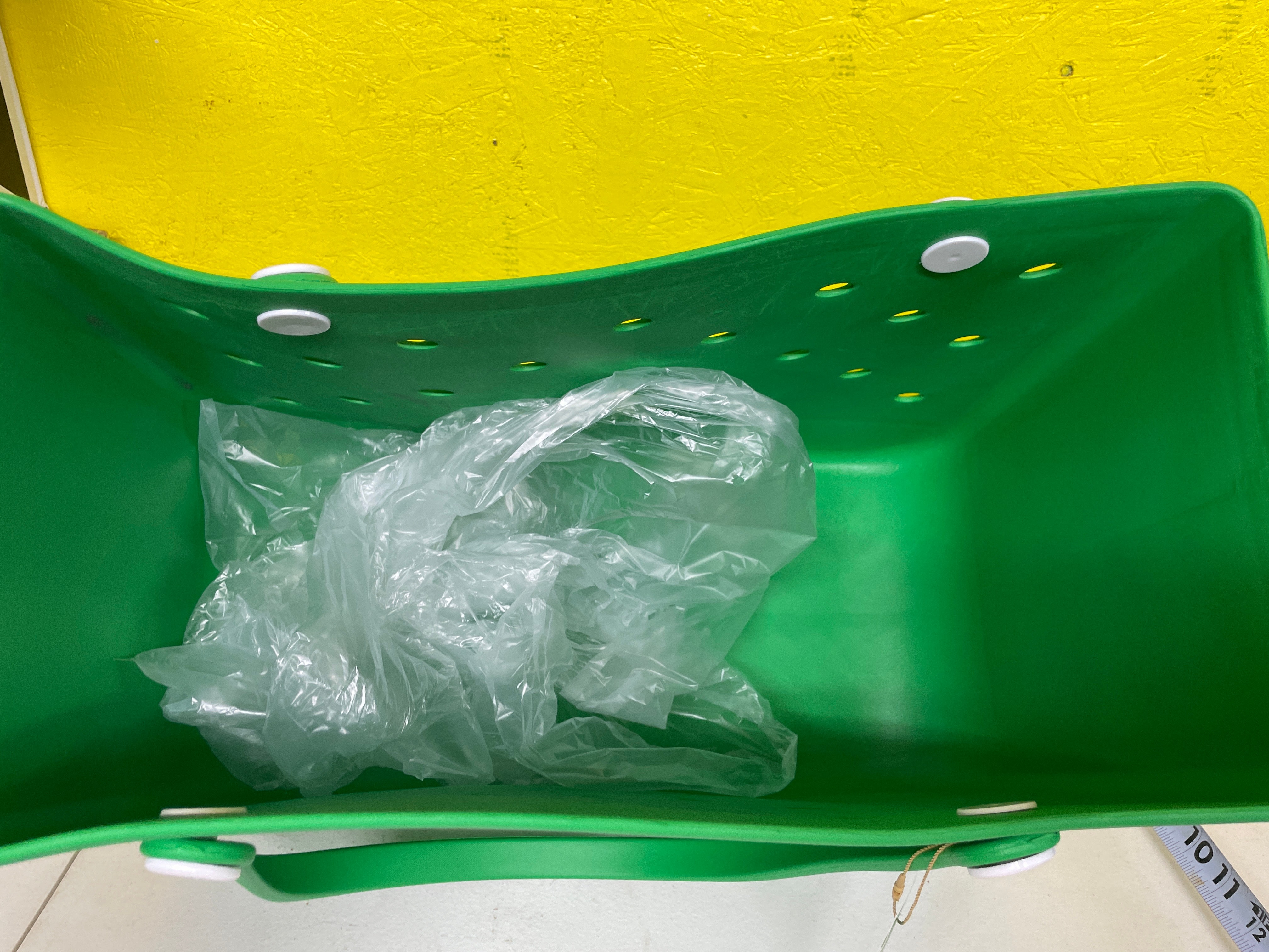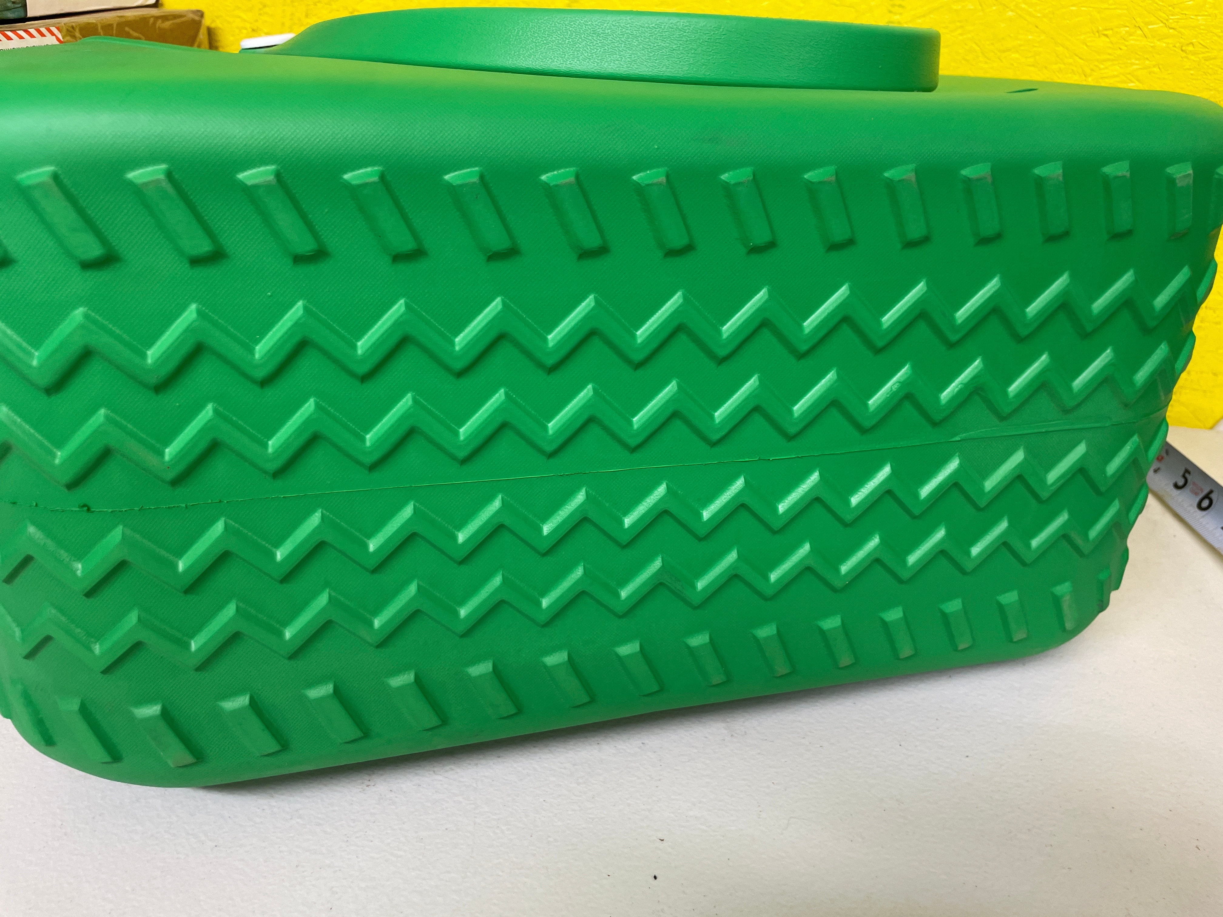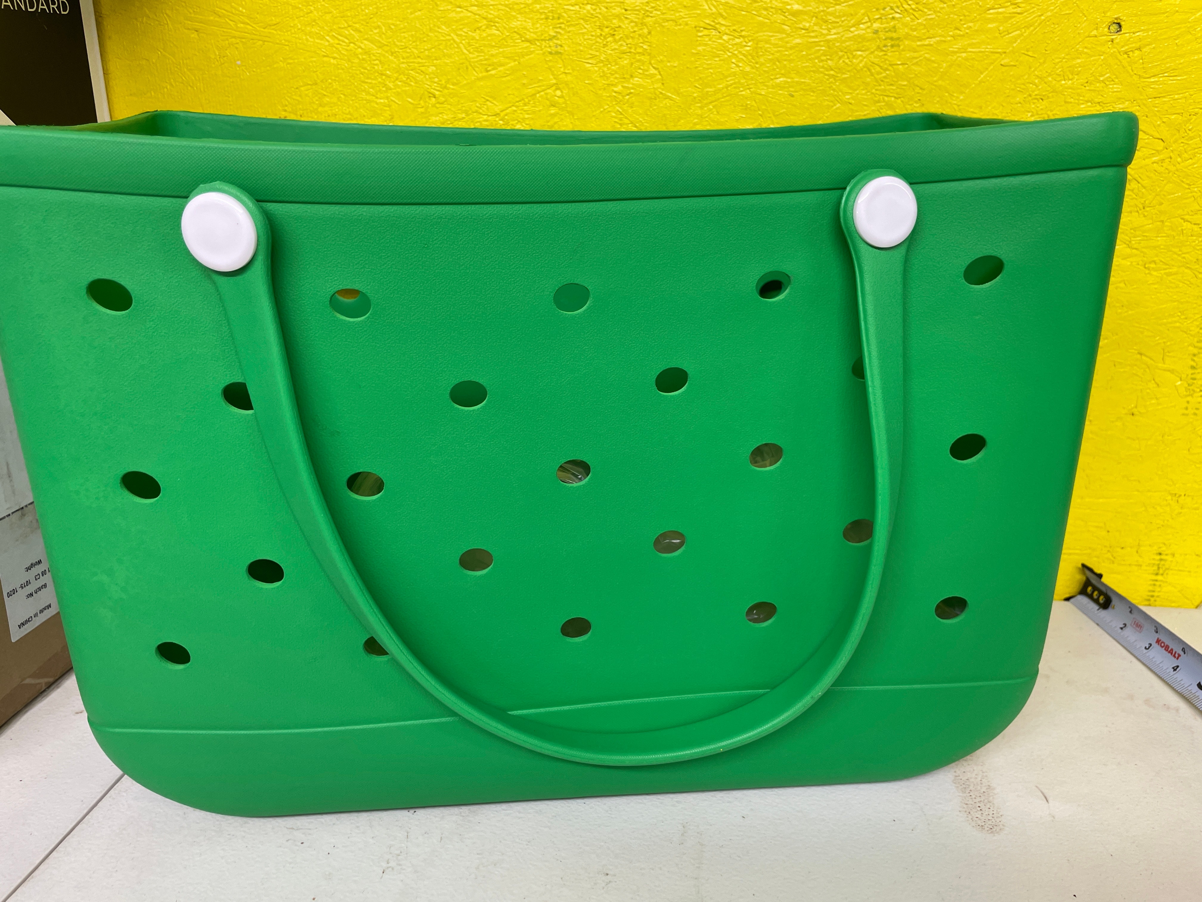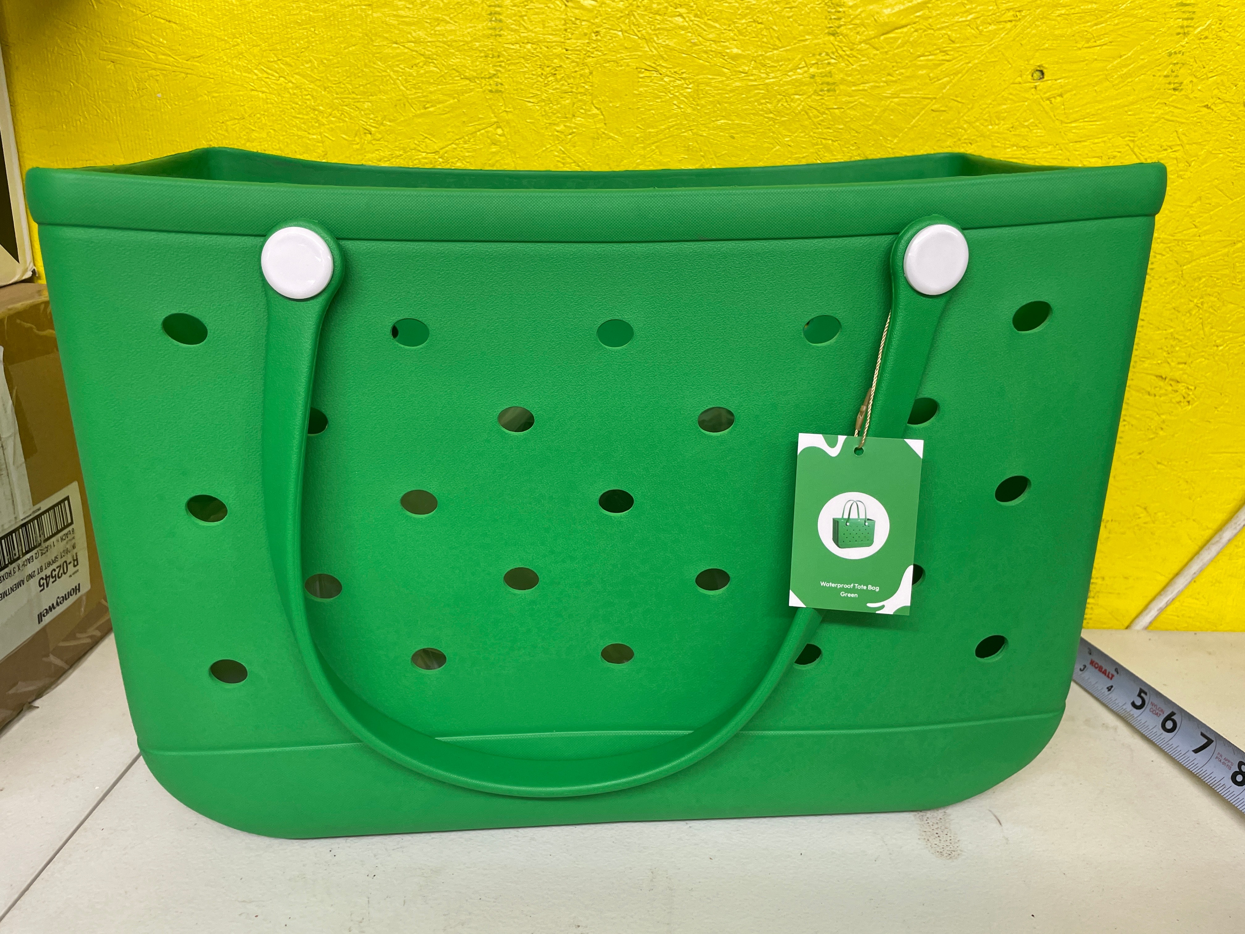 A contemporary open-top tote bag, identified by its style as a Bogg Bag. Molded from bright green rigid plastic or EVA foam, it features perforated sides and integrated arched handles secured with white button-like fasteners. The base is textured with a distinct chevron and tread pattern. A green hang tag, still attached, reads "Make your own ‘Crocs Bag’" and "Green, " accompanied by a graphic of a perforated bag. A clear plastic bag is folded inside.