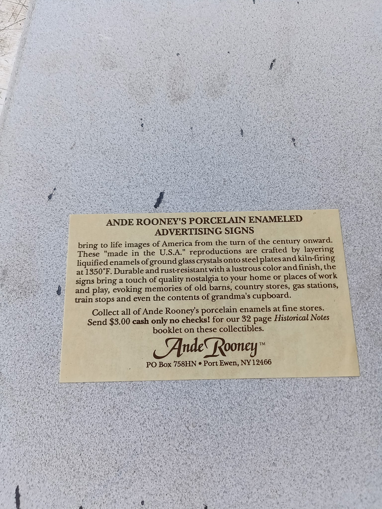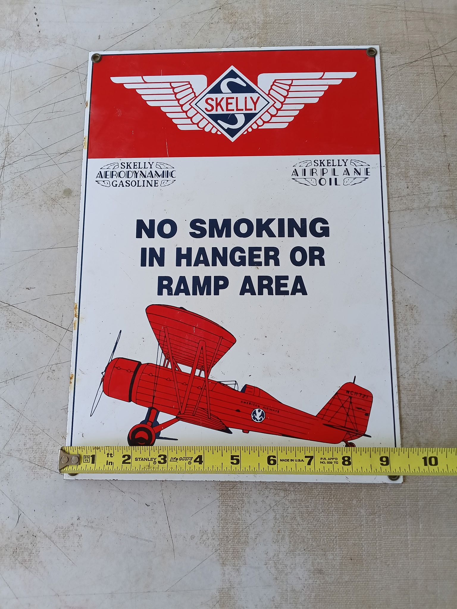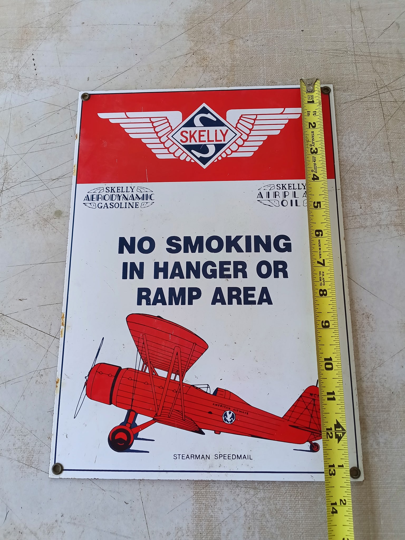 An Ande Rooney Porcelain Enameled Advertising Sign, a reproduction crafted in the U.S.A. from steel plates with layered enamels, designed in a vintage American aviation style. The rectangular sign features a white background with a prominent red banner at the top, displaying a winged "SKELLY" logo and text "SKELLY AERODYNAMIC GASOLINE" and "SKELLY AIRPLANE OIL." The main message "NO SMOKING IN HANGER OR RAMP AREA" is presented in bold black text above a detailed red biplane, identified as a "STEARMAN SPEEDMAIL" with "AMERICAS PREMIER FUEL" visible on its wing. The reverse bears a label identifying it as an "Ande Rooney’s Porcelain Enameled Advertising Sign, " confirming its U.S.A. origin and construction from steel plates with layered enamels, evoking turn-of-the-century Americana.