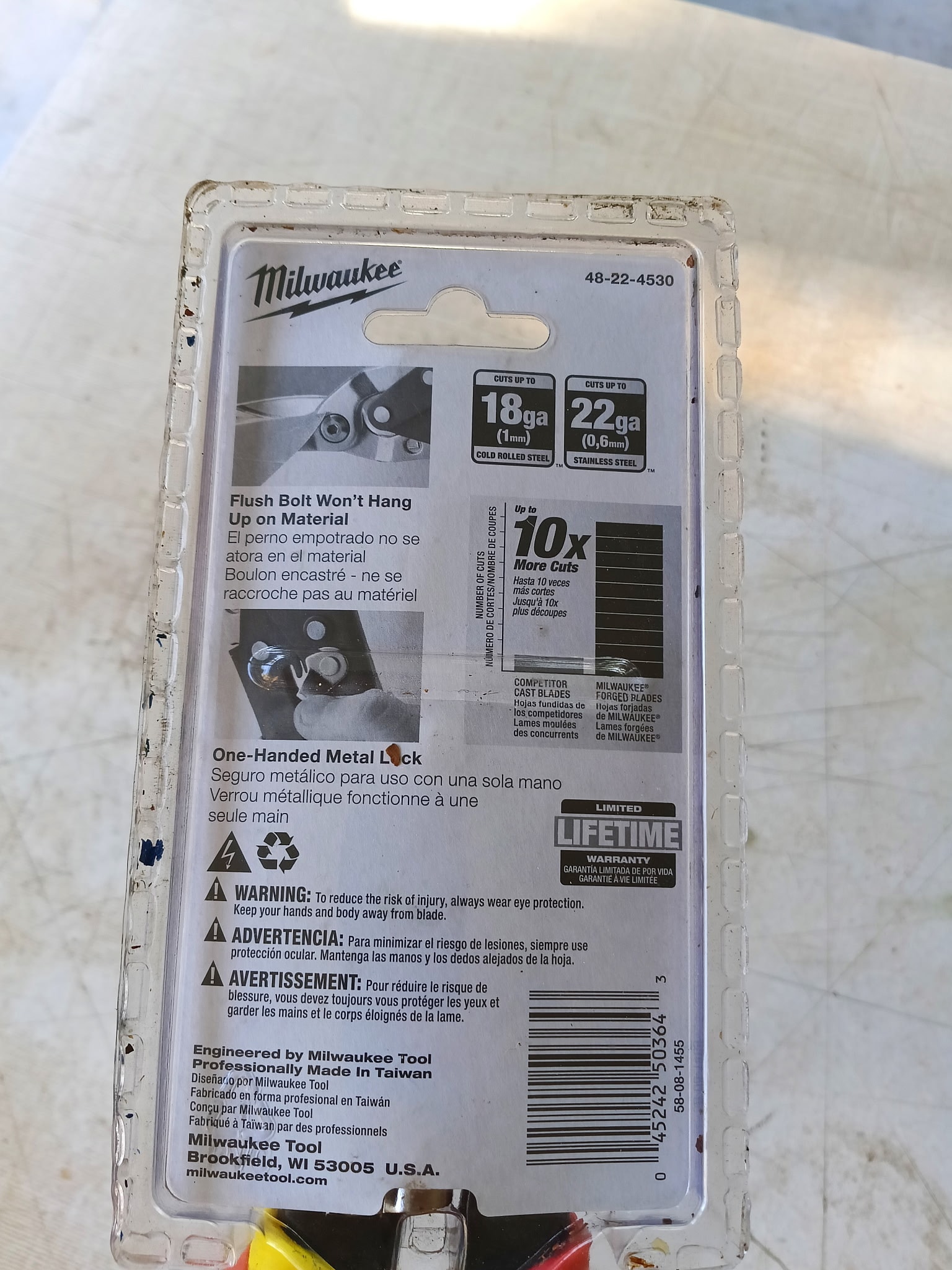 A new, packaged pair of Milwaukee Aviation Snips, model 48-22-4530, specifically labeled for “STRAIGHT” cutting. This modern industrial tool features forged, chrome rust-protected blades, a black metal body, and ergonomic red handles with yellow accents. The item is presented in its original multi-lingual retail packaging, primarily in English, Spanish (“Tijeras de aviación, ” “Hojas forjadas, ” “Protección contra oxidación de cromo”) and French (“Cizaille de type aviation, ” “Lames forgées, ” “Protection antirouille en chrome”). The packaging highlights key features such as “up to 10x More Cuts, ” a “Flush Bolt, ” and a “One-Handed Metal Lock, ” along with a “Lifetime Warranty.” The tool is specified to cut up to 18ga cold-rolled steel and 22ga stainless steel. The packaging also states “Engineered by Milwaukee Tool Professionally Made In Taiwan.”
