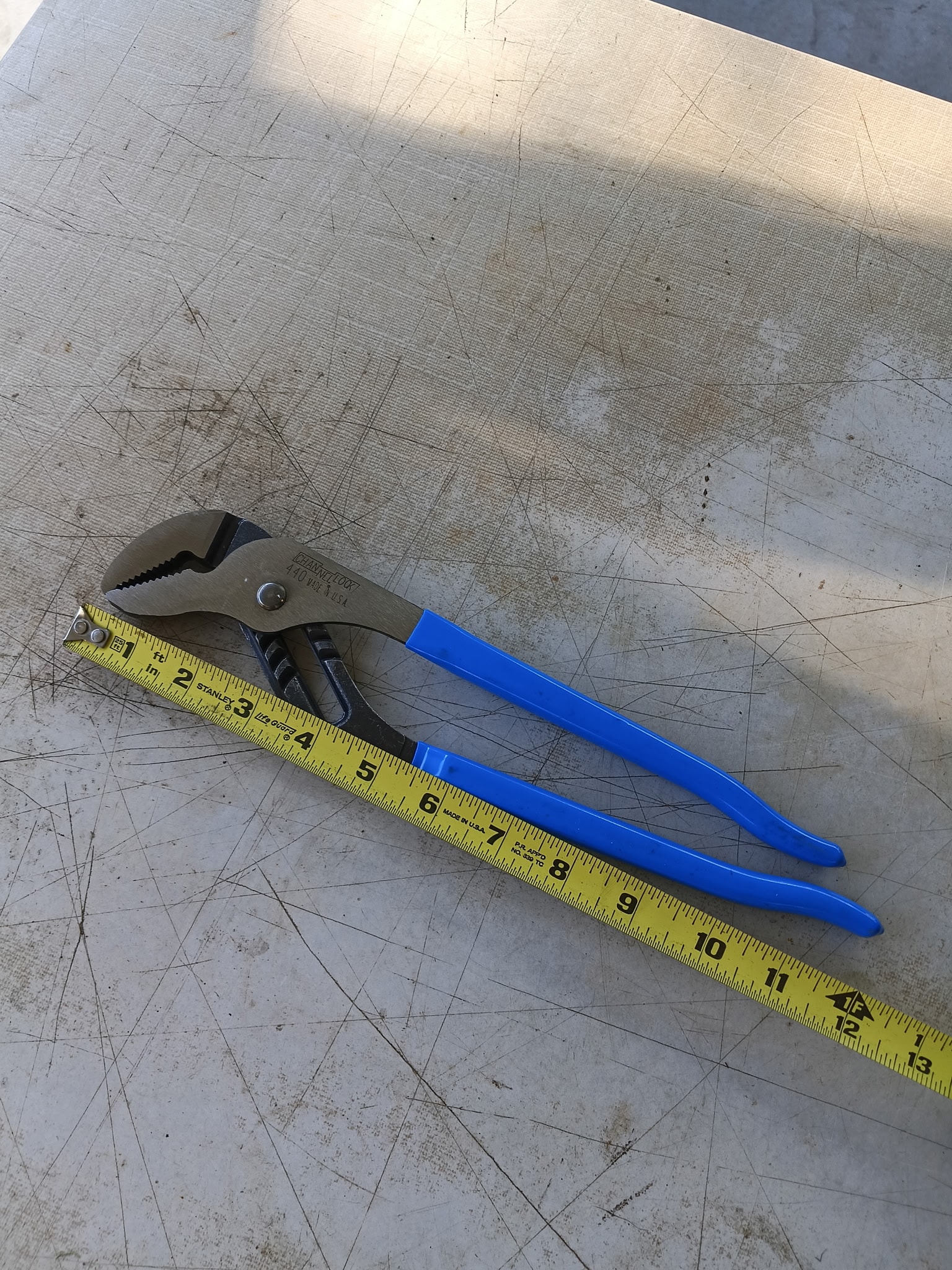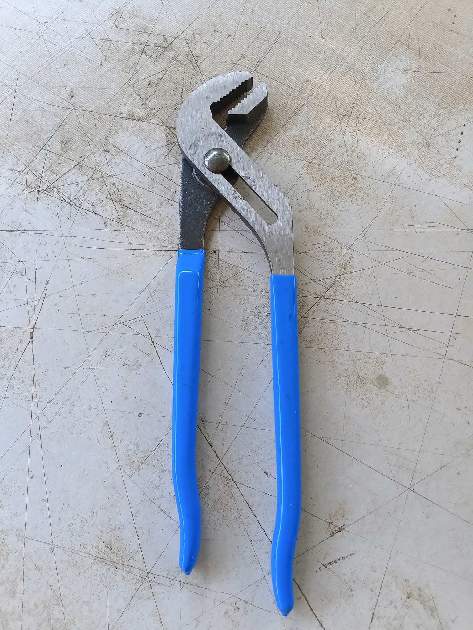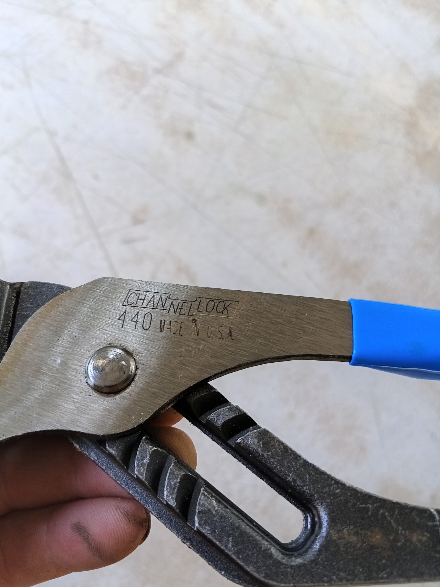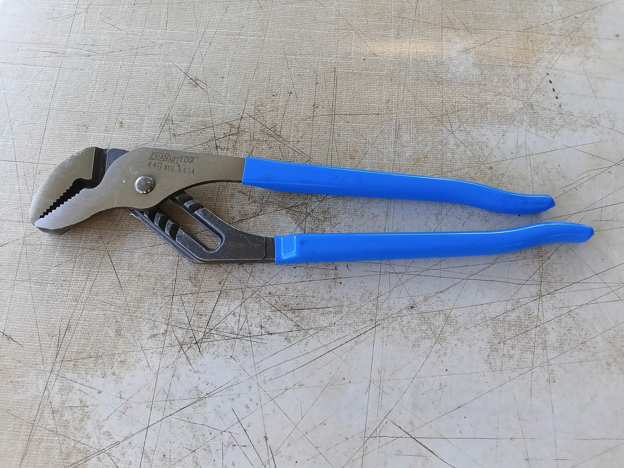A Channellock 440 10-inch V-jaw adjustable tongue and groove plier, constructed from forged metal, likely steel, featuring serrated V-jaws and bright blue plastic or rubber coated handles. The metal body near the pivot is marked ‘CHANNEL LOCK’, ‘440’, and ‘MADE IN U.S.A.’.