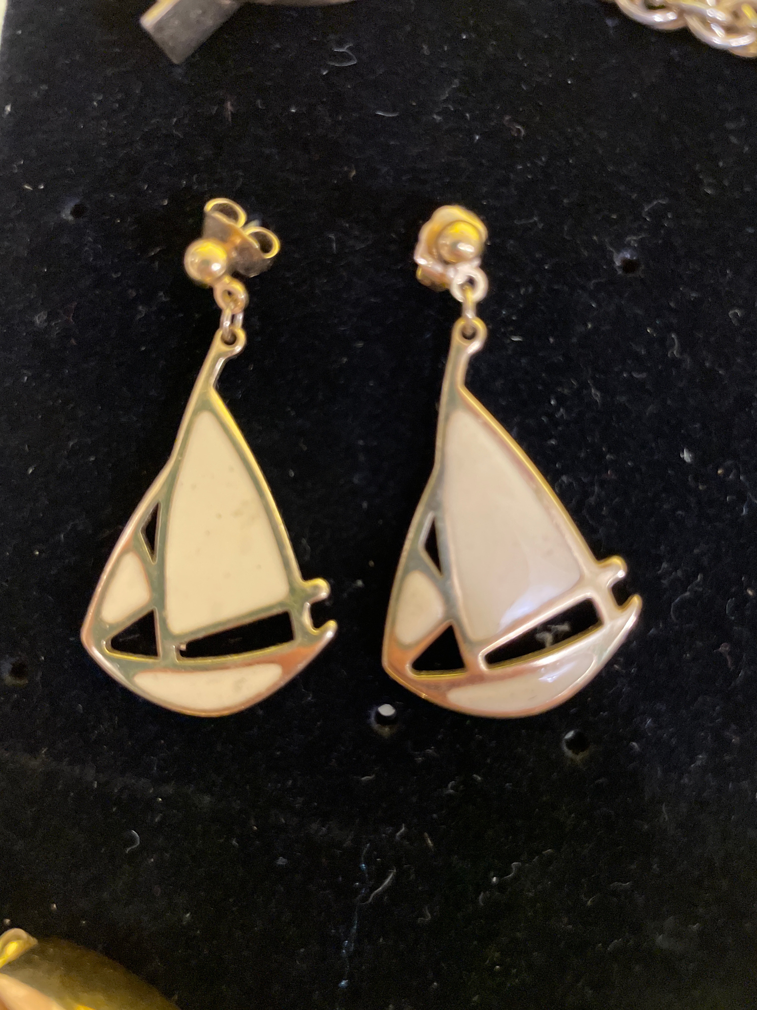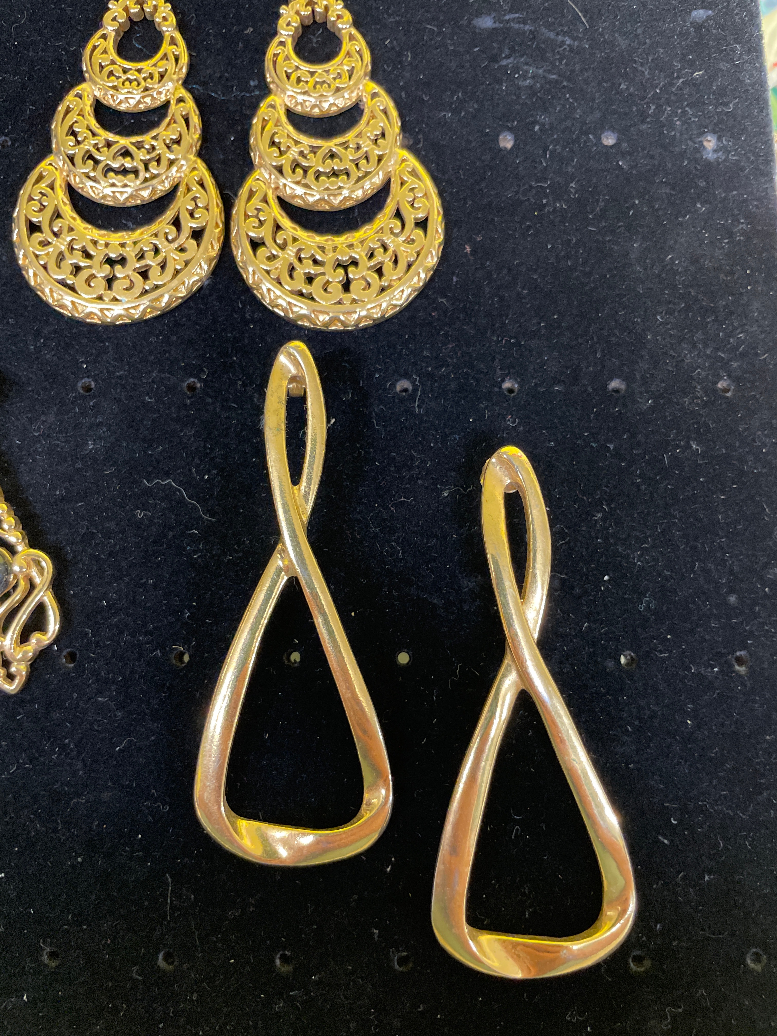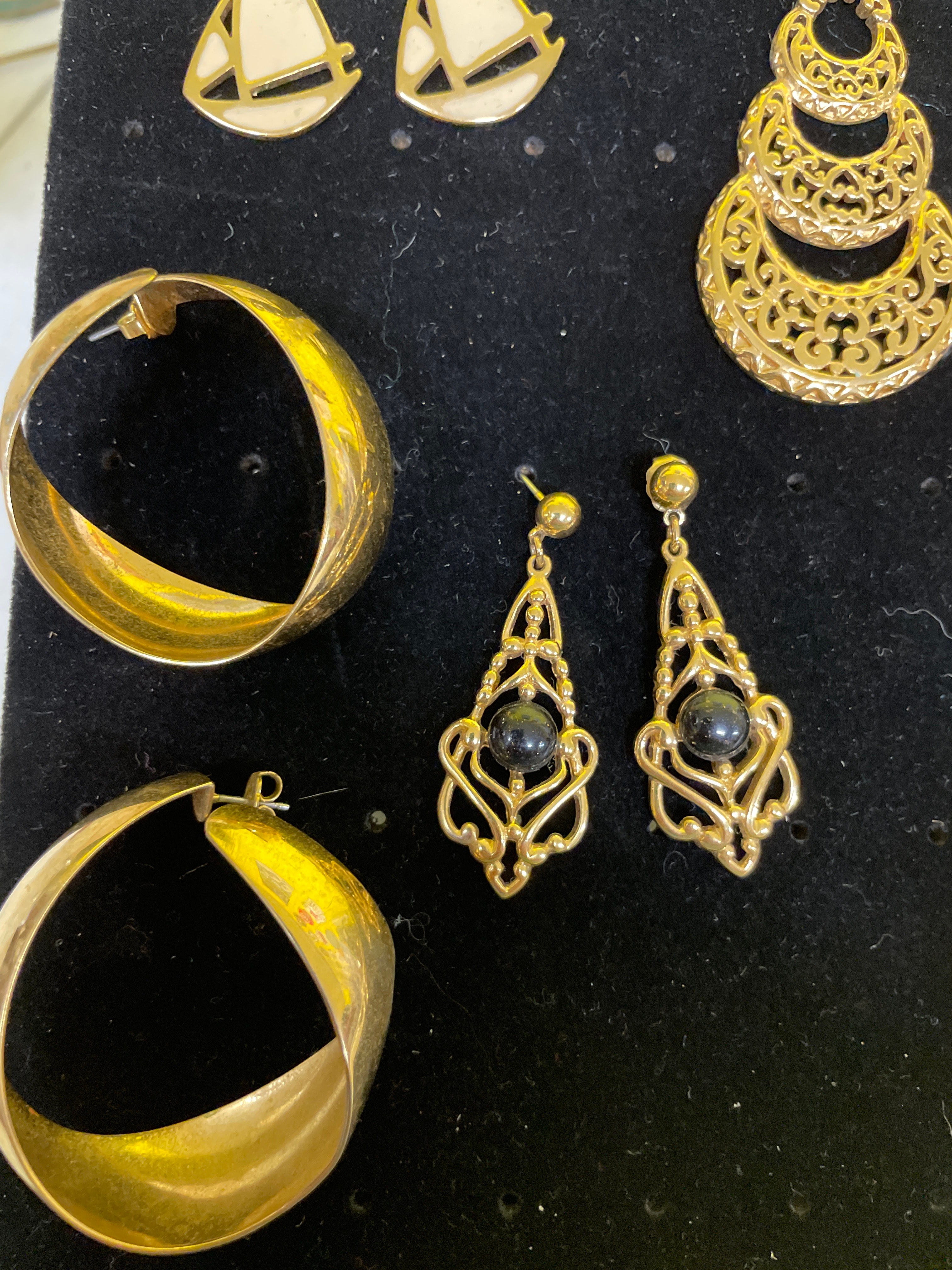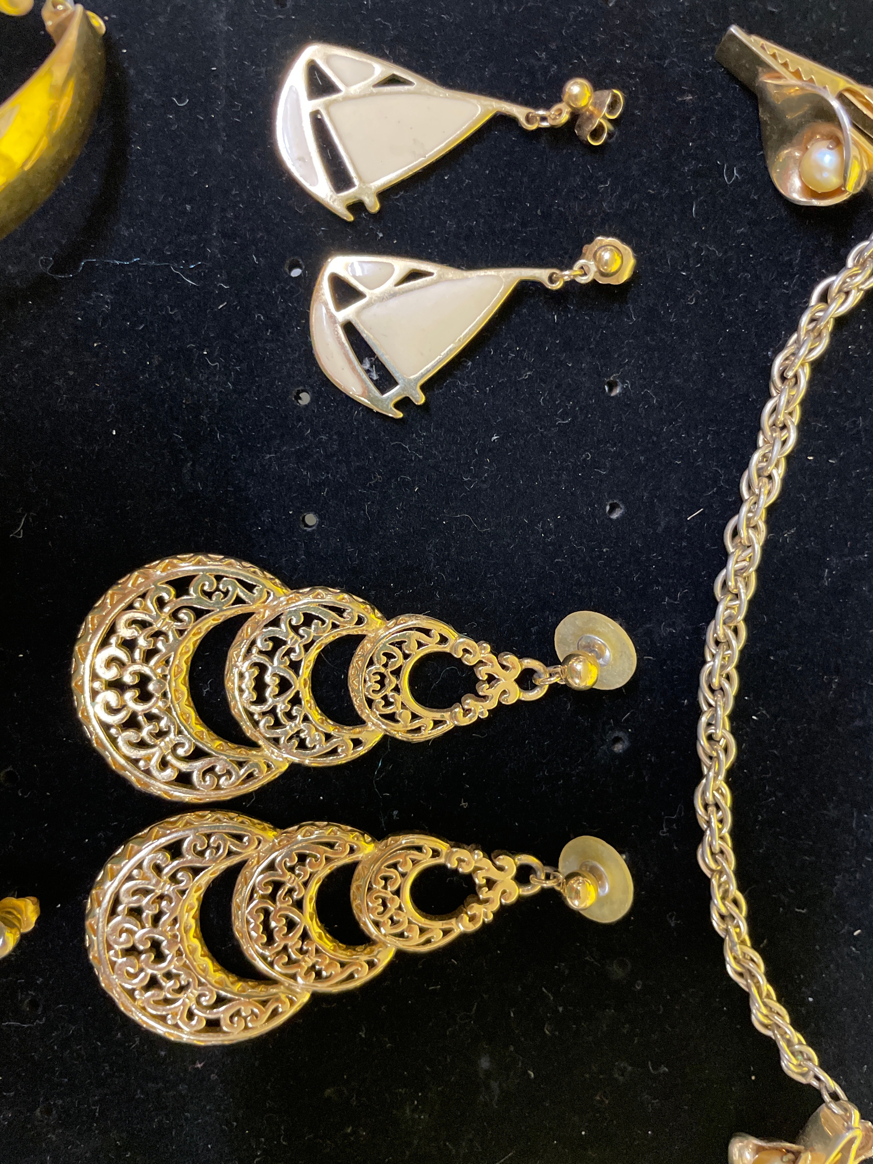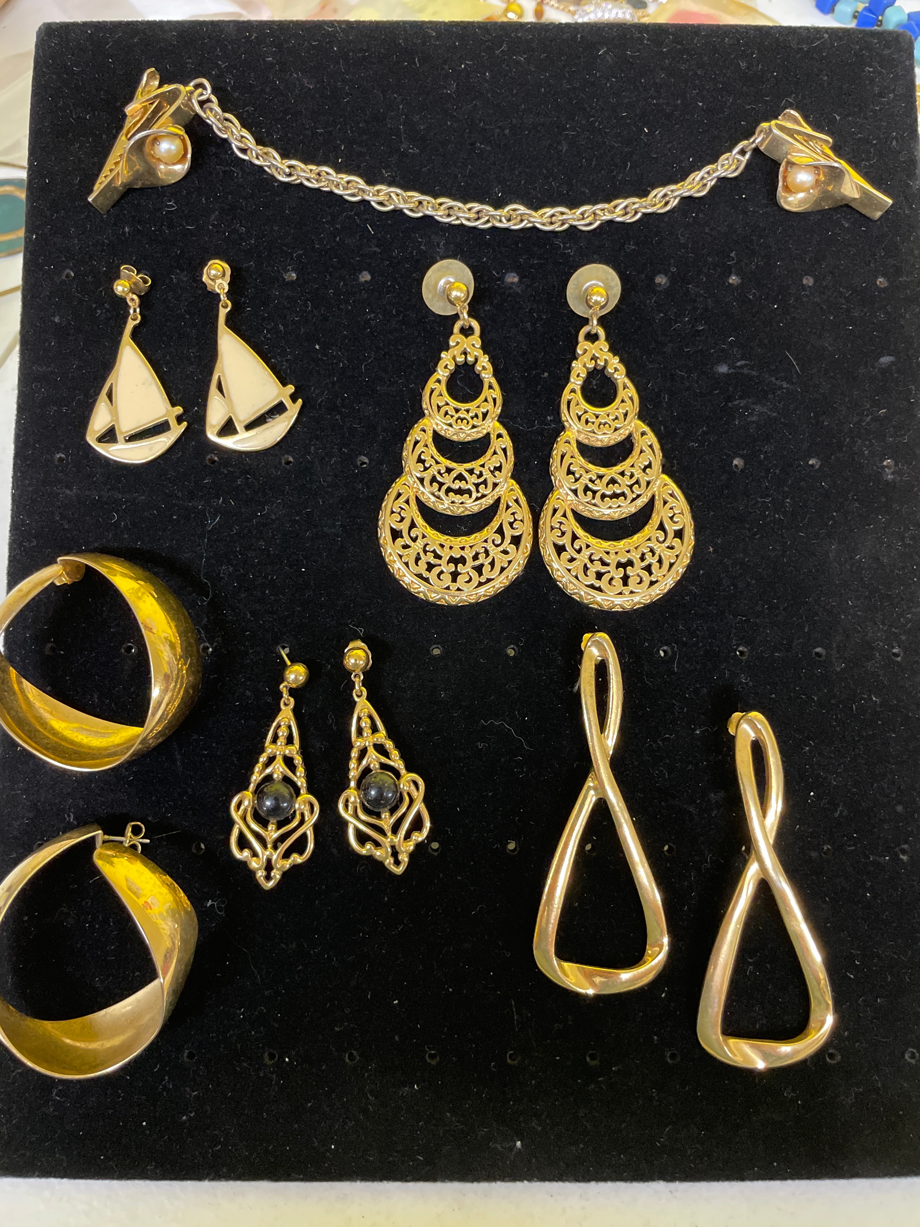 This collection comprises five distinct pairs of earrings and one gold-toned sweater clip or dress clip with faux pearl accents. The earrings exhibit a variety of styles, including nautical sailboat designs with white enamel, elaborate multi-tiered filigree dangles, large chunky hoops, ornate dangle earrings with central black cabochons, and abstract twisted loop forms. All visible items are crafted from gold-toned base metal, accented with white enamel or plastic, faux pearls, and black cabochons. No discernible text or maker’s marks are visible.