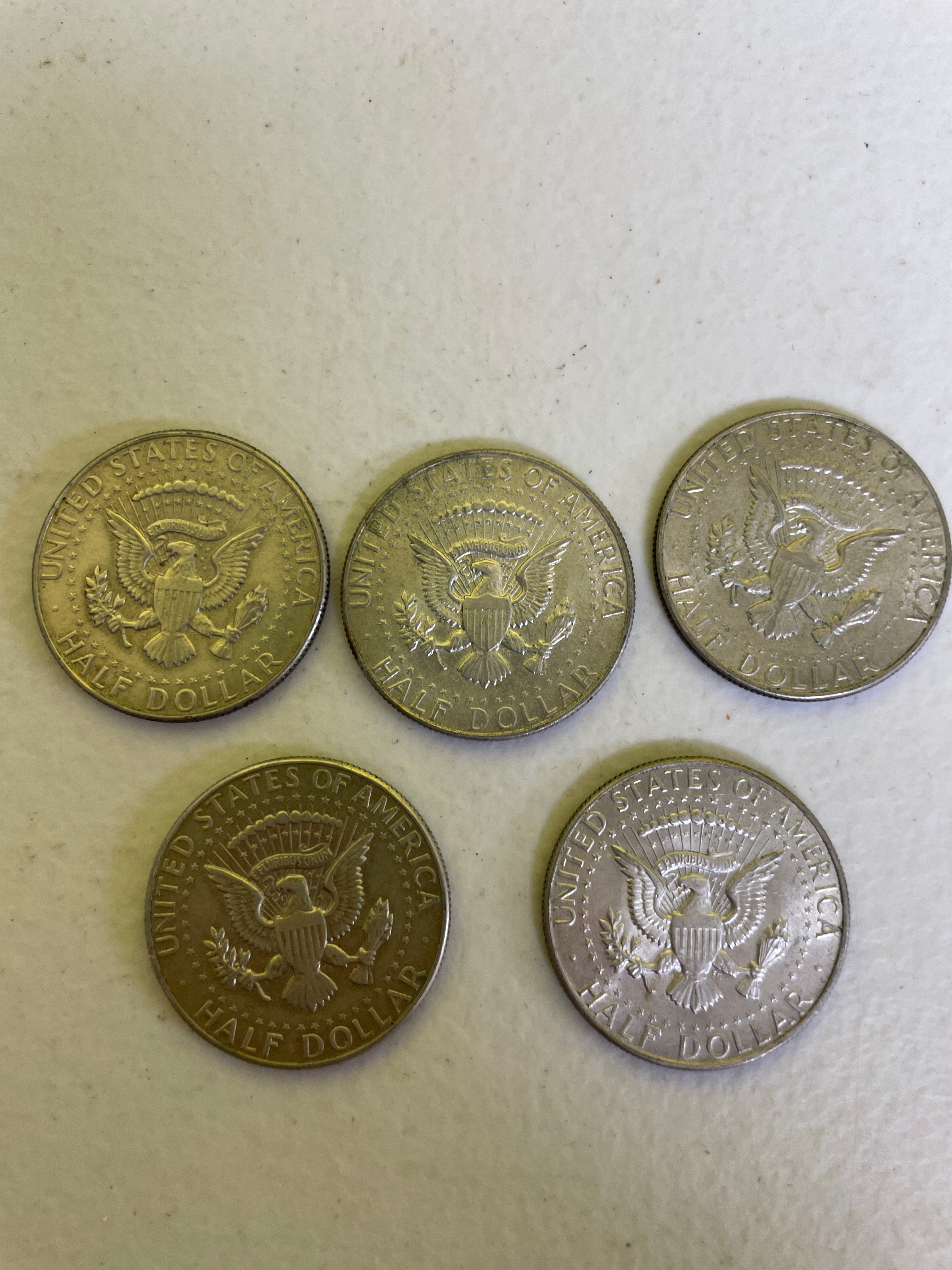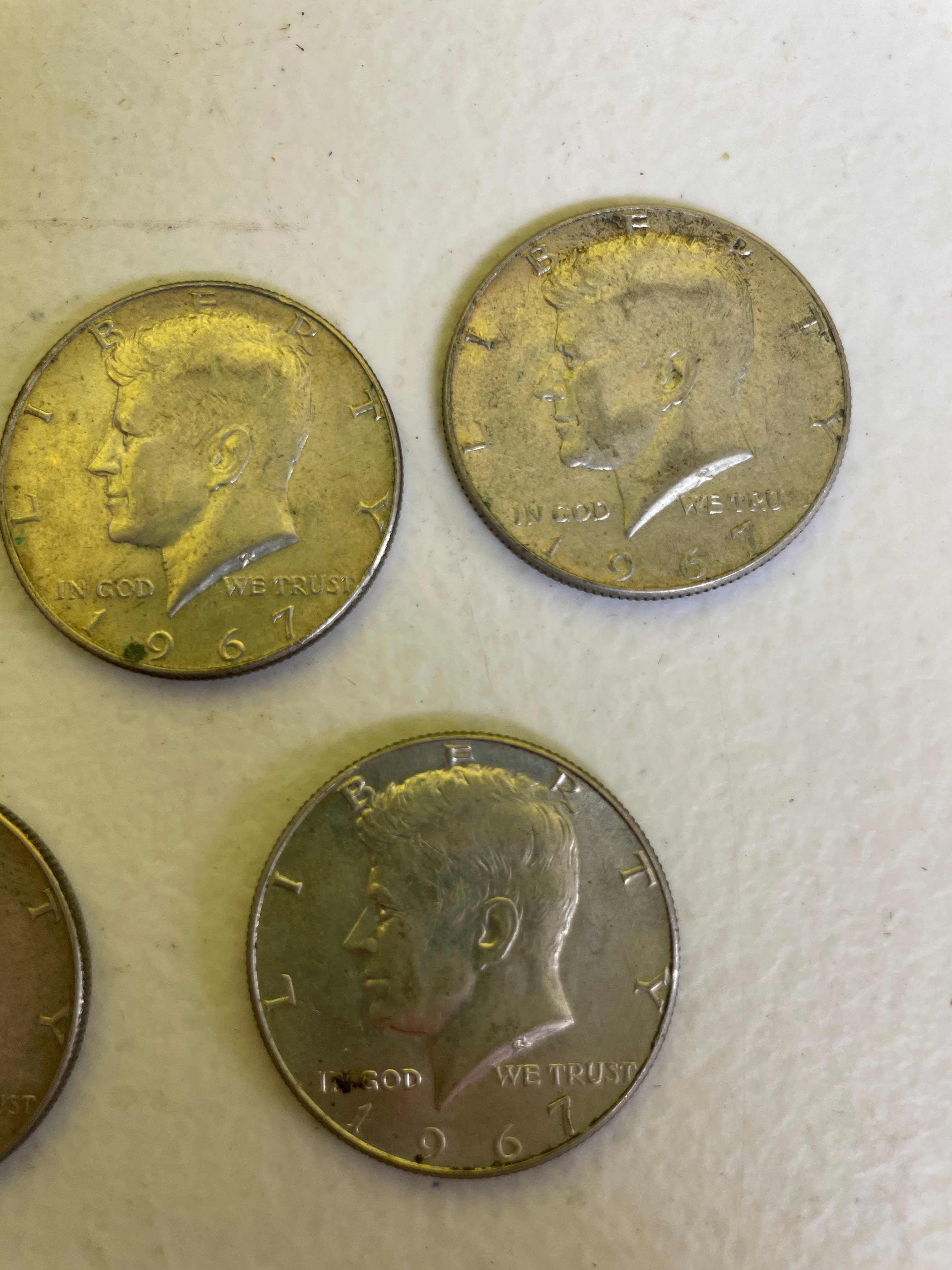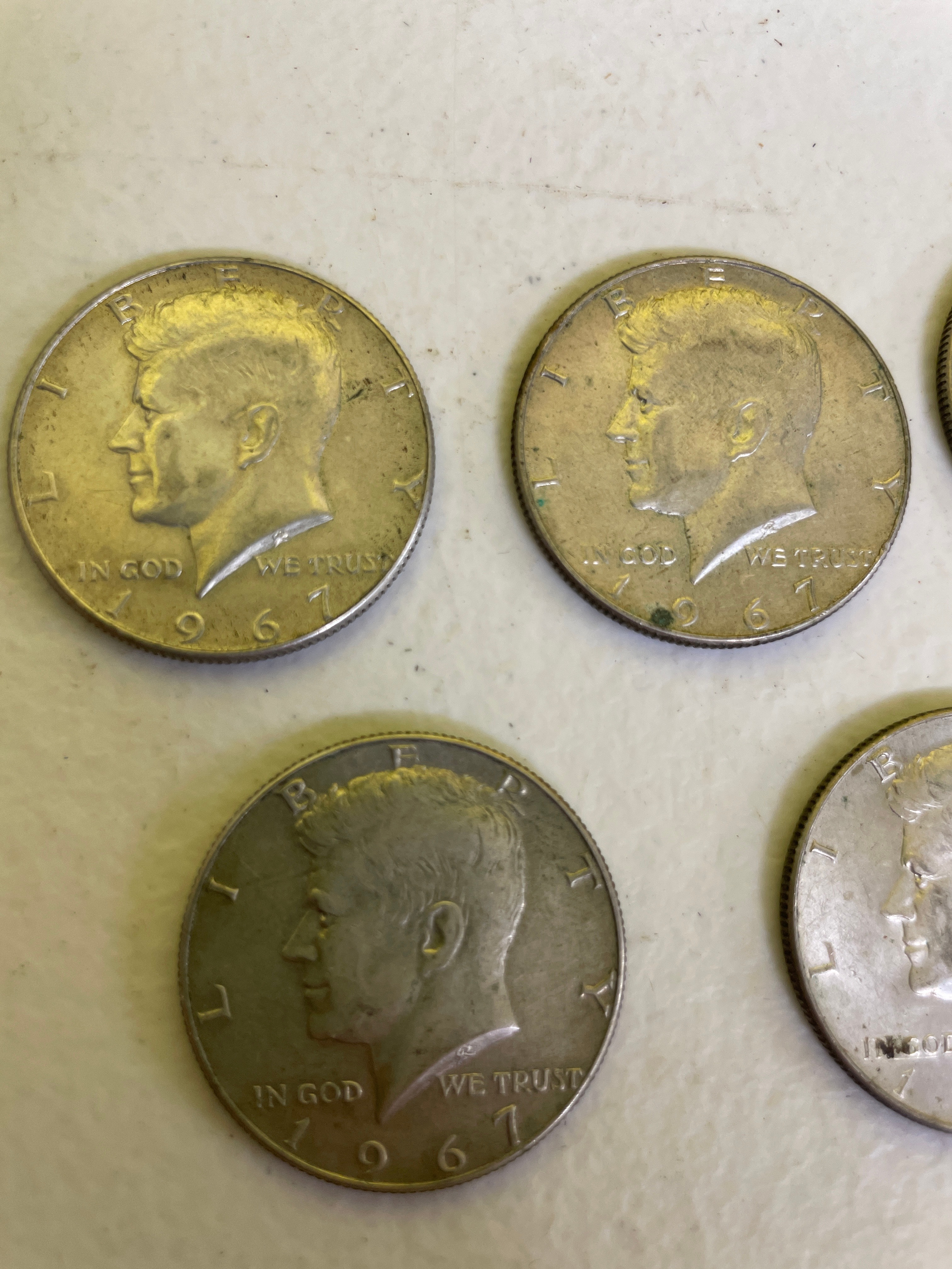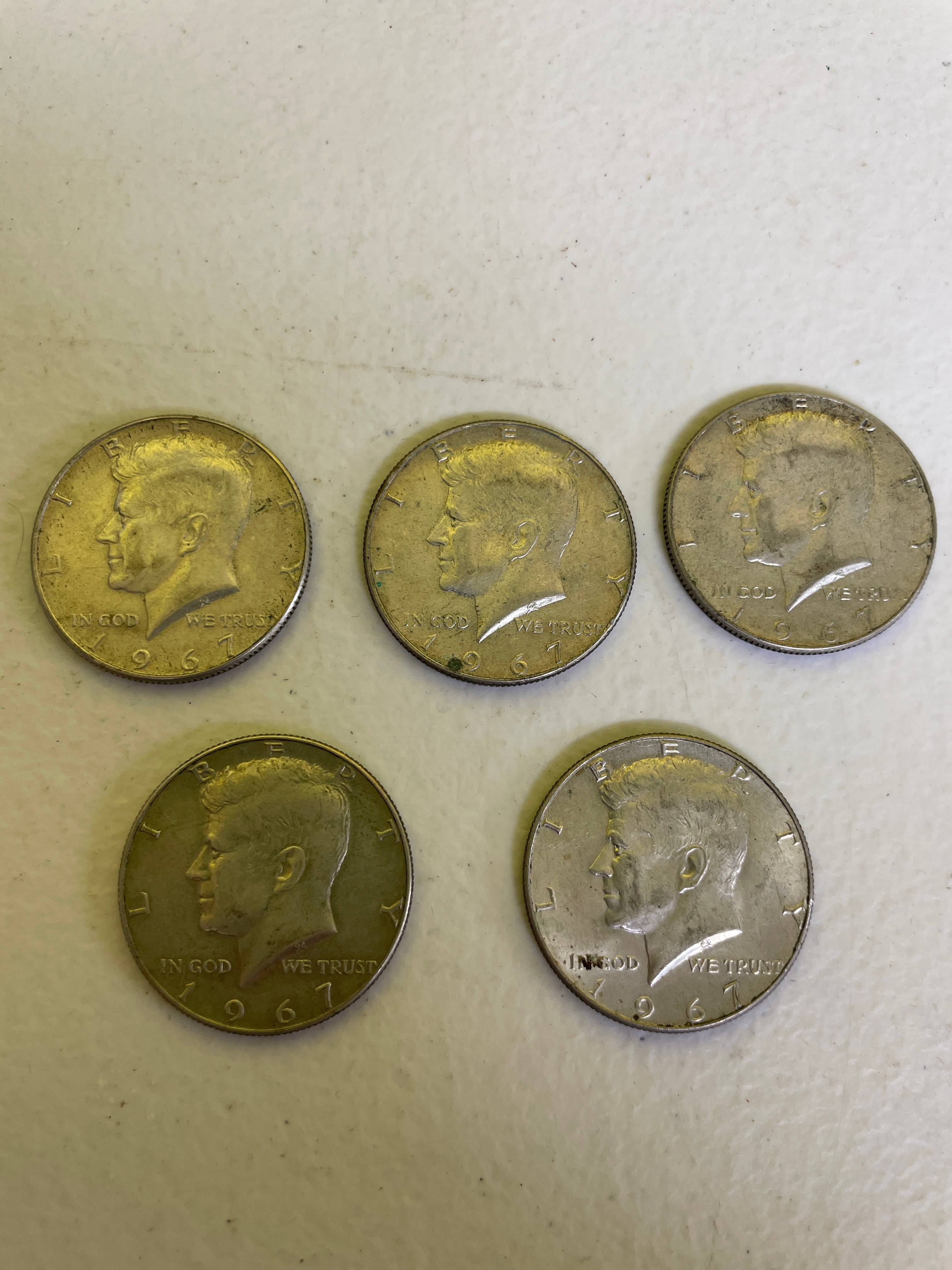 A group of five United States 1967 Kennedy 40% Silver Half Dollars. Each circular, silver-toned metallic coin features a profile bust of John F. Kennedy on the obverse, with “LIBERTY” inscribed above, “IN GOD WE TRUST” below, and the “1967” date. The reverse displays a heraldic eagle holding an olive branch and arrows, encircled by “UNITED STATES OF AMERICA” and “HALF DOLLAR, ” with “E PLURIBUS UNUM” visible on a ribbon.