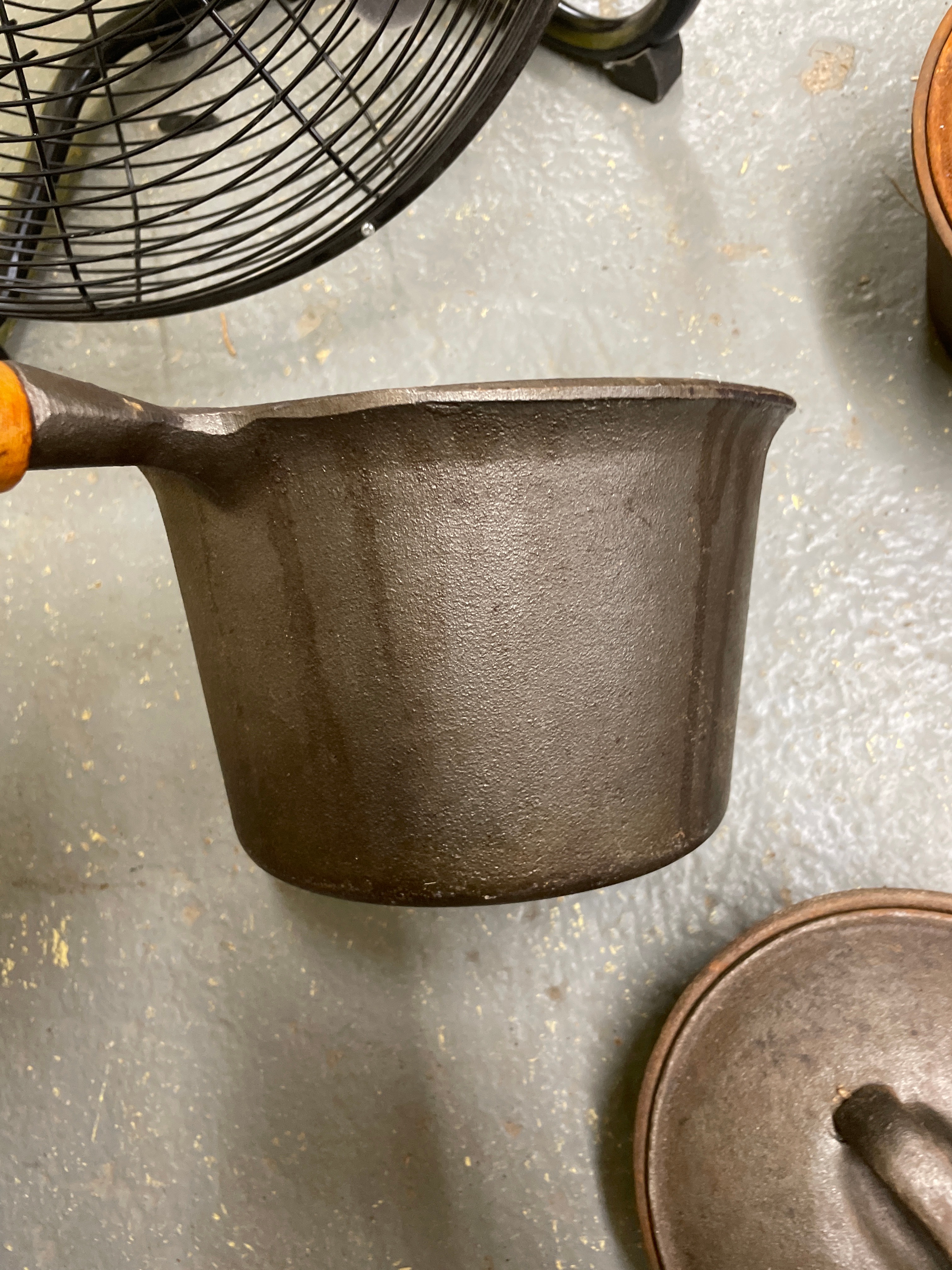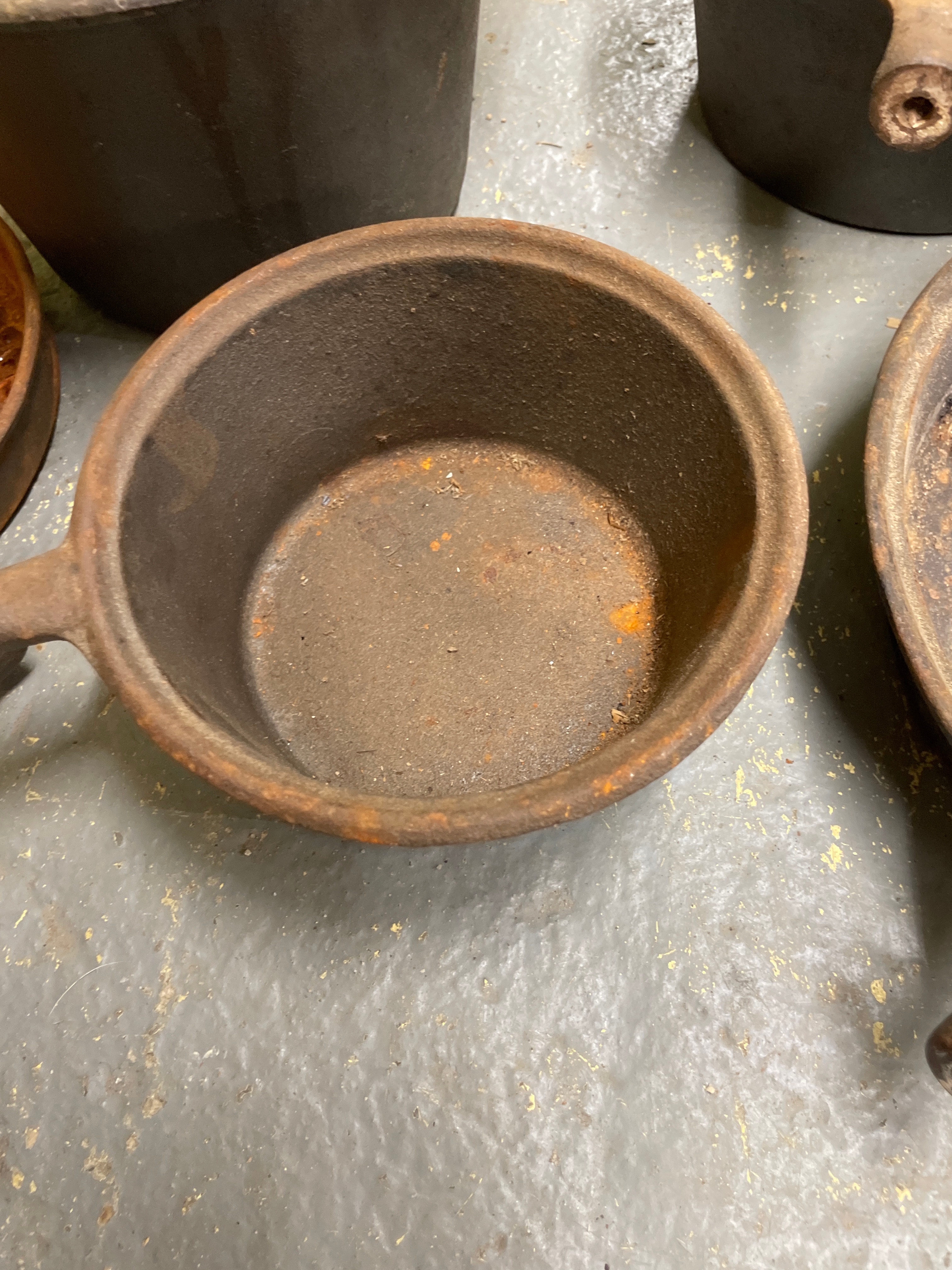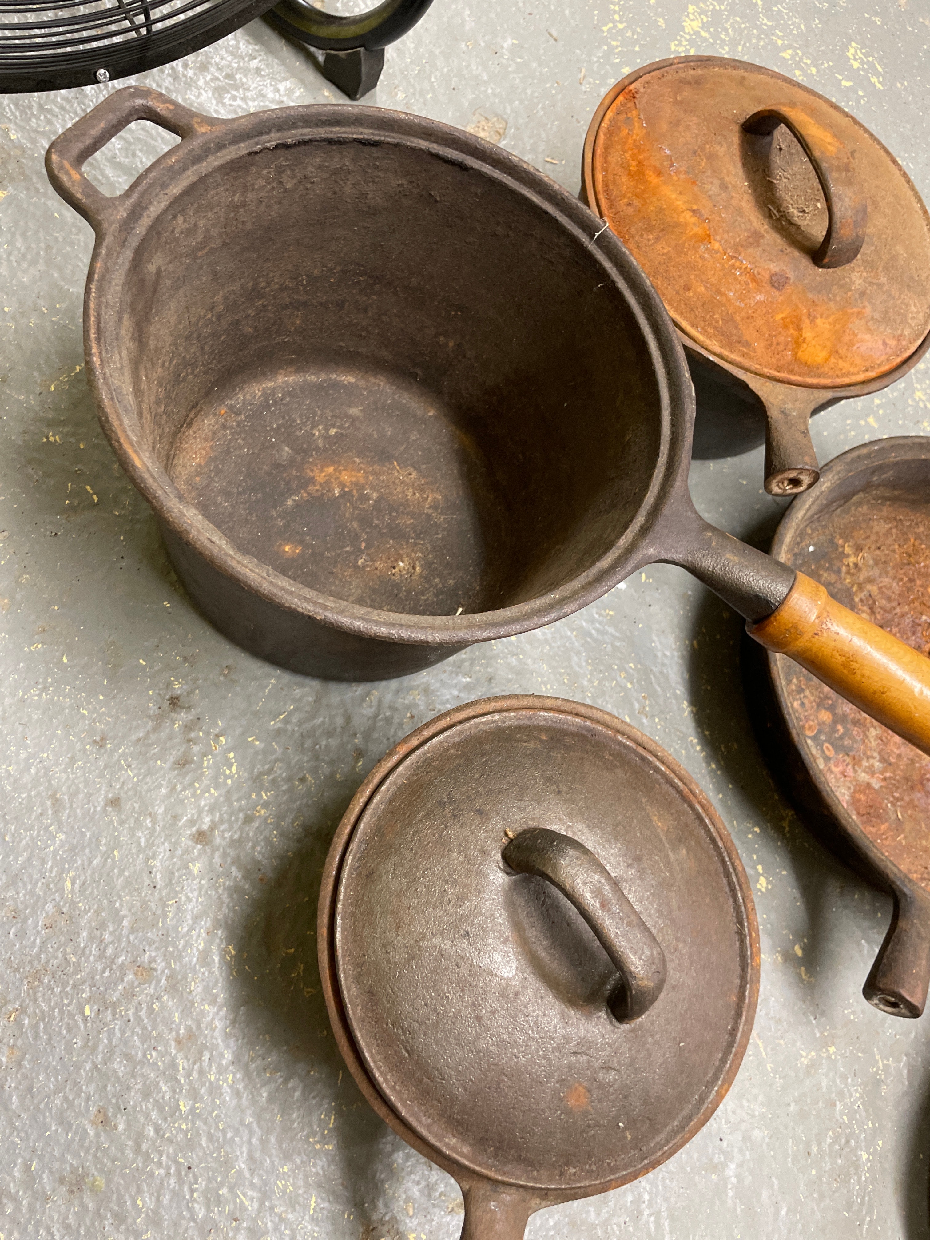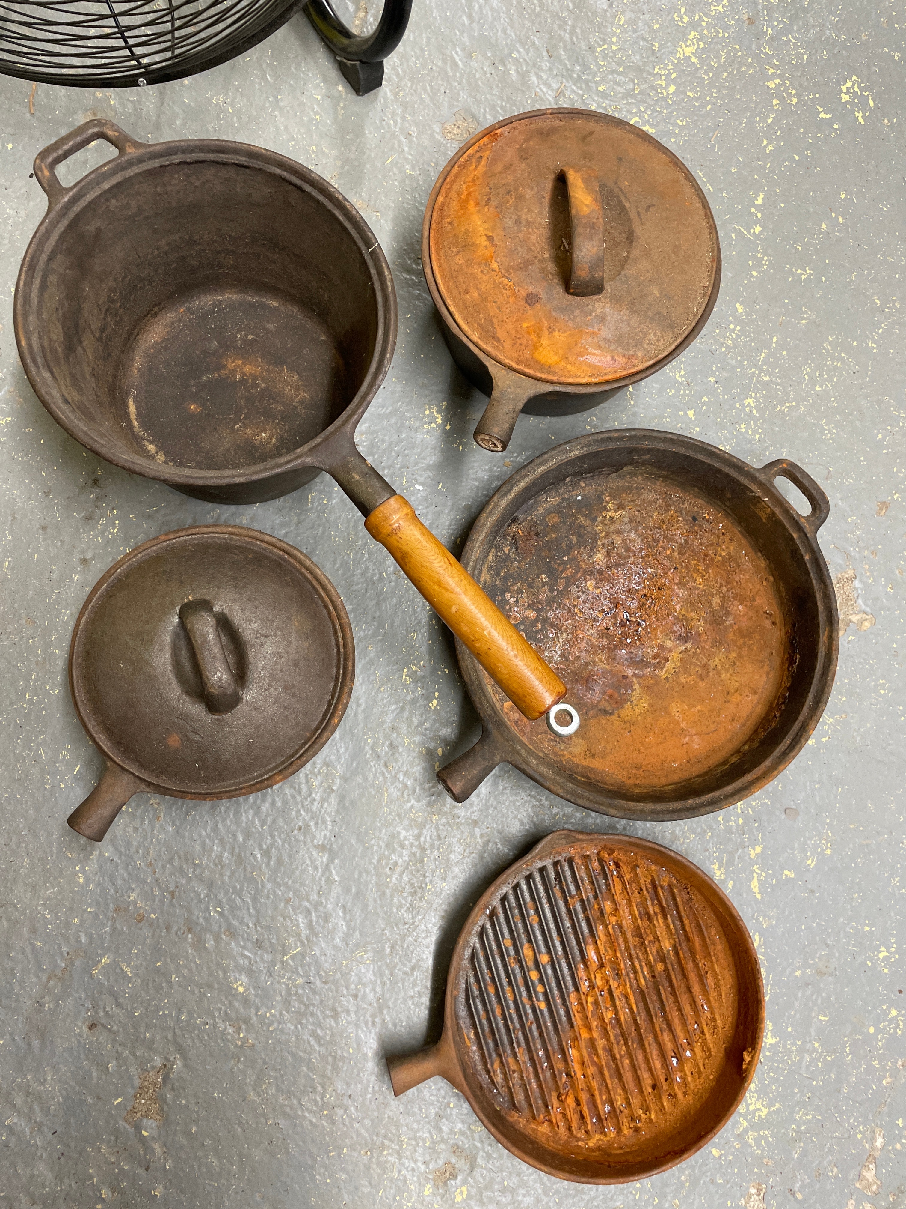 A collection of five utilitarian cast iron cookware pieces, comprising a large pot with two integrated handles, a deep skillet, a grill pan, a small saucepan with a wooden handle, and a lidded pot, along with two cast iron lids that appear to accompany some of the vessels. The material is consistently cast iron, with the exception of one saucepan featuring a light-toned wooden handle. The saucepan with the wooden handle is marked “MADE IN TAIWAN” and “3 QT” on its base, indicating a post-mid-20th century origin.