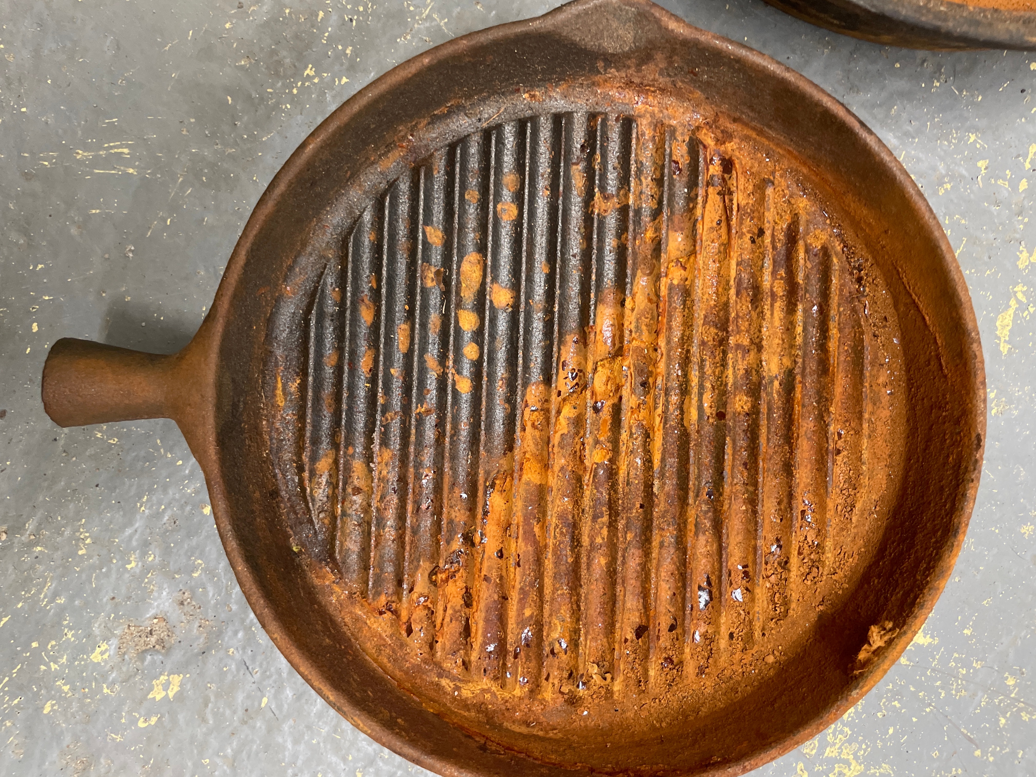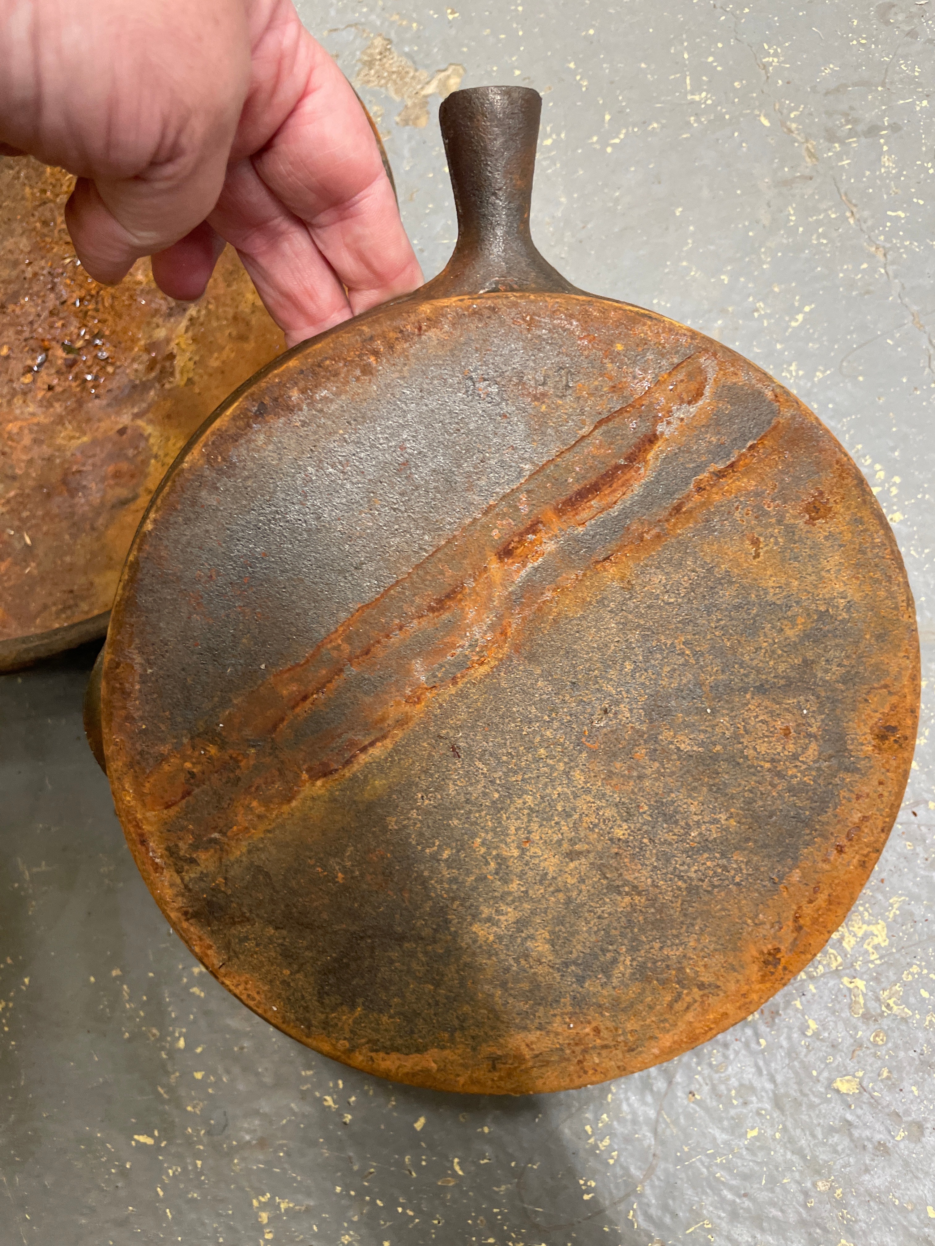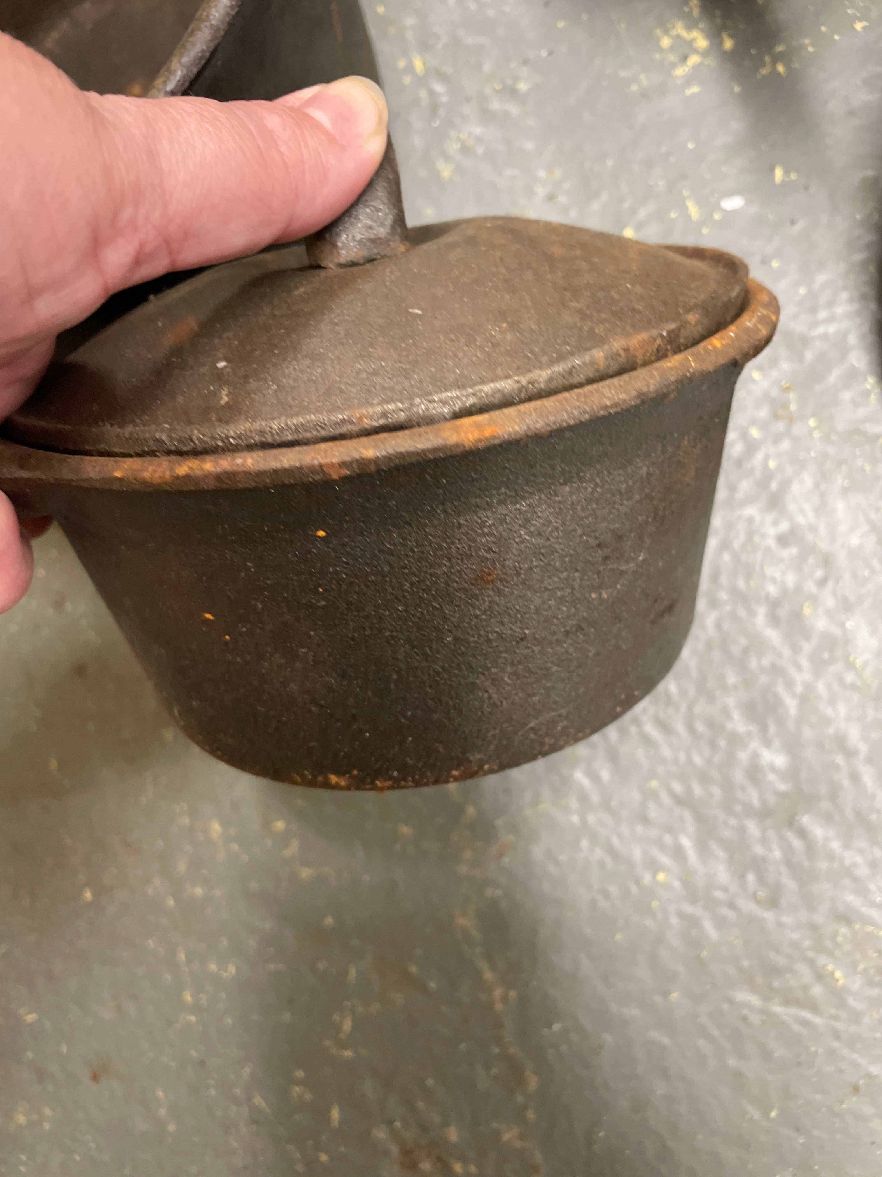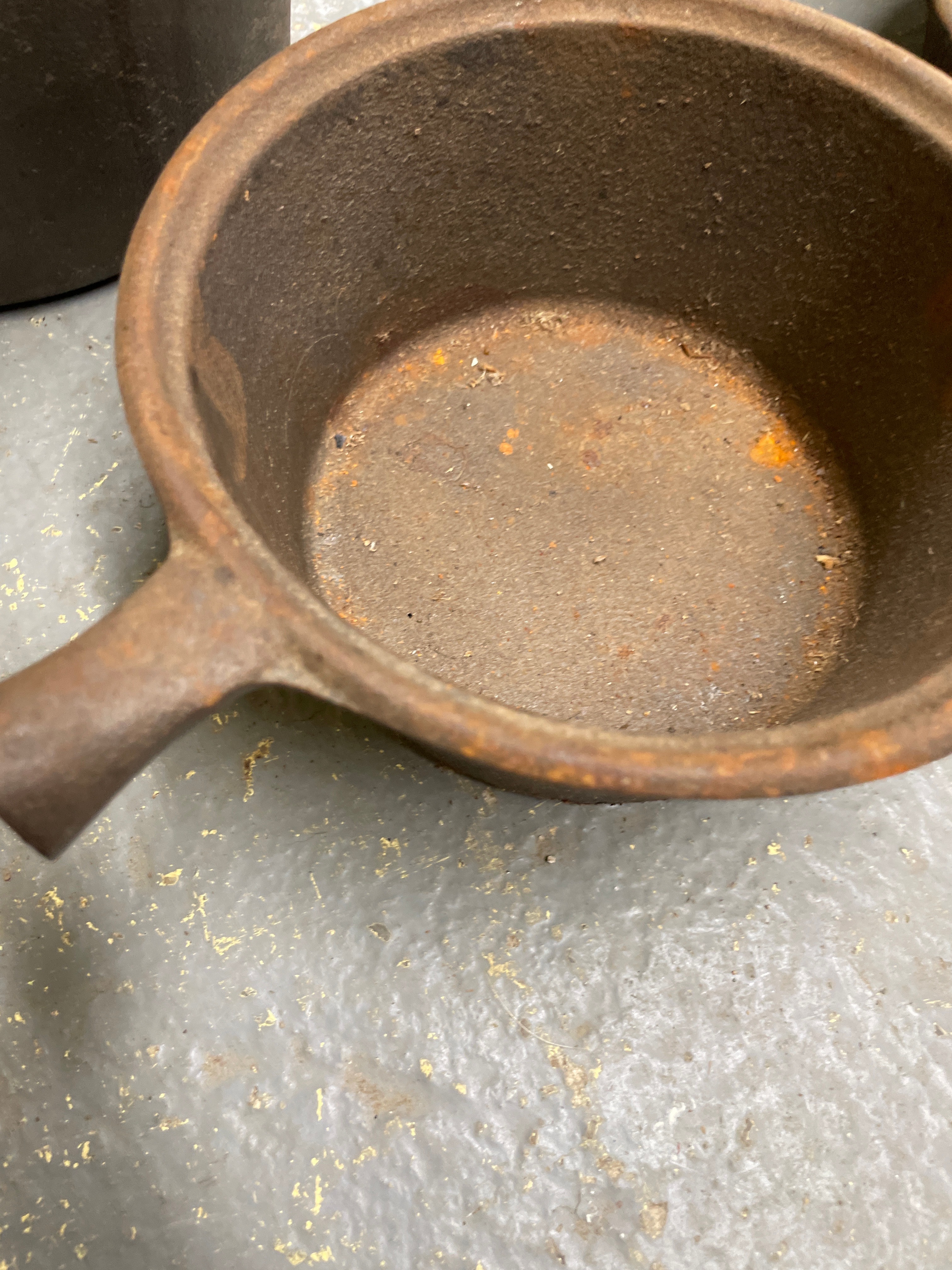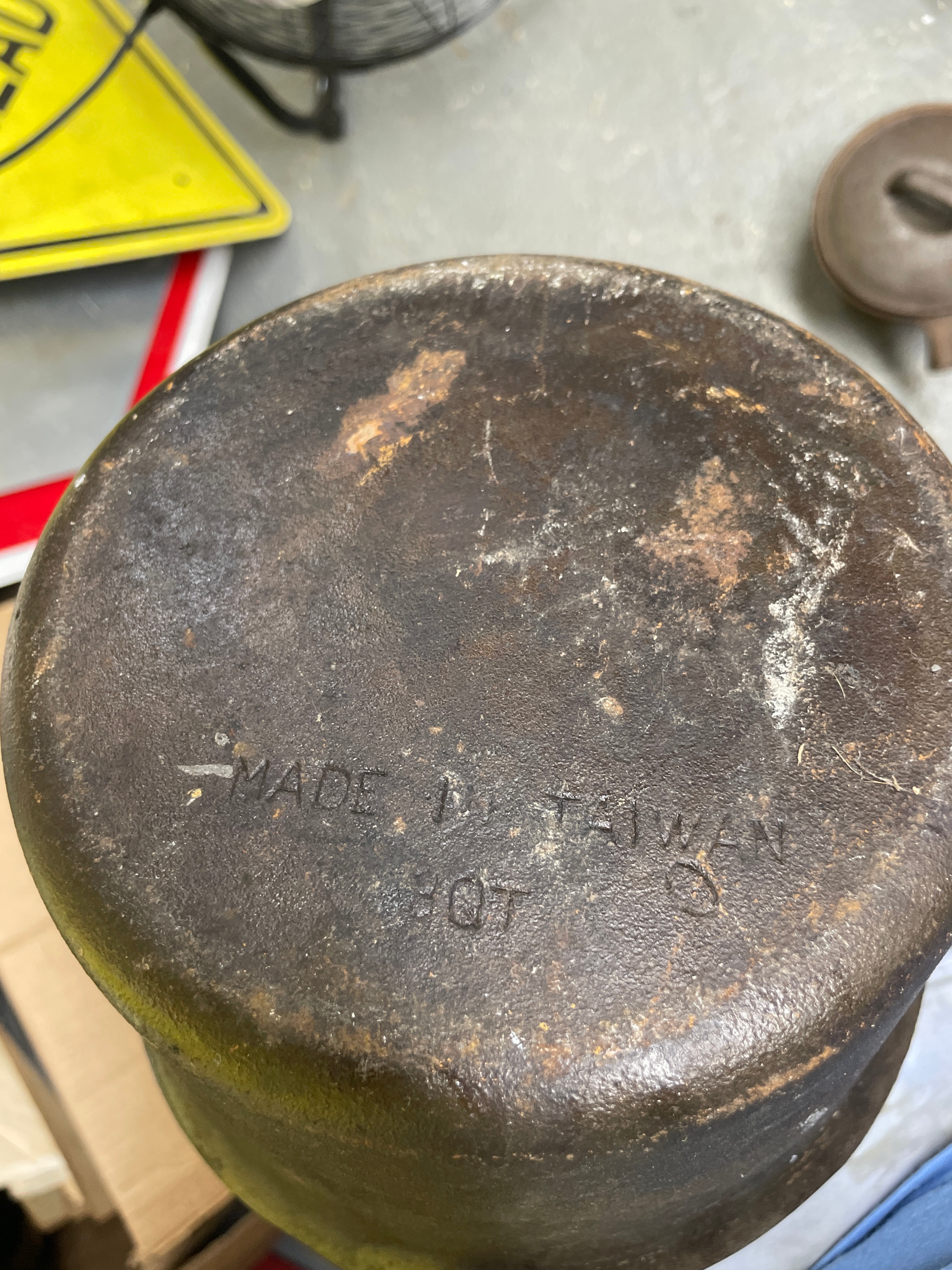 A collection of five utilitarian cast iron cookware pieces, comprising a large pot with two integrated handles, a deep skillet, a grill pan, a small saucepan with a wooden handle, and a lidded pot, along with two cast iron lids that appear to accompany some of the vessels. The material is consistently cast iron, with the exception of one saucepan featuring a light-toned wooden handle. The saucepan with the wooden handle is marked “MADE IN TAIWAN” and “3 QT” on its base, indicating a post-mid-20th century origin.
