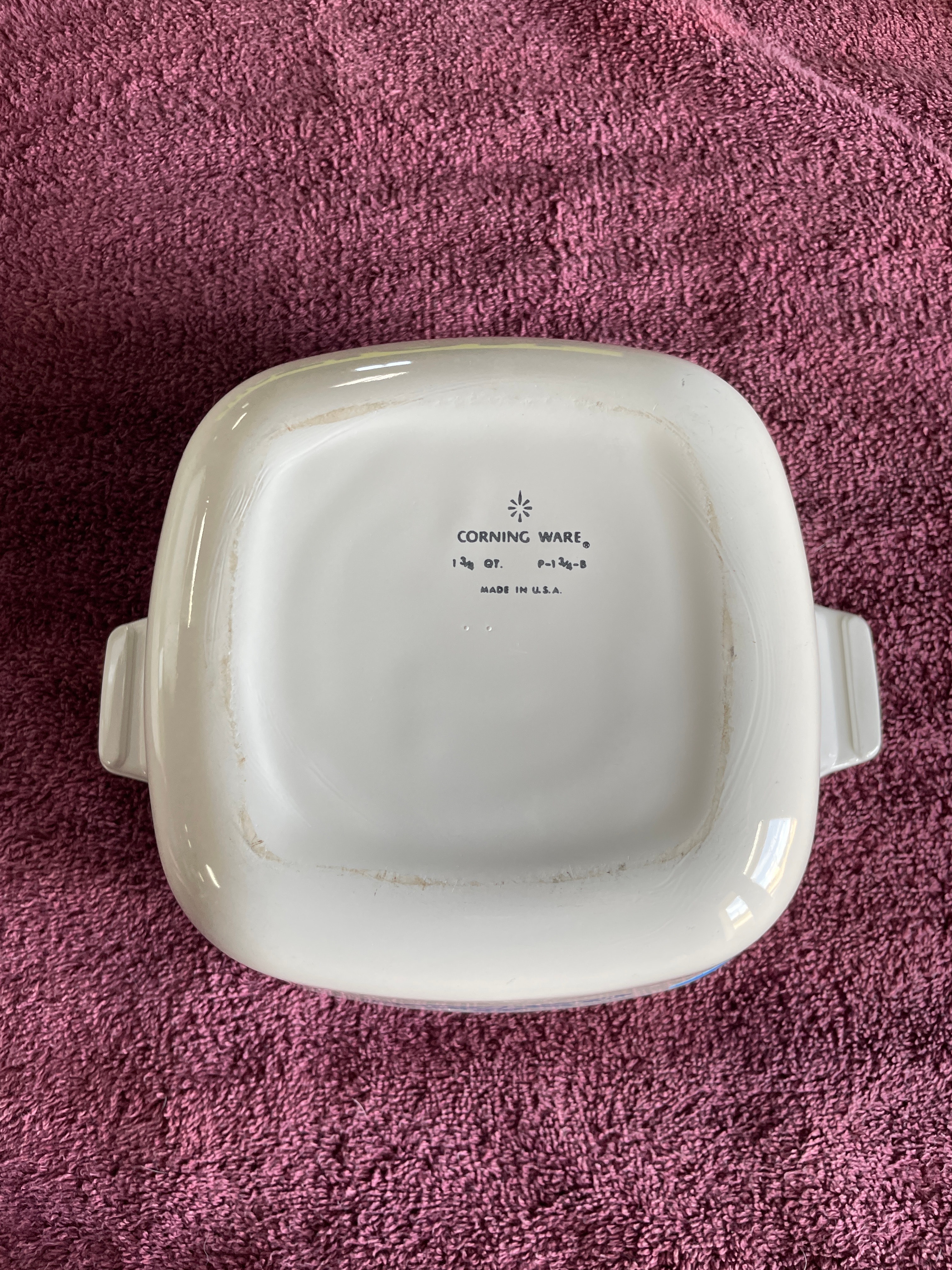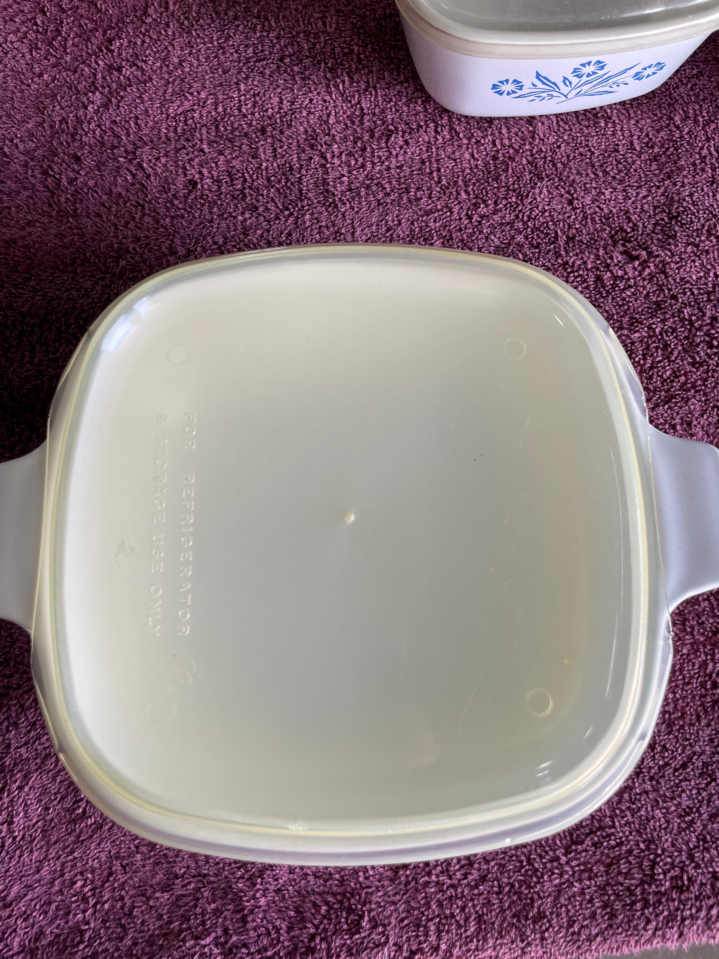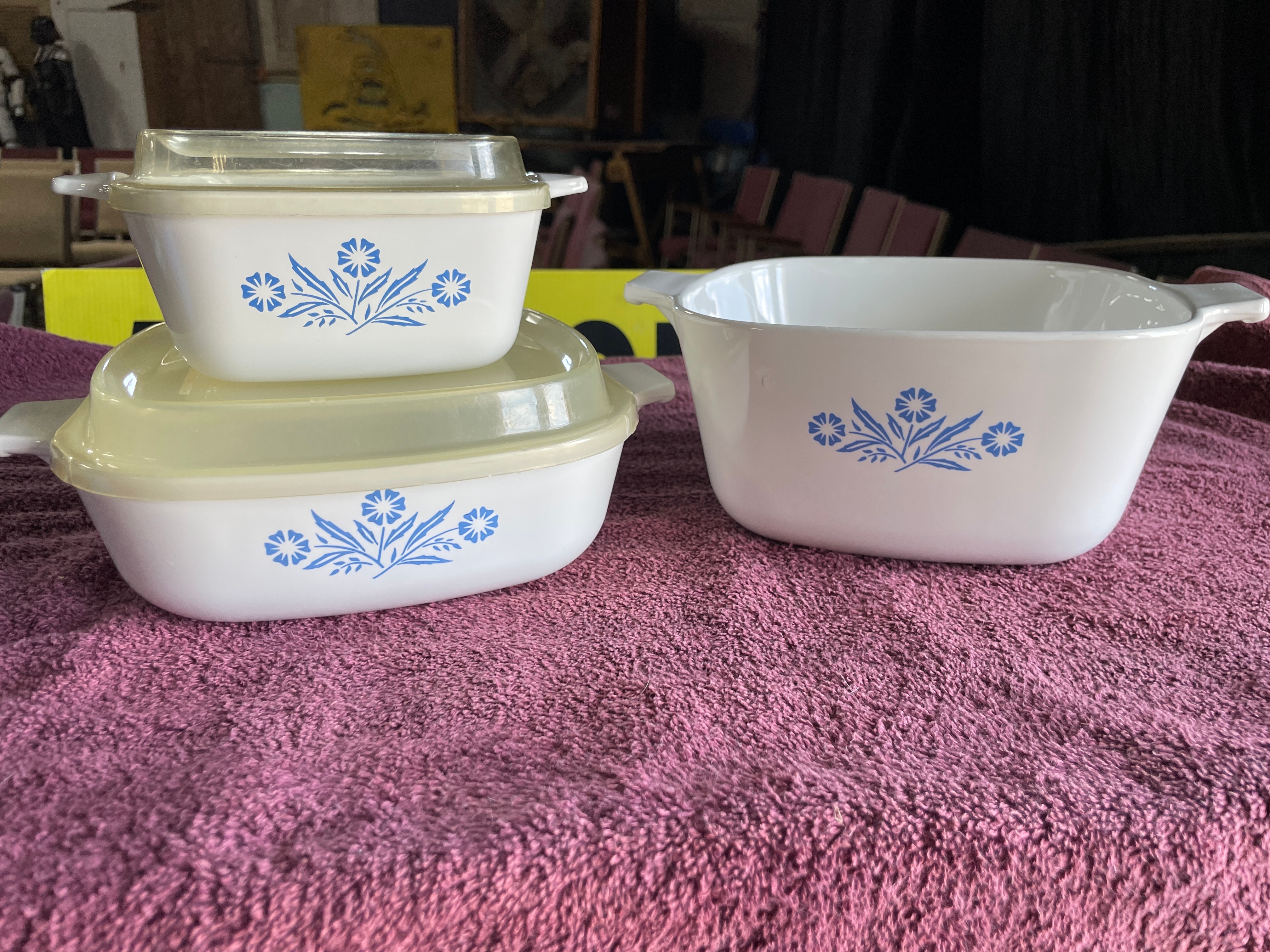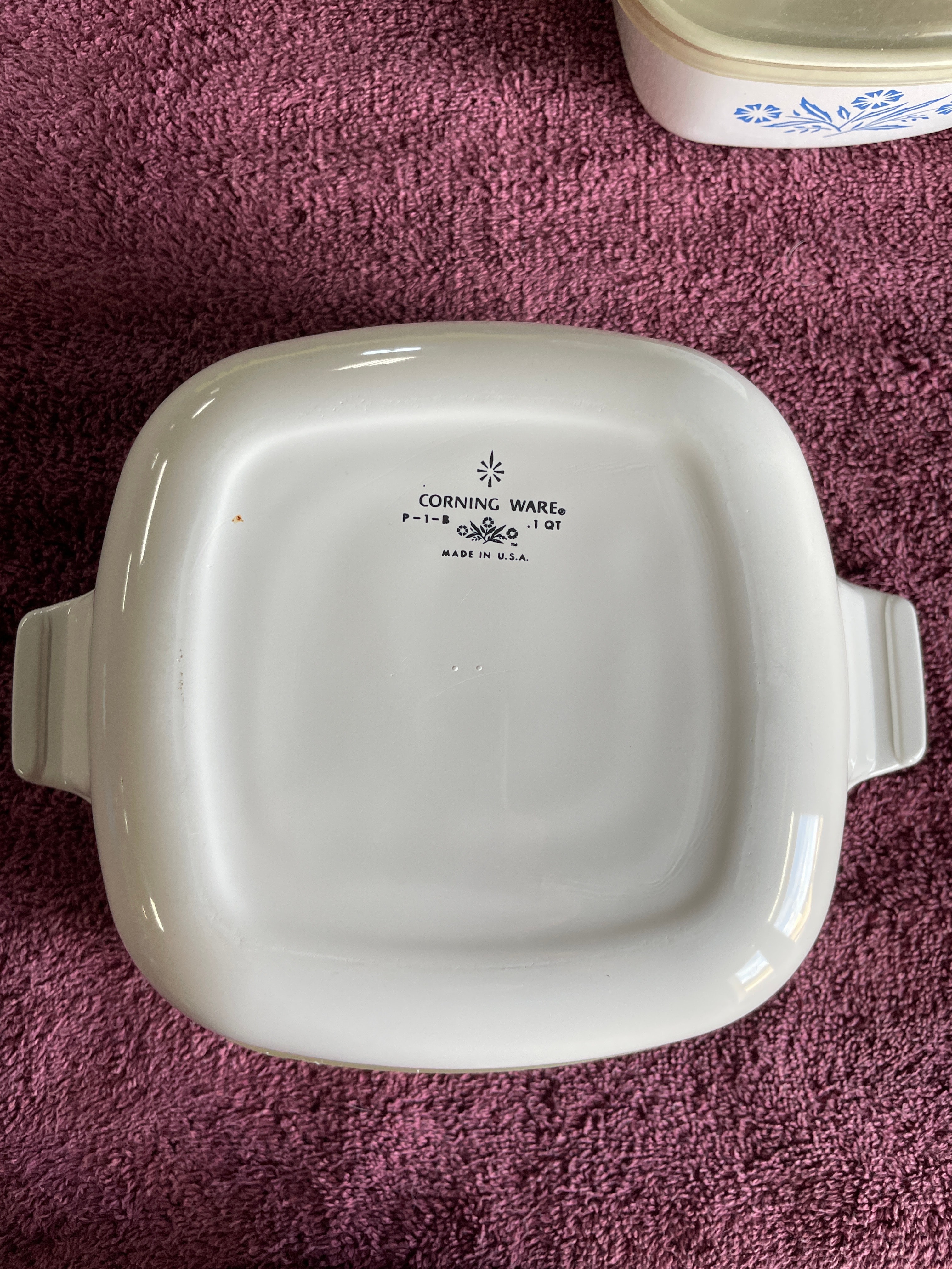 A set of three Corning Ware ‘Blue Cornflower’ pattern glass-ceramic casserole dishes, likely dating from the mid-20th century. Each dish is crafted from white opaque glass-ceramic and adorned with the iconic blue “Cornflower” floral pattern. The set comprises one larger rectangular dish, marked “CORNING WARE® P-1 ¾-B 1 ¾ QT. MADE IN U.S.A.”, and two smaller rectangular dishes. One smaller dish is marked “CORNING WARE® P-1-B .1 QT MADE IN U.S.A.” (likely 1 QT), and the other is marked “CORNING WARE® P-43-B 700 mL”. Two of the dishes retain their original translucent, yellowish plastic lids. One lid is explicitly marked “CORNING WARE® P-43-PC COVER CORNING, N.Y., U.S.A. FOR MICROWAVE AND REFRIGERATOR USE DISHWASHER TOP SHELF NOT FOR RANGE TOP, OVEN OR BROILER”.