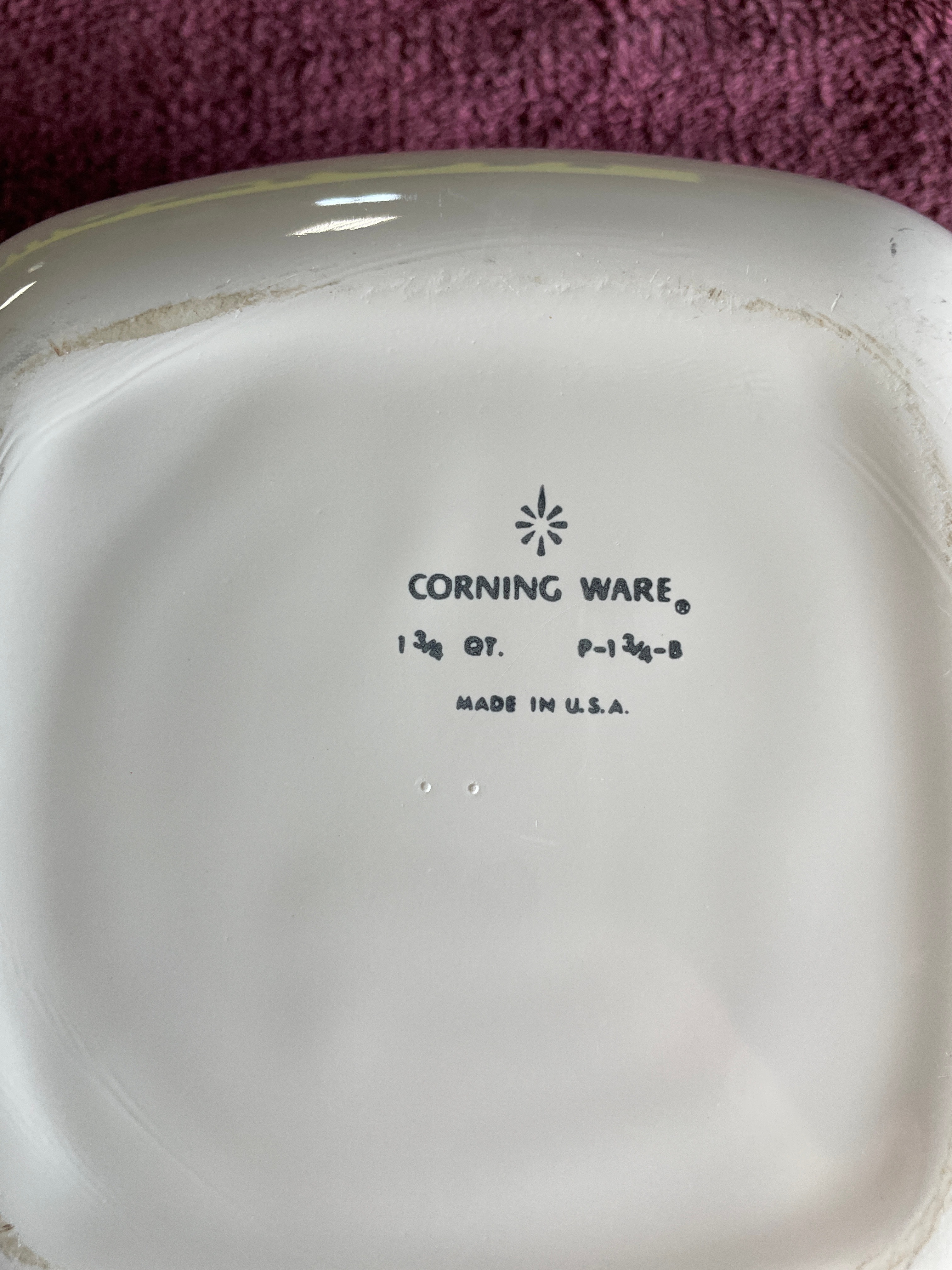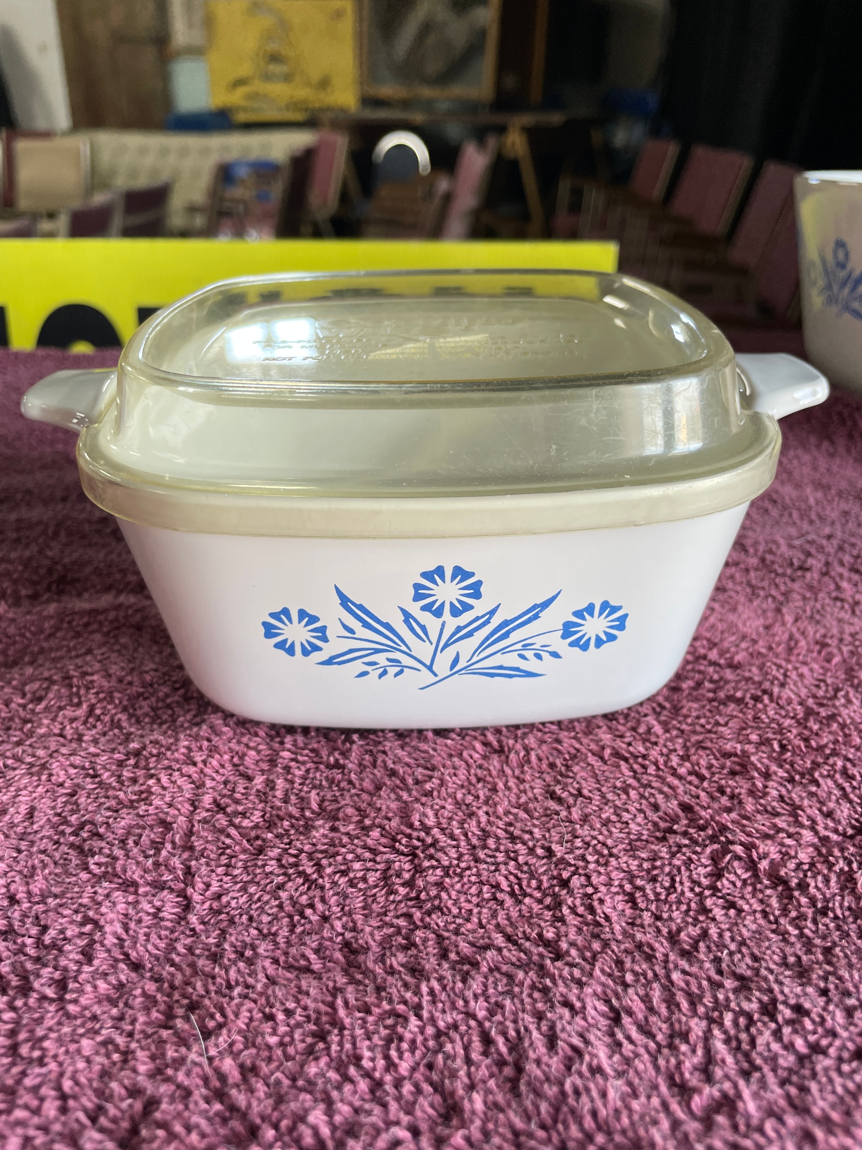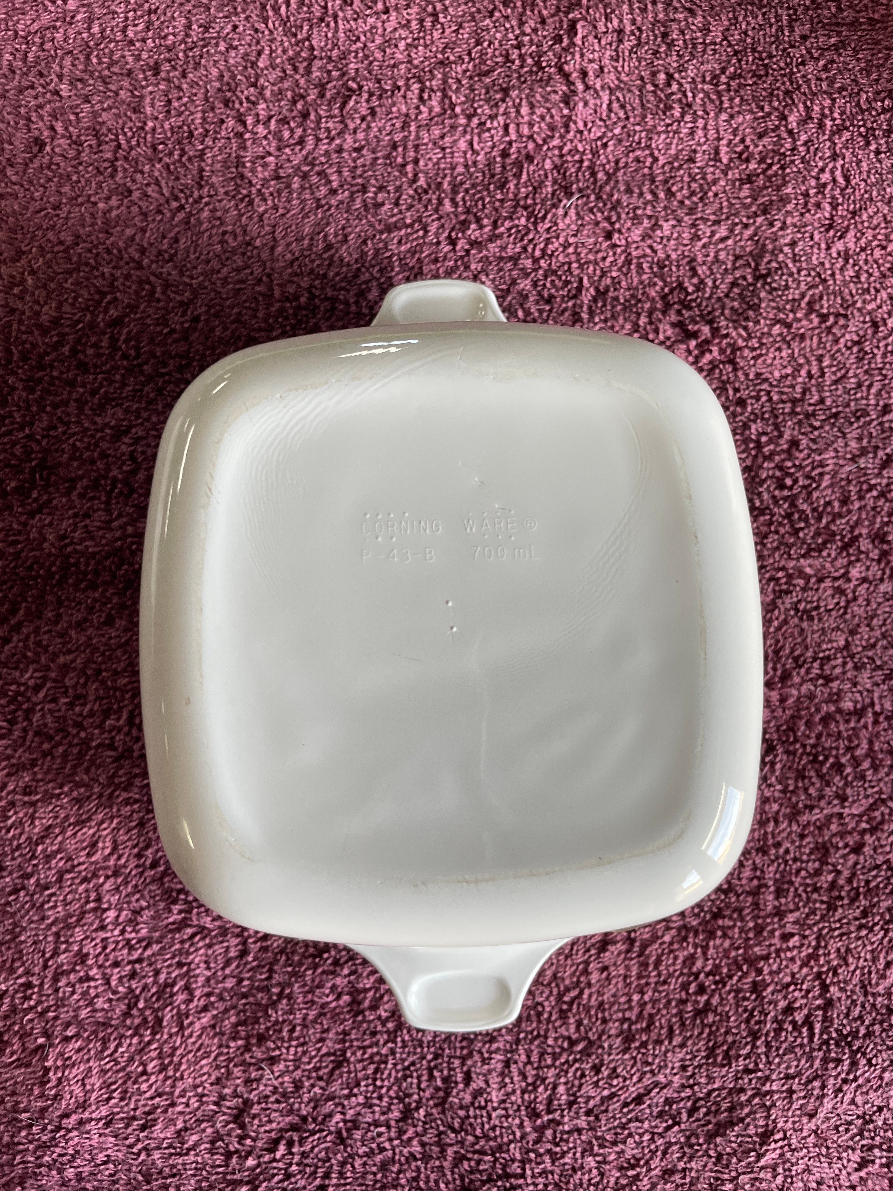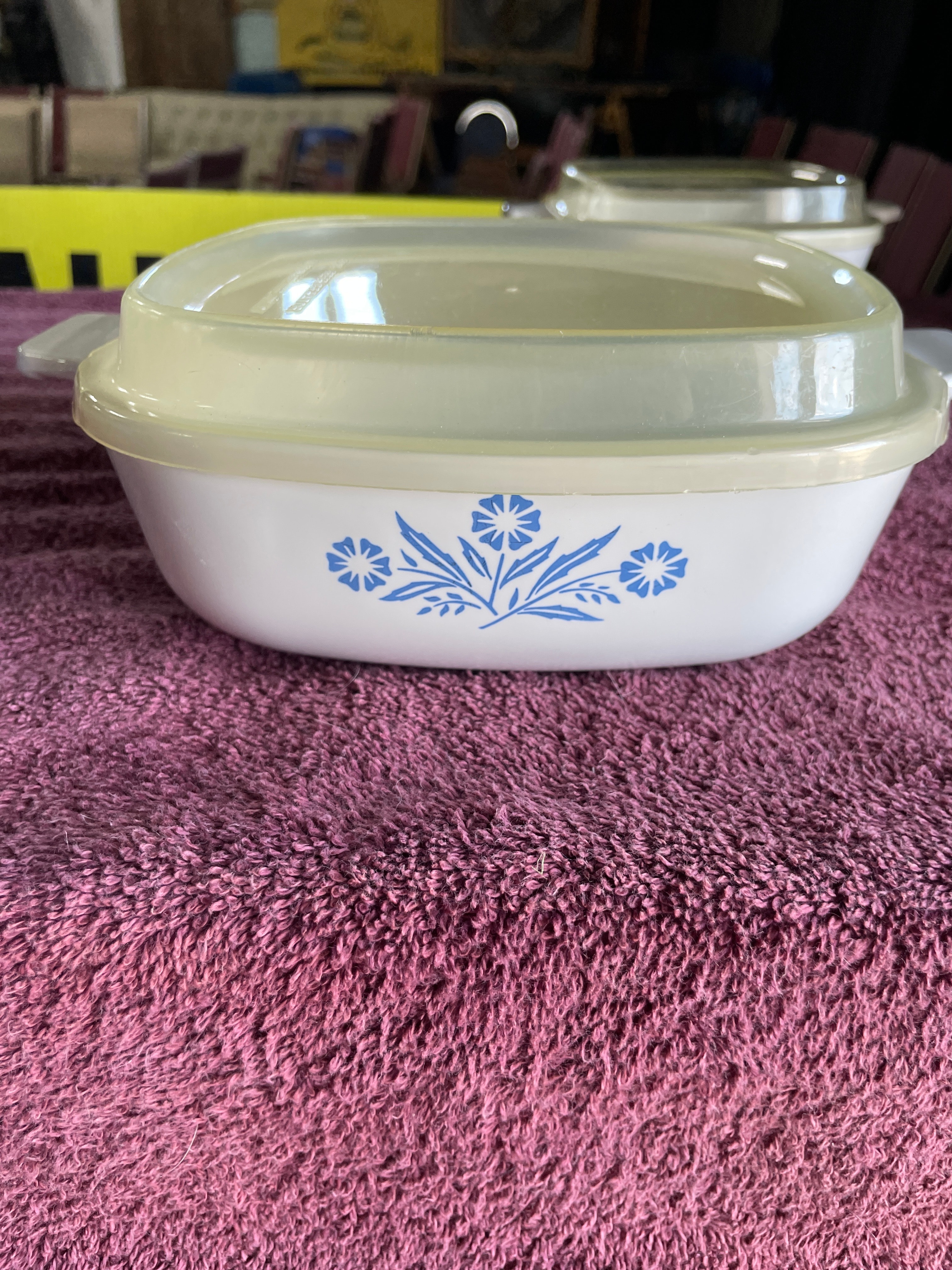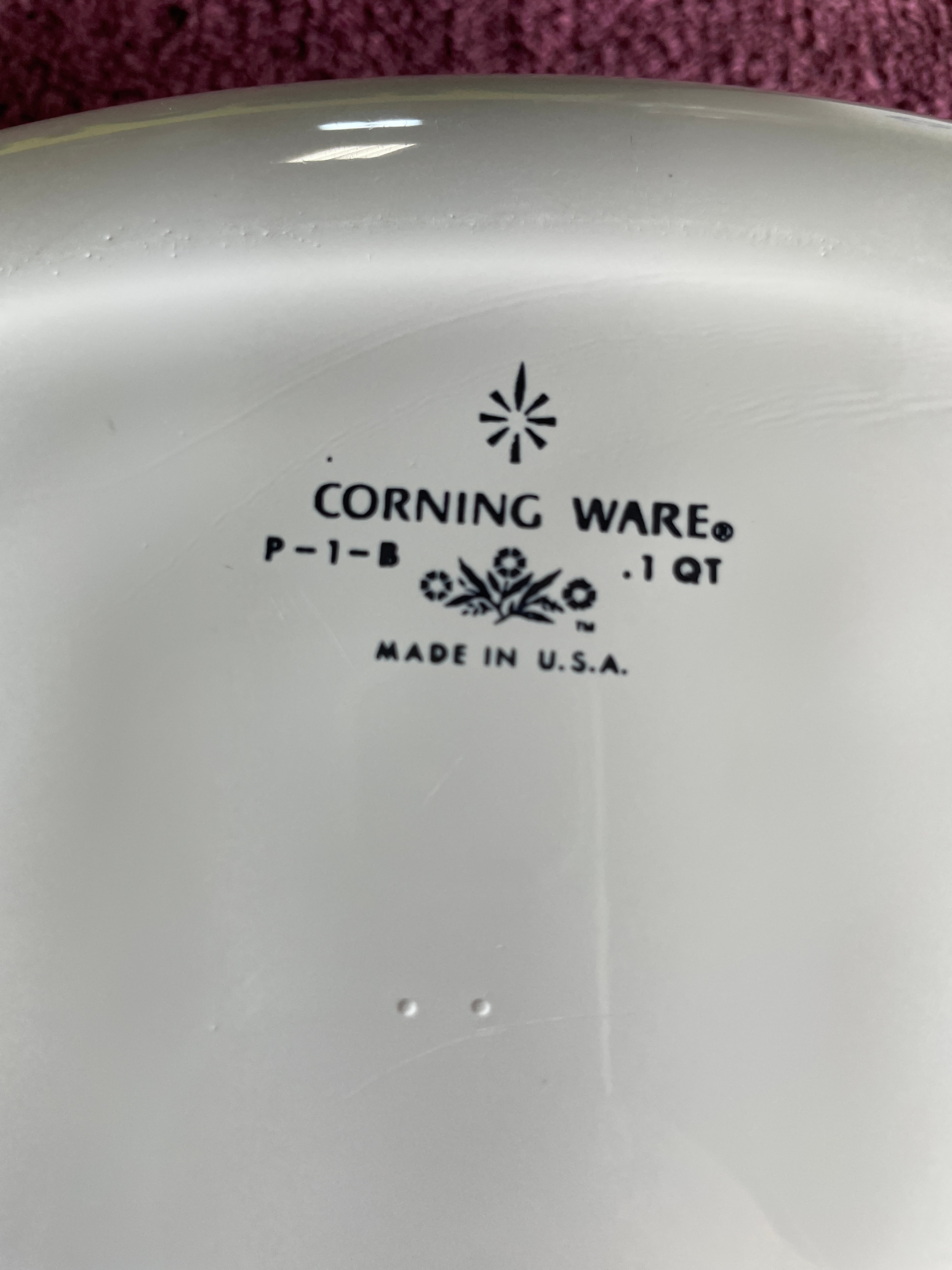 A set of three Corning Ware ‘Blue Cornflower’ pattern glass-ceramic casserole dishes, likely dating from the mid-20th century. Each dish is crafted from white opaque glass-ceramic and adorned with the iconic blue “Cornflower” floral pattern. The set comprises one larger rectangular dish, marked “CORNING WARE® P-1 ¾-B 1 ¾ QT. MADE IN U.S.A.”, and two smaller rectangular dishes. One smaller dish is marked “CORNING WARE® P-1-B .1 QT MADE IN U.S.A.” (likely 1 QT), and the other is marked “CORNING WARE® P-43-B 700 mL”. Two of the dishes retain their original translucent, yellowish plastic lids. One lid is explicitly marked “CORNING WARE® P-43-PC COVER CORNING, N.Y., U.S.A. FOR MICROWAVE AND REFRIGERATOR USE DISHWASHER TOP SHELF NOT FOR RANGE TOP, OVEN OR BROILER”.