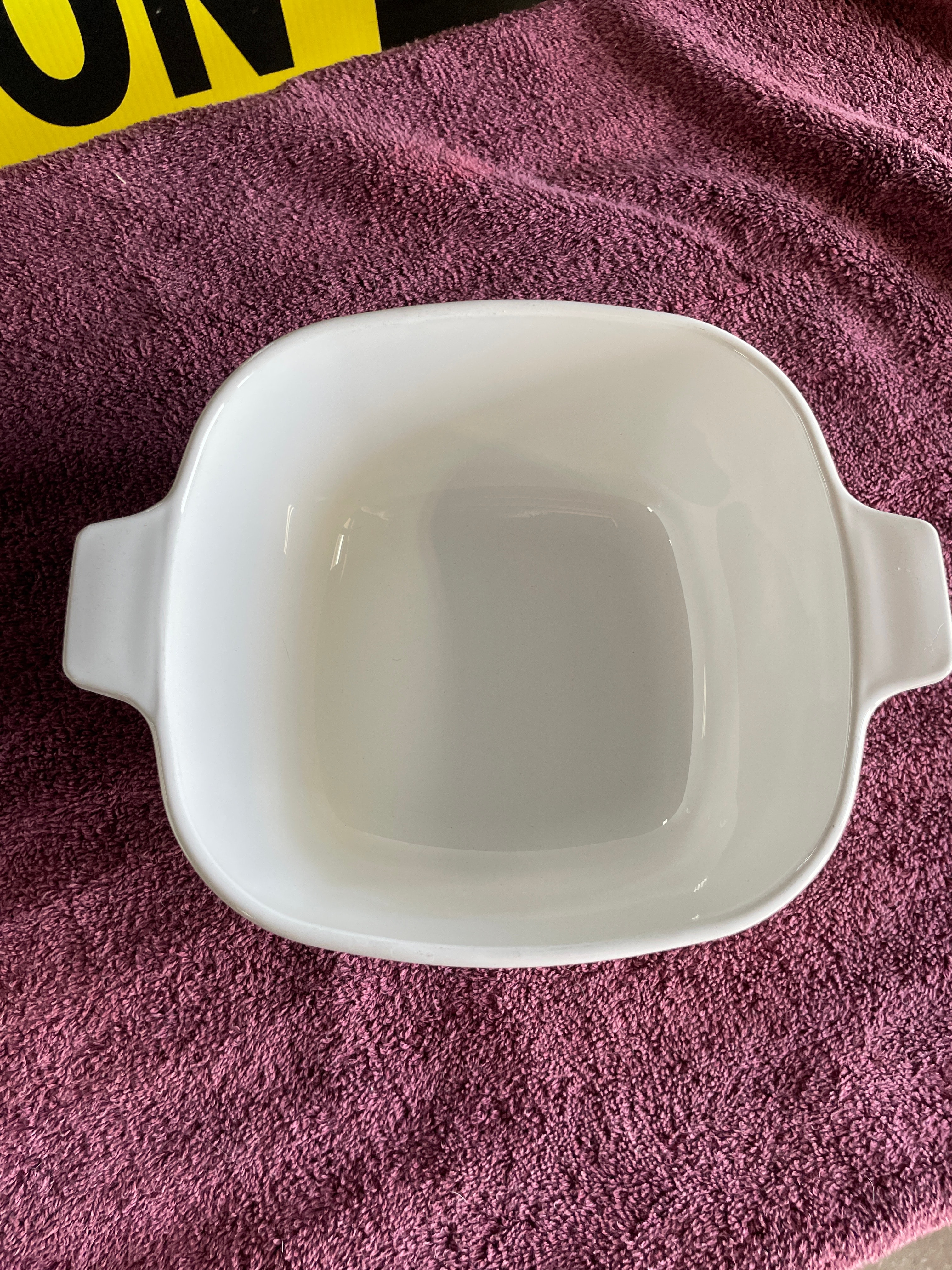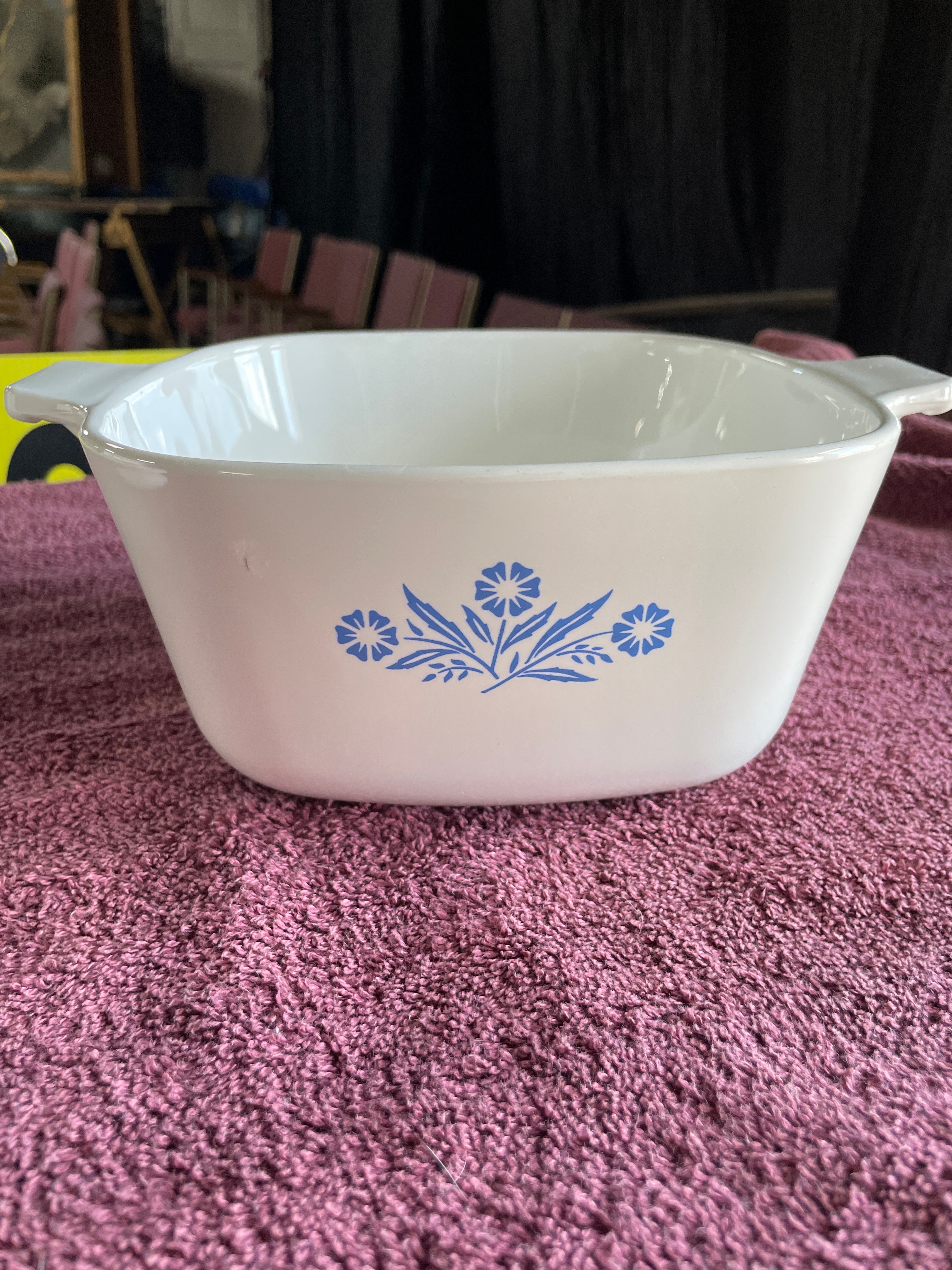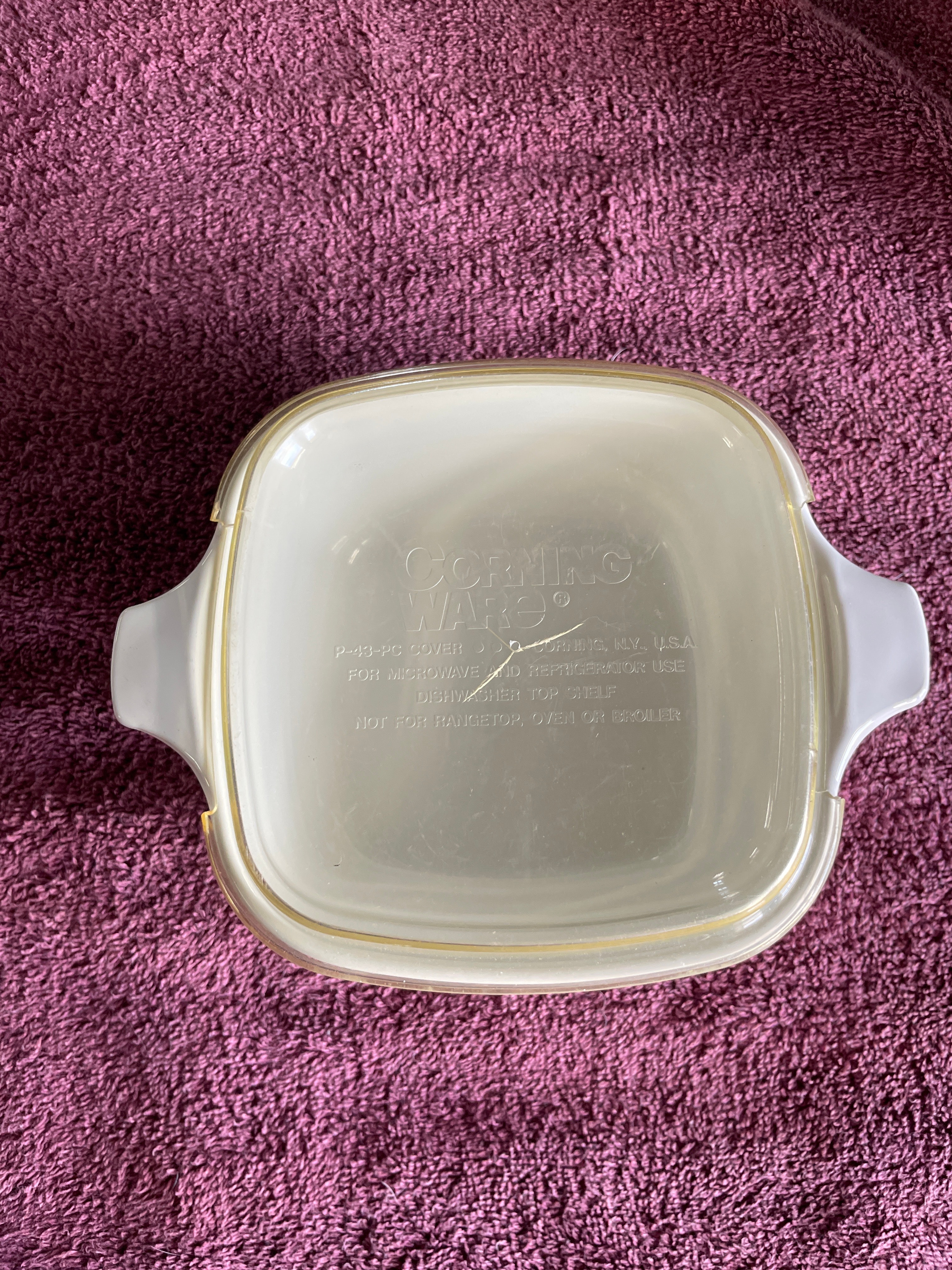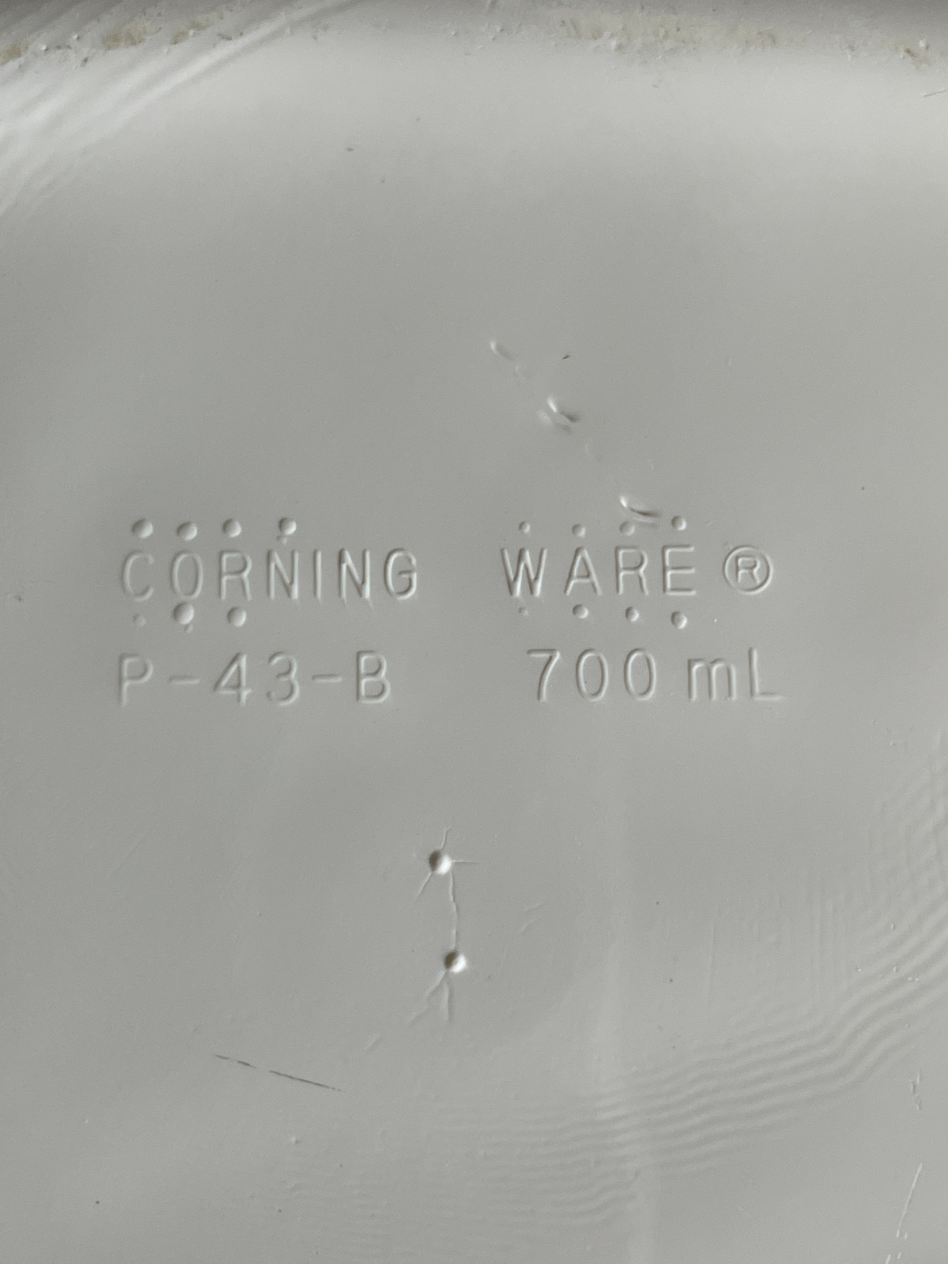 A set of three Corning Ware ‘Blue Cornflower’ pattern glass-ceramic casserole dishes, likely dating from the mid-20th century. Each dish is crafted from white opaque glass-ceramic and adorned with the iconic blue “Cornflower” floral pattern. The set comprises one larger rectangular dish, marked “CORNING WARE® P-1 ¾-B 1 ¾ QT. MADE IN U.S.A.”, and two smaller rectangular dishes. One smaller dish is marked “CORNING WARE® P-1-B .1 QT MADE IN U.S.A.” (likely 1 QT), and the other is marked “CORNING WARE® P-43-B 700 mL”. Two of the dishes retain their original translucent, yellowish plastic lids. One lid is explicitly marked “CORNING WARE® P-43-PC COVER CORNING, N.Y., U.S.A. FOR MICROWAVE AND REFRIGERATOR USE DISHWASHER TOP SHELF NOT FOR RANGE TOP, OVEN OR BROILER”.