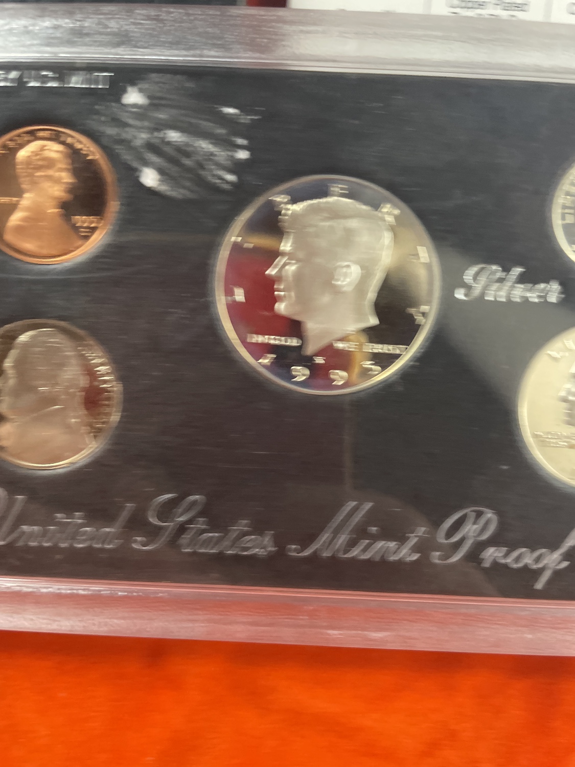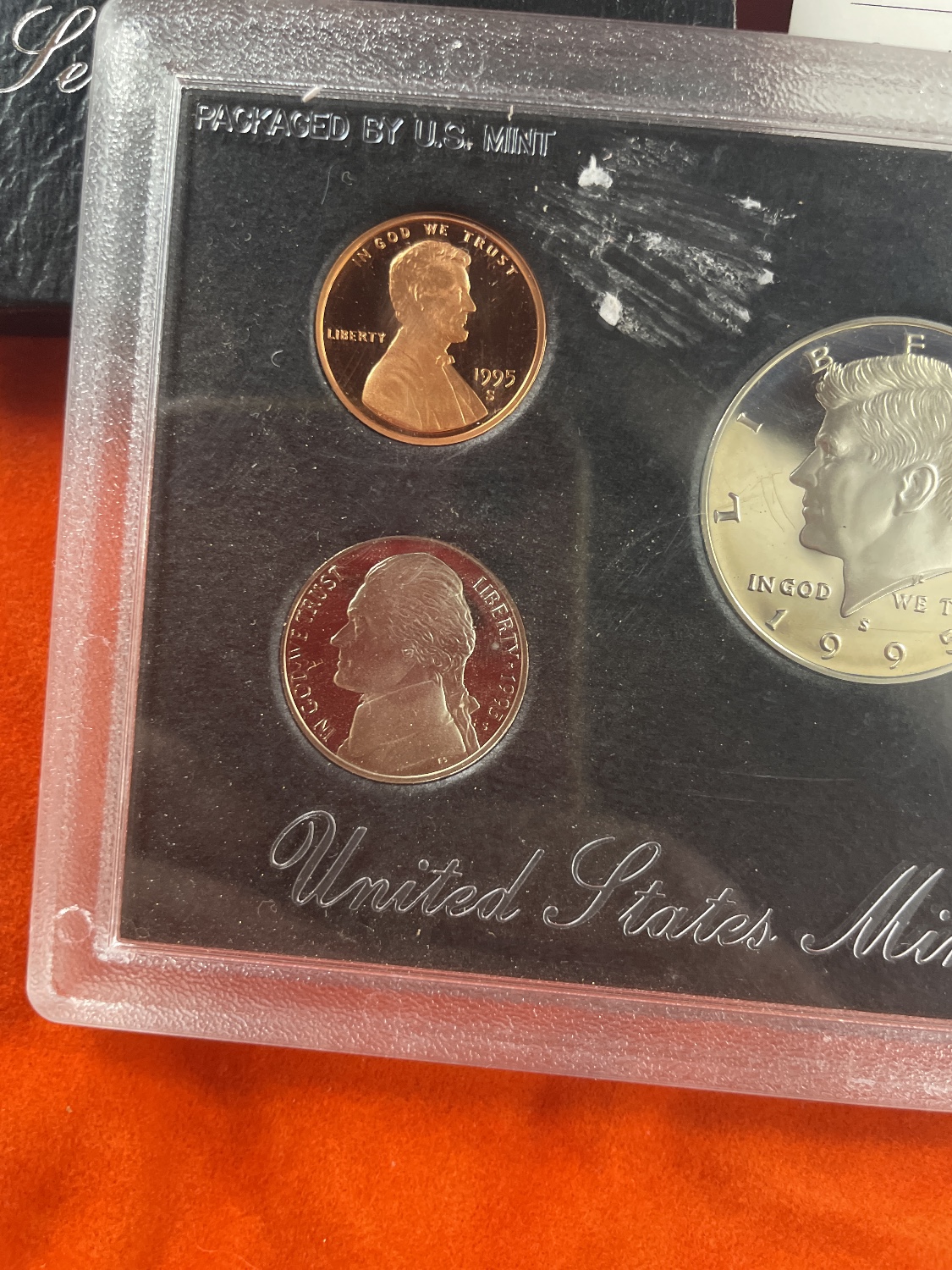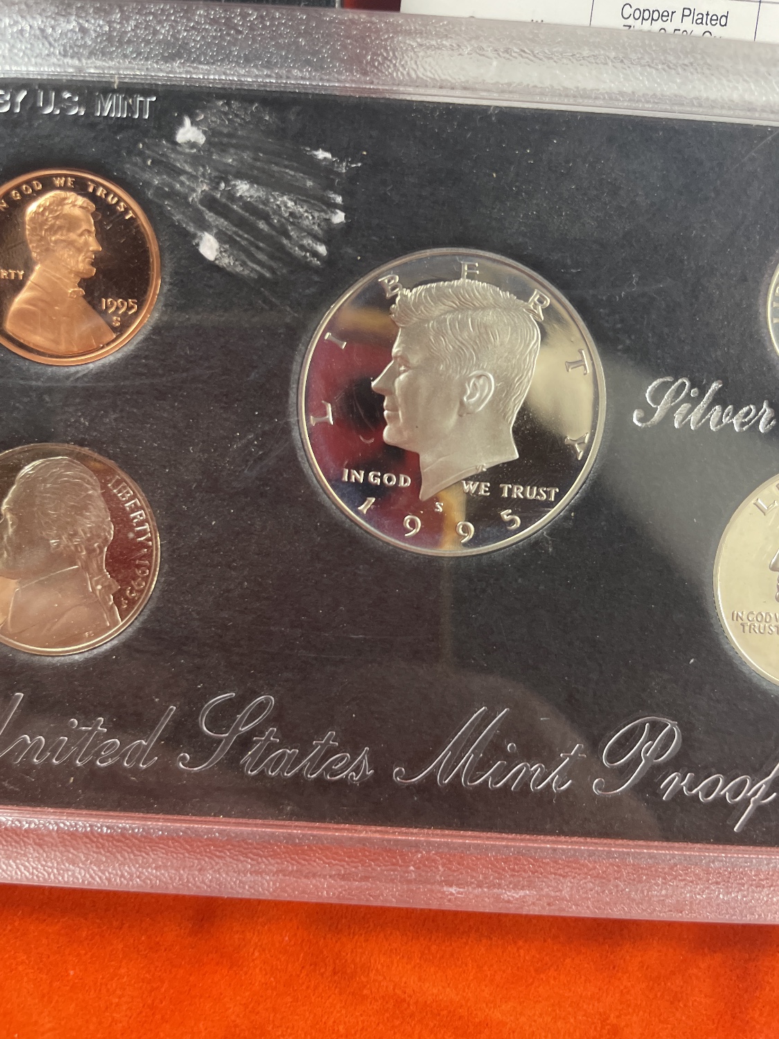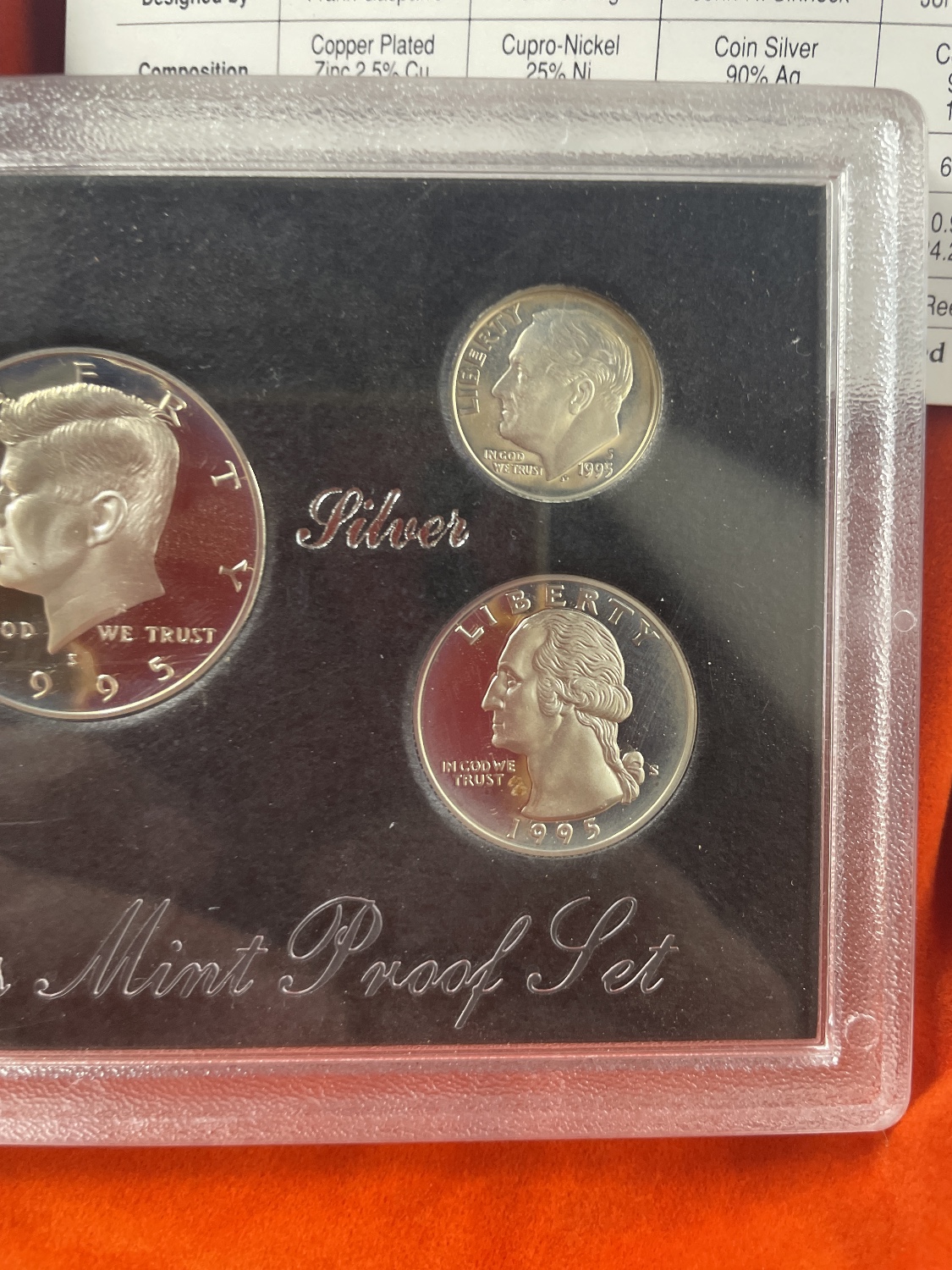 This lot contains a 1995 United States Mint Silver Proof Set, consisting of five coins (one copper-toned penny, one nickel-toned nickel, and three silver-toned coins including a dime, quarter, and half dollar) sealed in a clear plastic case, along with a black folder and a white “Certificate of Authenticity”.