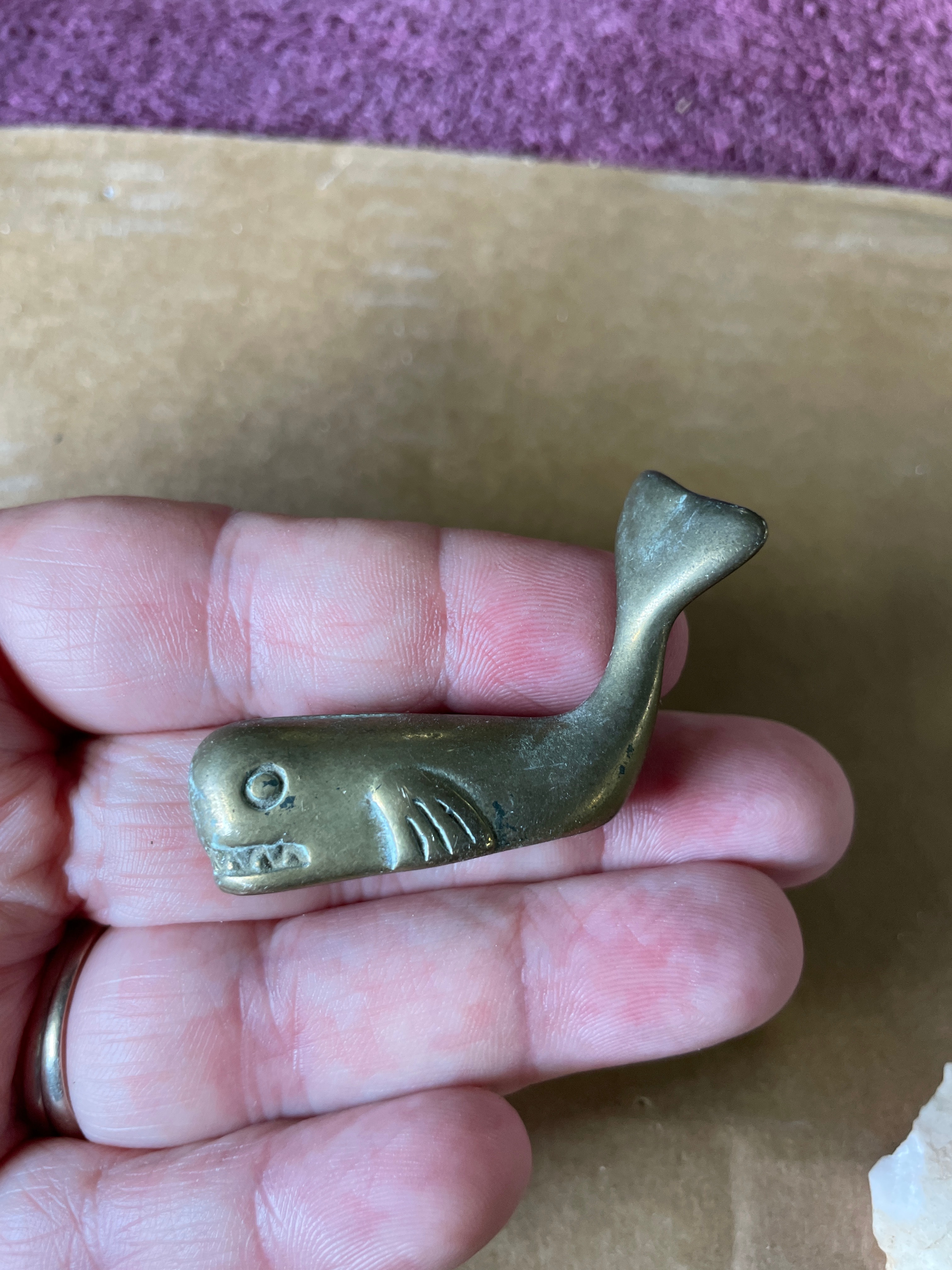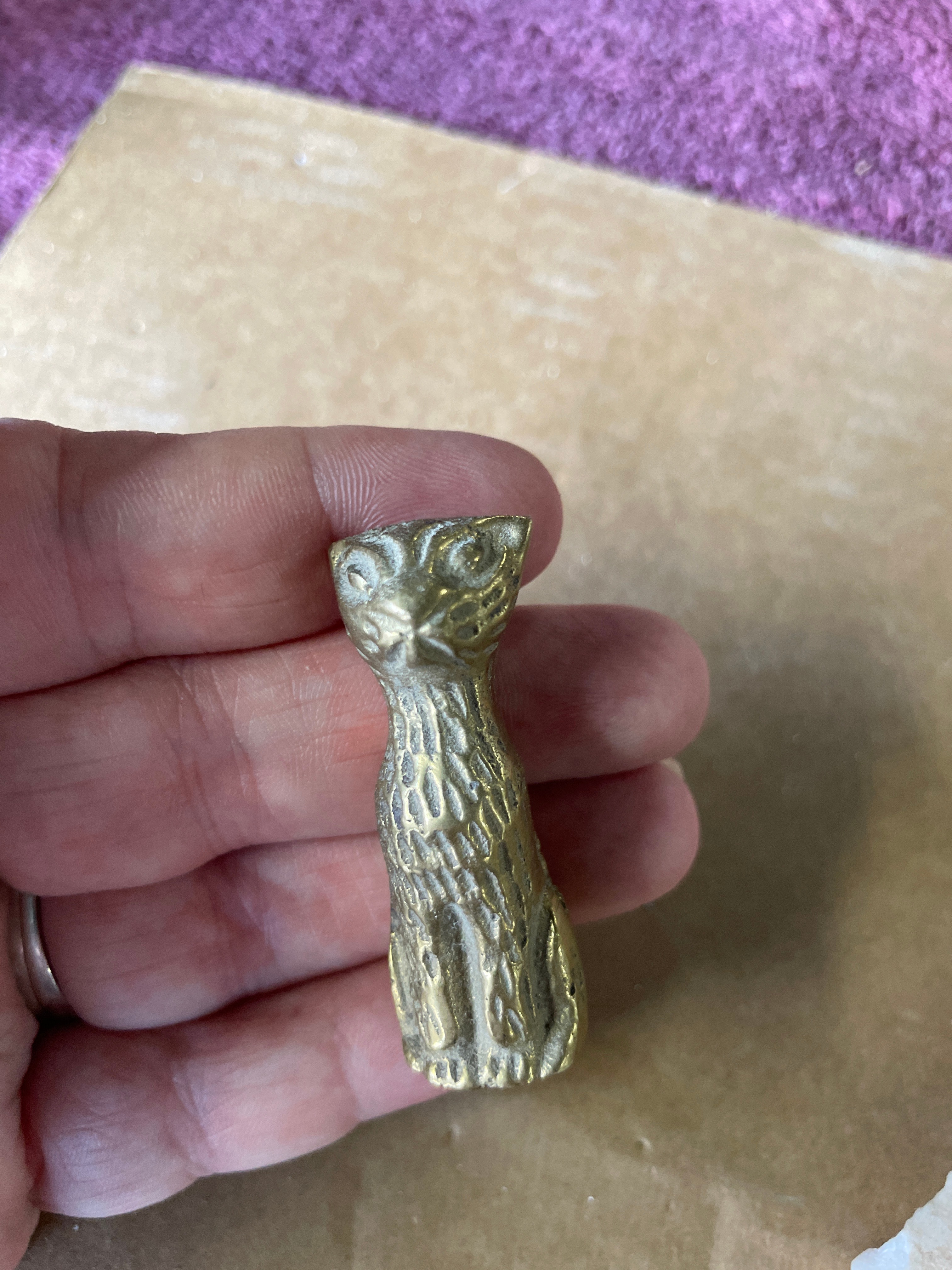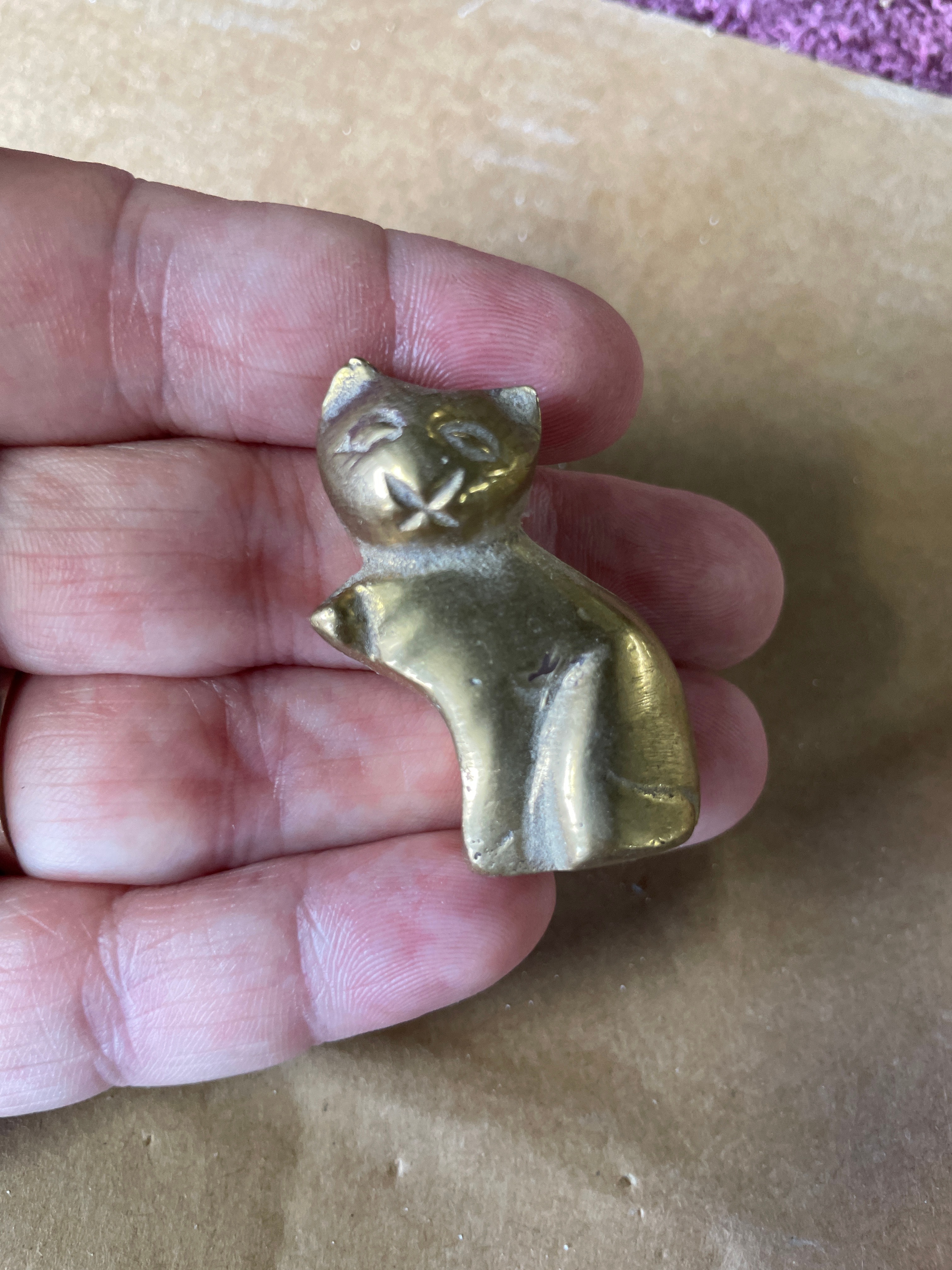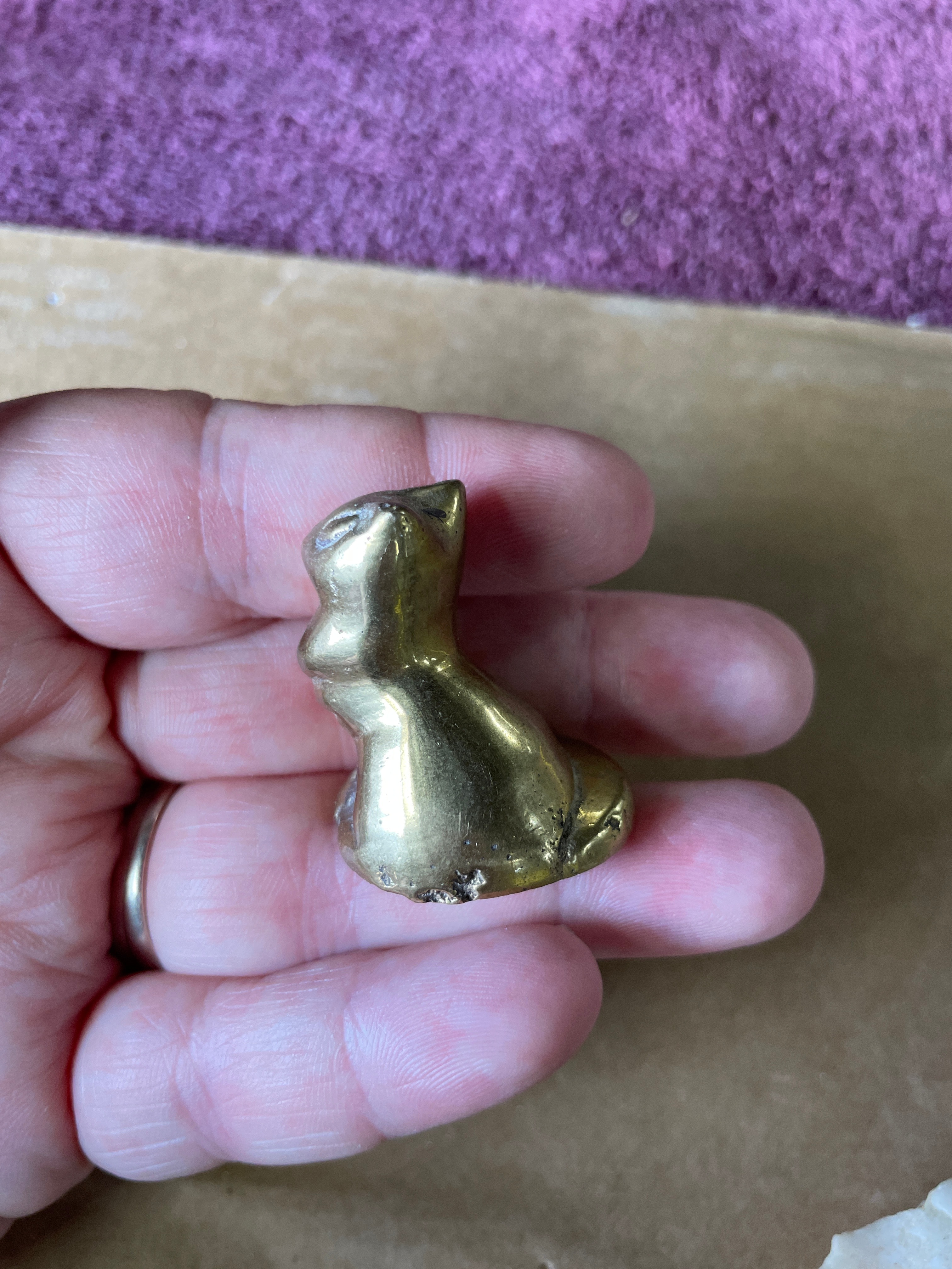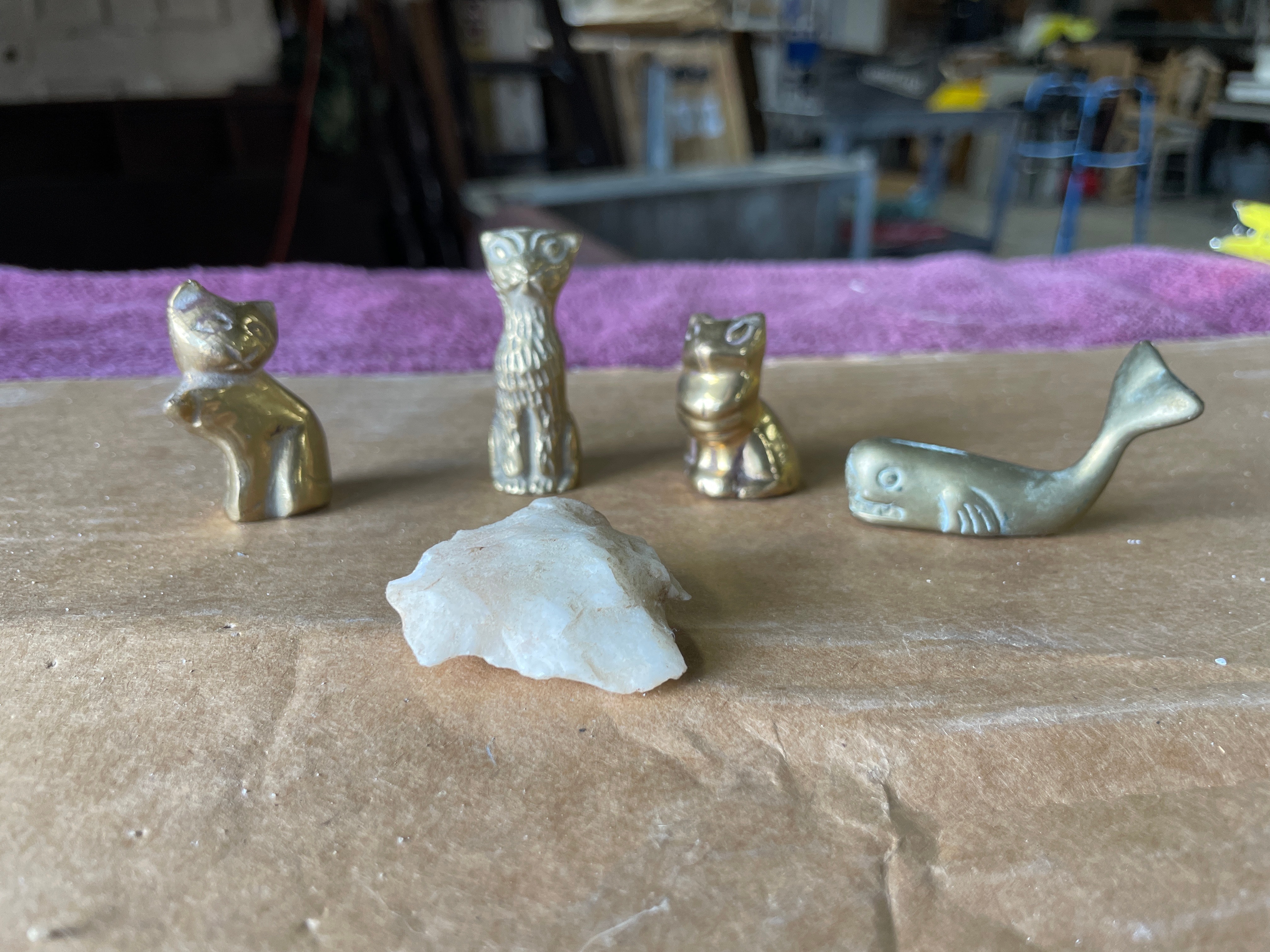 A group of four miniature animal figurines cast in brass or a similar copper alloy, accompanied by a natural mineral fragment. The figurines include a seated cat with a smooth finish, a taller textured figure resembling an owl or stylized cat, a crouching cat with a polished surface, and a whale with incised eyes, mouth, and gills. All metallic pieces exhibit a warm golden hue and stylized forms. The fifth item is an irregularly shaped, rough fragment of a light-colored, likely crystalline mineral such as quartz, displaying some faint reddish-brown inclusions, presented in its natural, unpolished state. The undersides of the metallic figurines show manufacturing finishing marks.