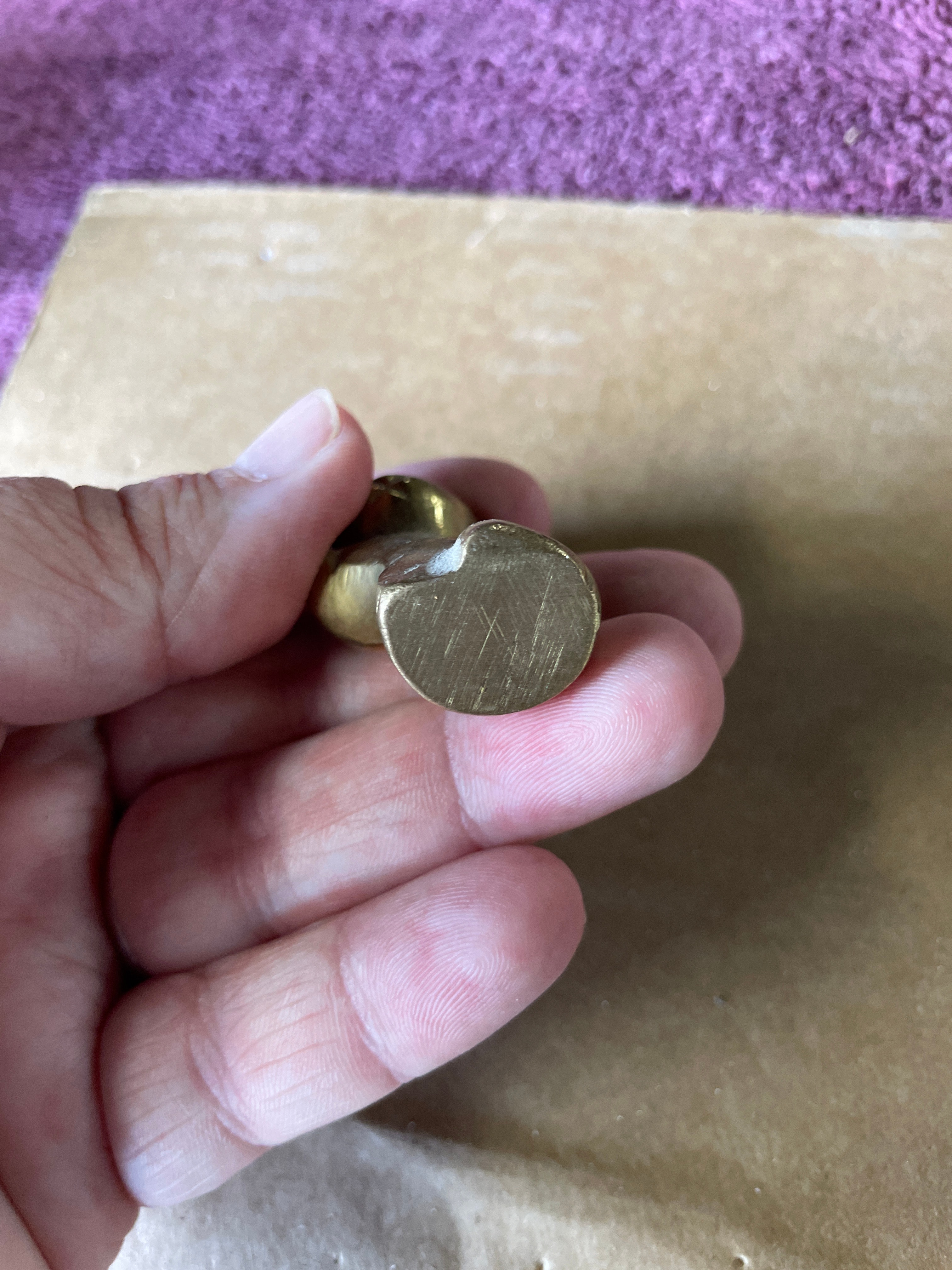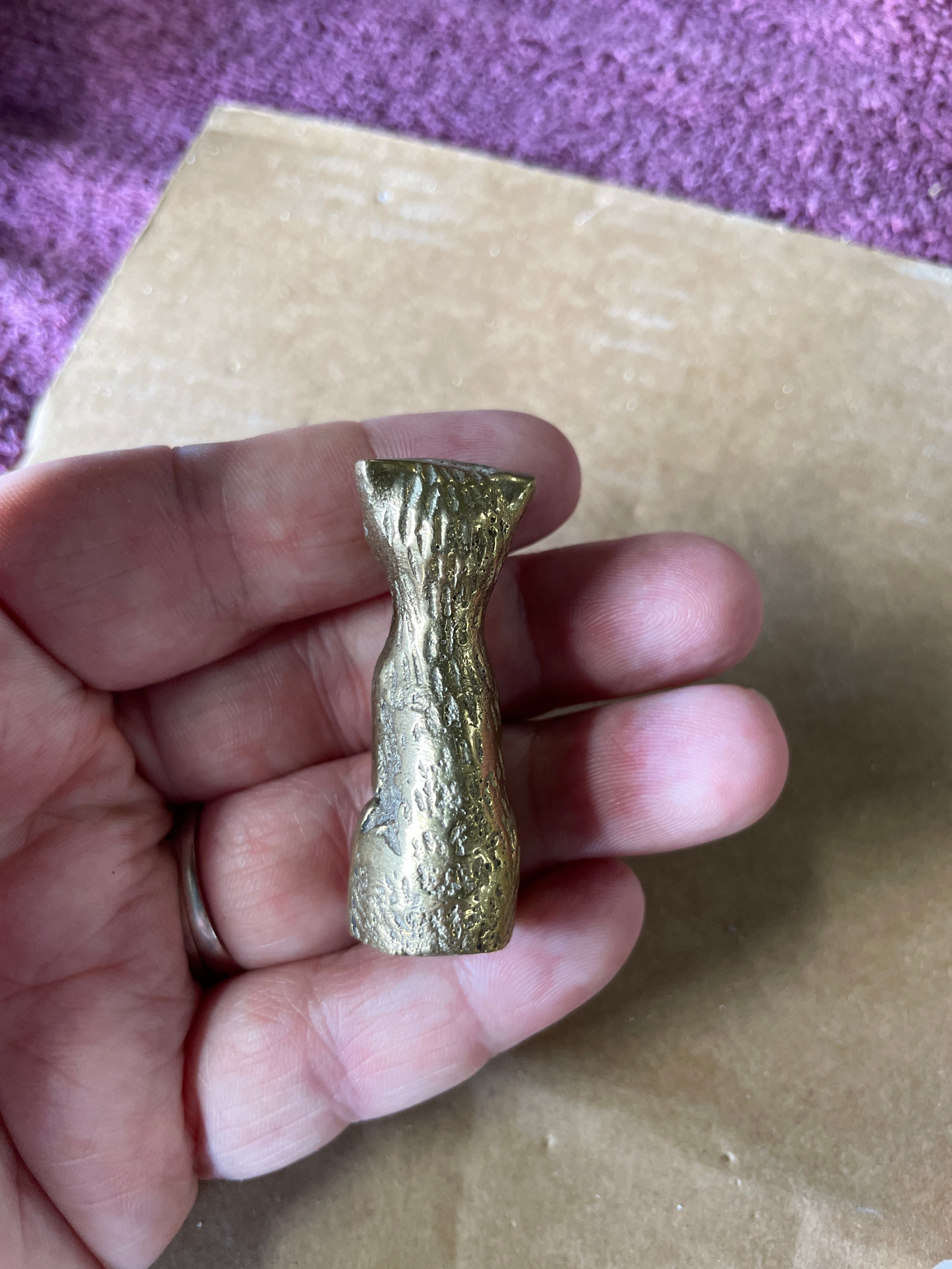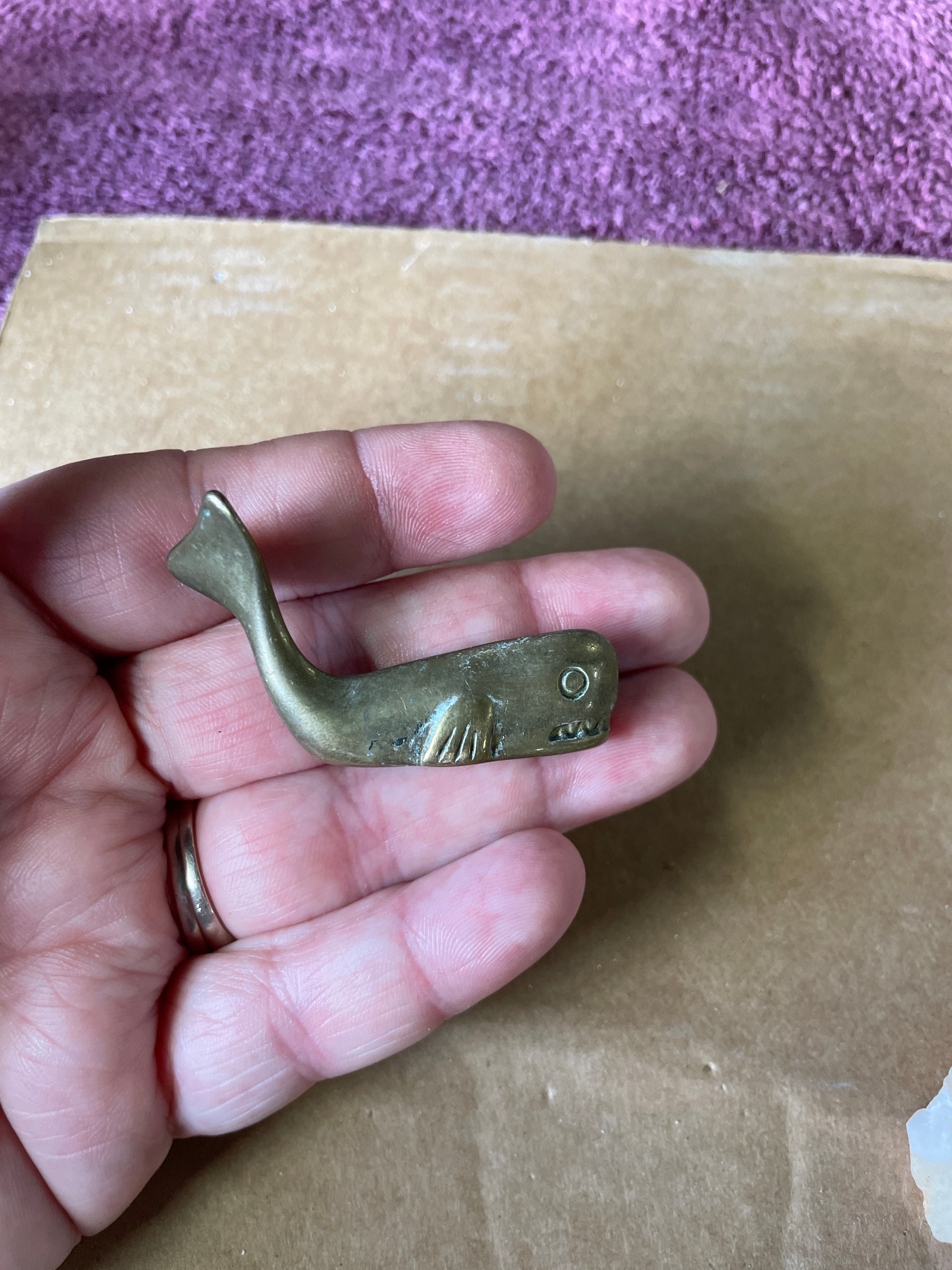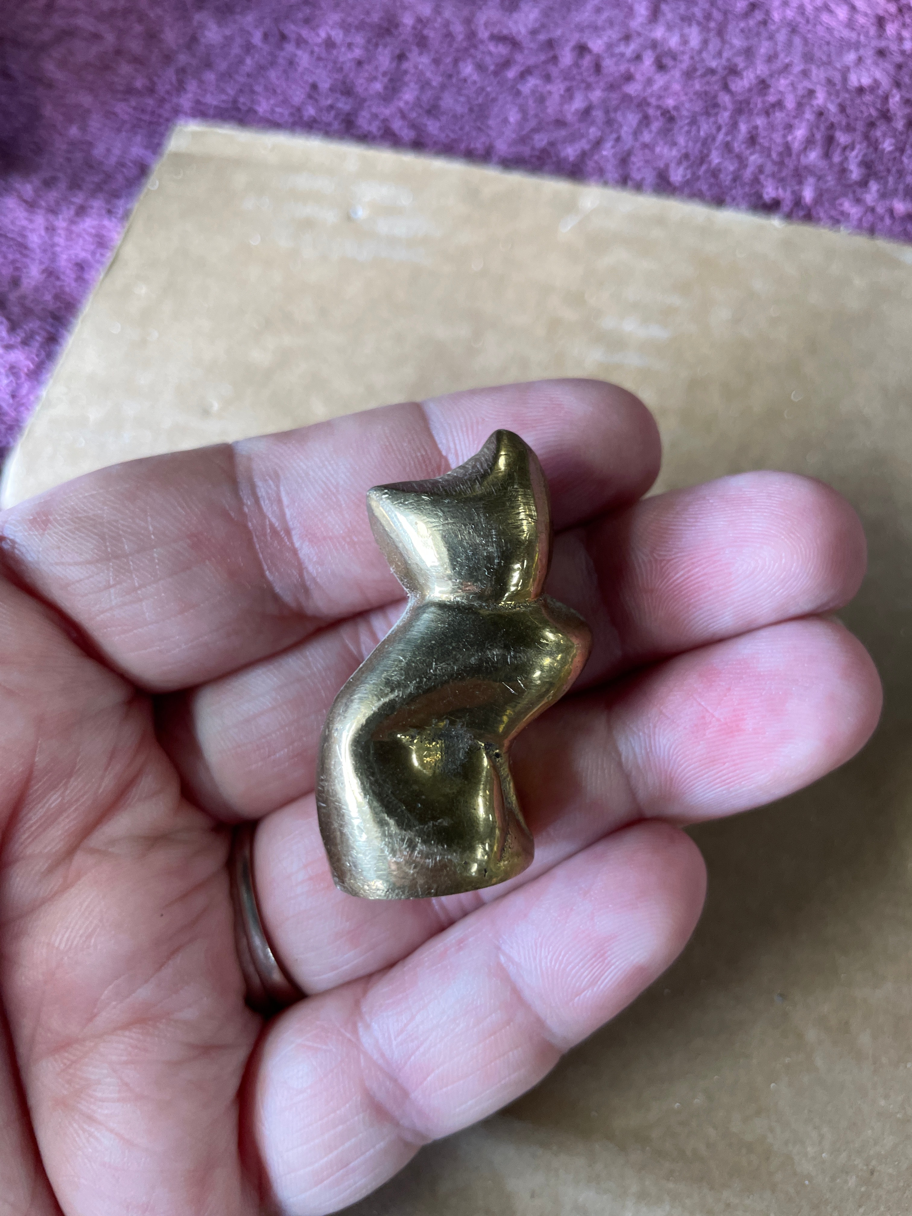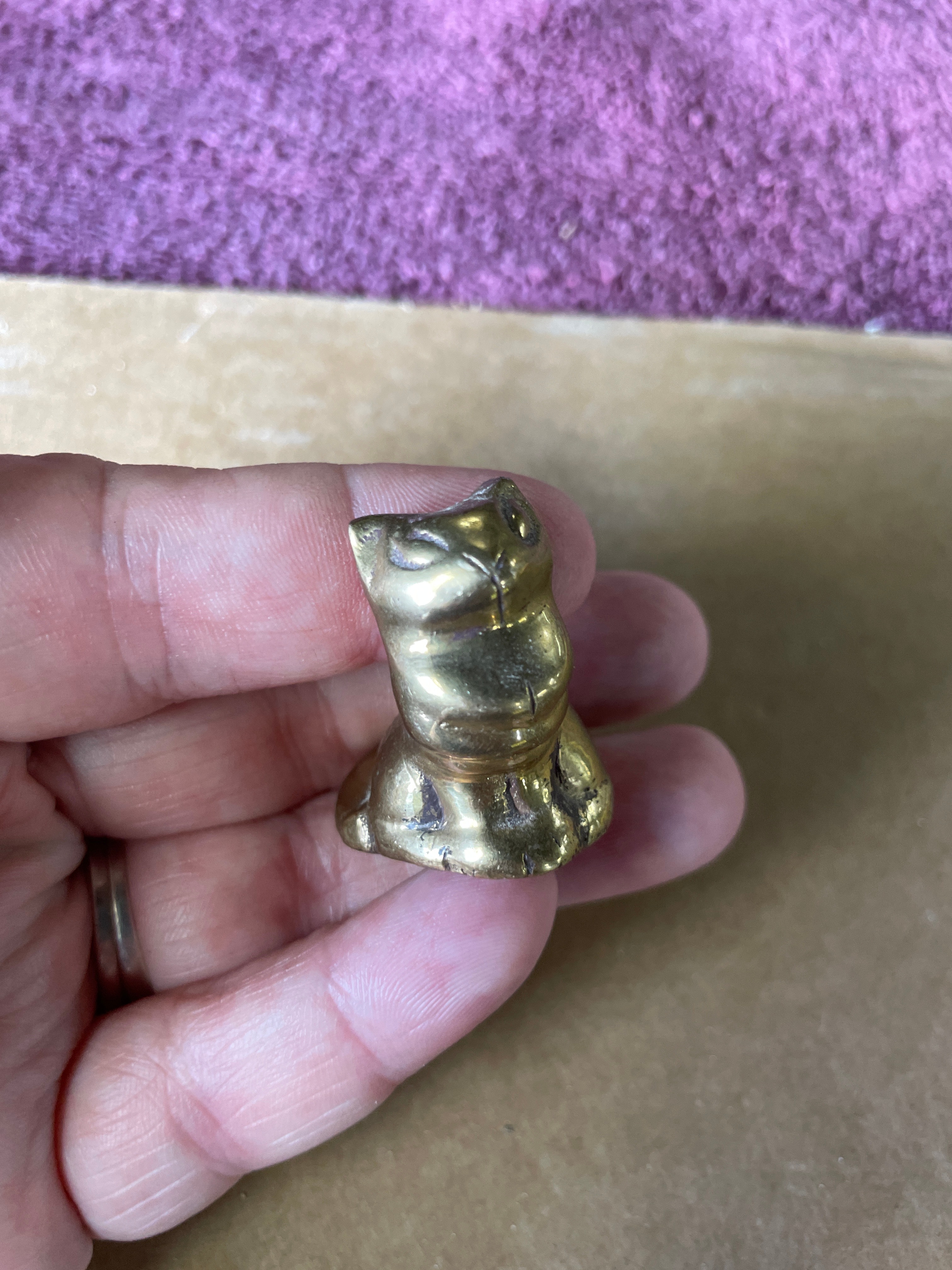 A group of four miniature animal figurines cast in brass or a similar copper alloy, accompanied by a natural mineral fragment. The figurines include a seated cat with a smooth finish, a taller textured figure resembling an owl or stylized cat, a crouching cat with a polished surface, and a whale with incised eyes, mouth, and gills. All metallic pieces exhibit a warm golden hue and stylized forms. The fifth item is an irregularly shaped, rough fragment of a light-colored, likely crystalline mineral such as quartz, displaying some faint reddish-brown inclusions, presented in its natural, unpolished state. The undersides of the metallic figurines show manufacturing finishing marks.