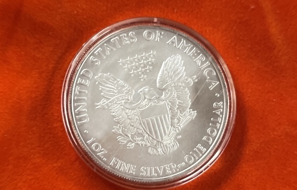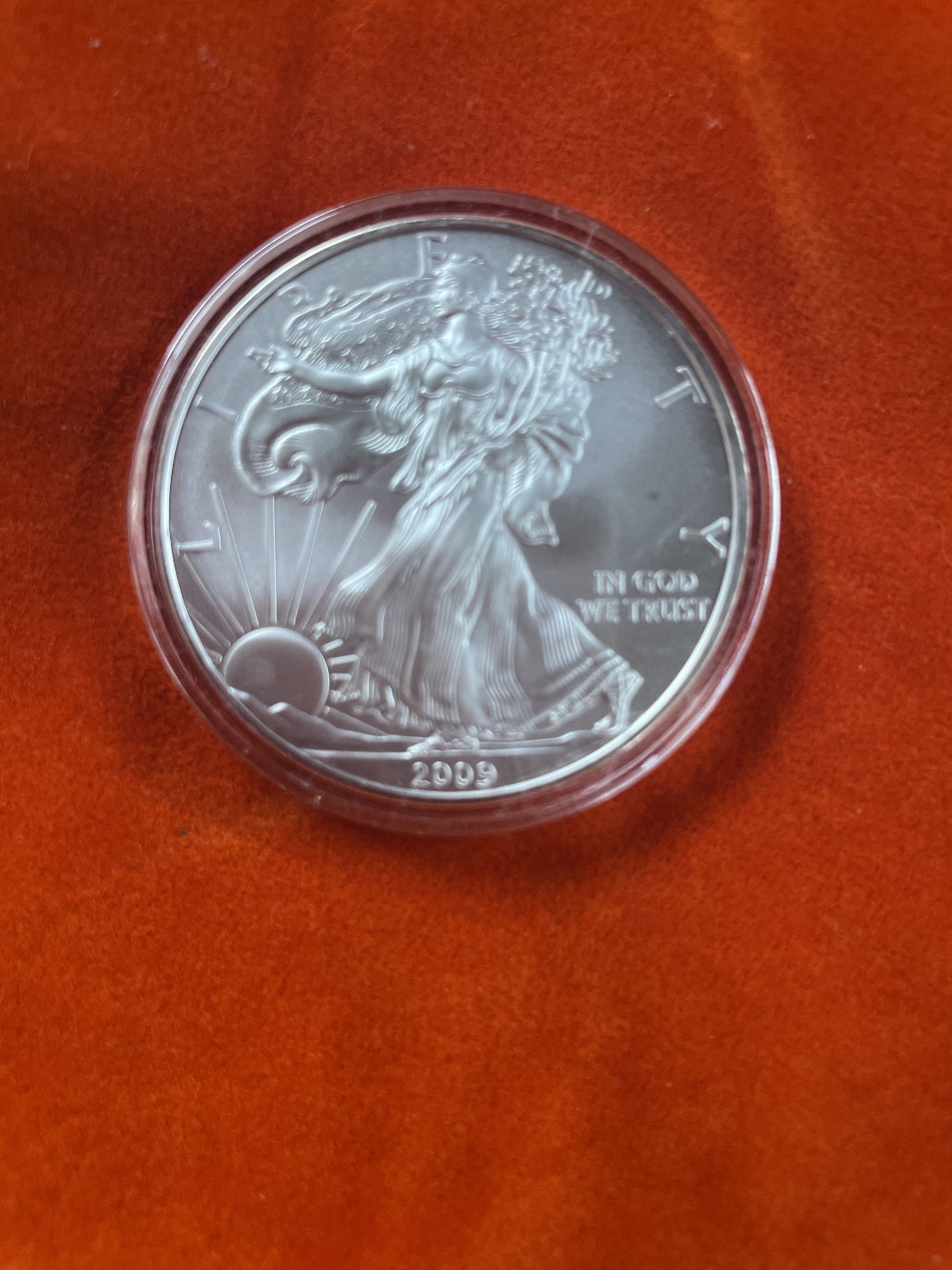 A 2009 American Silver Eagle 1 oz fine silver coin in a protective capsule, displaying “IN GOD WE TRUST”, “UNITED STATES OF AMERICA”, and “ONE DOLLAR”.