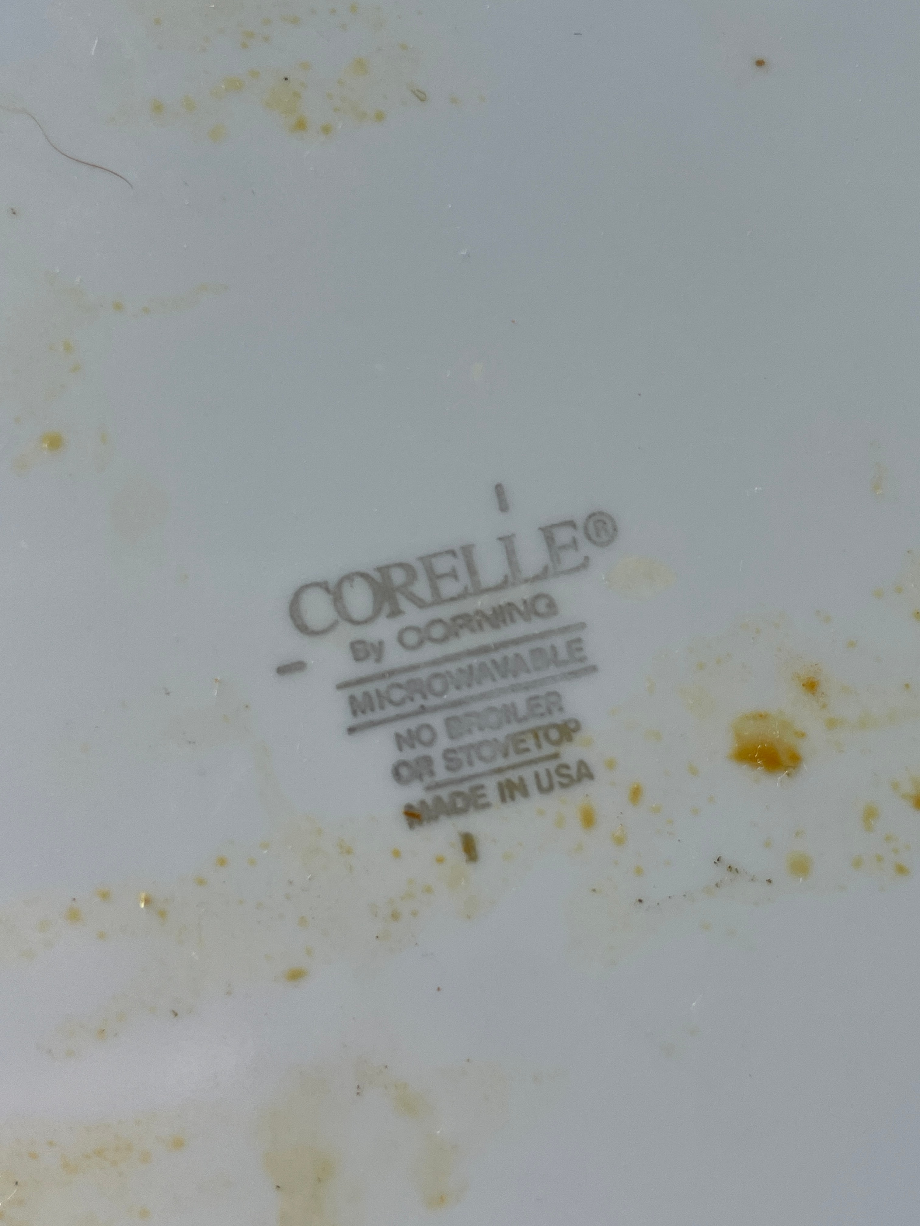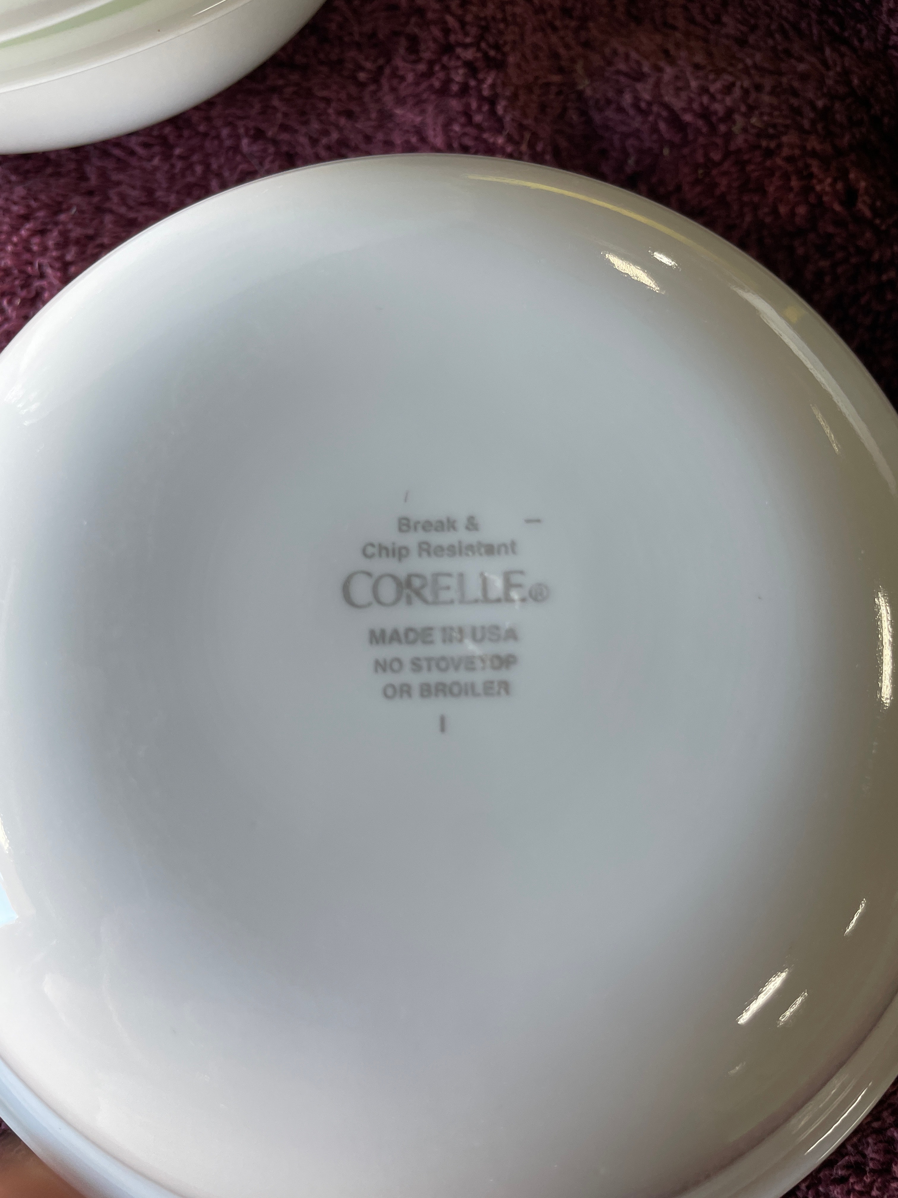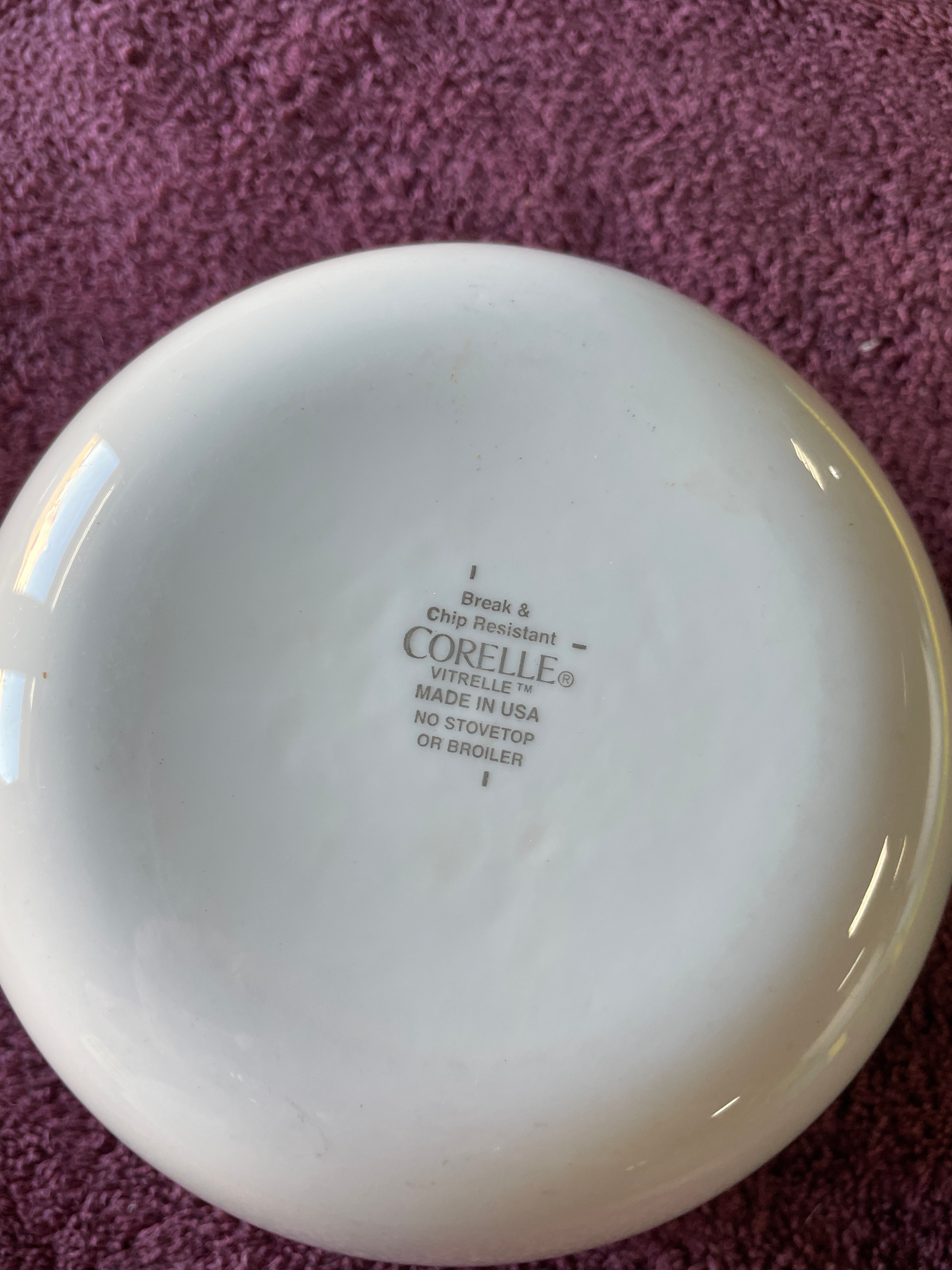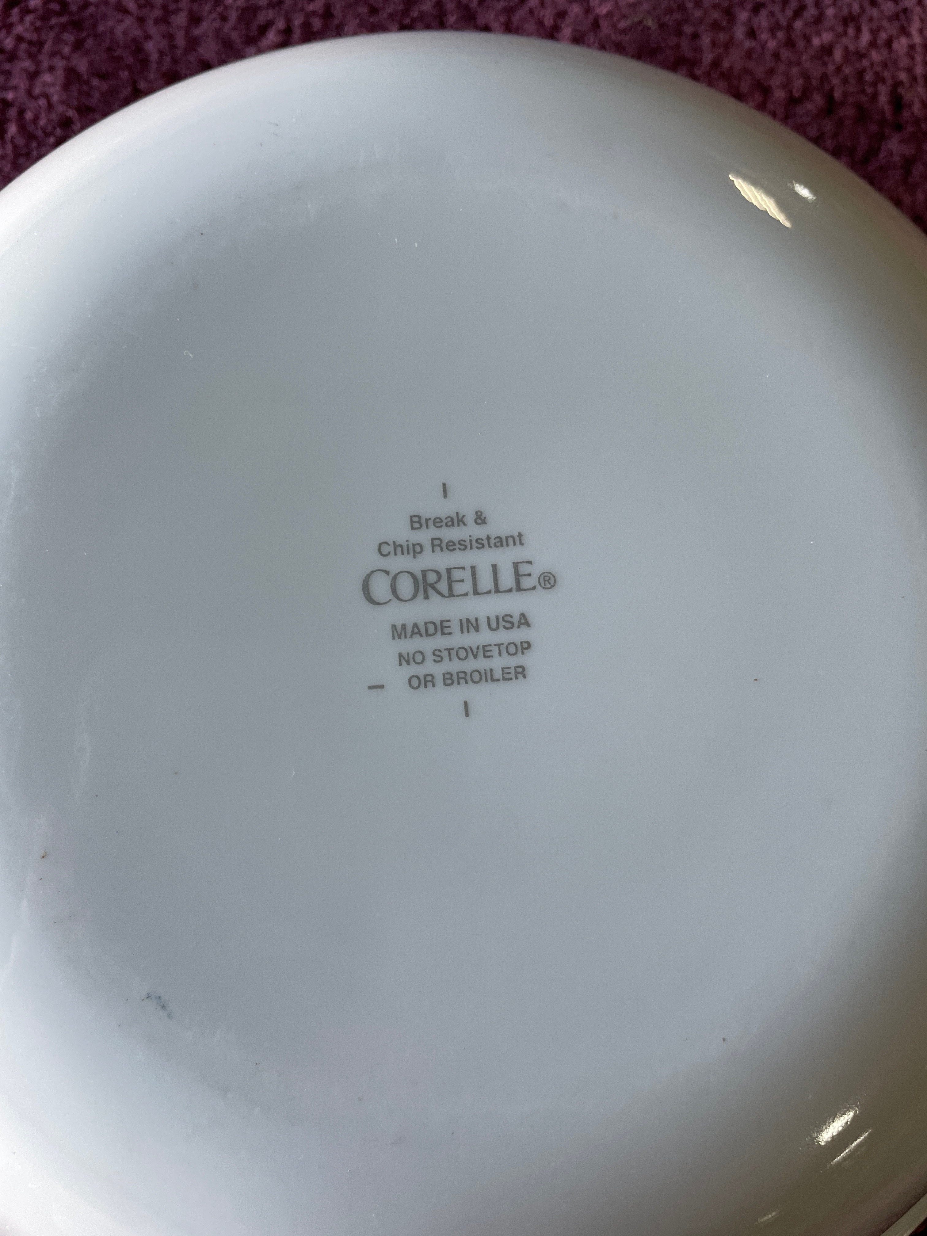 A group of Corelle dinnerware, comprising one ‘Summer Blush’ pattern dinner plate and various plain white bowls. The dinner plate features a central floral bouquet design in blue, orange, red, and yellow, accented with a green rim. Also included are one larger bowl and a stack of at least six smaller individual bowls. Markings on the undersides indicate ‘CORELLLE®’ (with ‘By CORNING’ on the plate and ‘VITRELLE™’ on the small bowls), ‘Break & Chip Resistant’ (on bowls), ‘MICROWAVABLE’ (on plate), ‘NO BROILER OR STOVETOP, ‘ and ‘MADE IN USA, ‘ suggesting a durable glass-ceramic material.