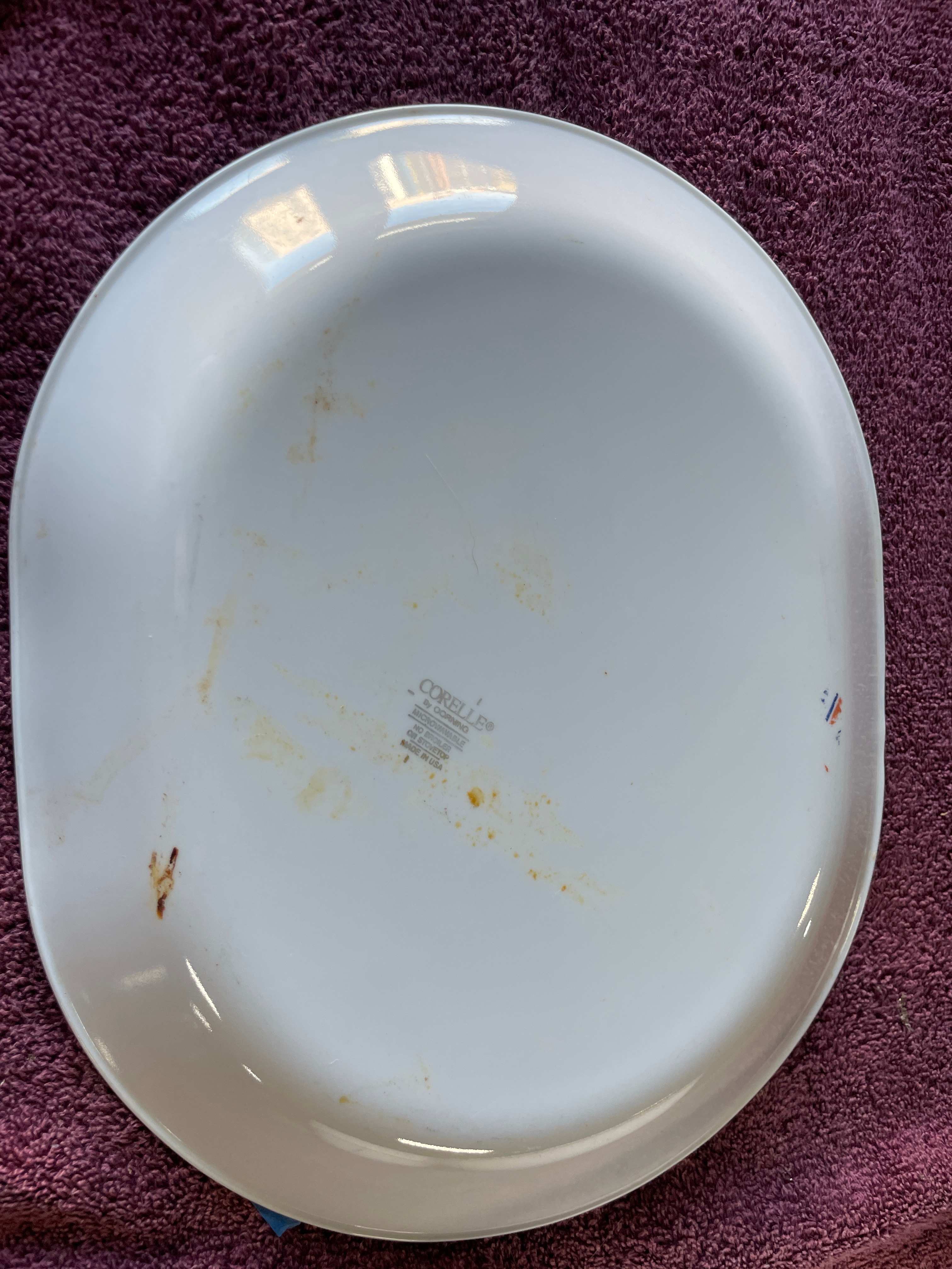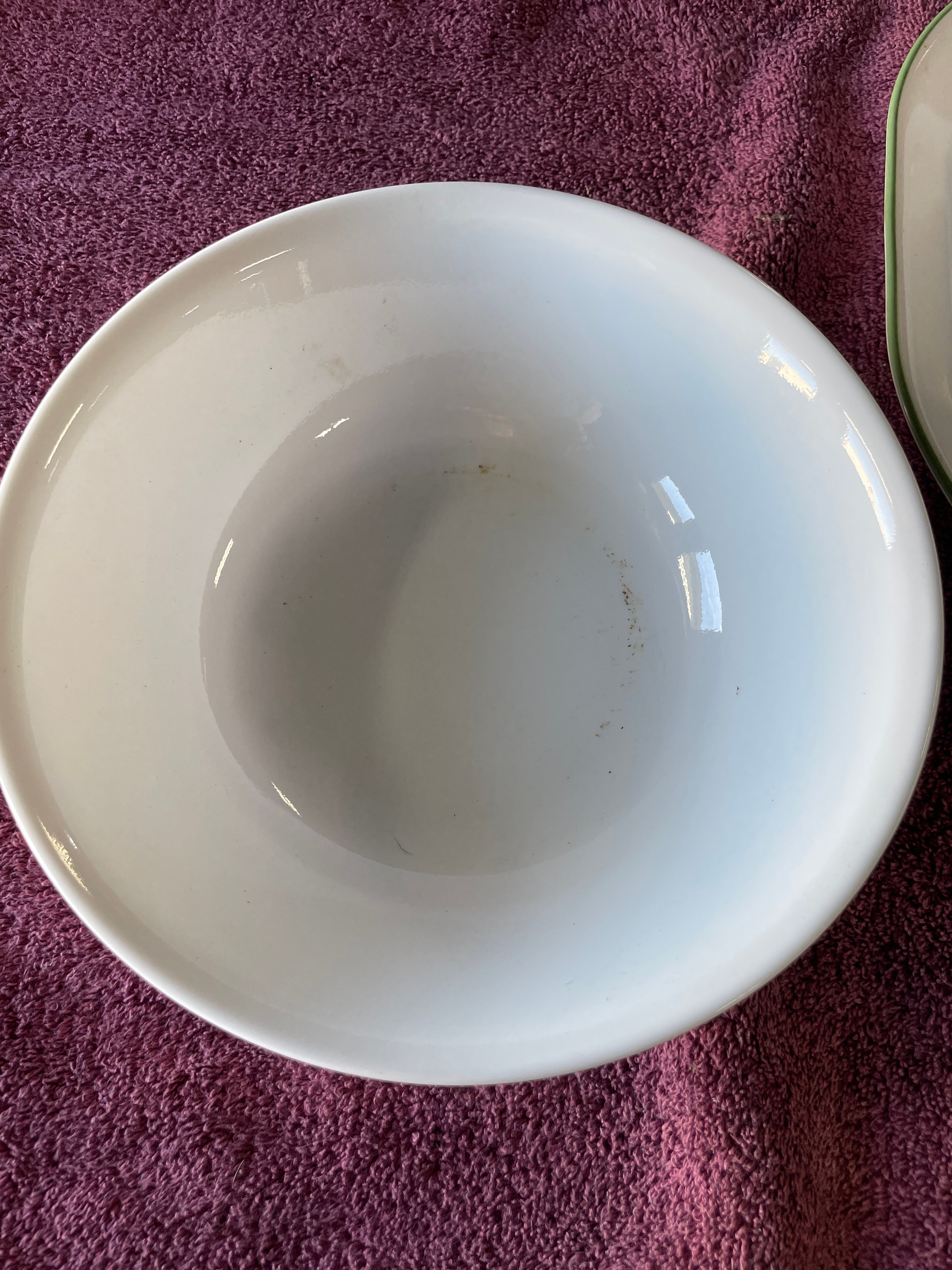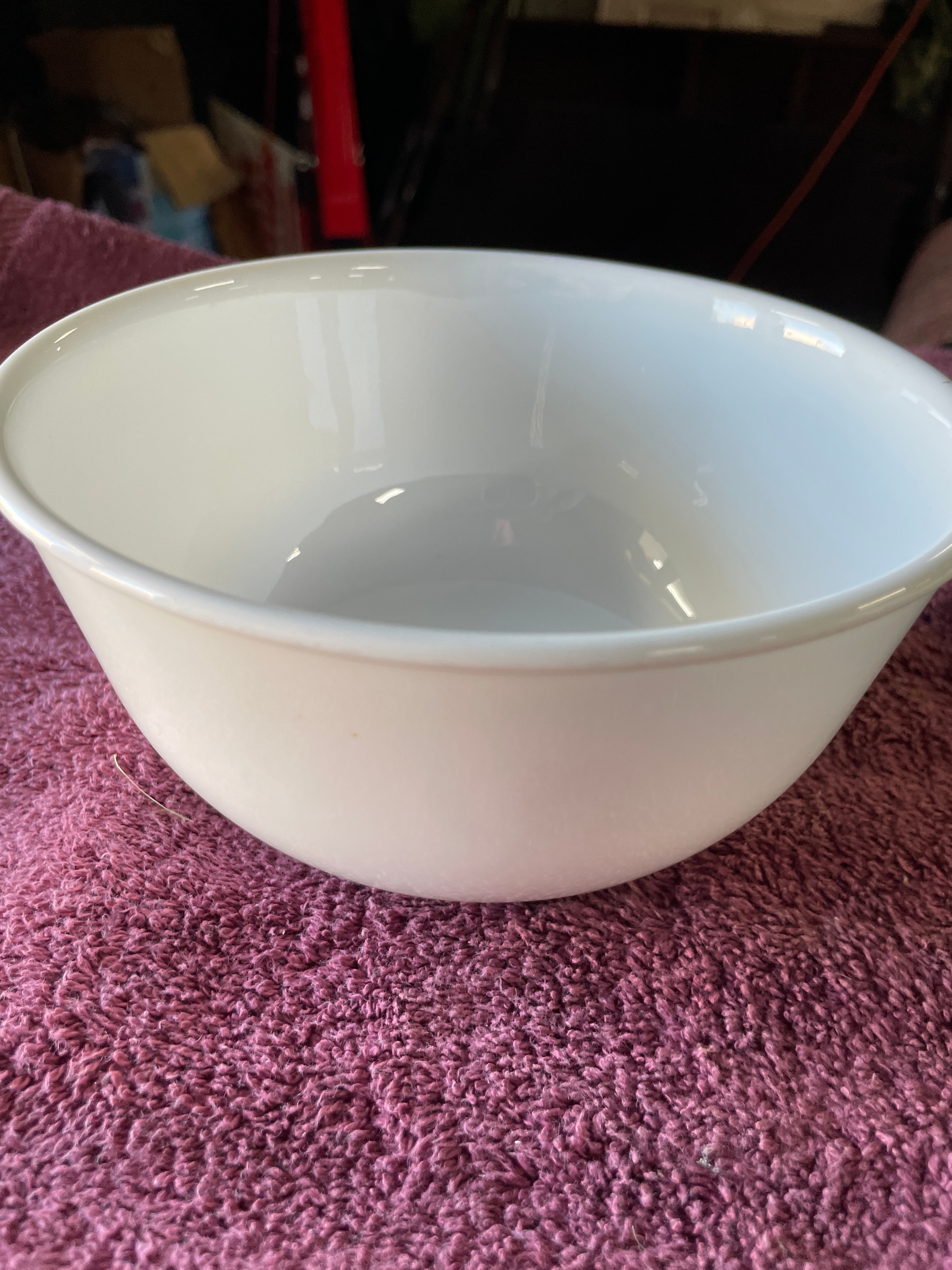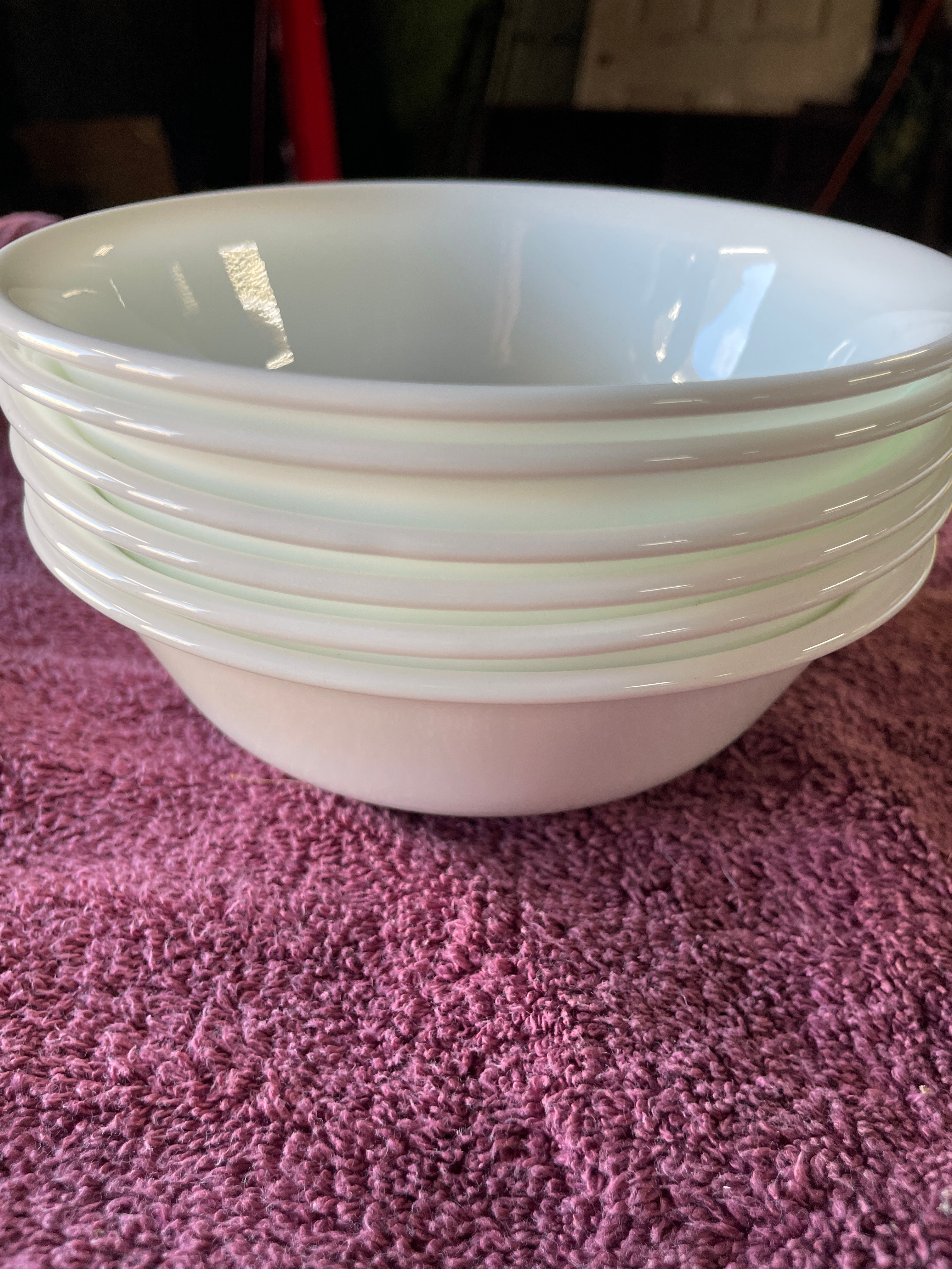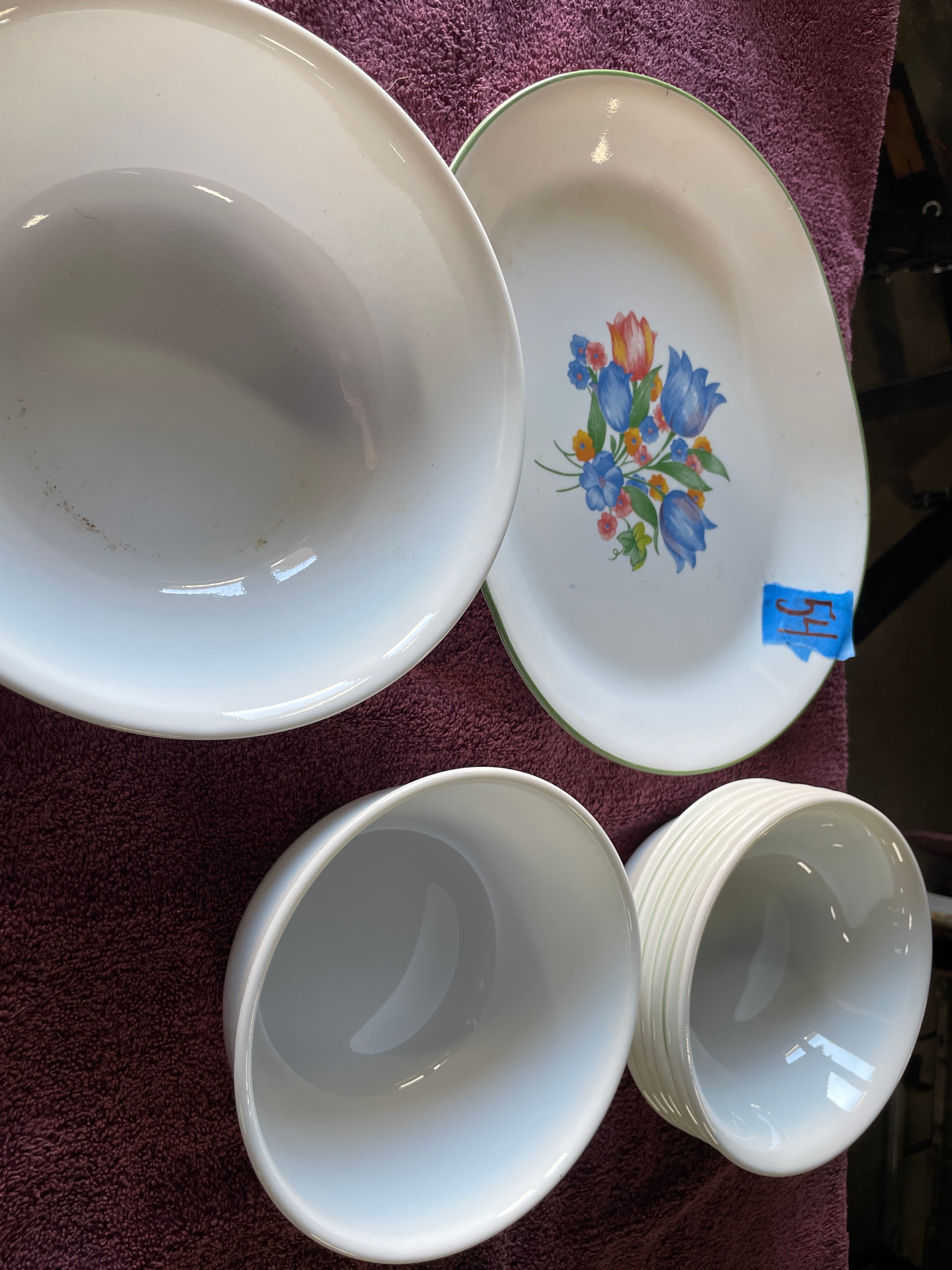 A group of Corelle dinnerware, comprising one ‘Summer Blush’ pattern dinner plate and various plain white bowls. The dinner plate features a central floral bouquet design in blue, orange, red, and yellow, accented with a green rim. Also included are one larger bowl and a stack of at least six smaller individual bowls. Markings on the undersides indicate ‘CORELLLE®’ (with ‘By CORNING’ on the plate and ‘VITRELLE™’ on the small bowls), ‘Break & Chip Resistant’ (on bowls), ‘MICROWAVABLE’ (on plate), ‘NO BROILER OR STOVETOP, ‘ and ‘MADE IN USA, ‘ suggesting a durable glass-ceramic material.