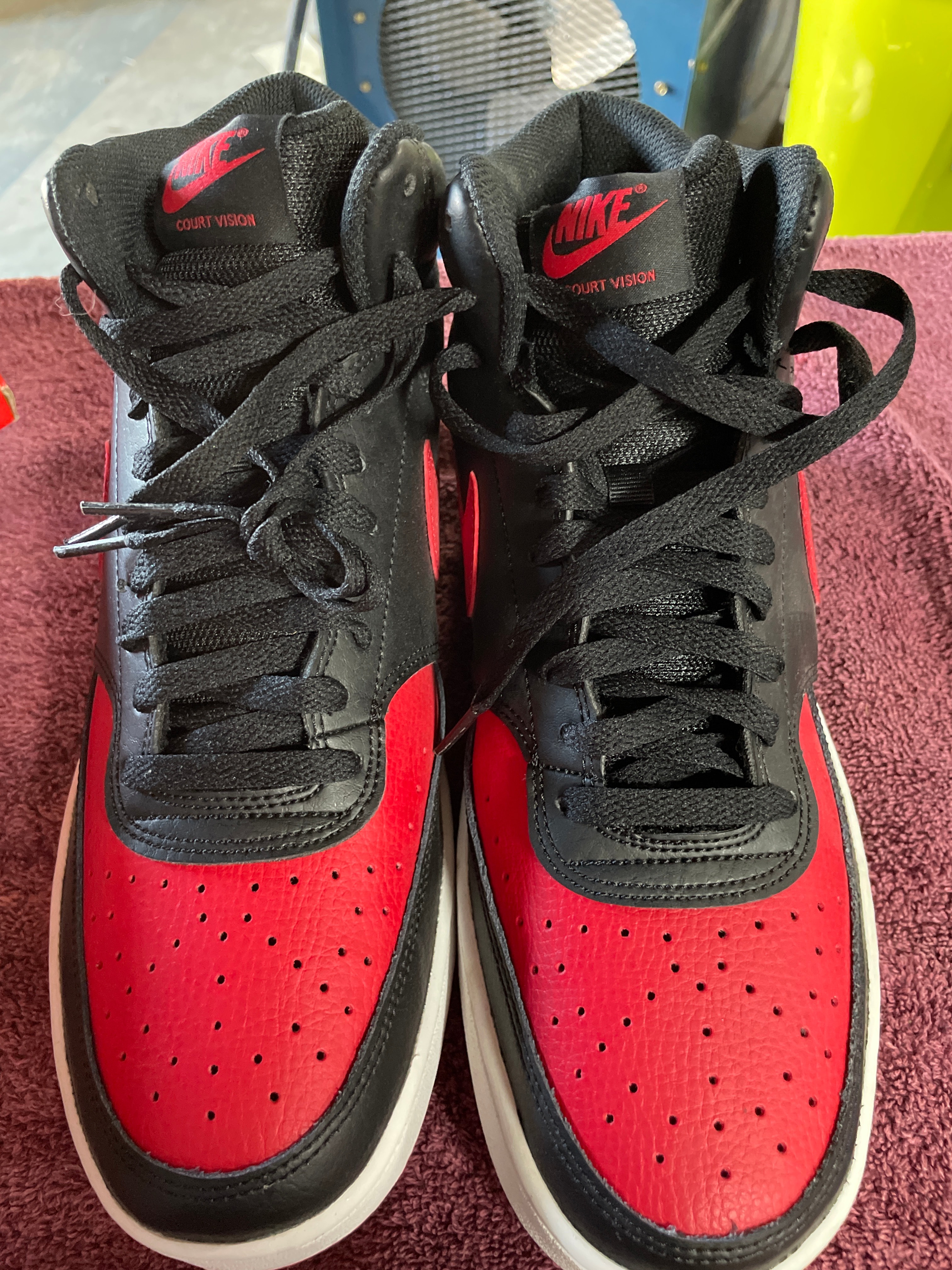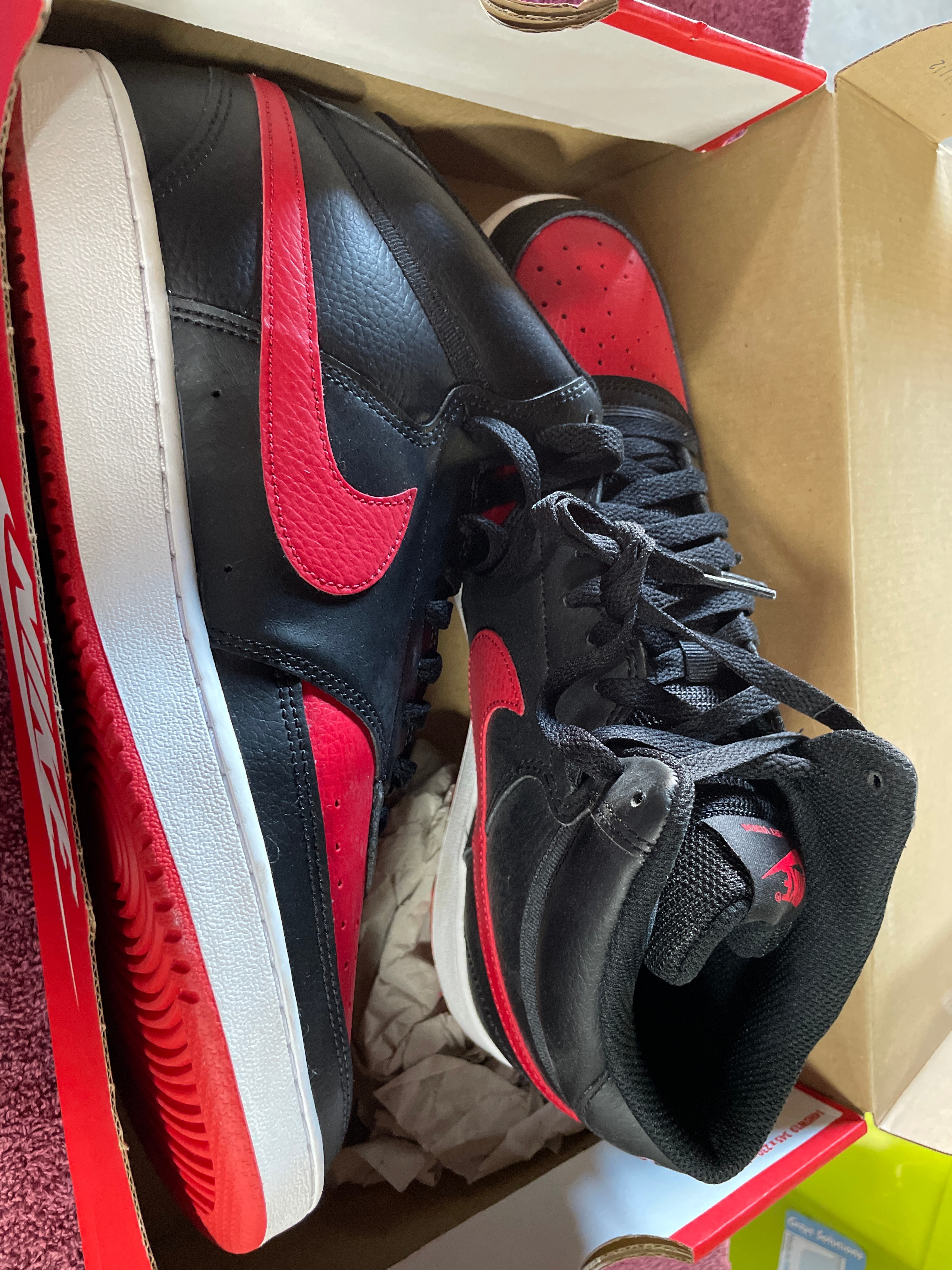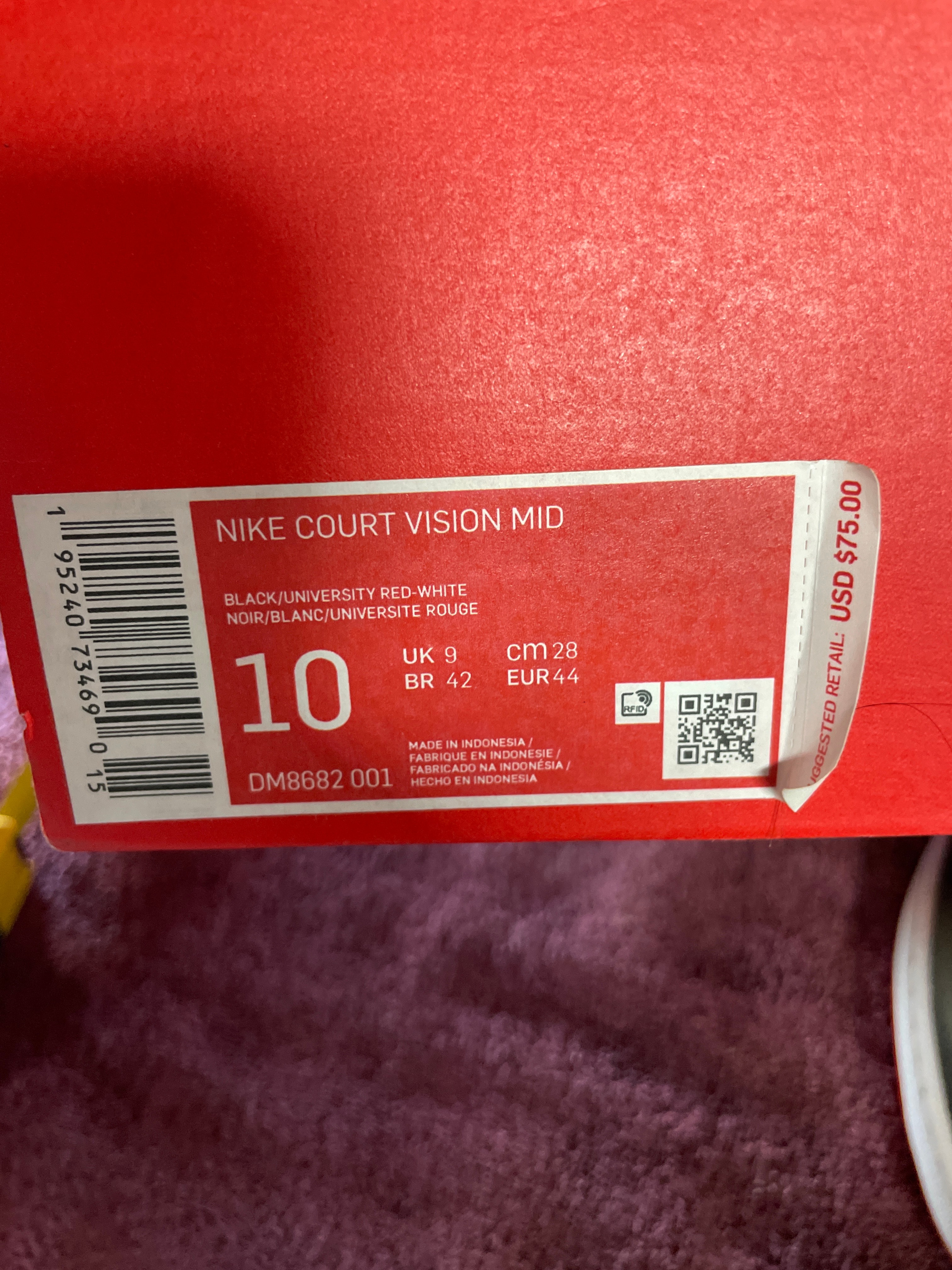 A pair of Nike Court Vision Mid ‘Bred’ athletic sneakers, featuring a mid-top design. The shoes present a “Black/University Red-White” colorway, with a black synthetic leather-like upper contrasted by a vibrant University Red perforated toe box and side panels. A red Nike Swoosh is visible on the sides, complemented by black laces. The upper is separated from a red rubber outsole by a white midsole. The outsole displays the Nike logo and a concentric circle traction pattern. “NIKE” and “COURT VISION” branding are present on the tongues. The original red Nike box label confirms the model, color, size US 10 (UK 9, EUR 44), model number DM8682 001, and indicates manufacture in Indonesia, with a suggested retail price of USD $75.00.