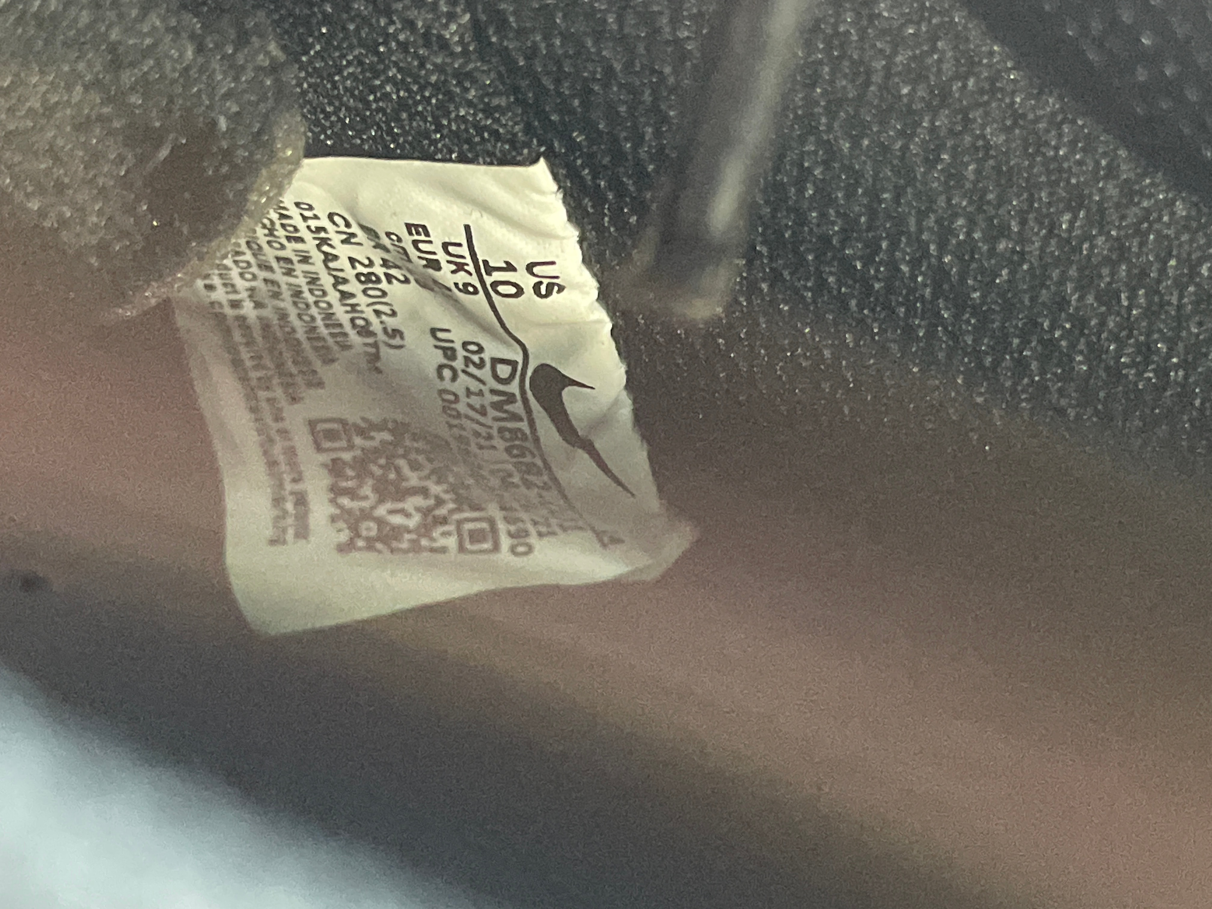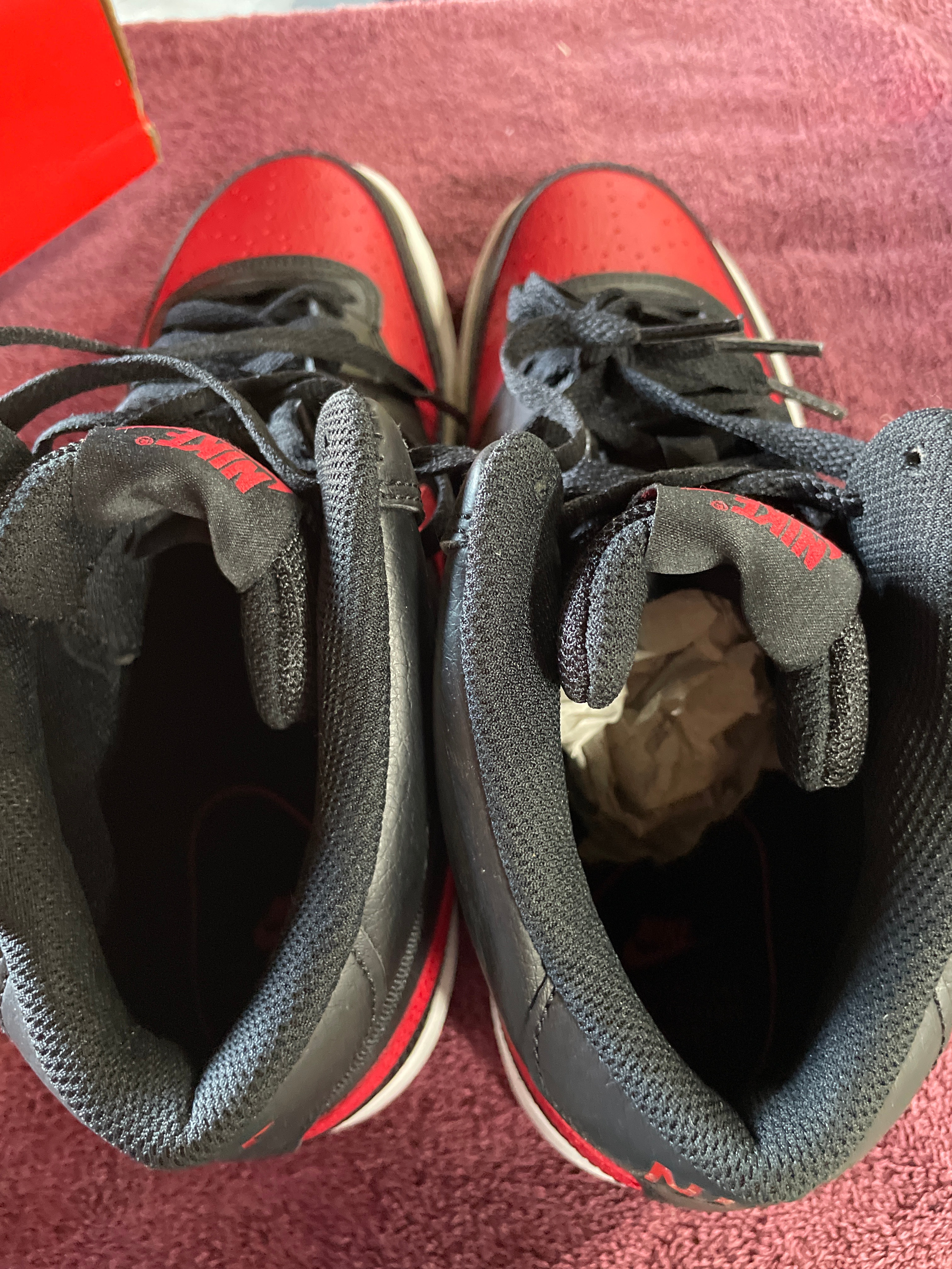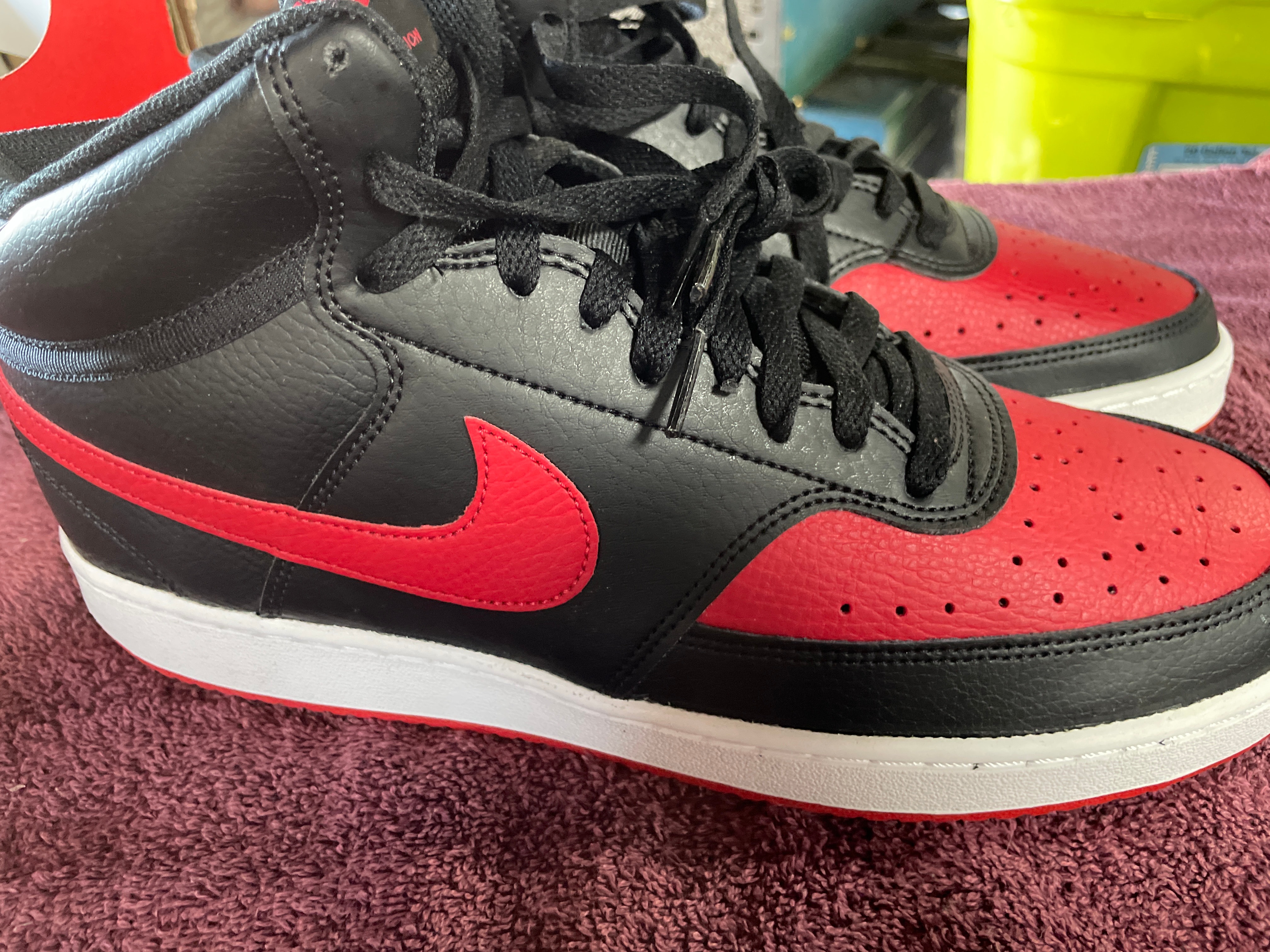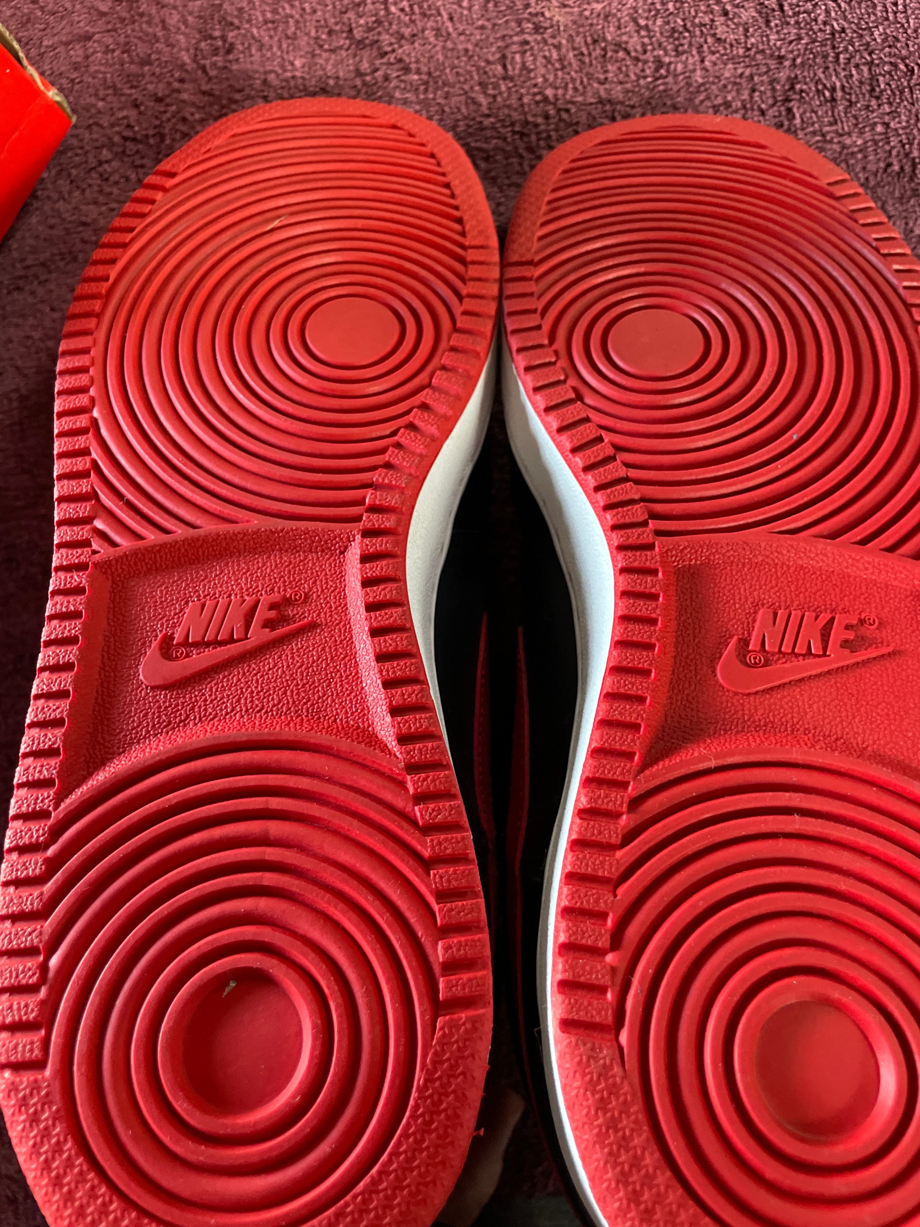 A pair of Nike Court Vision Mid ‘Bred’ athletic sneakers, featuring a mid-top design. The shoes present a “Black/University Red-White” colorway, with a black synthetic leather-like upper contrasted by a vibrant University Red perforated toe box and side panels. A red Nike Swoosh is visible on the sides, complemented by black laces. The upper is separated from a red rubber outsole by a white midsole. The outsole displays the Nike logo and a concentric circle traction pattern. “NIKE” and “COURT VISION” branding are present on the tongues. The original red Nike box label confirms the model, color, size US 10 (UK 9, EUR 44), model number DM8682 001, and indicates manufacture in Indonesia, with a suggested retail price of USD $75.00.