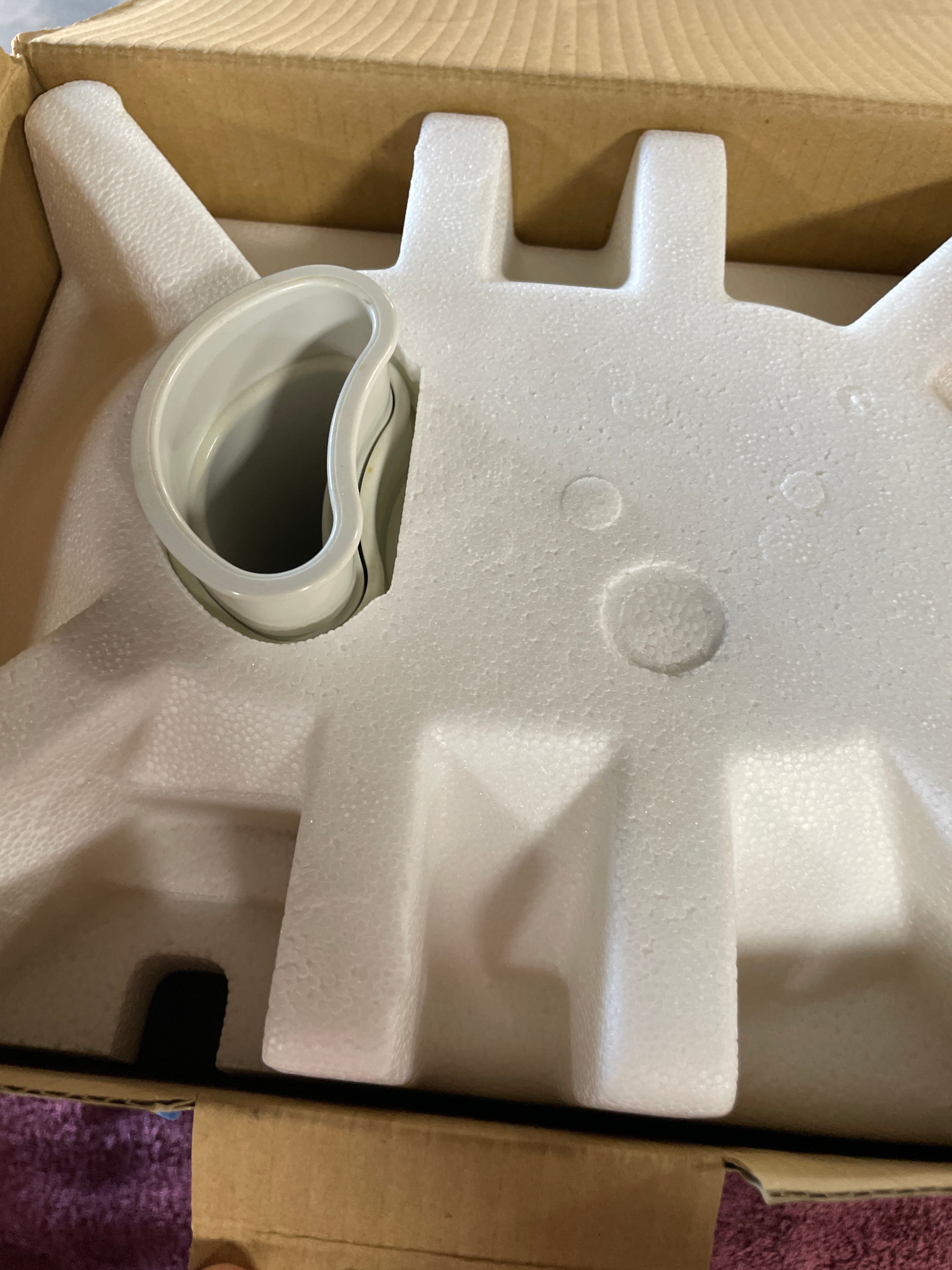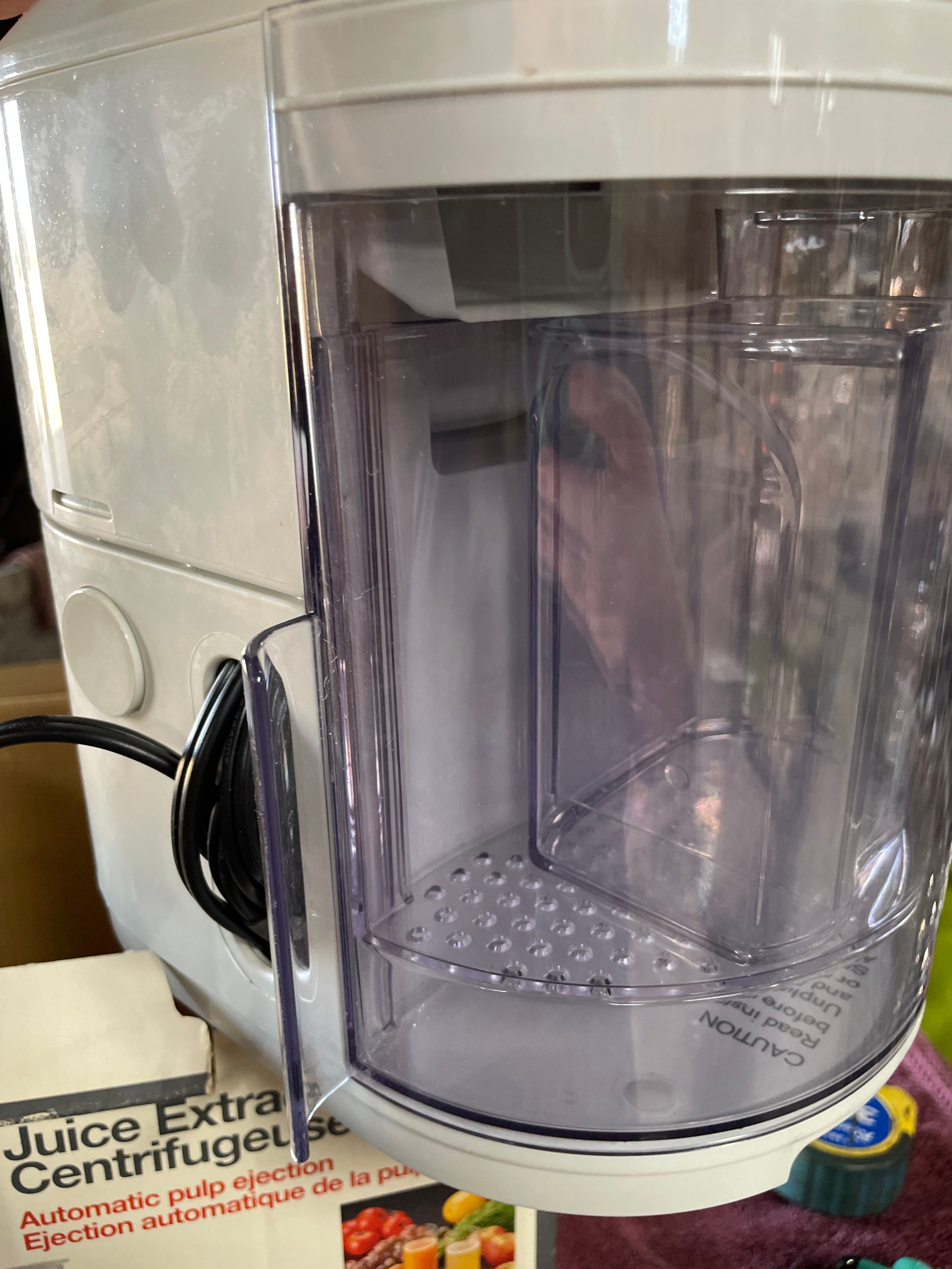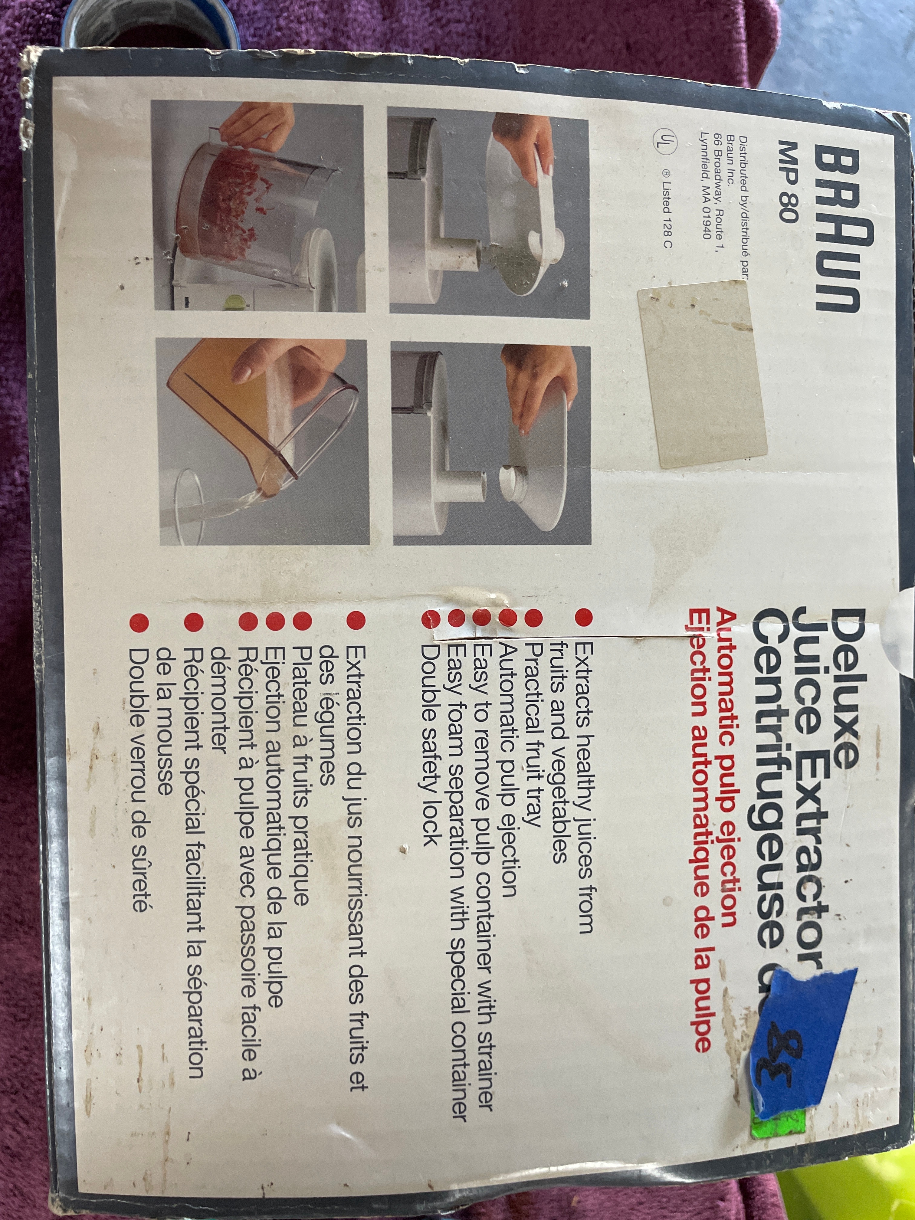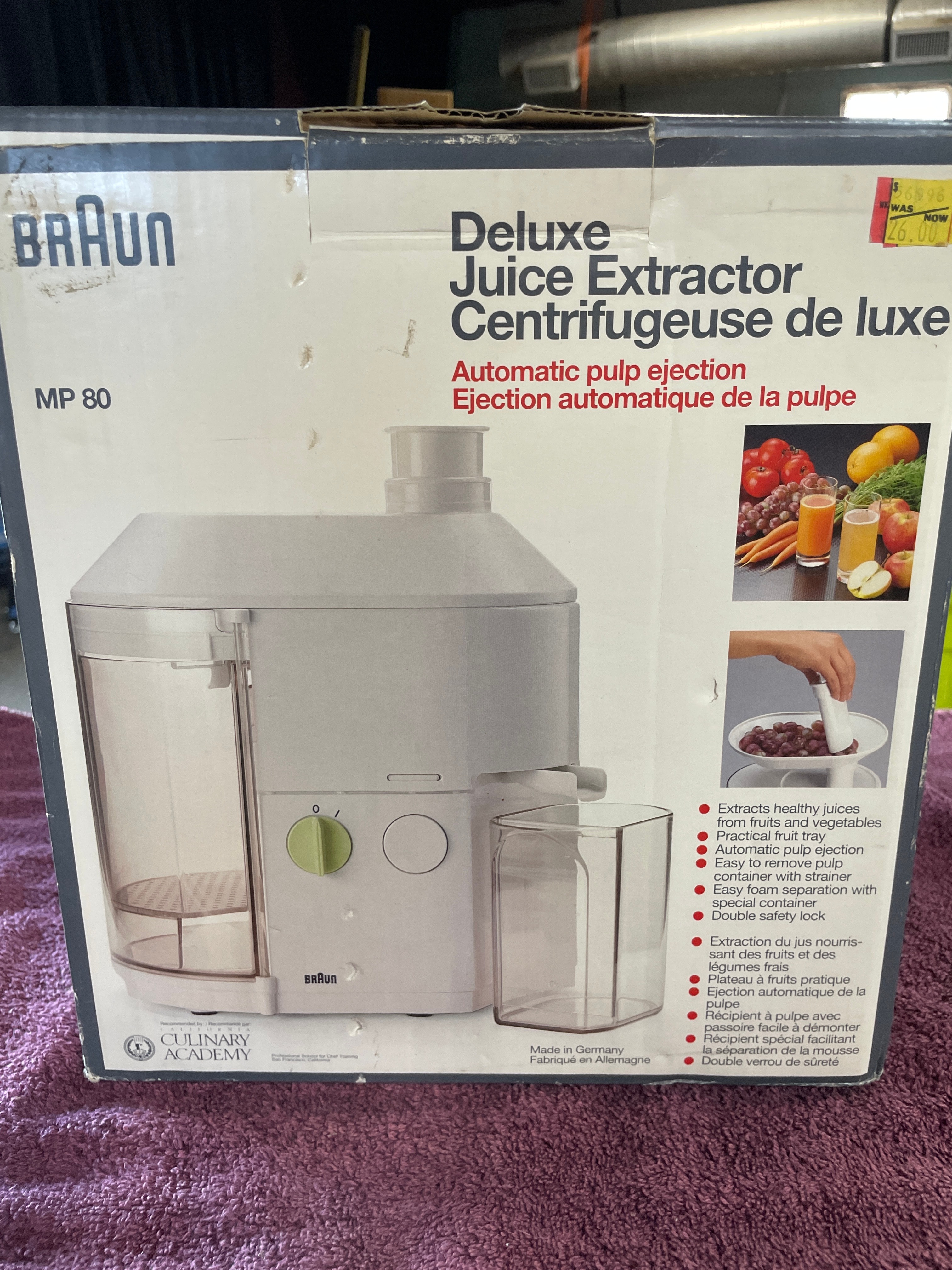 A Braun Multipress Automatic Deluxe Centrifugal Juice Extractor, model MP80 Type 4290. This appliance is a white and transparent plastic centrifugal juicer, featuring “Automatic pulp ejection” and a “Double safety lock.” The unit is marked “Made in Germany” (“Fabriqué en Allemagne”) and is designed to “Extract healthy juices from fruits and vegetables.” It appears new and unused, presented in its original, white styrofoam-lined cardboard packaging.