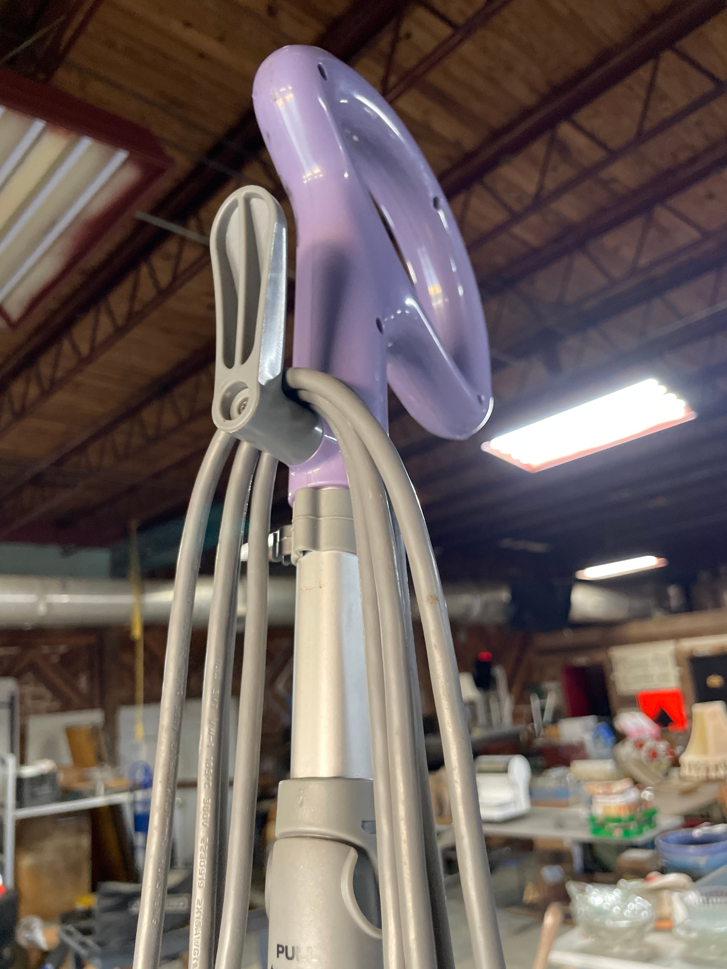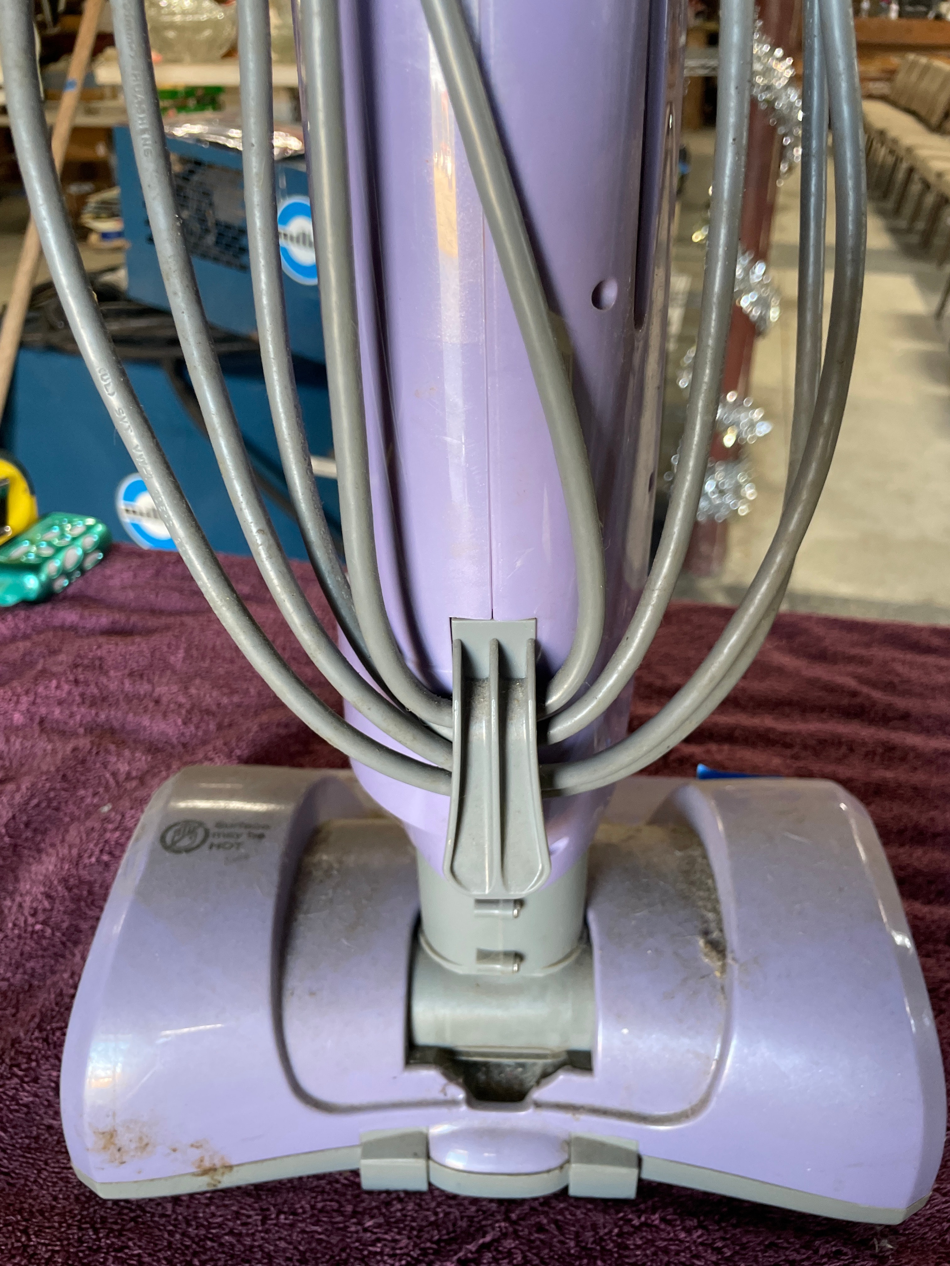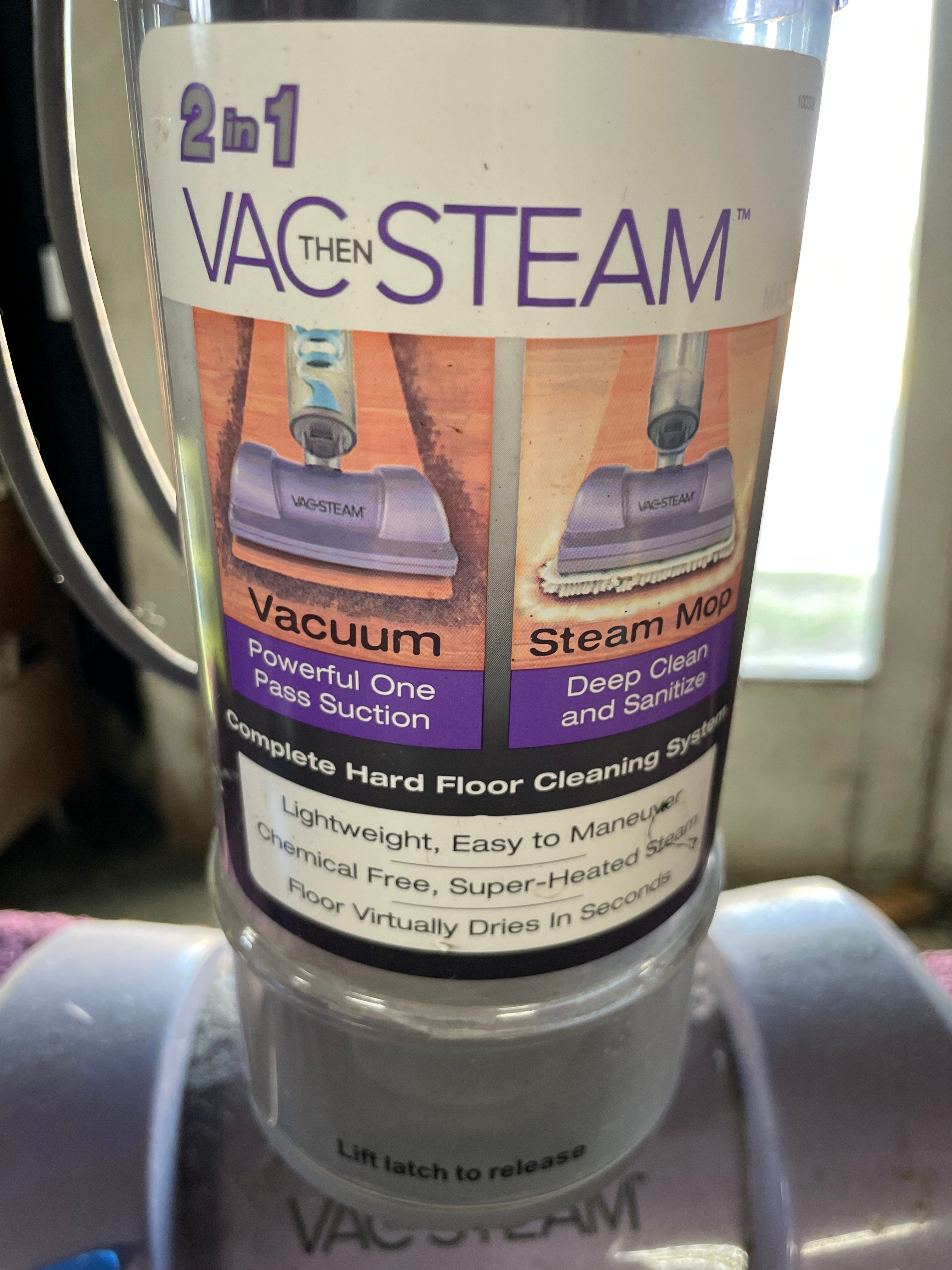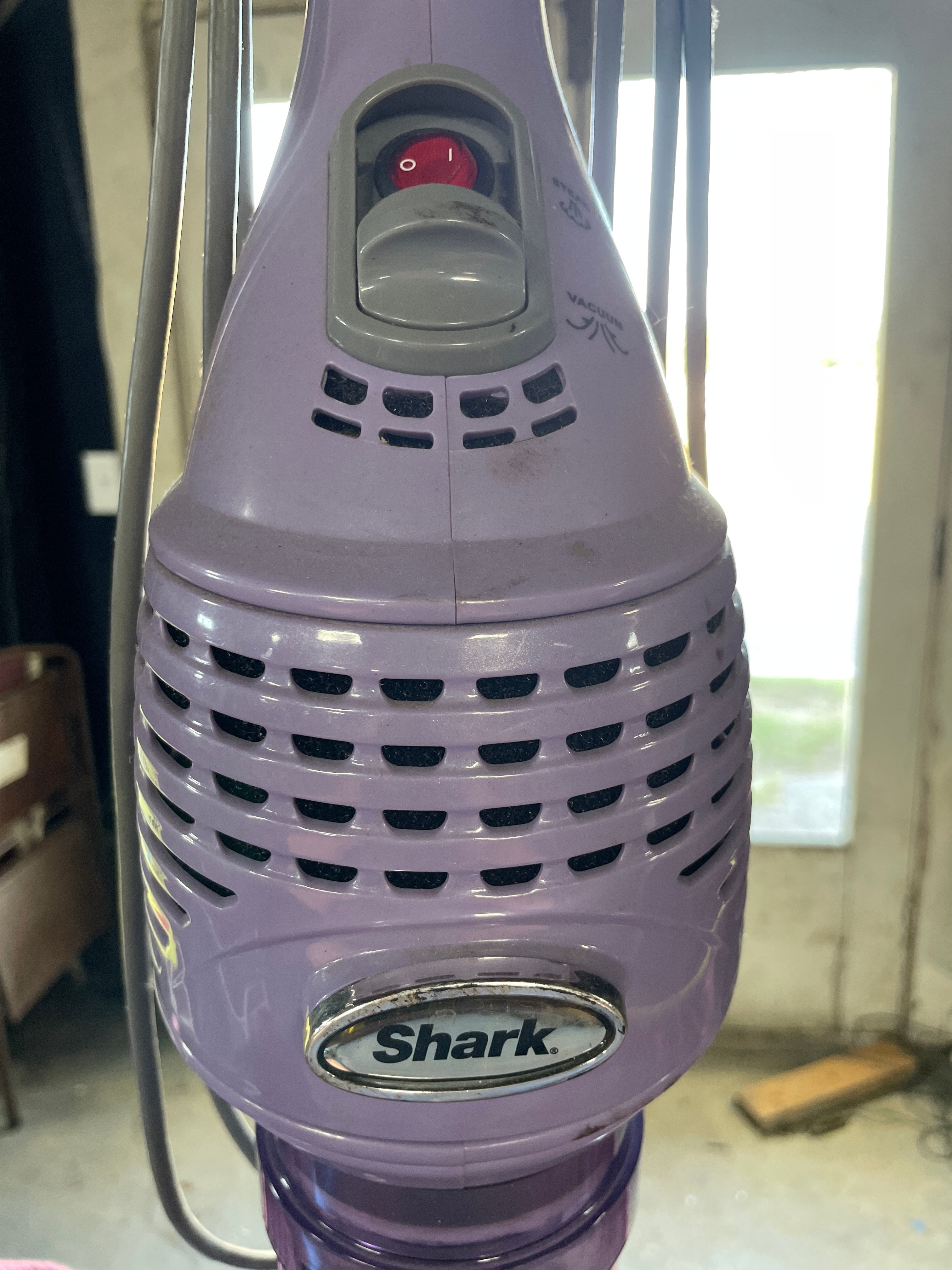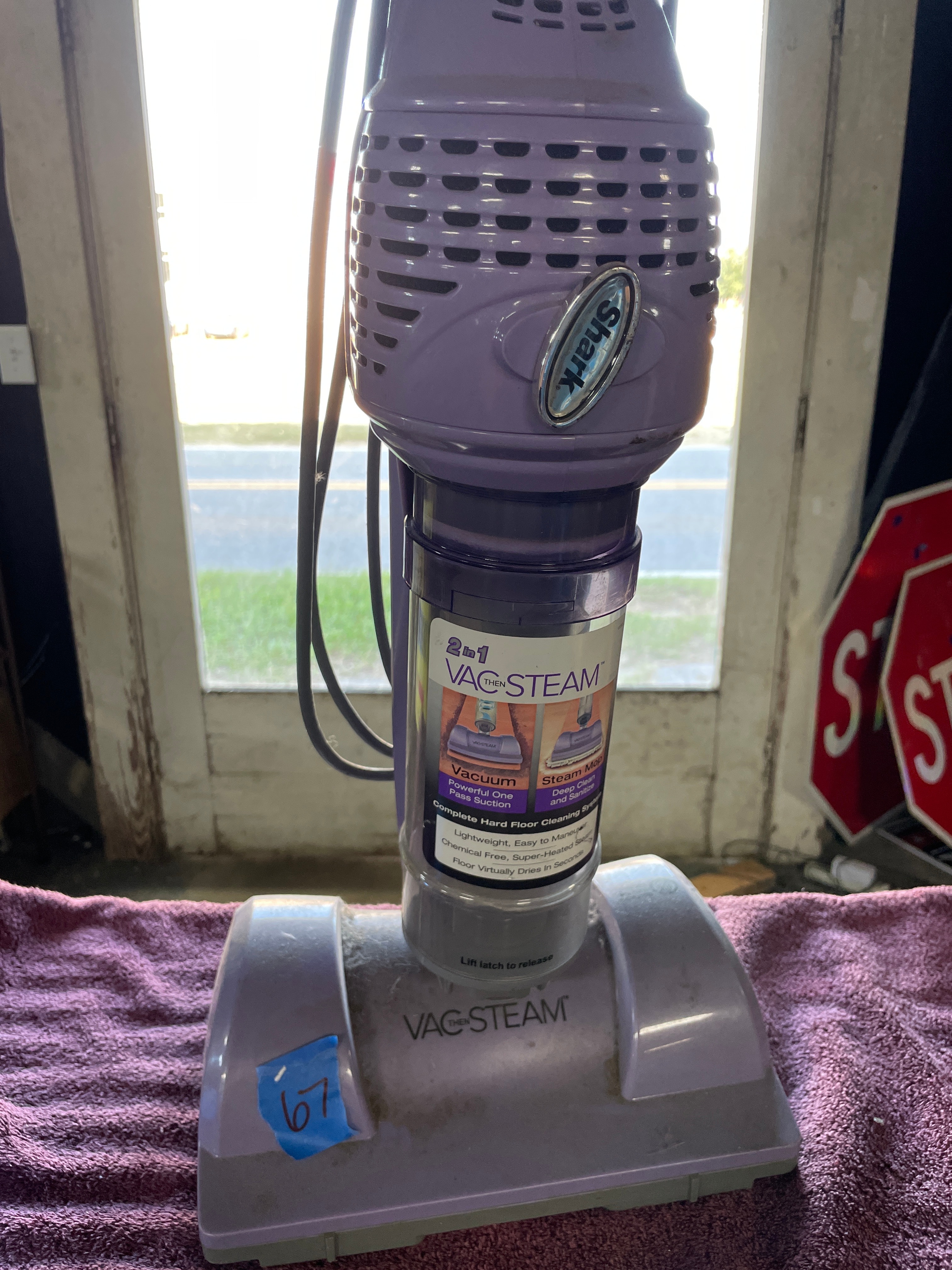 A Shark Vac-then-Steam 2-in-1 Vacuum/Steam Mop, Model MV2010N. This hard floor cleaning appliance functions as both a vacuum and steam mop. It features a predominantly purple and grey plastic construction with a silver-toned “Shark” brand emblem. The clear reservoir details its capabilities: “Vacuum Powerful One Pass Suction” and “Steam Mop Deep Clean and Sanitize, ” along with “Complete Hard Floor Cleaning System, ” “Lightweight, Easy to Maneuver, ” “Chemical Free, Super-Heated Steam, ” and “Floor Virtually Dries in Seconds.” The appliance includes controls for “STEAM” and “VACUUM” modes, a red power switch, and a wrapped grey power cord.