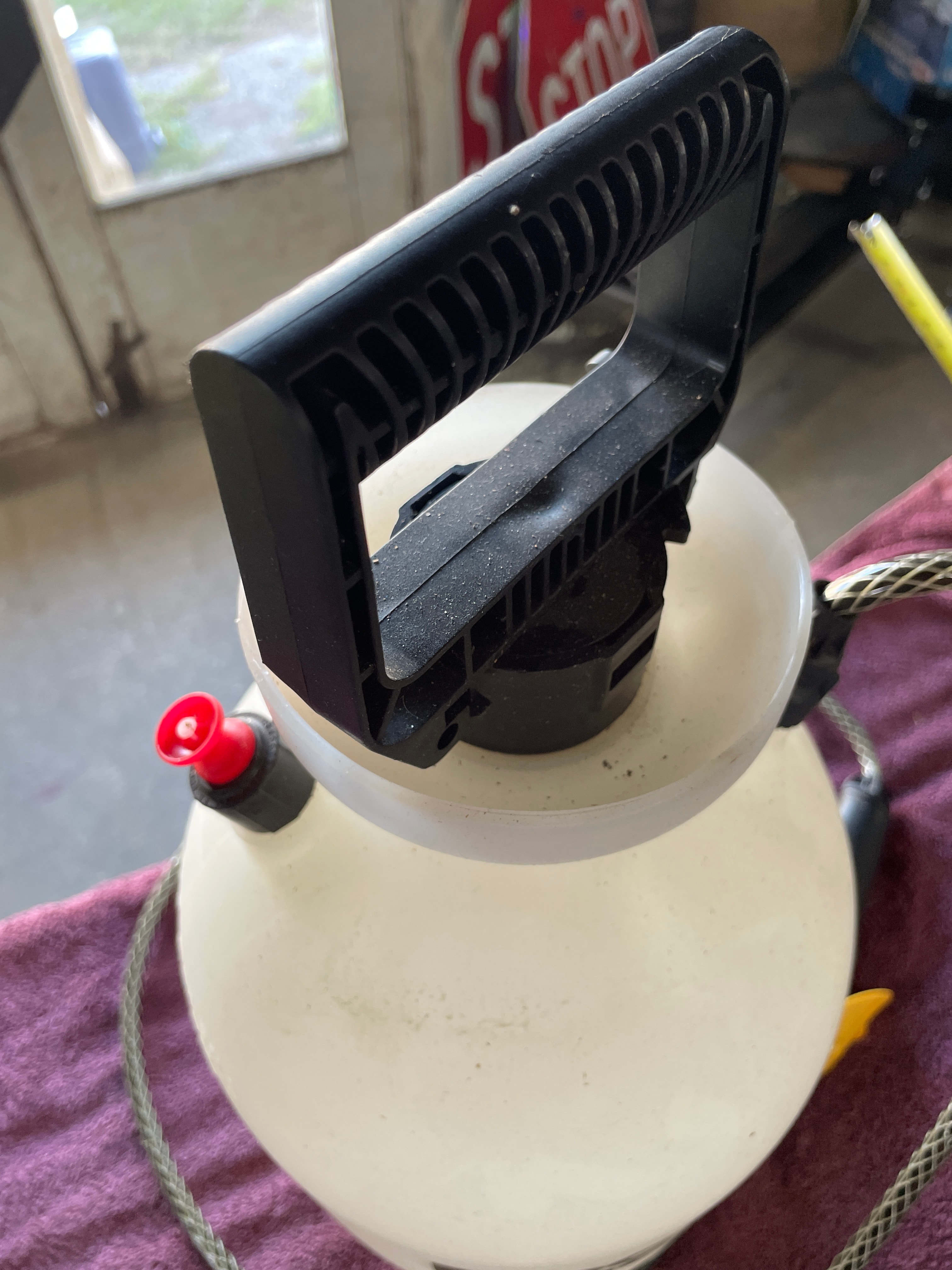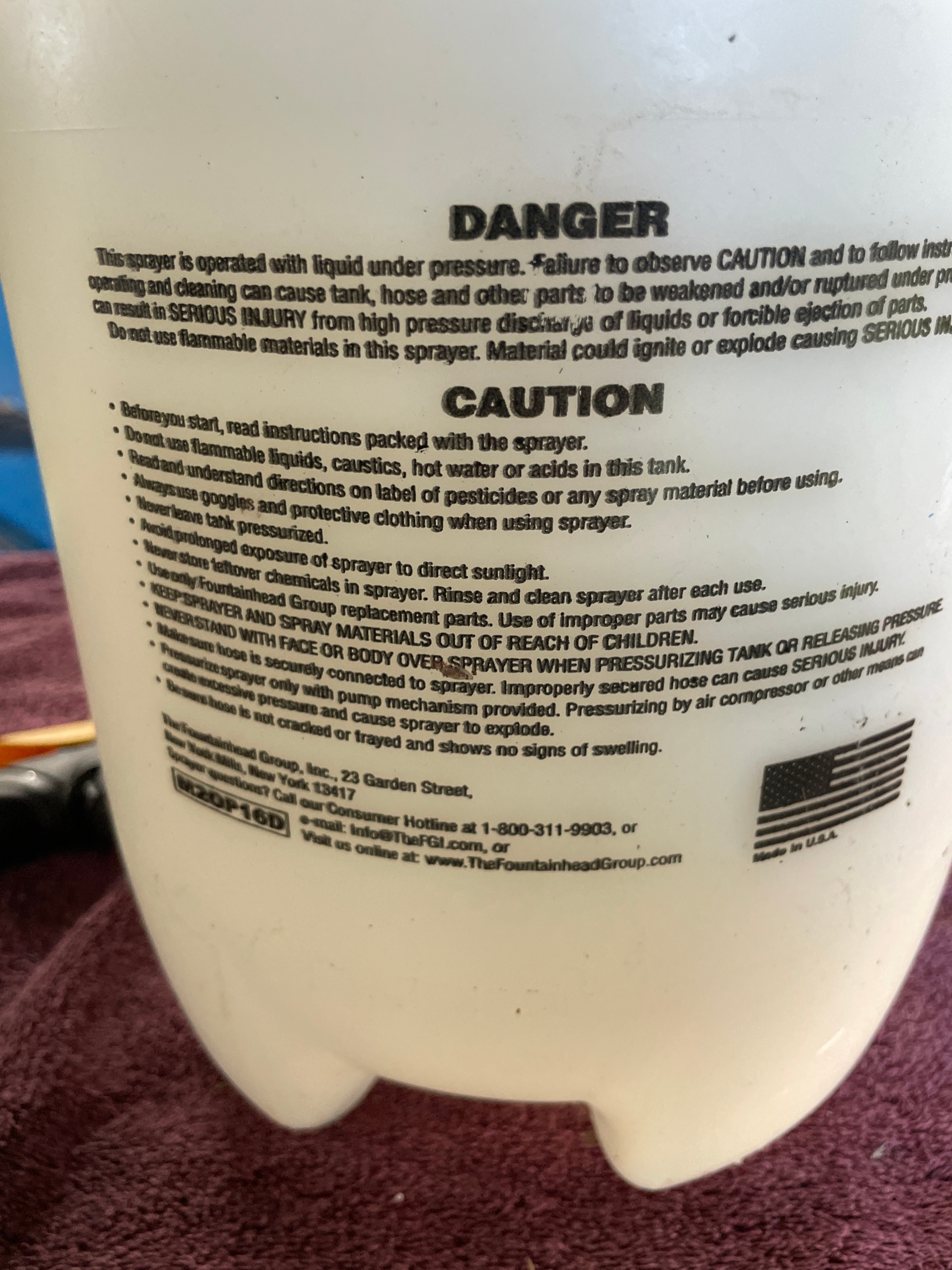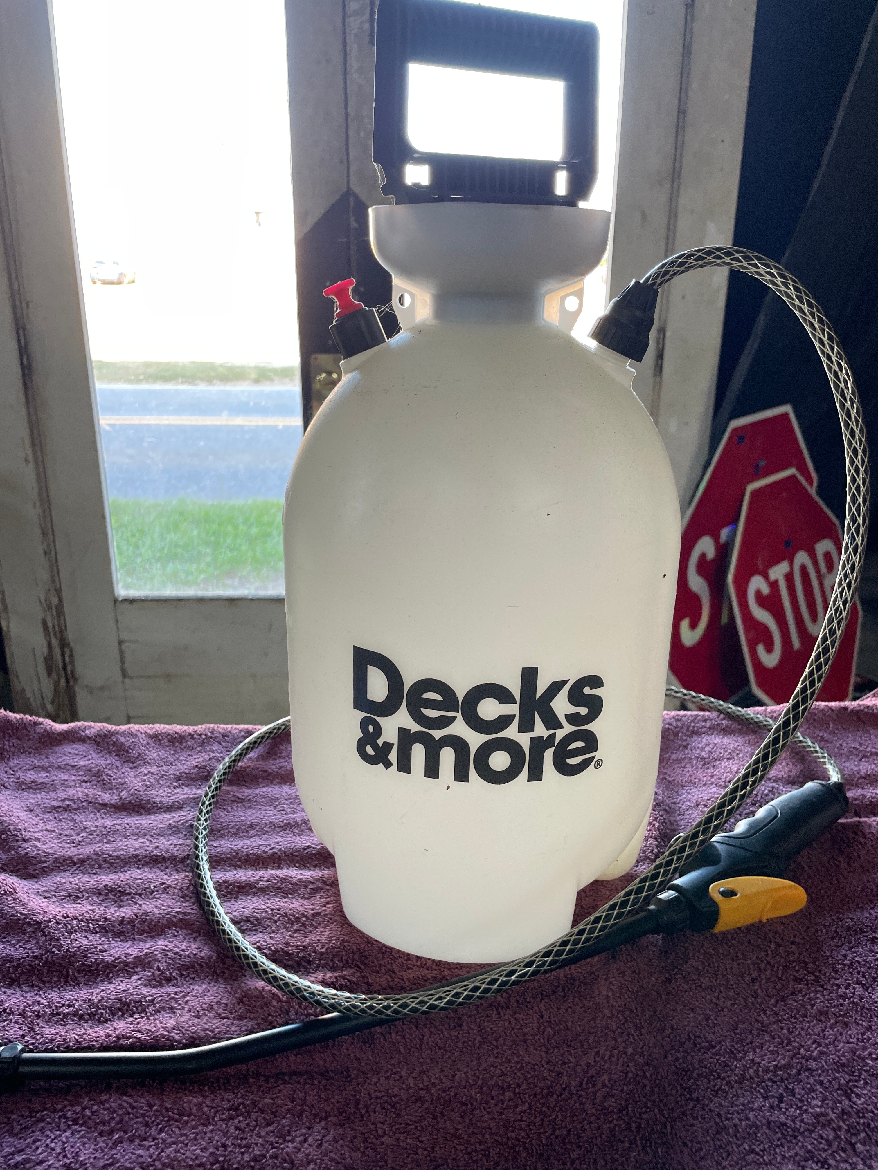 A Decks & More 2-Gallon hand-pump pressure sprayer, Model 530P16D, manufactured by The Fountainhead Group, Inc. The sprayer is constructed with a white opaque plastic tank and black plastic components for the pump handle, hose, and nozzle. The hose features visible metal reinforcement. The tank is marked “Decks & more” in black lettering, along with safety warnings “DANGER” and “CAUTION”, and “Made in U.S.A.”.