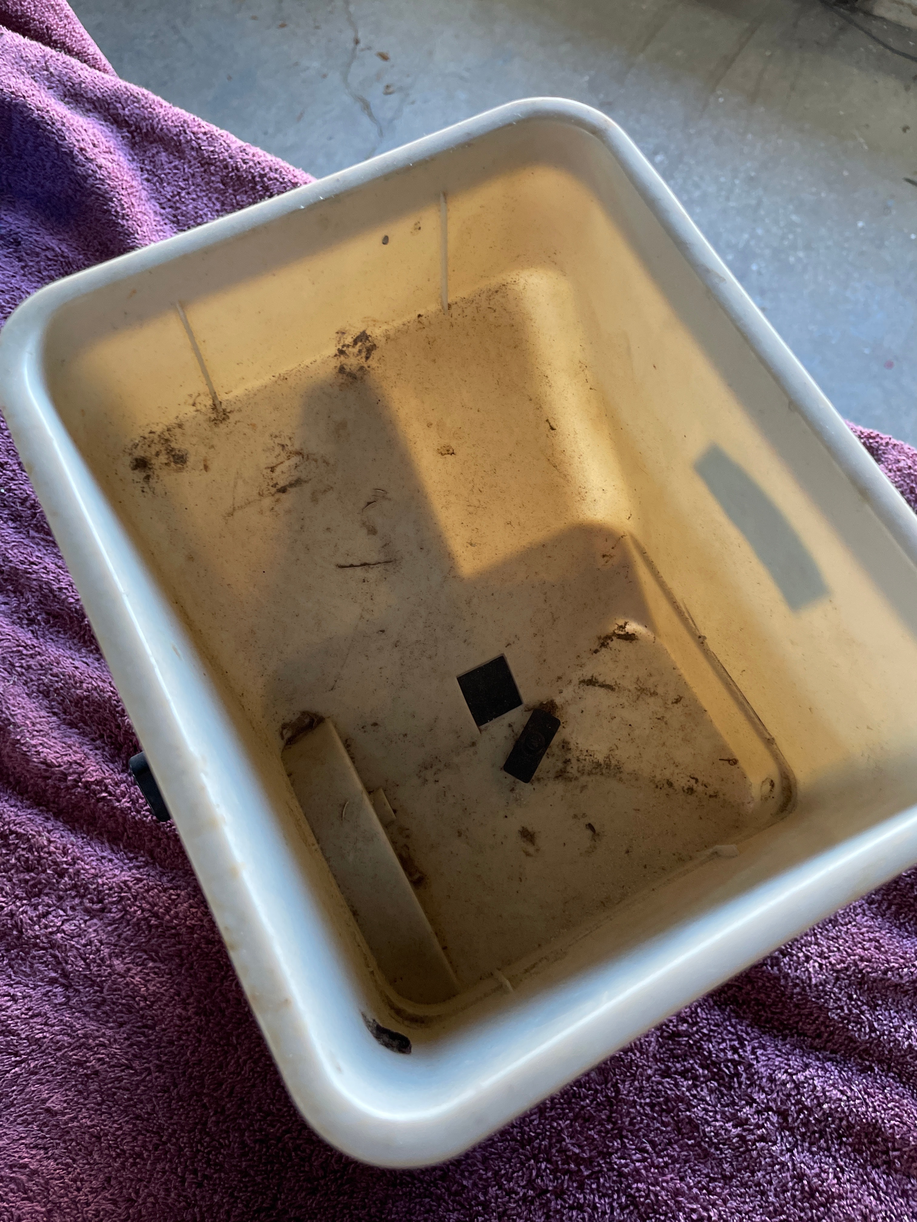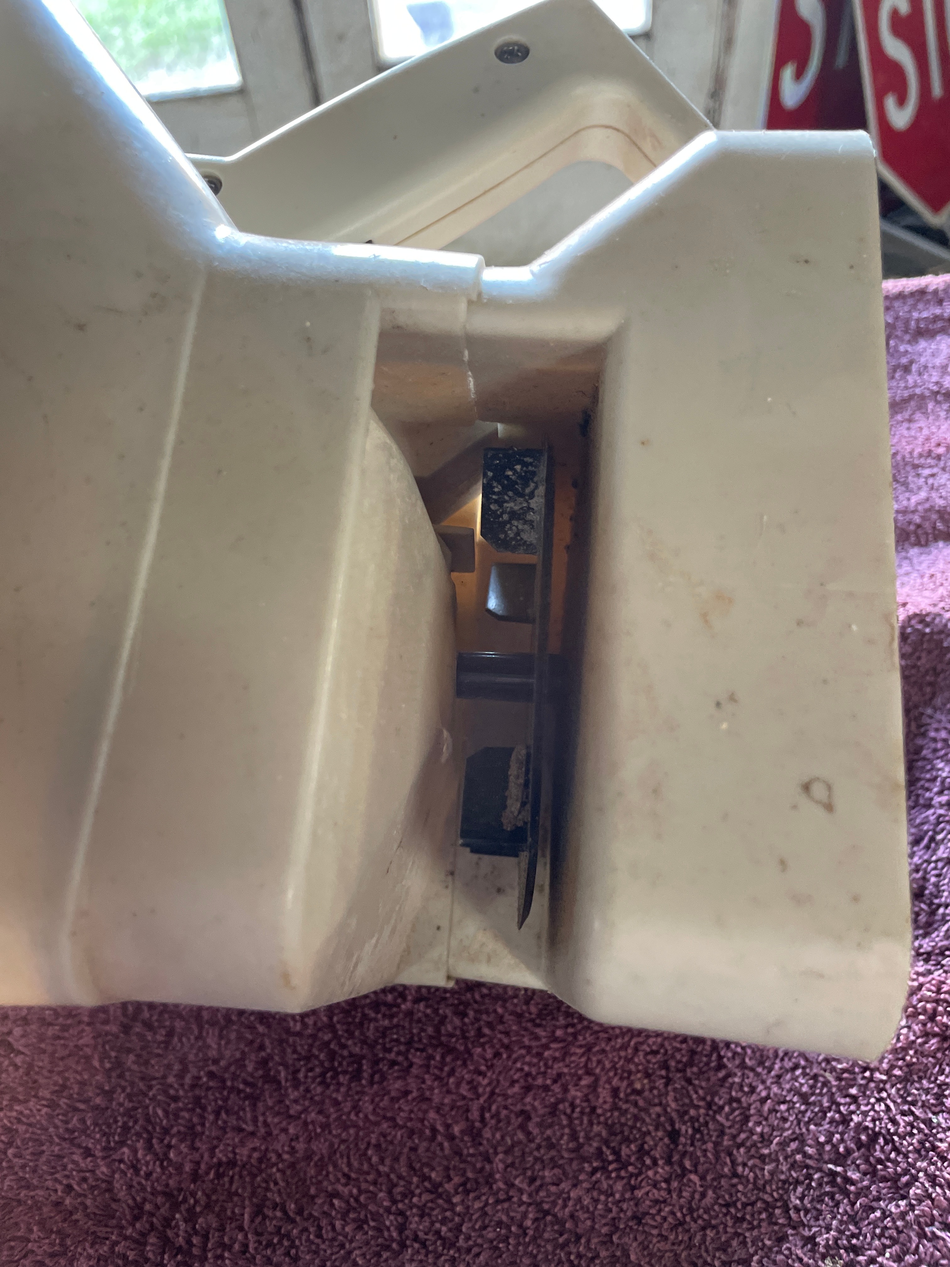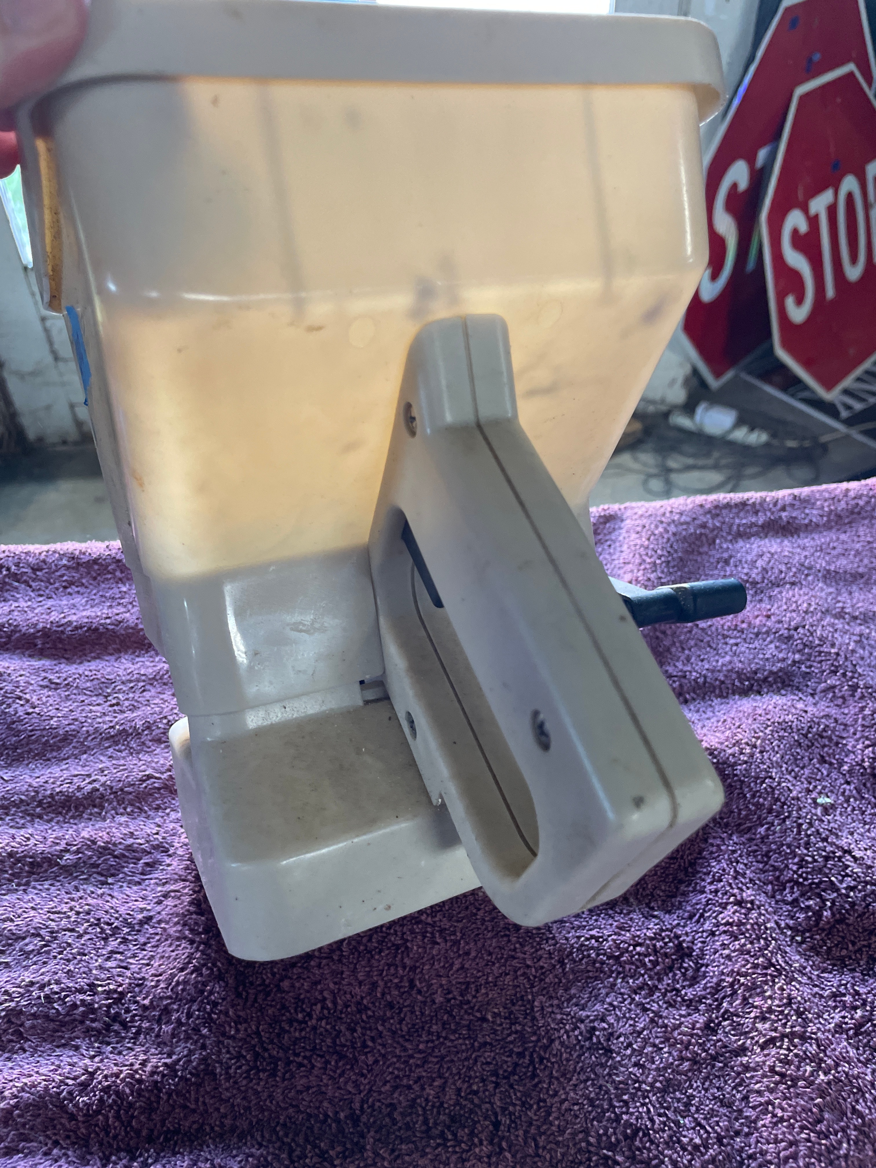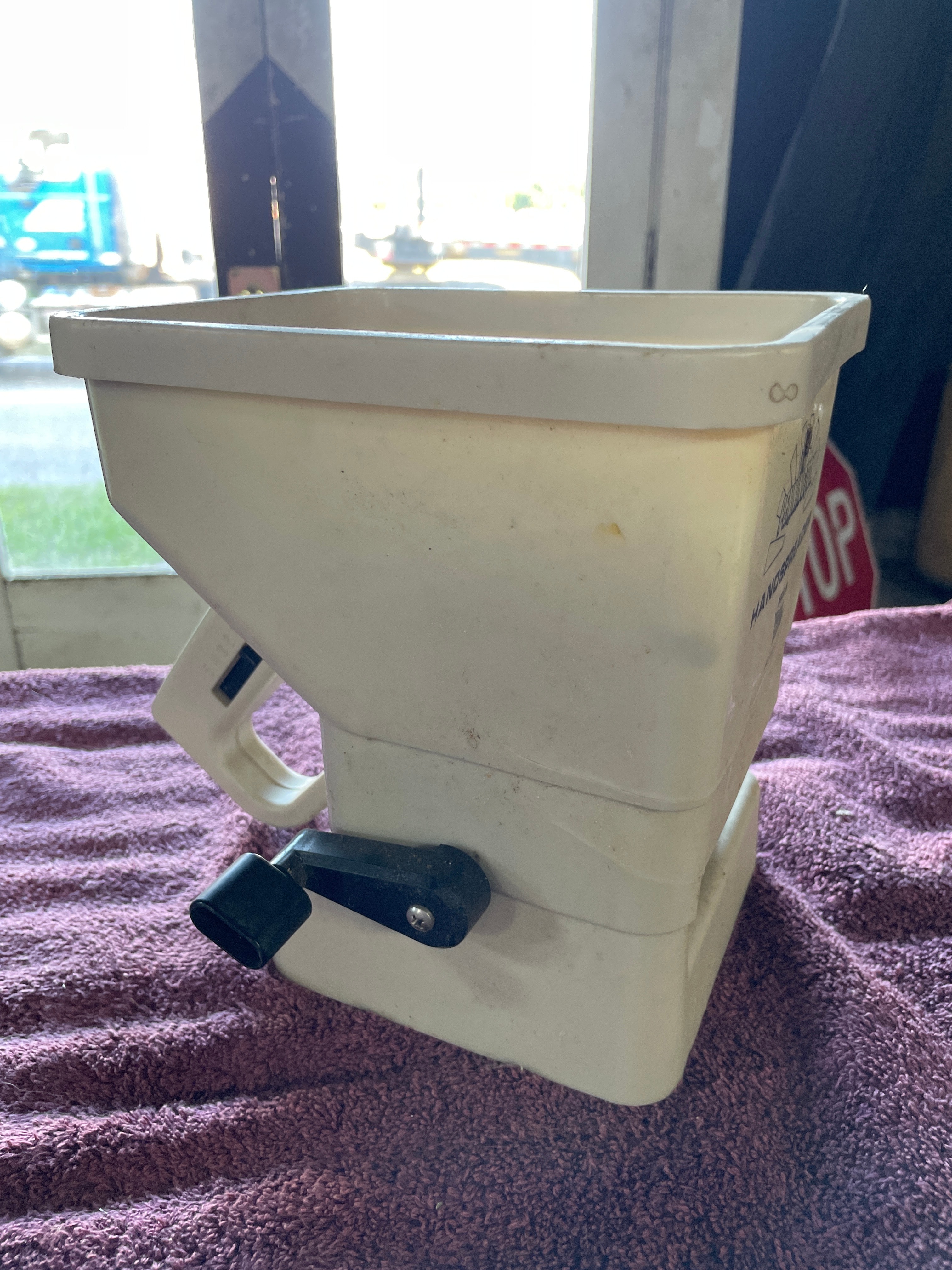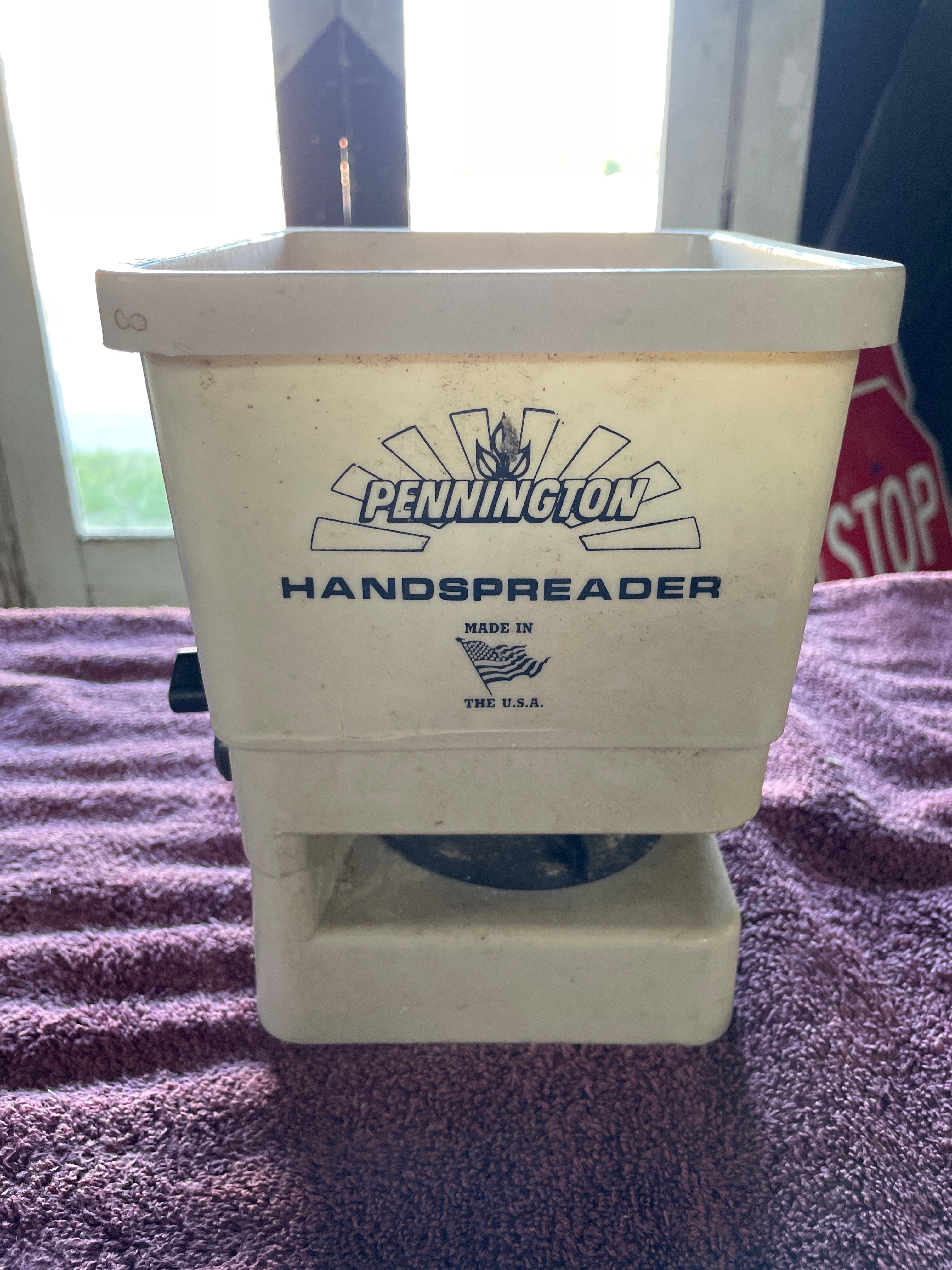 A Pennington Handspreader, designed for manual dispersal of seeds or fertilizer. Constructed primarily from off-white/cream plastic, with a black plastic handle and visible metal components for the internal spreading mechanism. The front features the brand ‘PENNINGTON’ with a plant/seedling motif, above ‘HANDSPREADER, ‘ and ‘MADE IN THE U.S.A.’ with an American flag graphic.