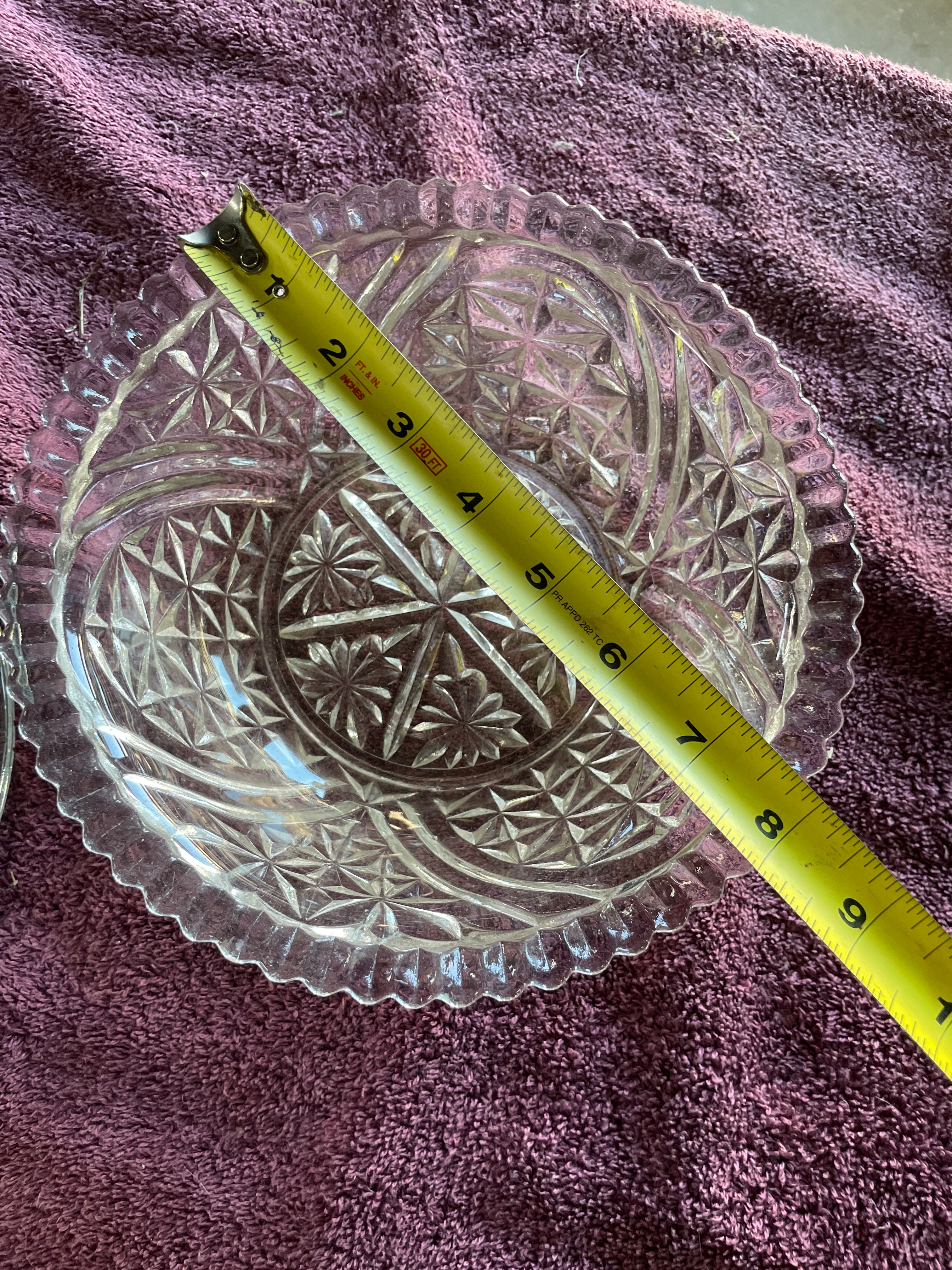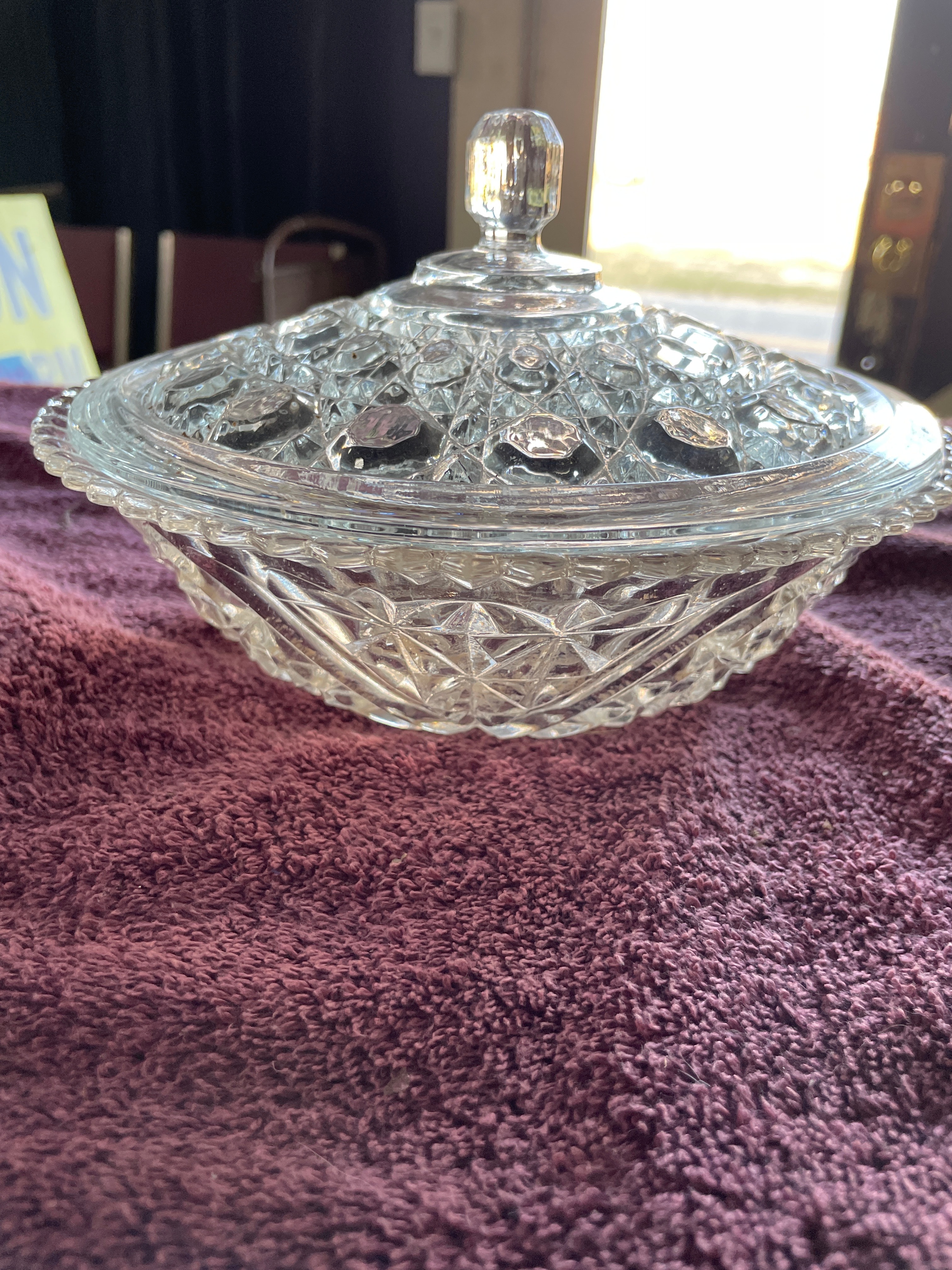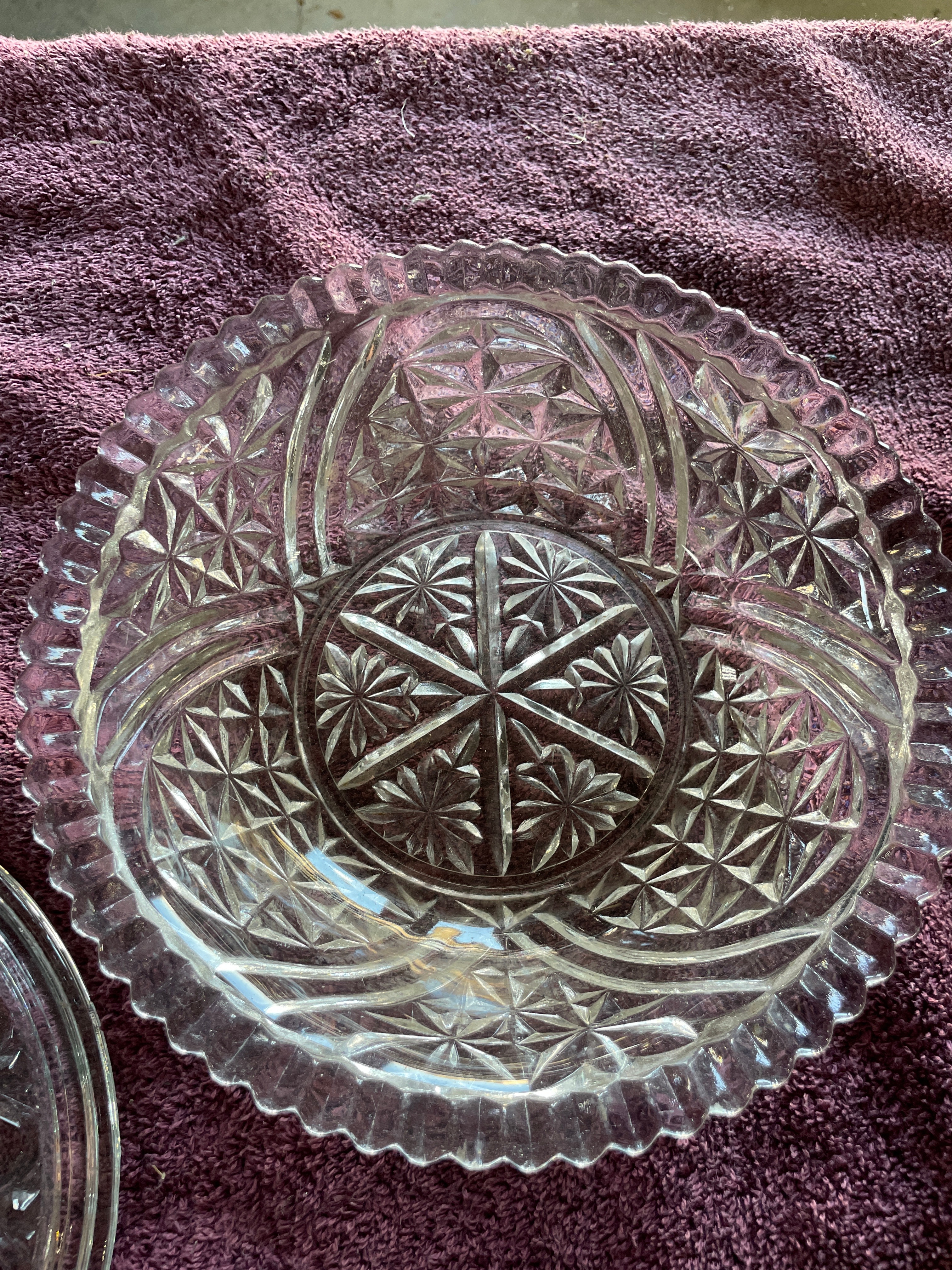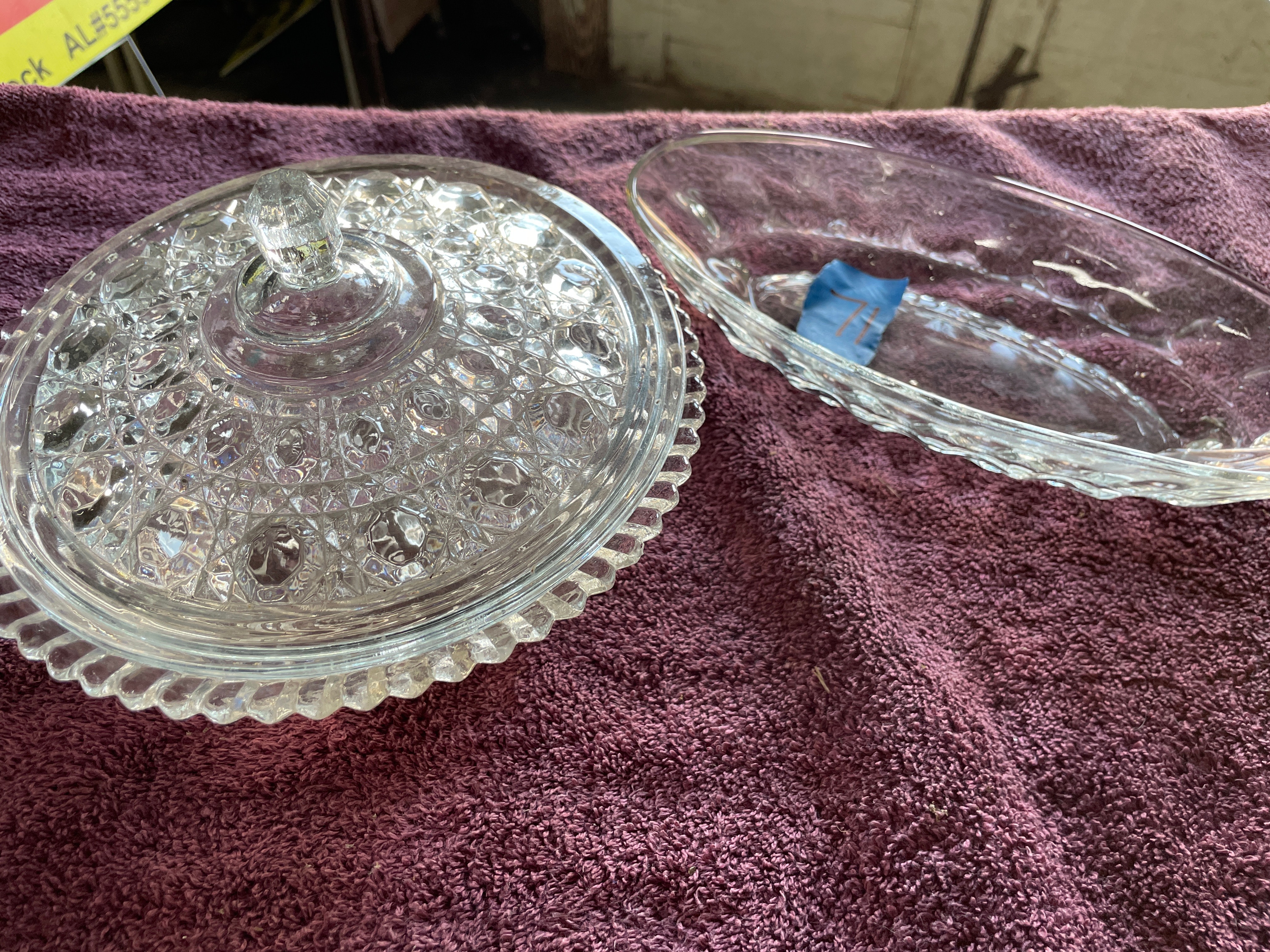A pair of clear pressed glass tableware items. The first is an Indiana Glass Windsor Button and Cane pattern covered candy dish, featuring a complex geometric ‘cut glass’ style pattern of starbursts, diamonds, and fan motifs, with a faceted finial and scalloped rims. The second item is an oval serving dish or shallow bowl, characterized by a repeating dimpled pattern and a smooth rim; it bears a blue tape with the handwritten number ‘7’.