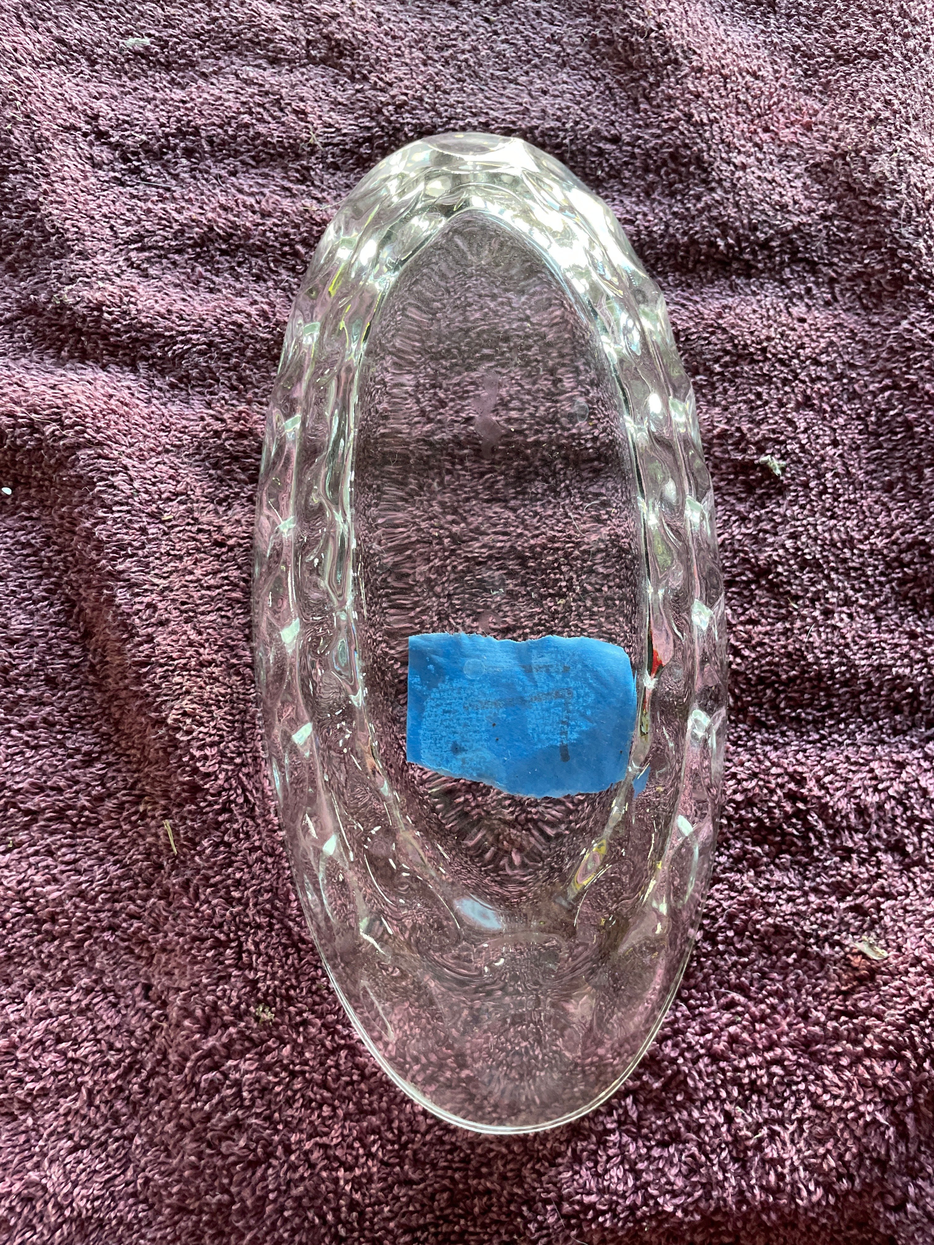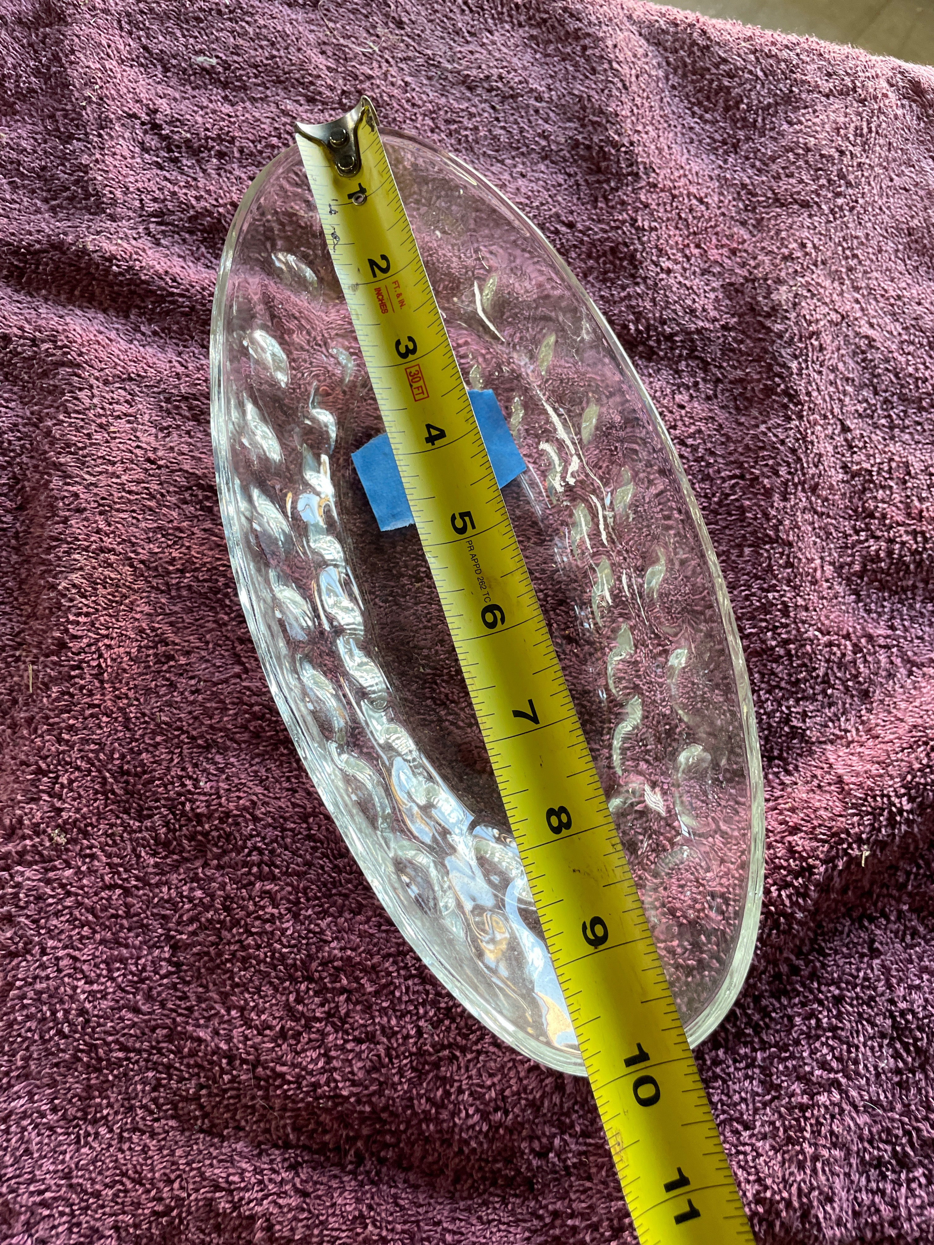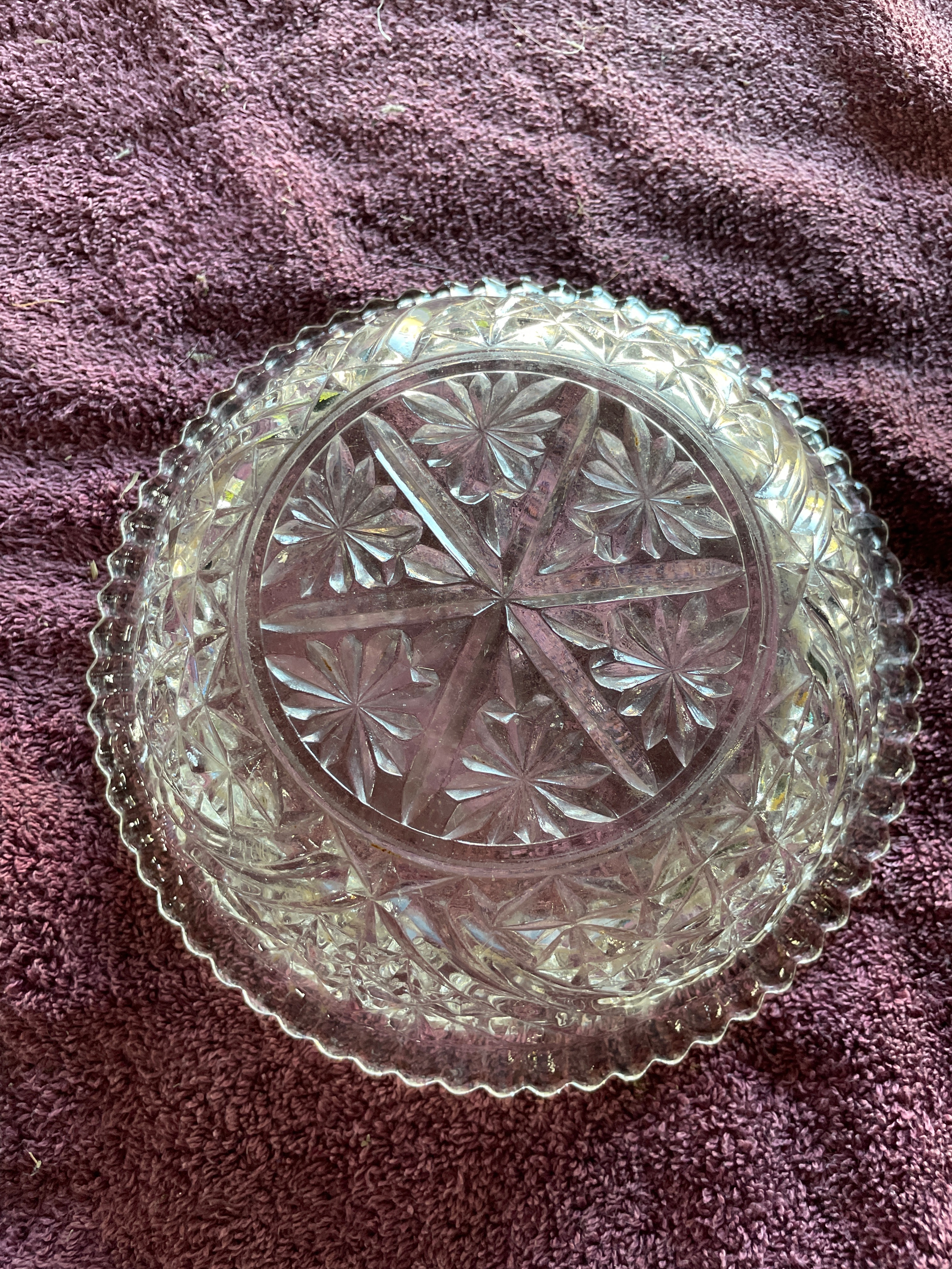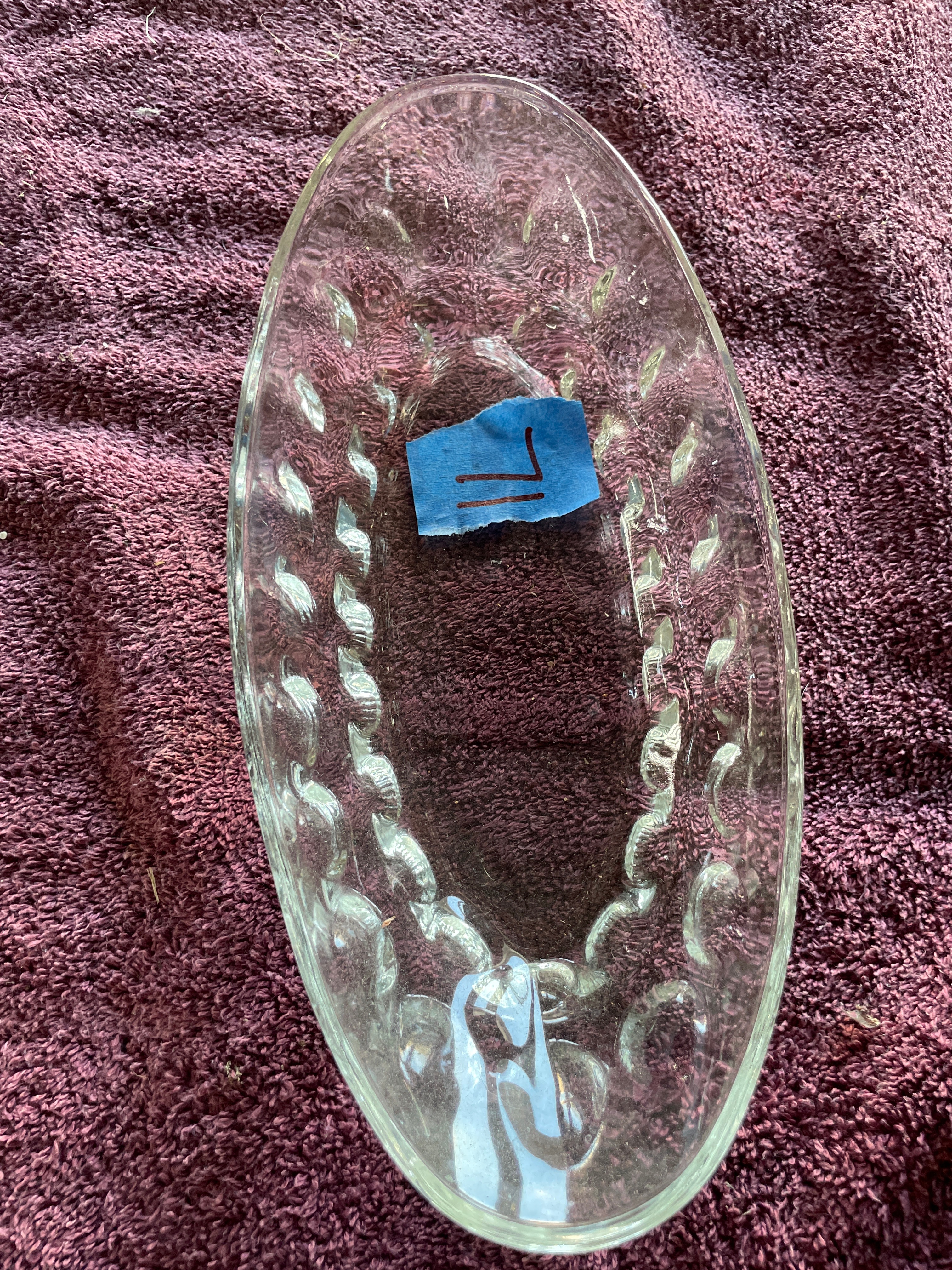 A pair of clear pressed glass tableware items. The first is an Indiana Glass Windsor Button and Cane pattern covered candy dish, featuring a complex geometric ‘cut glass’ style pattern of starbursts, diamonds, and fan motifs, with a faceted finial and scalloped rims. The second item is an oval serving dish or shallow bowl, characterized by a repeating dimpled pattern and a smooth rim; it bears a blue tape with the handwritten number ‘7’.