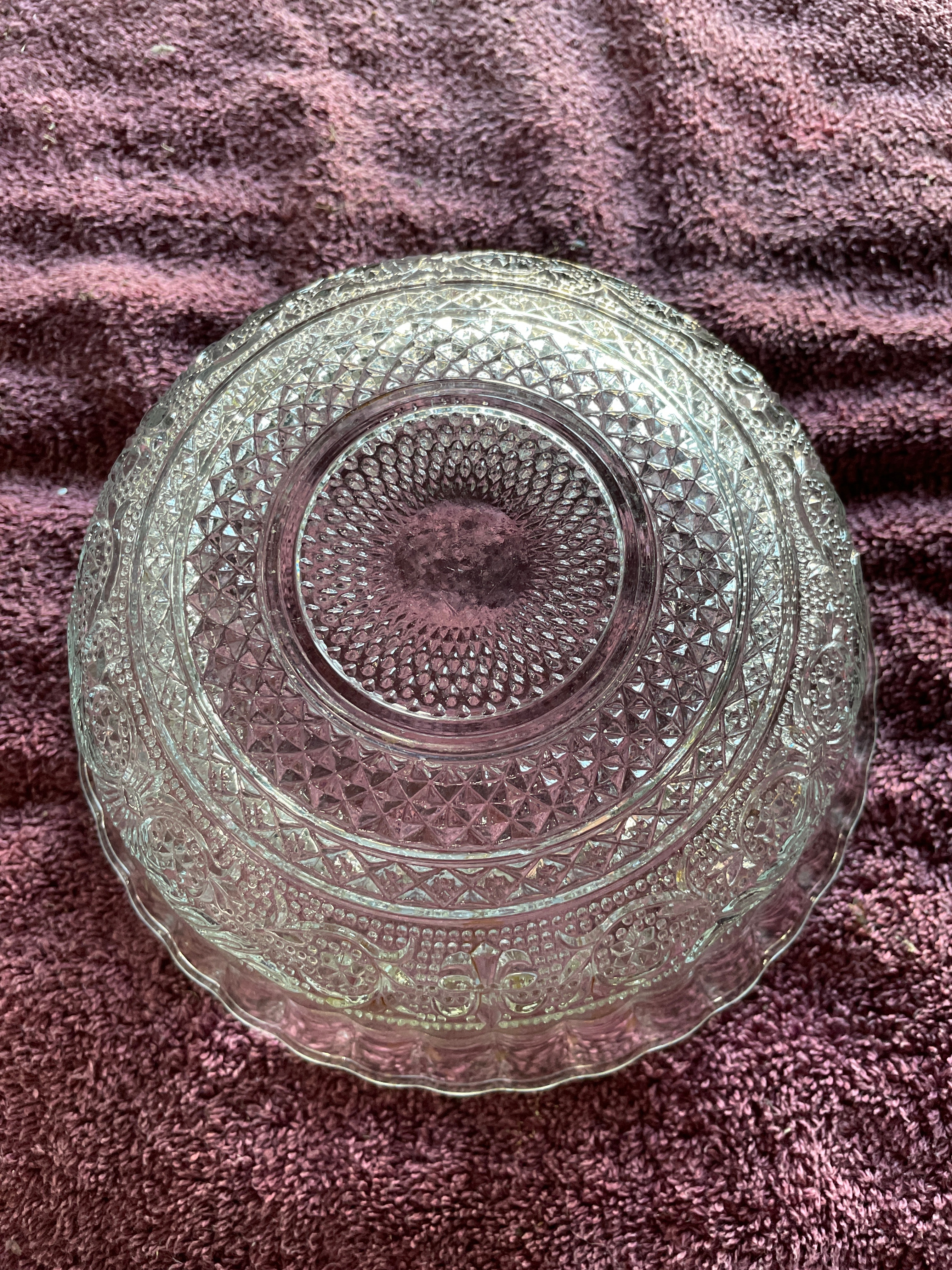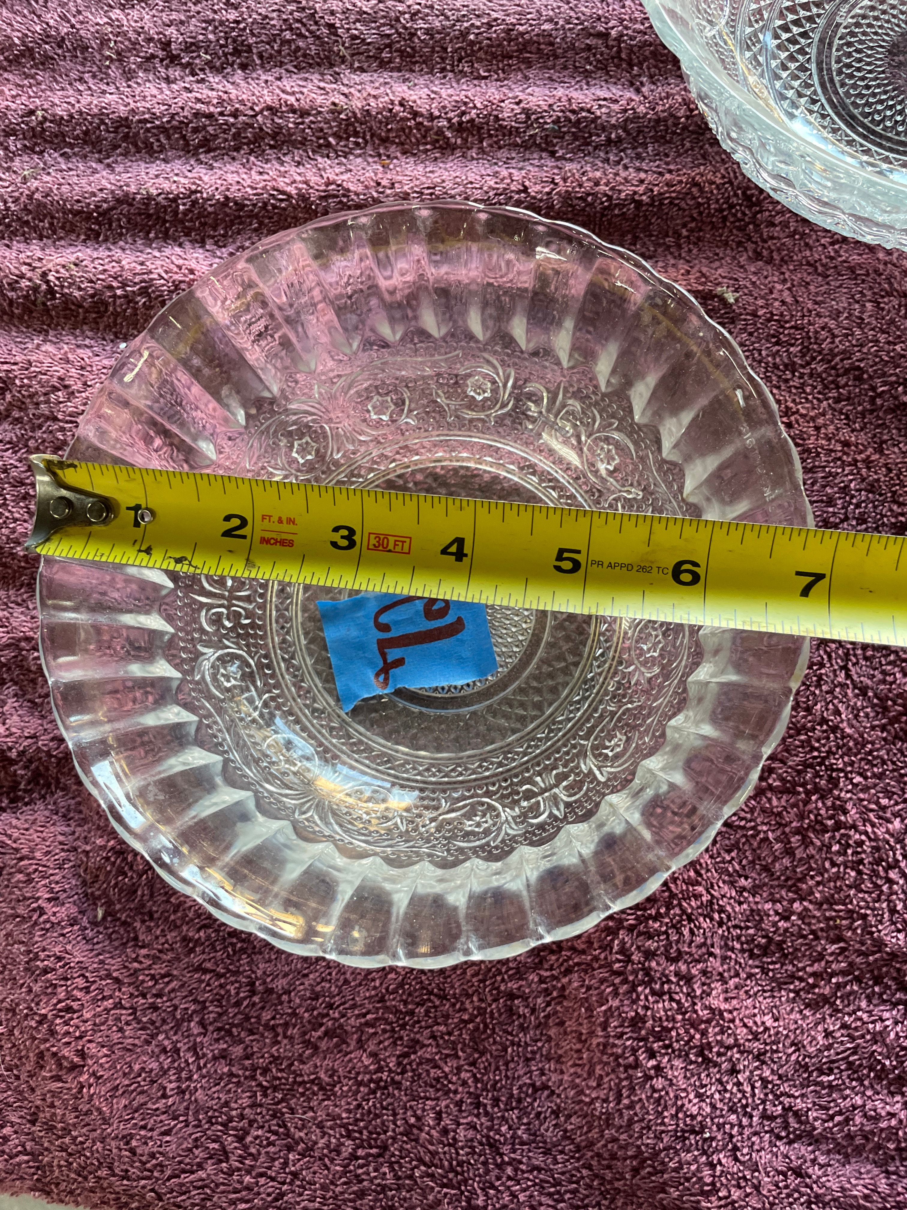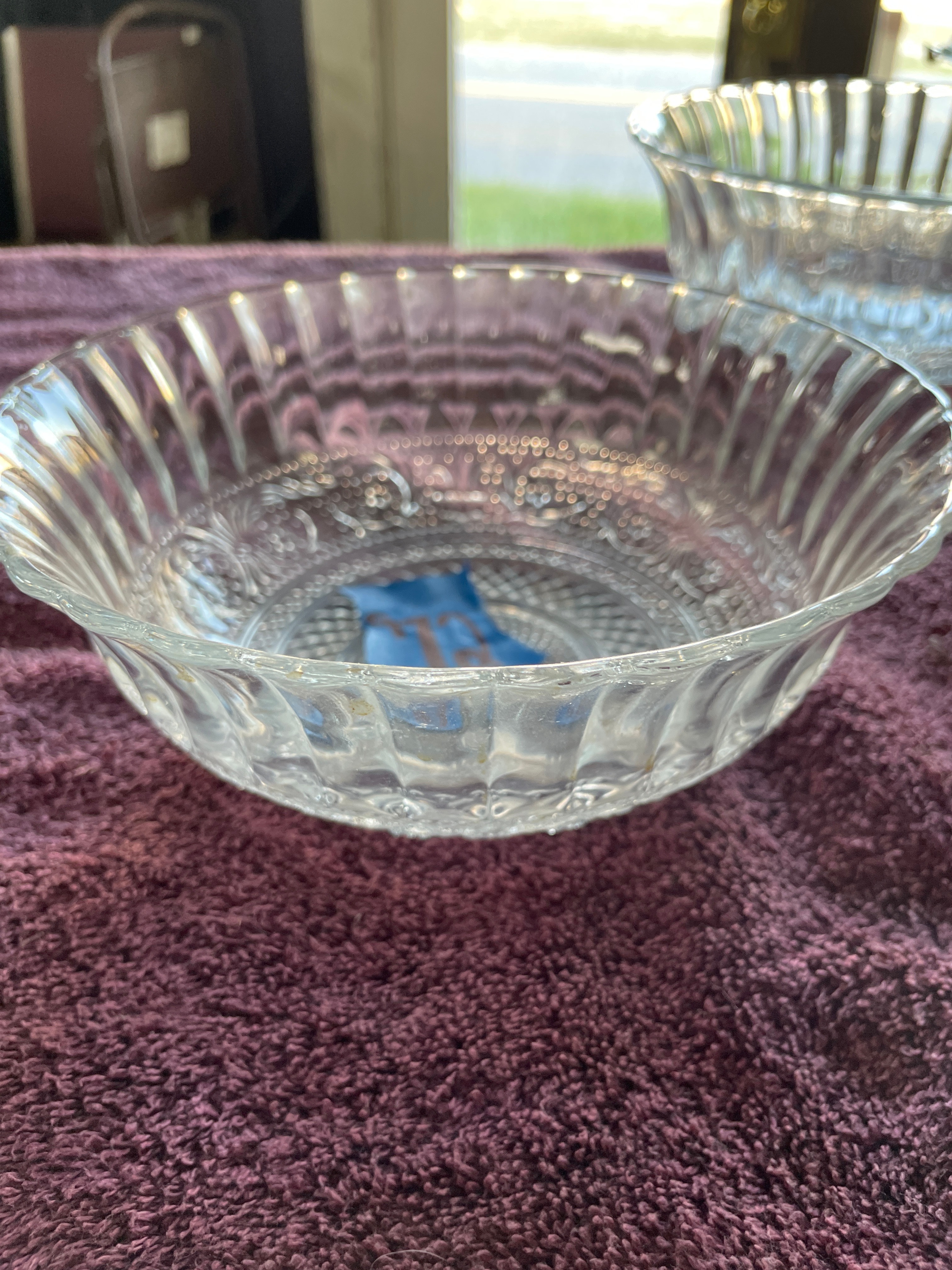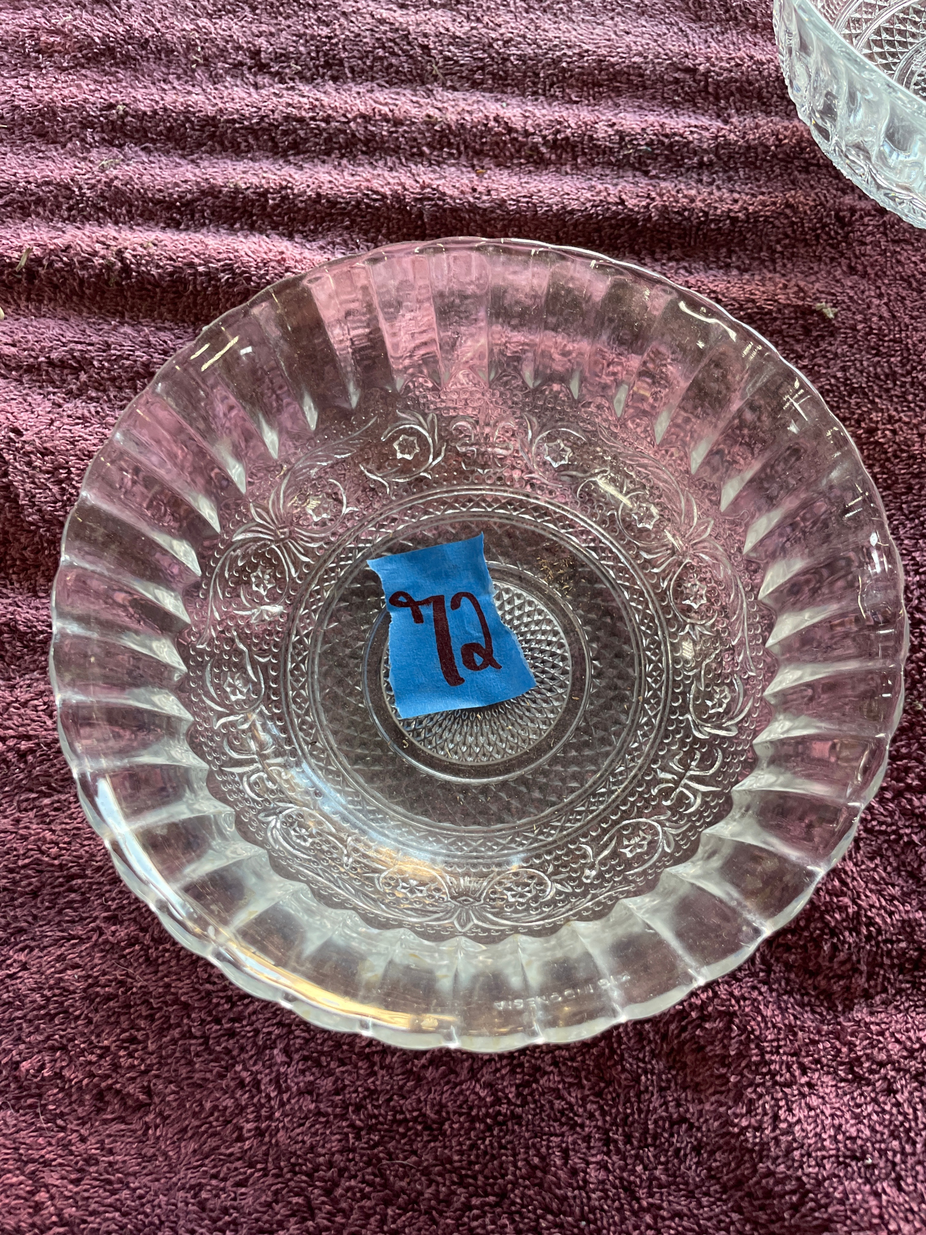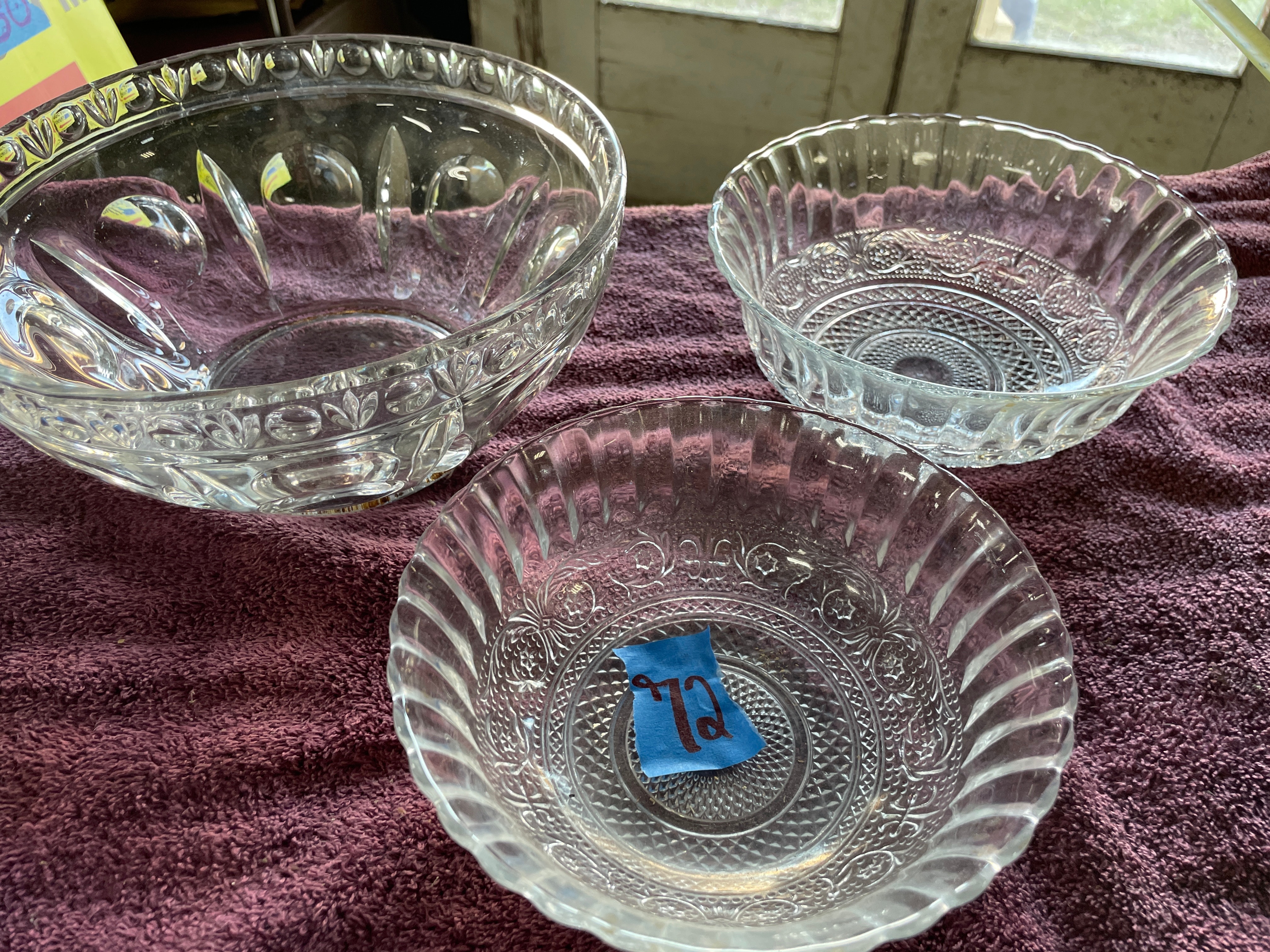 A set of three clear pressed glass serving bowls. Two bowls are identified as KIG Malaysia Fleur de Lis pattern, featuring a scalloped "lace edge" rim, fluted sides, and a central medallion with diamond-point and floral scroll motifs. One of these bowls bears a blue tape marked "72", and both exhibit partially legible molded text on their bases. The third, larger bowl displays large ovoid and teardrop-shaped facets on its body and a beaded rim.