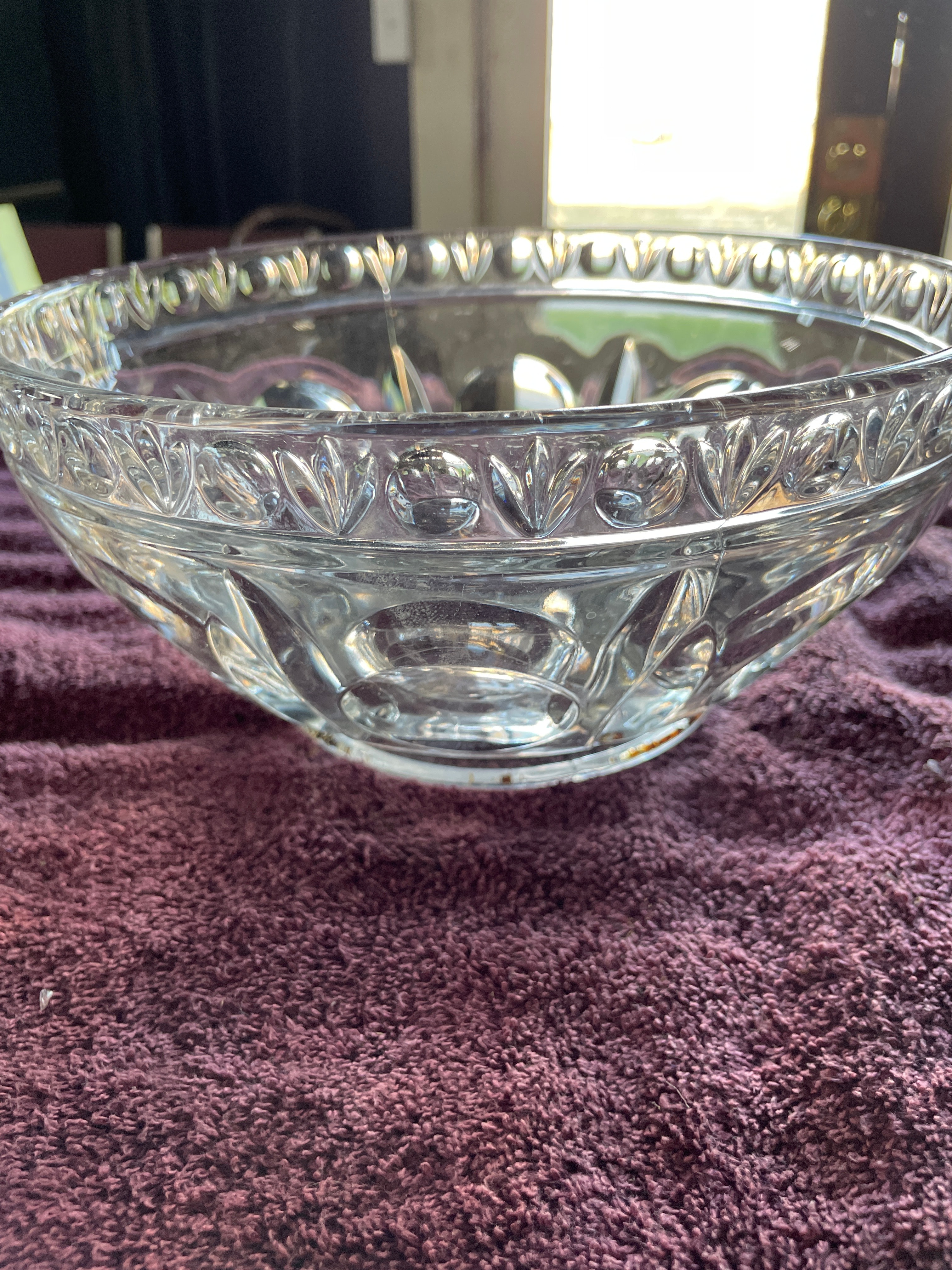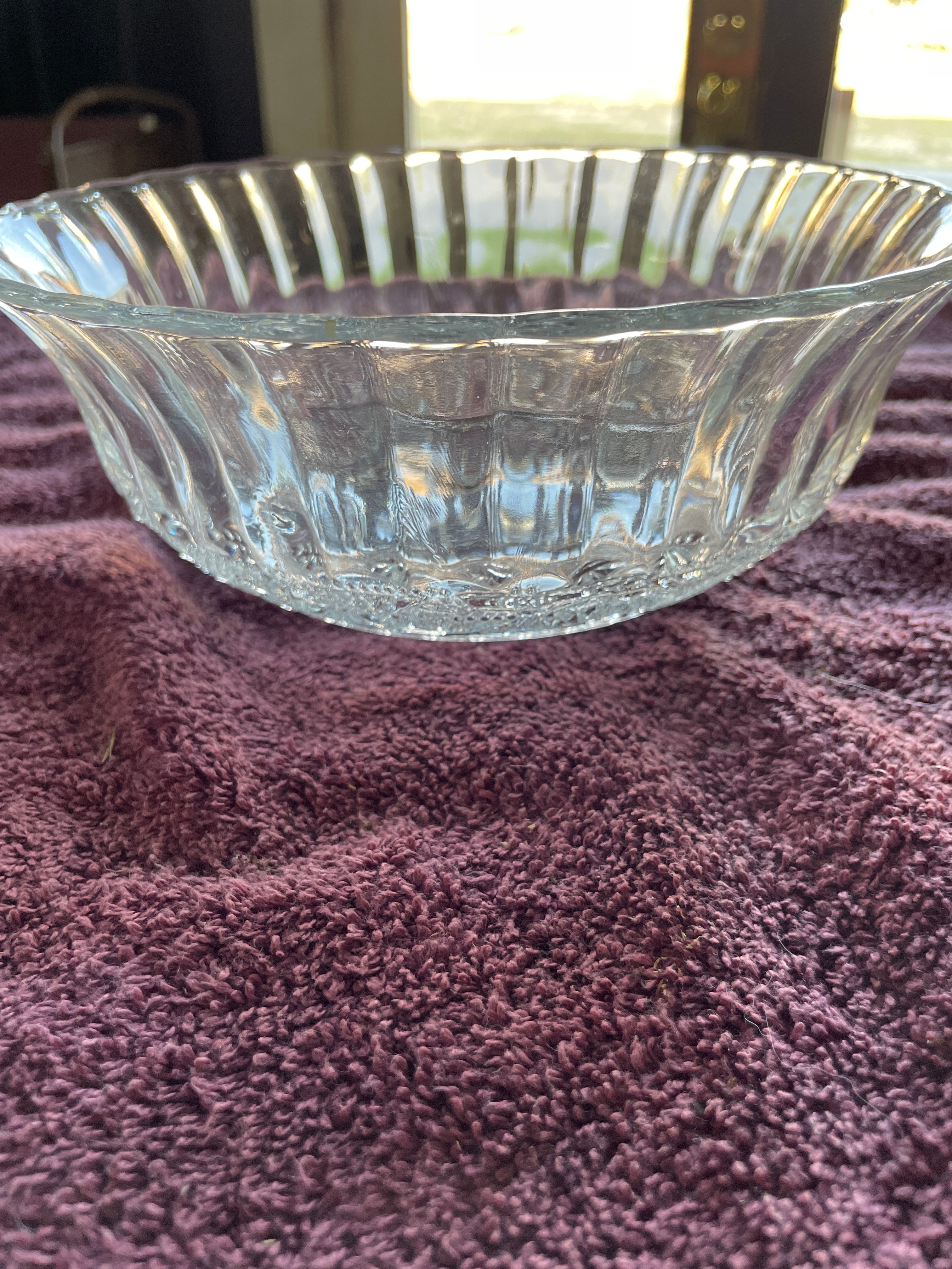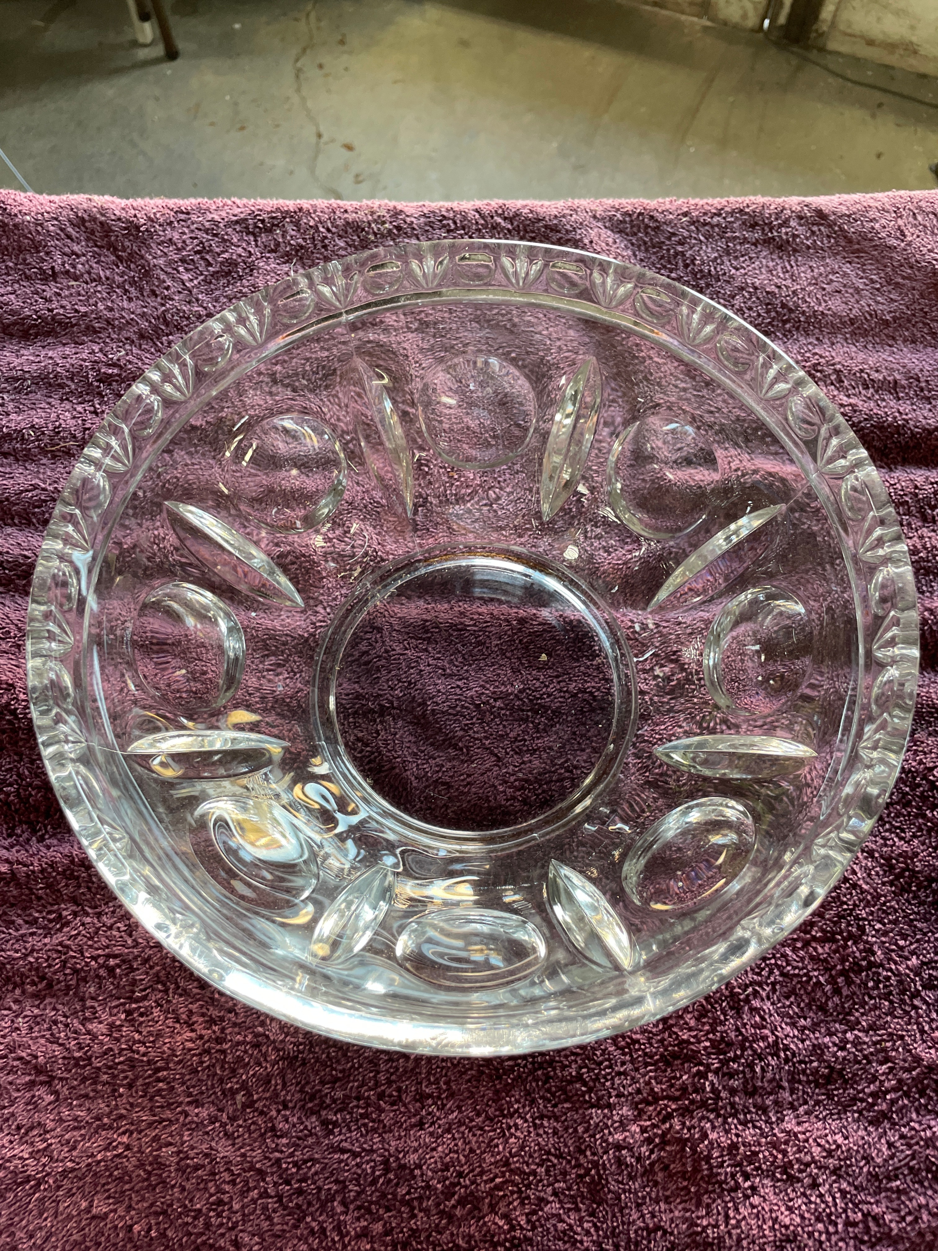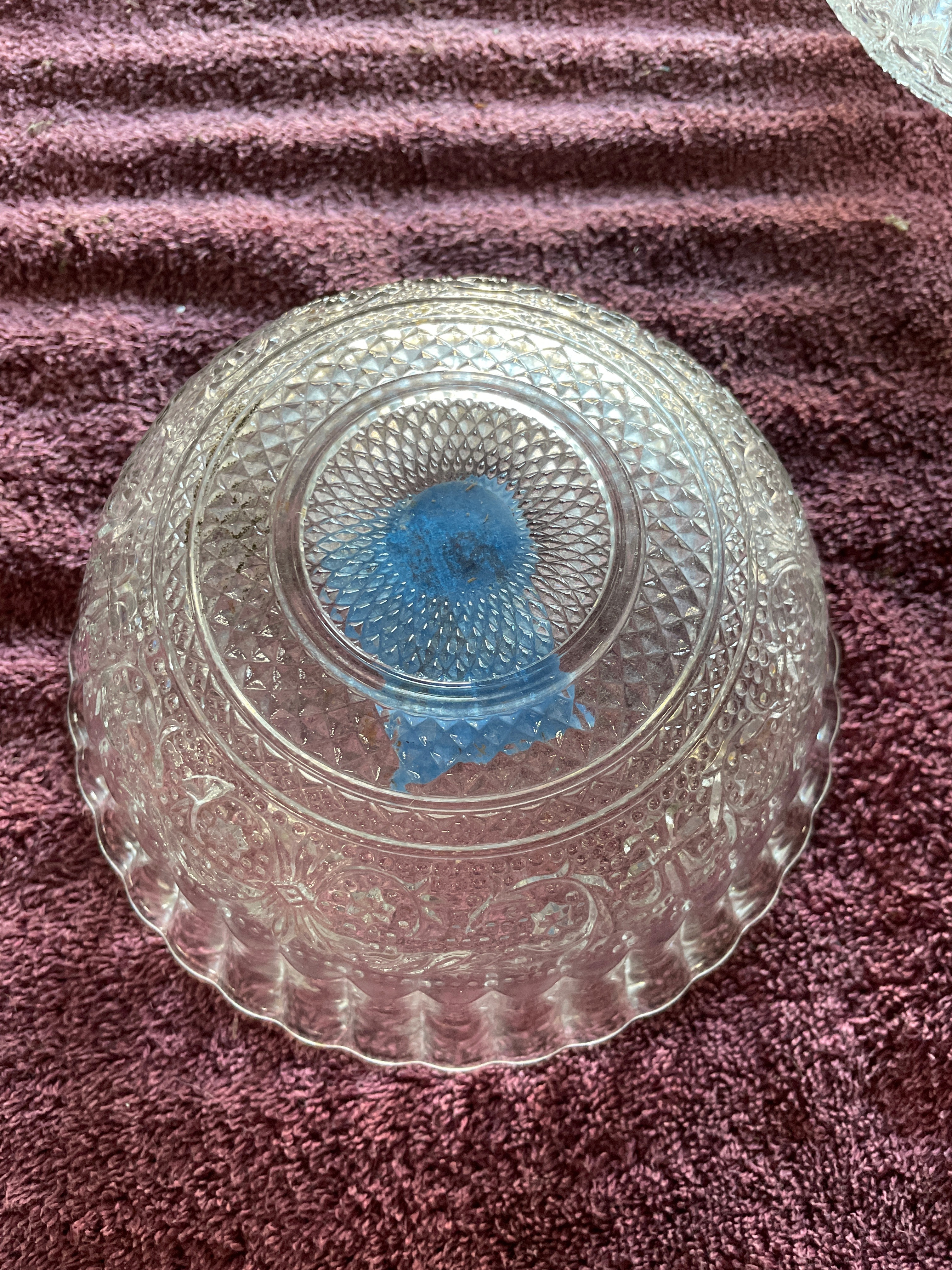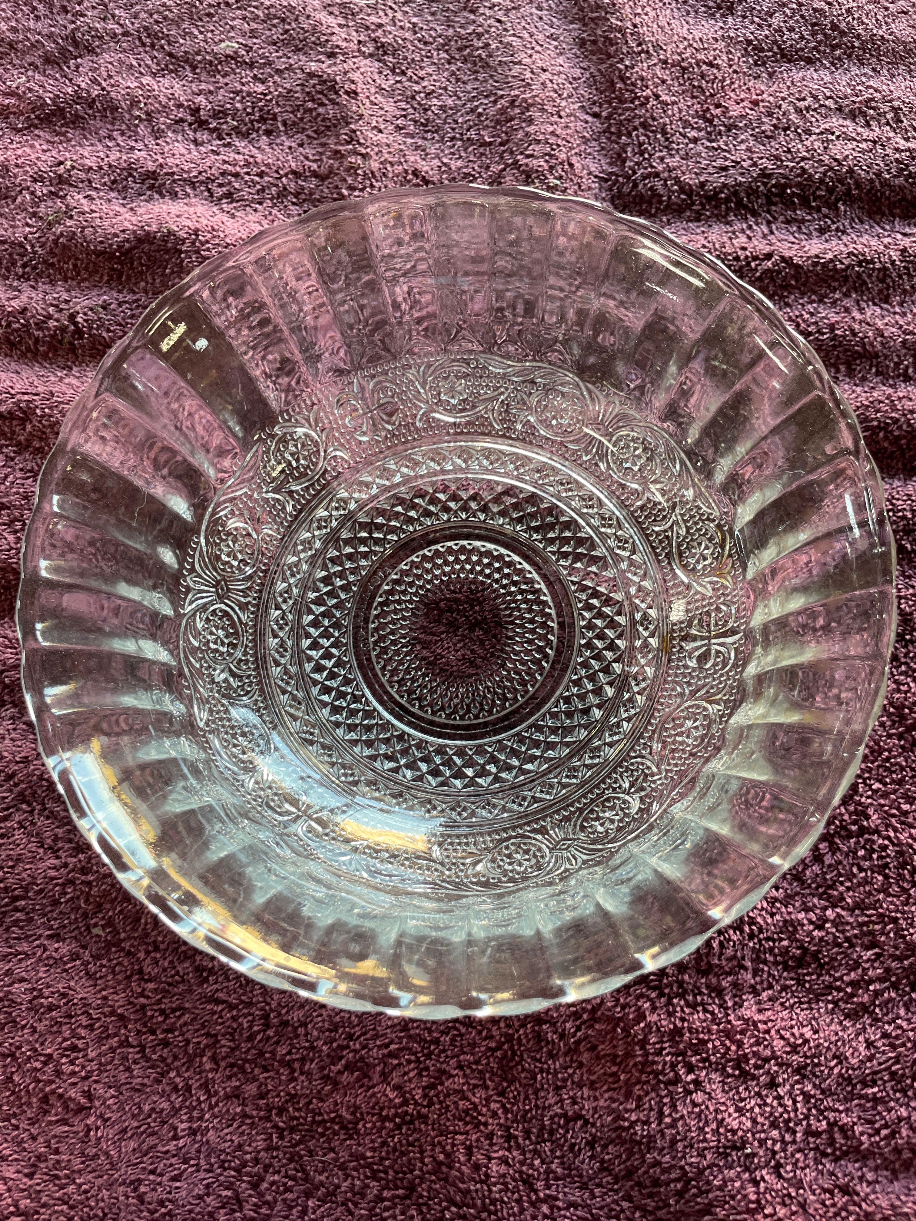 A set of three clear pressed glass serving bowls. Two bowls are identified as KIG Malaysia Fleur de Lis pattern, featuring a scalloped "lace edge" rim, fluted sides, and a central medallion with diamond-point and floral scroll motifs. One of these bowls bears a blue tape marked "72", and both exhibit partially legible molded text on their bases. The third, larger bowl displays large ovoid and teardrop-shaped facets on its body and a beaded rim.