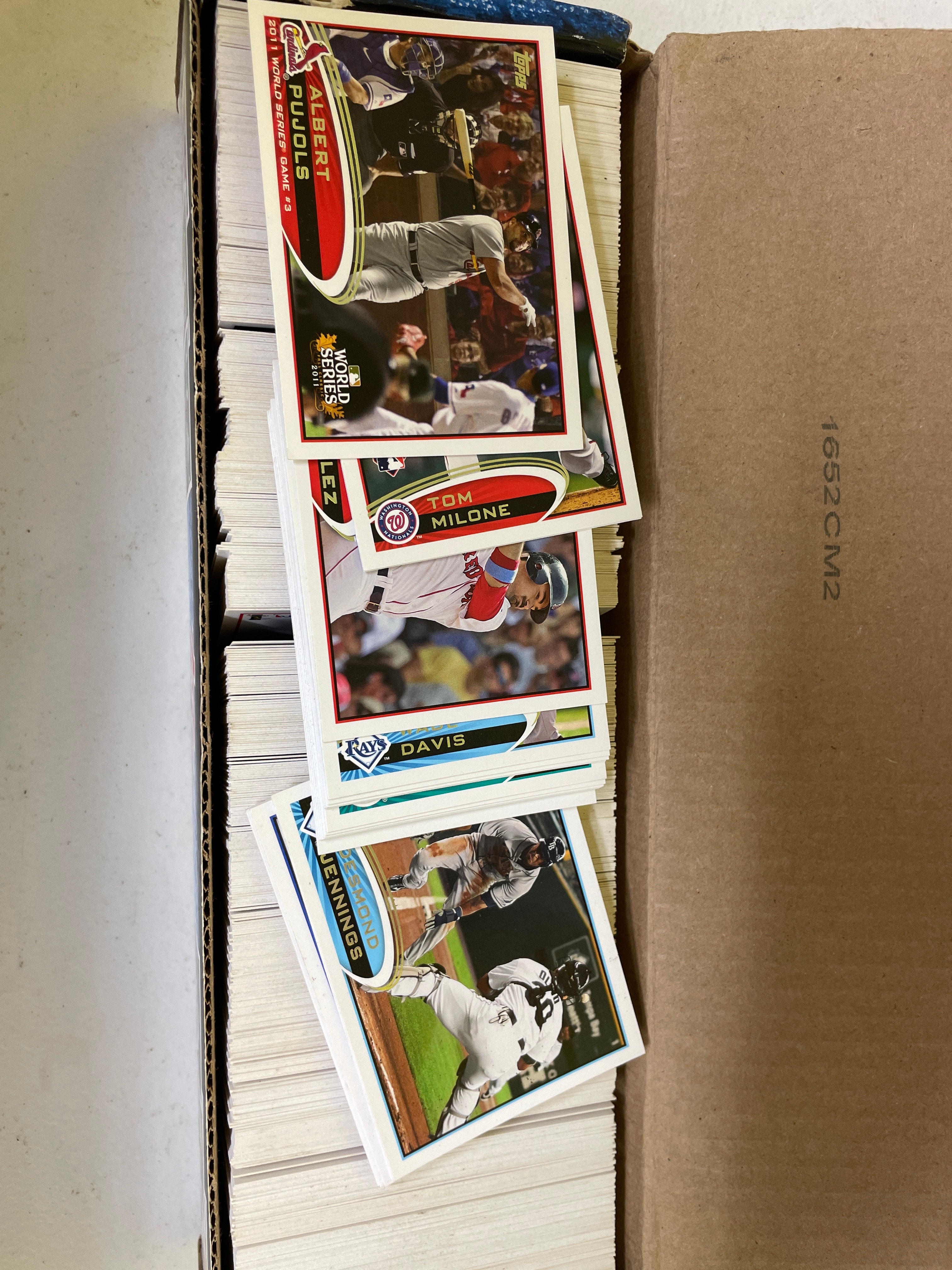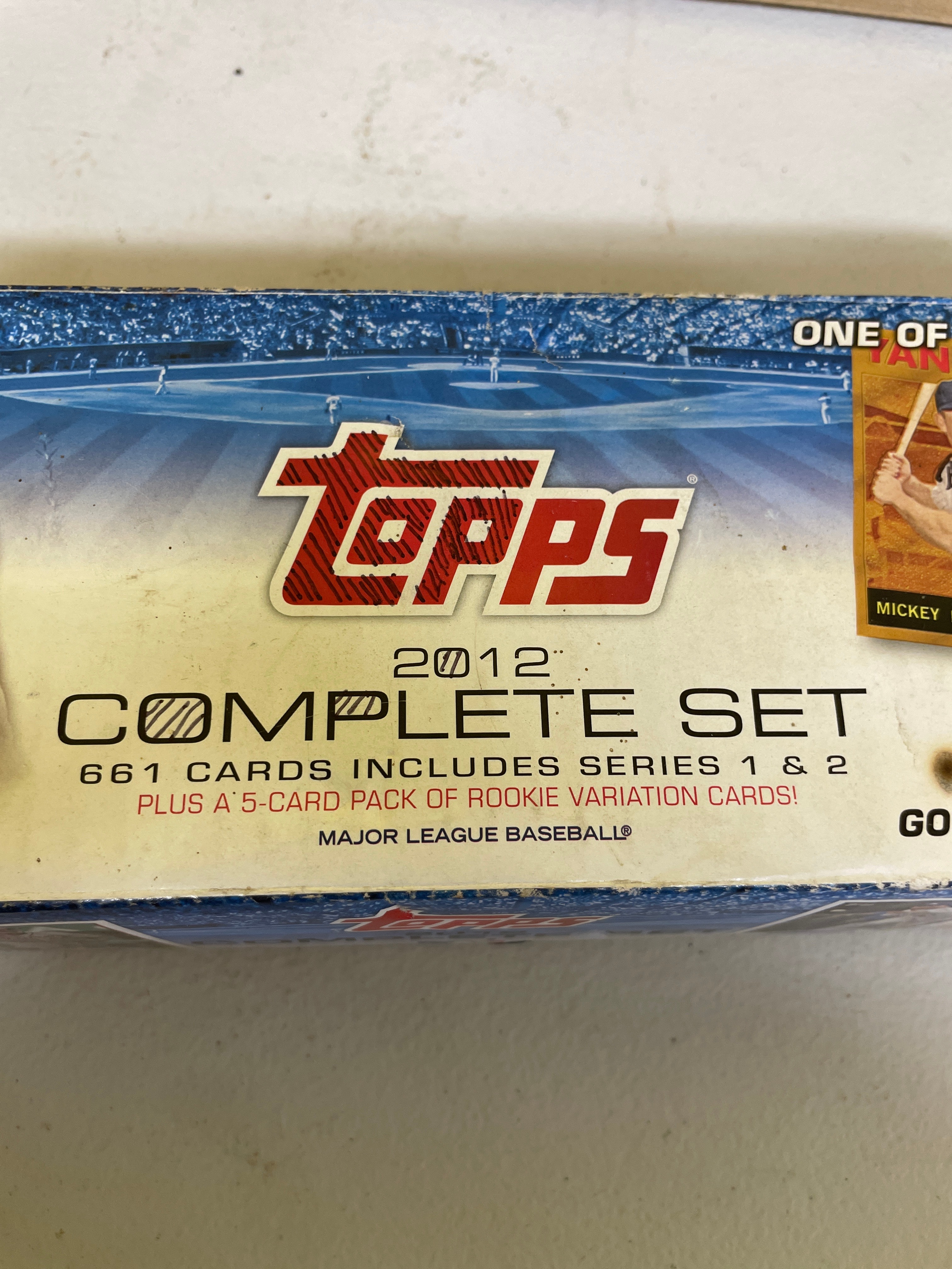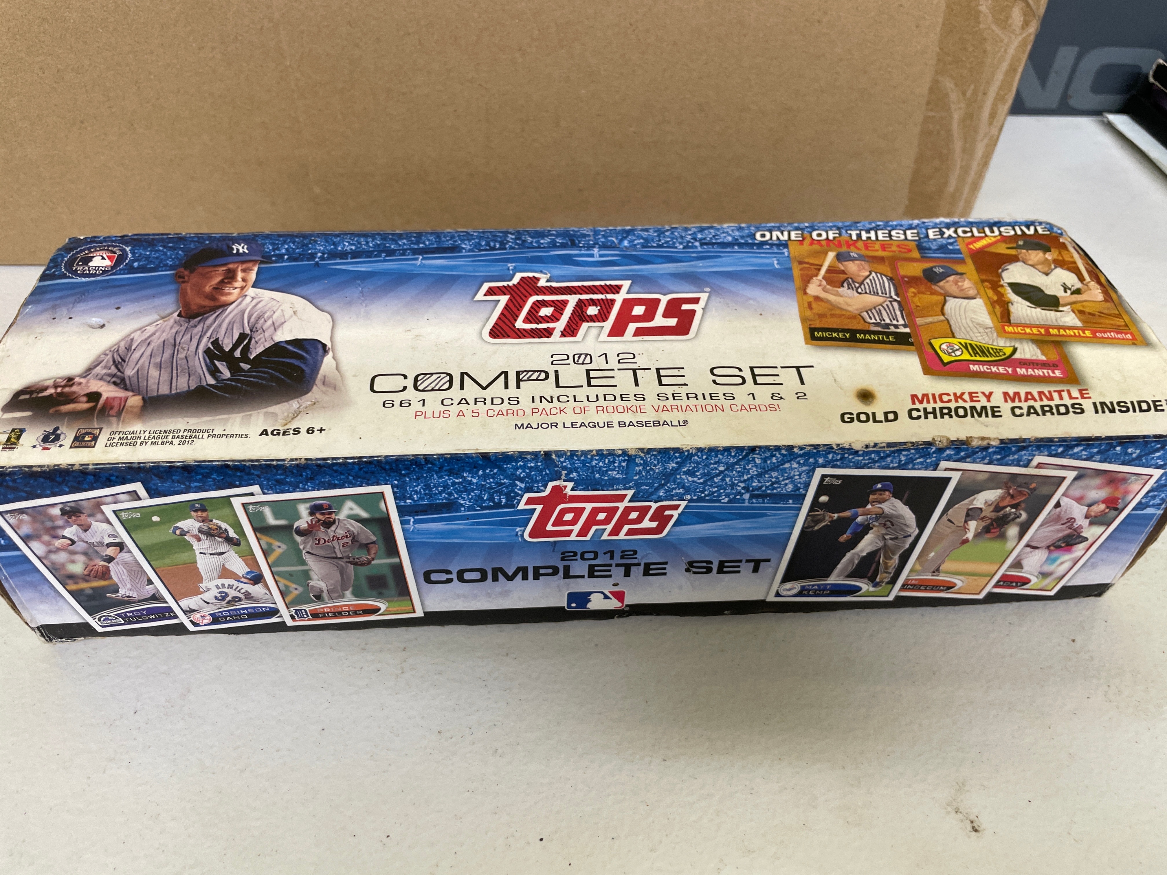 A 2012 Topps Major League Baseball Complete Set, presented in its original cardboard retail box. The packaging features contemporary sports collectible graphics, prominently displaying the “Topps” logo and “2012 Complete Set” with text indicating it contains “661 Cards Includes Series 1 & 2 Plus A 5-Card Pack of Rookie Variation Cards!”, further highlighting “Mickey Mantle Gold Chrome Cards Inside.” Visible text confirms it is an “OFFICIALLY LICENSED PRODUCT” for “AGES 6+.” Inside the box, numerous card stock trading cards are neatly stacked, with visible examples featuring players such as Albert Pujols, Tom Milone, and D. Jennings. An internal box flap bears the marking “1652CM2”.