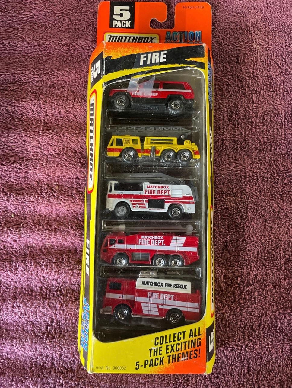 A Matchbox 1996 Fire Action System 5-Pack Gift Set, comprising five miniature die-cast ‘Fire’ themed vehicles, presented in its unopened original retail blister packaging. The cardboard backing features a vibrant yellow and orange color scheme with black and white text, while the clear plastic blister front displays the vehicles. The set includes an SUV labeled “FIRE CHIEF, ” a yellow ladder truck, a white pumper/tanker, and two red pumper/rescue trucks, with some vehicles bearing “FIRE DEPT.” or “MATCHBOX FIRE RESCUE” markings. Visible text on the packaging includes “5 PACK, ” “MATCHBOX ACTION SYSTEM, ” “FIRE, ” “For Ages 3 & Up, ” and “COLLECT ALL THE EXCITING 5-PACK THEMES!” The reverse side lists various other themes and directs to “www.matchboxtoys.com.”