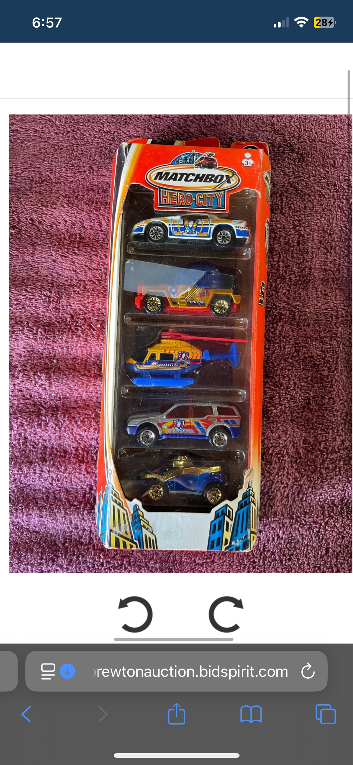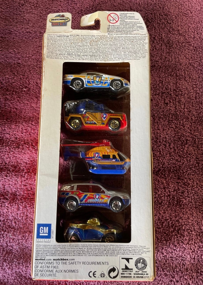 A Matchbox Hero City 5-Pack of die-cast toy vehicles, themed ‘Police’. Sealed within its original cardboard and plastic blister packaging. The set comprises five distinct vehicles: a white and blue police car, a multi-colored dune buggy, a blue and orange helicopter, a silver and blue SUV, and a blue and gold sports car, all featuring thematic decoration. Visible markings on the front include ‘MATCHBOX’ and ‘HERO CITY’, with an age recommendation of ‘3+’. The reverse features ‘MADE IN CHINA’, a ‘GM’ logo, and safety standard compliance text in English, French (CONFORME AUX NORMES DE SÉCURITÉ), Spanish (CUMPLE CON LOS REQUISITOS DE SEGURIDAD), and Portuguese (CONFORME ÀS NORMAS DE SEGURANÇA).
