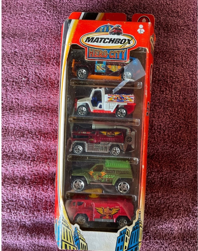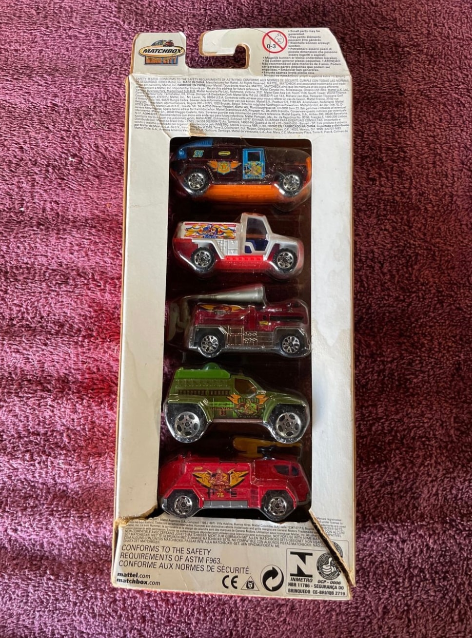 A Matchbox 2003 Hero City Fire Emergency Vehicles 5-Piece Set, presented in its original, sealed cardboard and plastic blister packaging. This set includes five distinct die-cast vehicles: an orange and blue SUV, a white and red pickup truck, two red fire/emergency vehicles, and a green off-road utility vehicle, all featuring custom graphics. The packaging prominently displays “MATCHBOX, ” “HERO-CITY, ” an age rating of “3+, ” and “MATTEL” as the manufacturer. The reverse side of the packaging includes safety compliance markings such as “CONFORMS TO THE SAFETY REQUIREMENTS OF ASTM F963,” “CONFORME AUX NORMES DE SÉCURITÉ, ” “CE” certification, and an “INMETRO” mark, indicating Brazilian certification. This set is also referred to in some sources as a 2004 ‘Fire Patrol’ or ‘Fire 5-PK’ set.