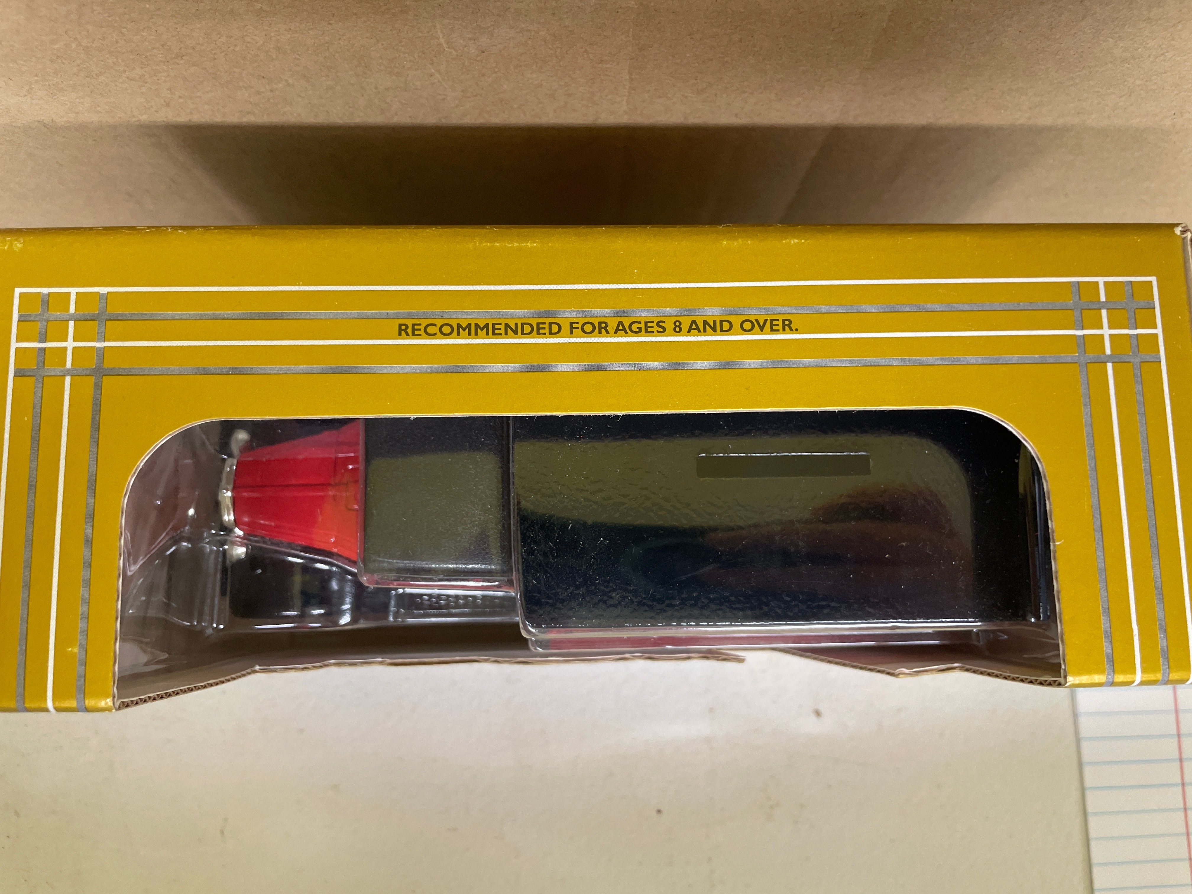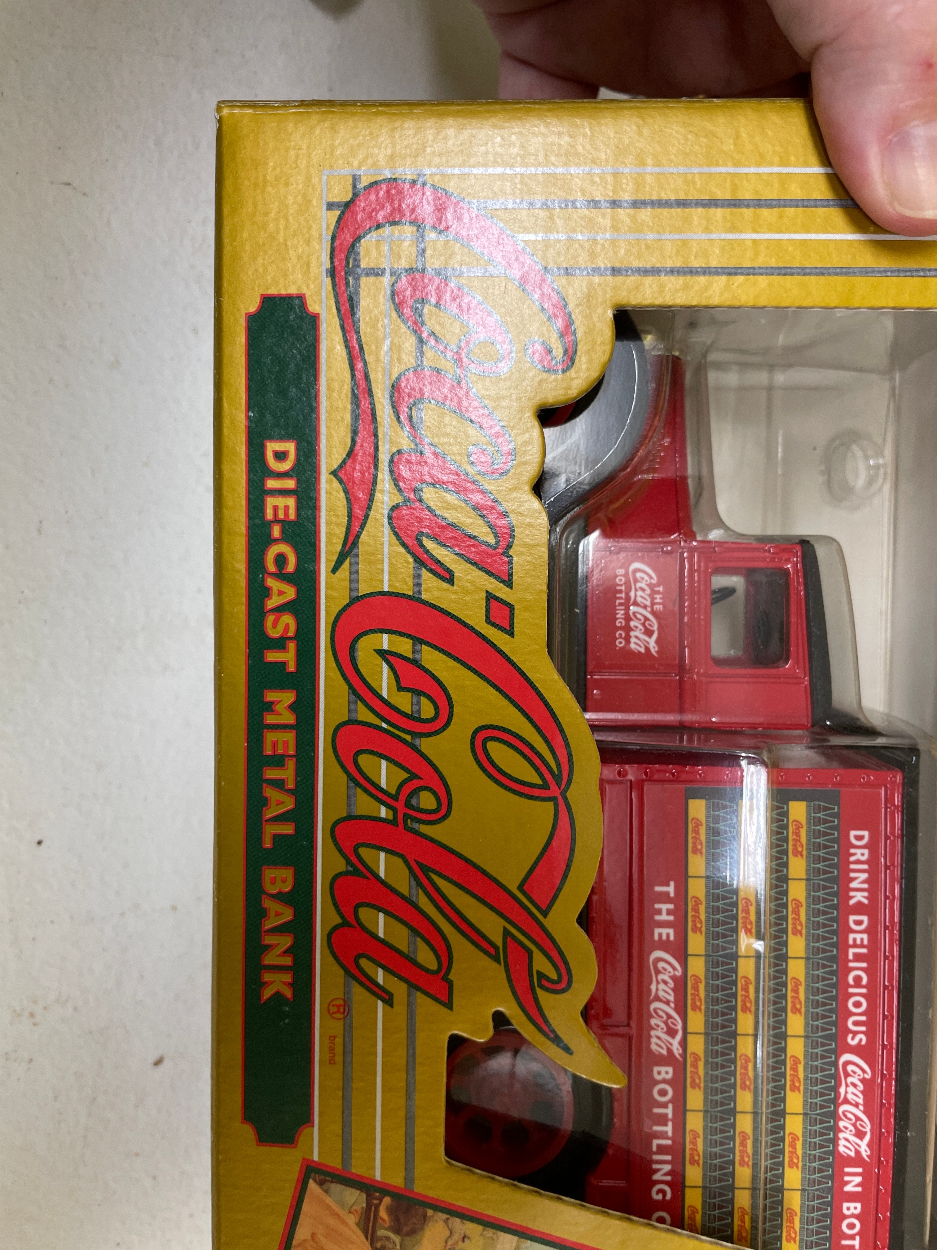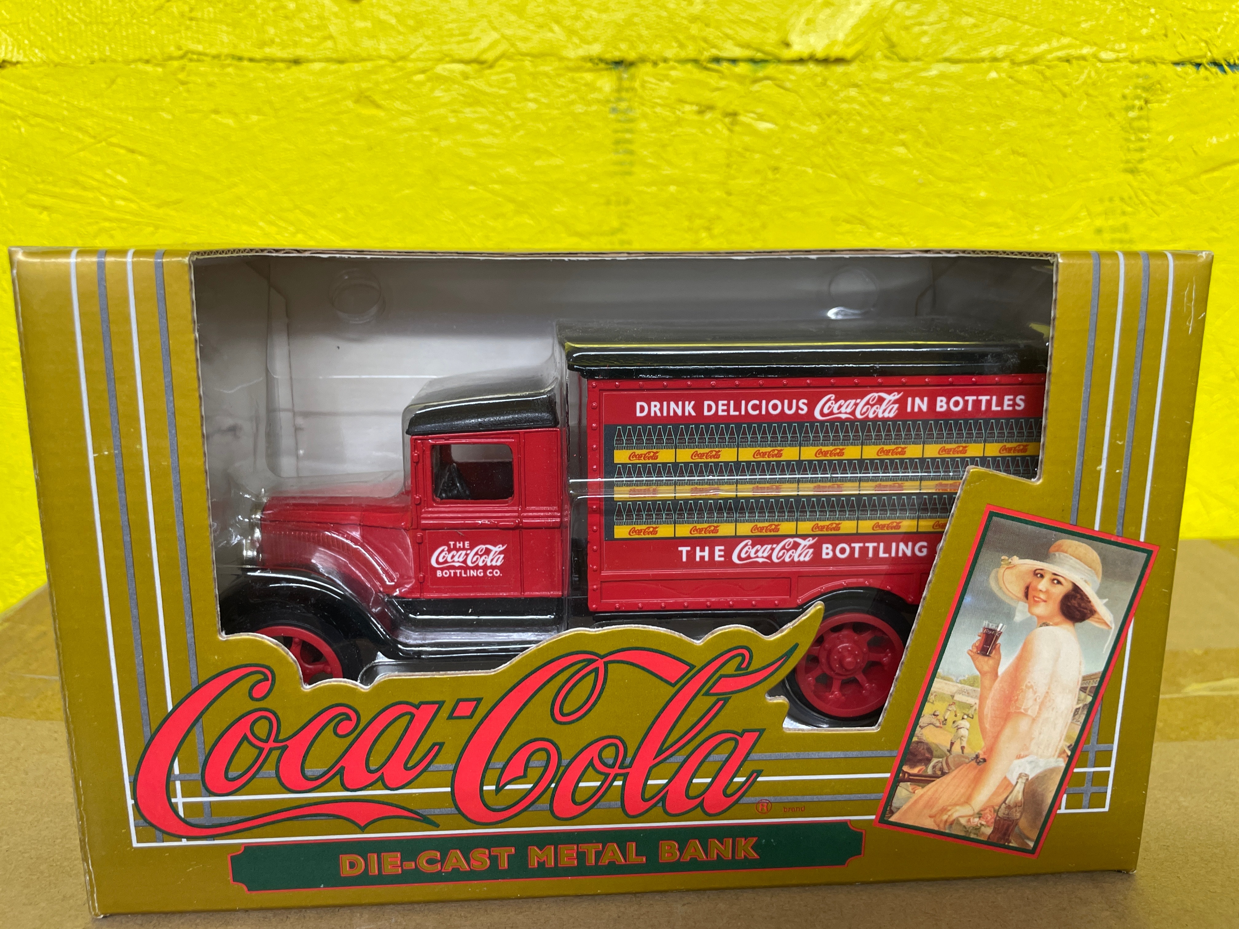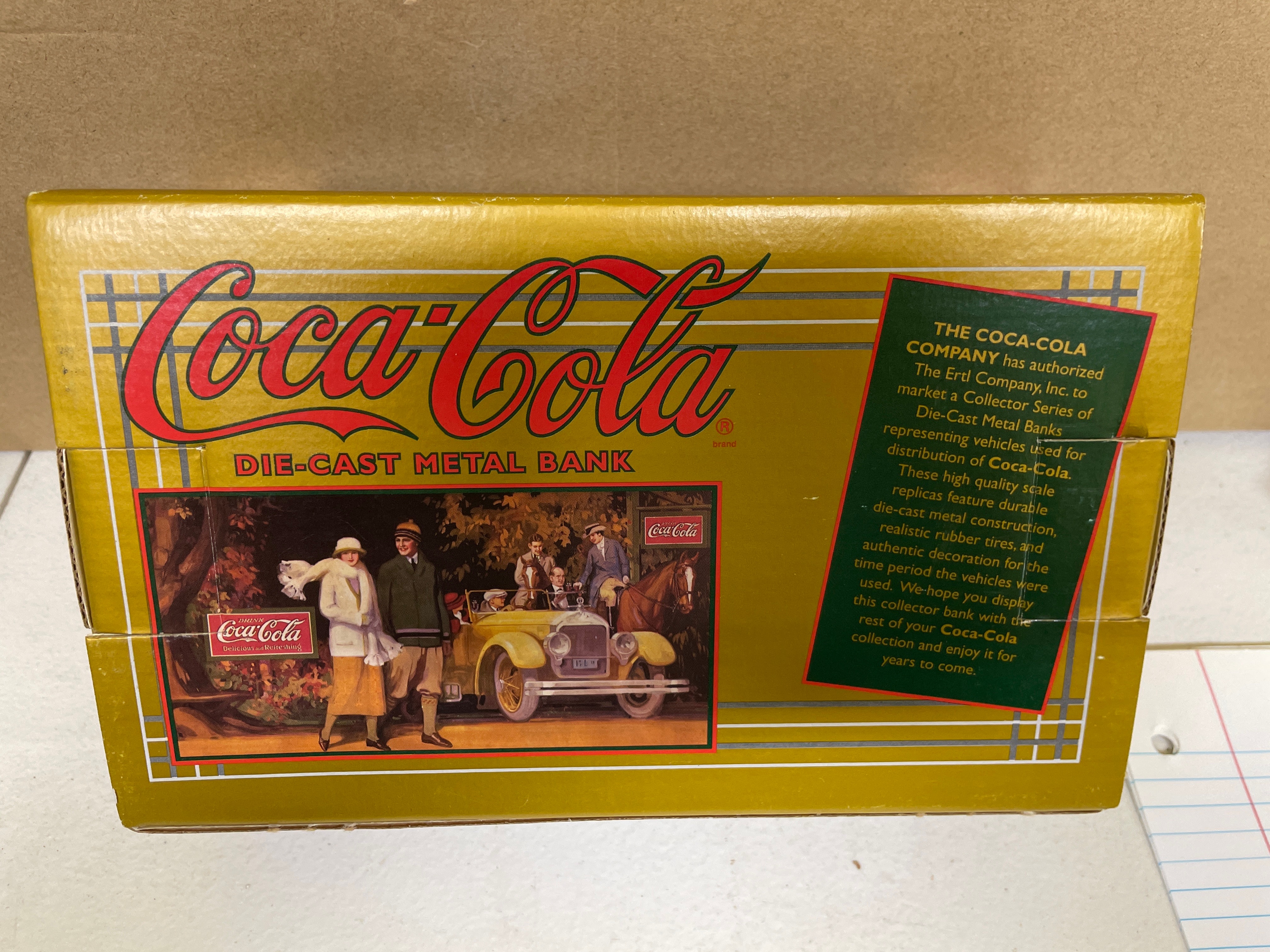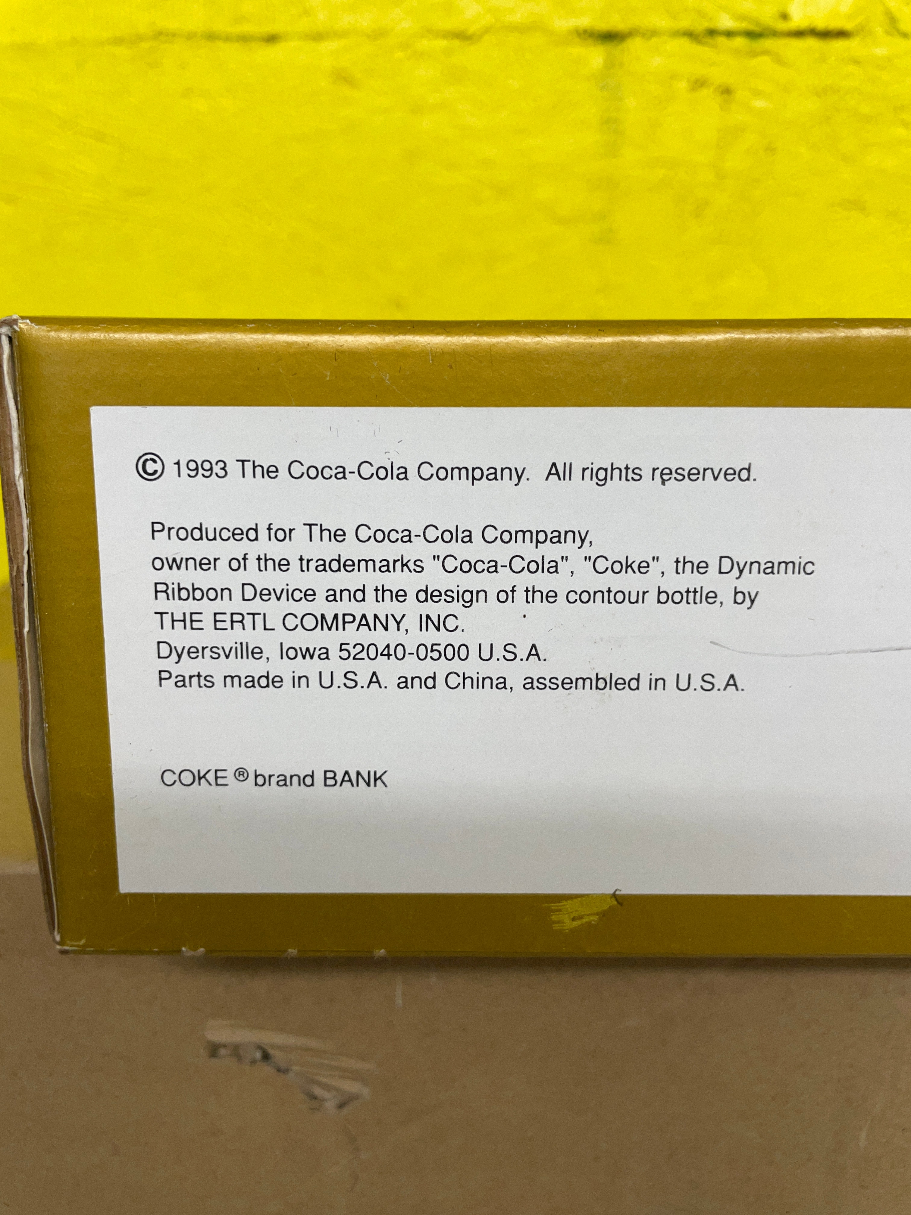 An ERTL Coca-Cola 1993 Die-Cast Metal Delivery Truck Bank. This vintage-style red die-cast metal toy delivery truck is presented as a “DIE-CAST METAL BANK” and remains sealed in its original gold and red branded display box. The truck features prominent “Coca-Cola” script logos, “THE Coca-Cola BOTTLING CO.” on its cab, and “DRINK DELICIOUS Coca-Cola IN BOTTLES” along its cargo body, accompanied by graphics of stacked Coca-Cola bottles. The packaging identifies the item as a “Collector Series” authorized by The Coca-Cola Company and produced by The Ertl Company, Inc. in 1993. It includes period-style illustrations and details its manufacture with parts from the U.S.A. and China, assembled in the U.S.A.