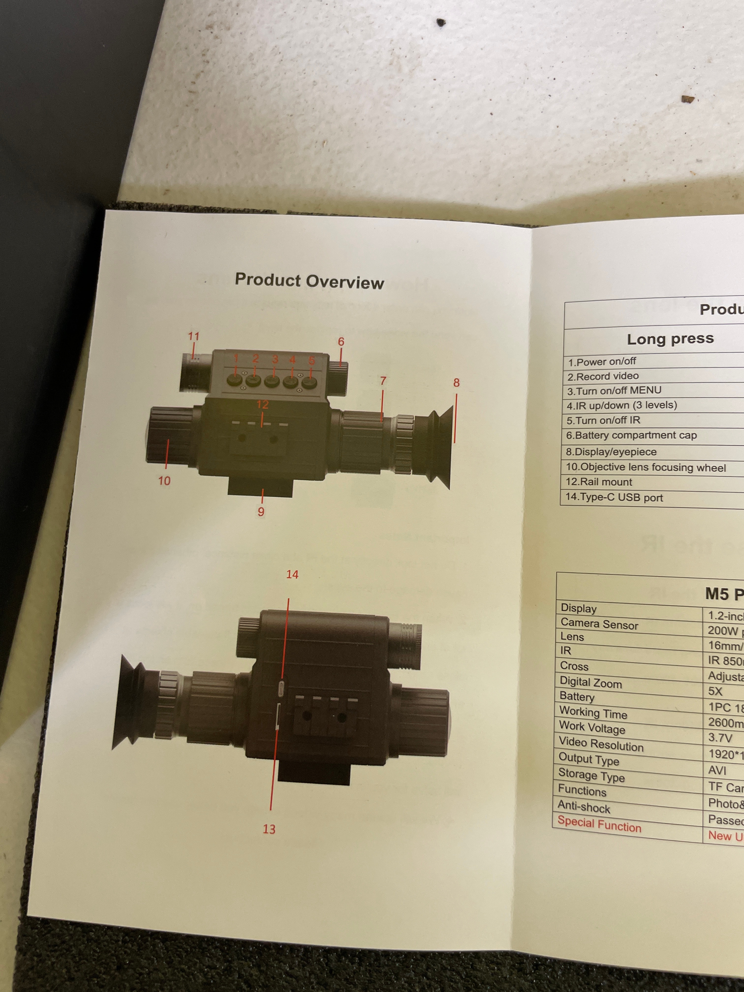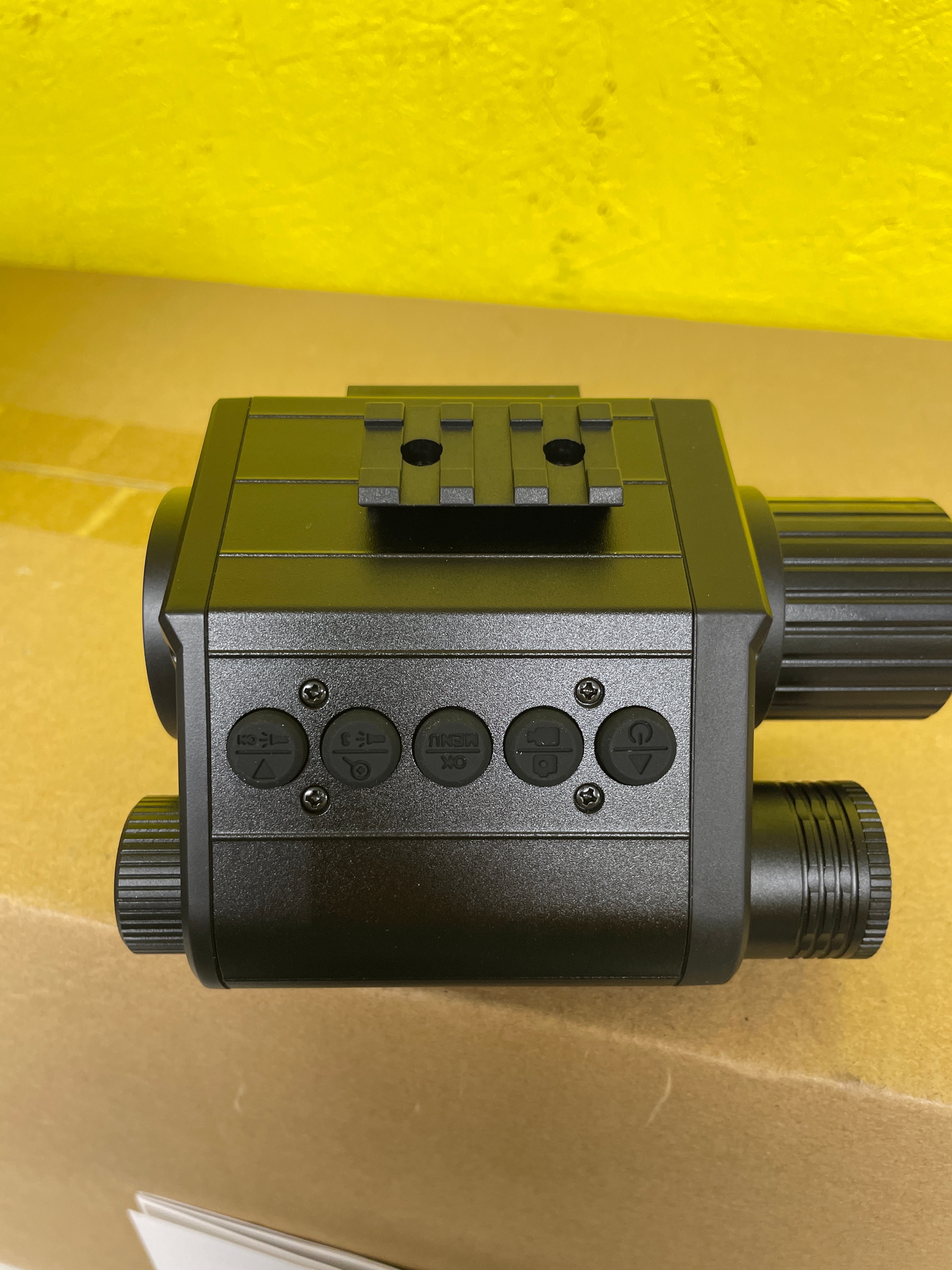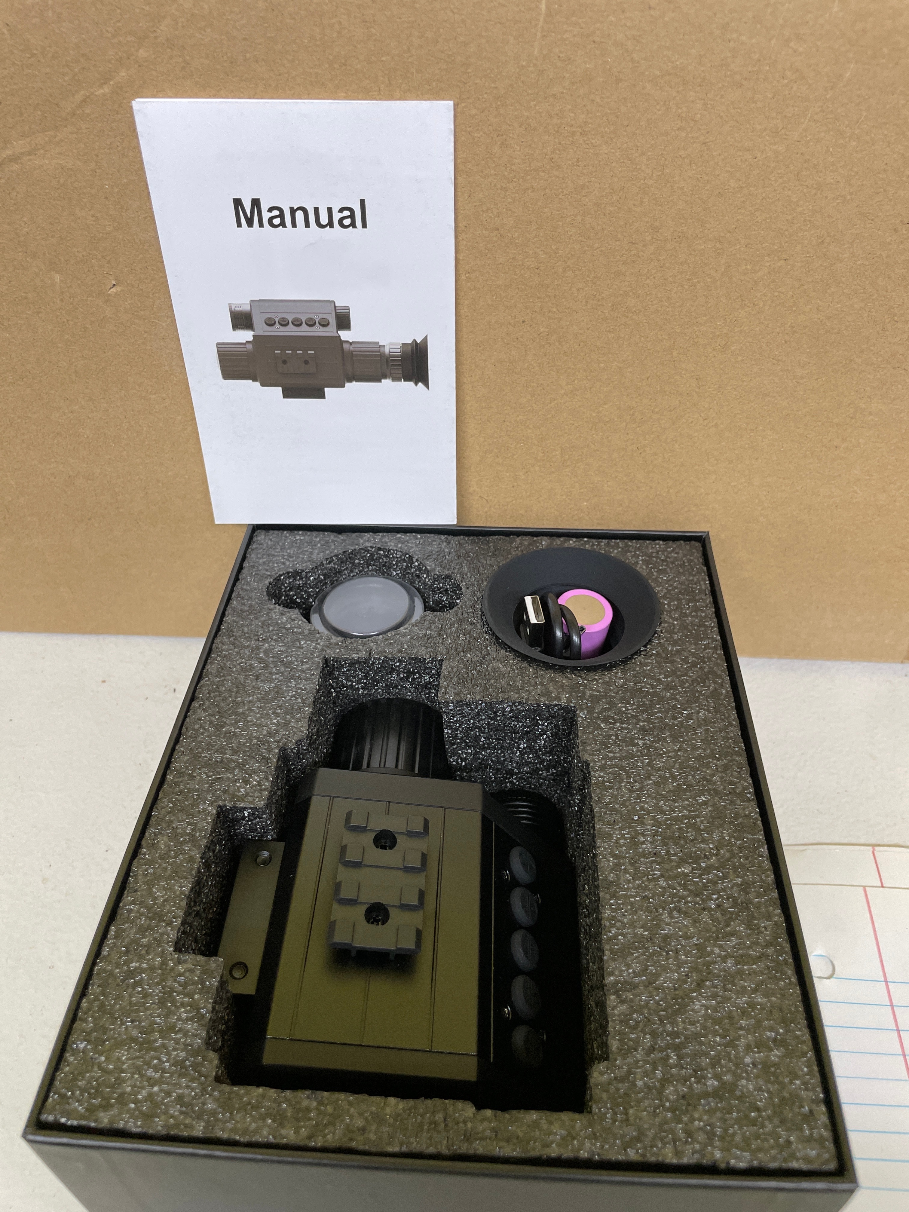 A STURDeCam21 digital night vision monocular, constructed primarily from black matte plastic and metal. It features a main objective lens, a smaller auxiliary lens, an adjustable eyepiece, and a Picatinny/Weaver style rail mount on the top. Control is facilitated by five push-buttons on the side, bearing universal symbols for brightness adjustment, menu, infrared (IR) level, reticle, and power. The device is housed in a custom foam-lined box, accompanied by a “Manual” which includes a “Product Overview” illustrating features such as a Type-C USB port, objective lens focusing wheel, and detailing specifications like an 850nm IR illuminator and 1920×1080 video resolution. Accessories include a pink 18650-type battery, a USB-A to USB-C cable, a small Allen key, a rubber eyecup, and a threaded lens extension/adapter.