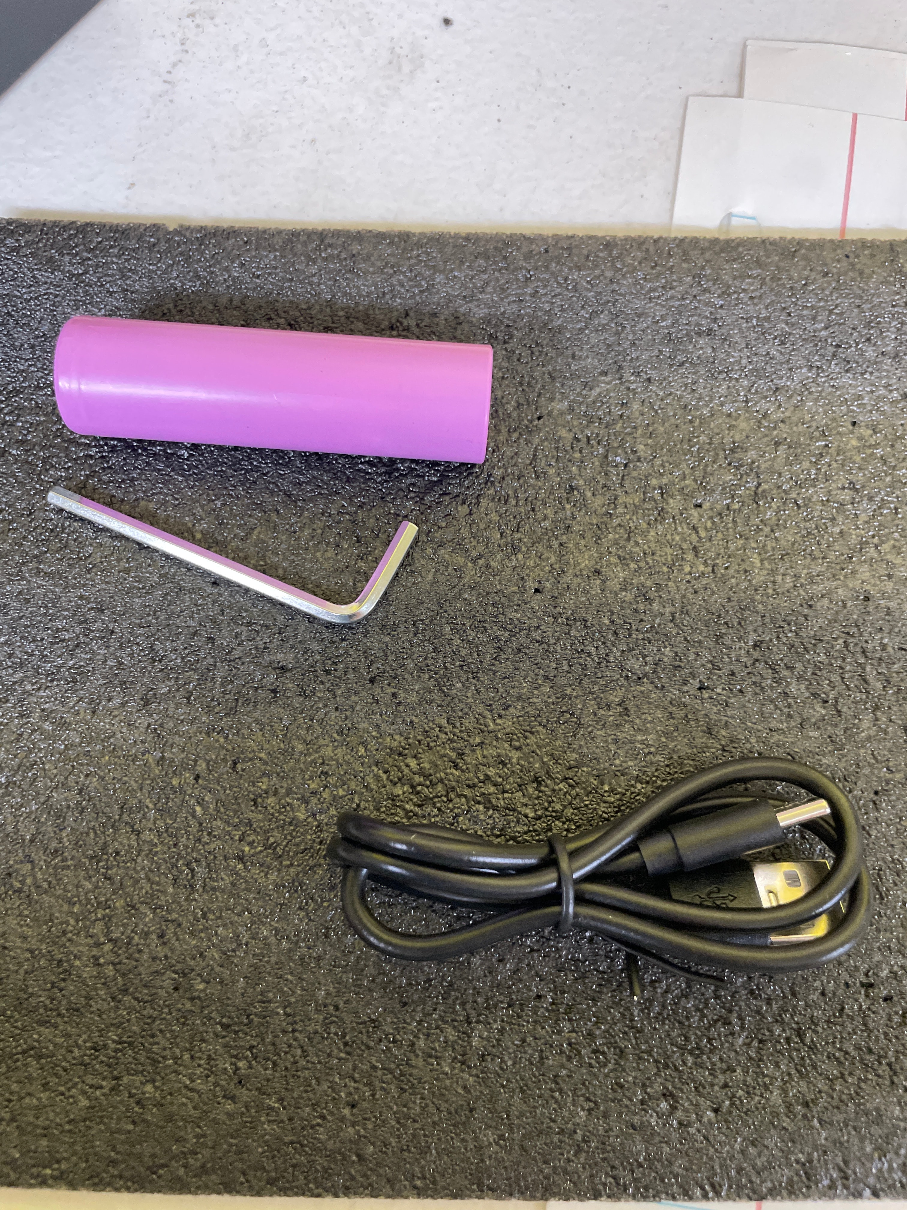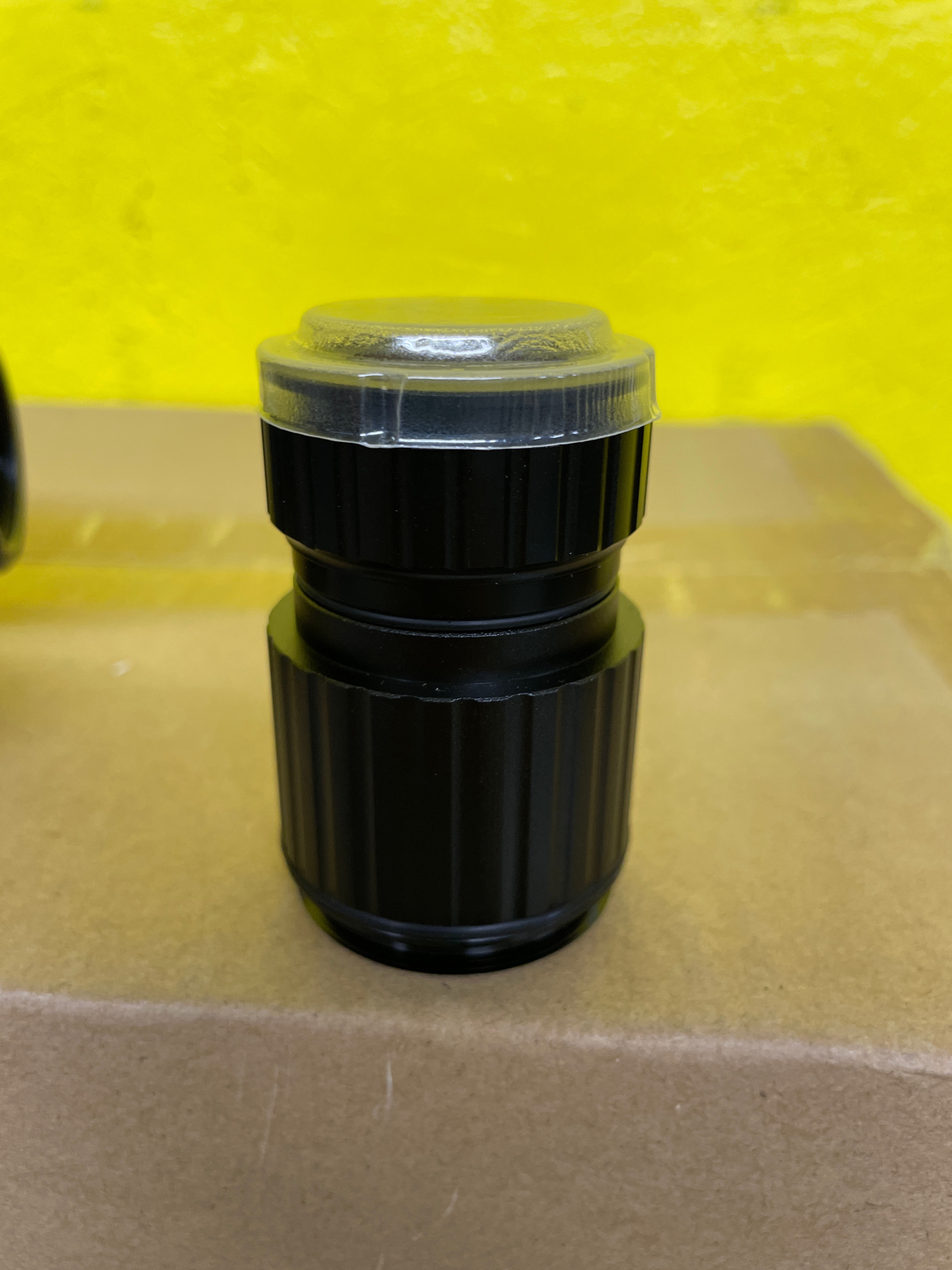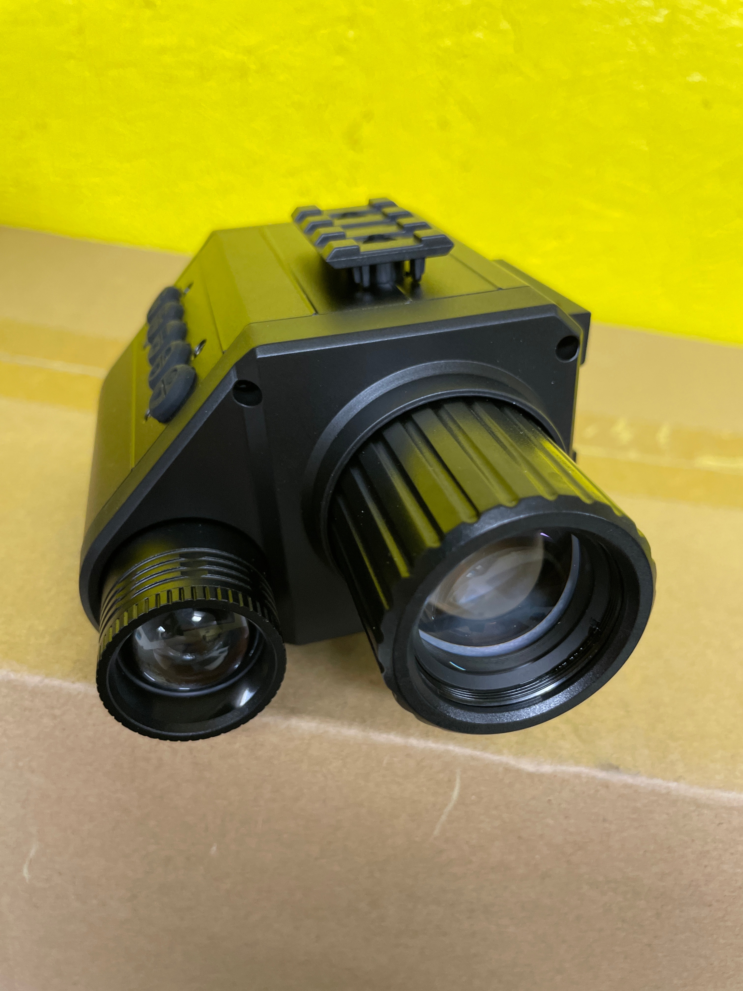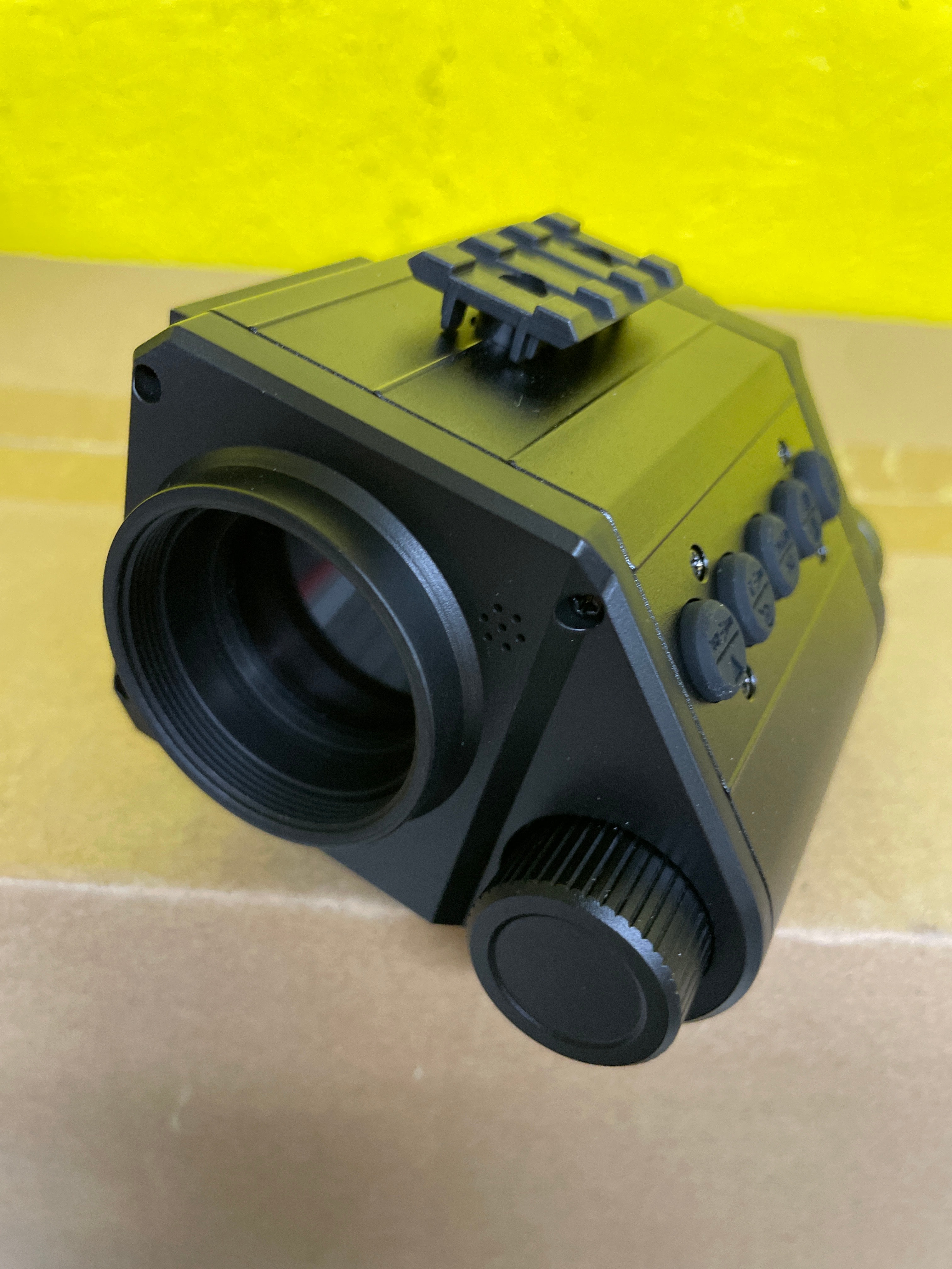 A STURDeCam21 digital night vision monocular, constructed primarily from black matte plastic and metal. It features a main objective lens, a smaller auxiliary lens, an adjustable eyepiece, and a Picatinny/Weaver style rail mount on the top. Control is facilitated by five push-buttons on the side, bearing universal symbols for brightness adjustment, menu, infrared (IR) level, reticle, and power. The device is housed in a custom foam-lined box, accompanied by a “Manual” which includes a “Product Overview” illustrating features such as a Type-C USB port, objective lens focusing wheel, and detailing specifications like an 850nm IR illuminator and 1920×1080 video resolution. Accessories include a pink 18650-type battery, a USB-A to USB-C cable, a small Allen key, a rubber eyecup, and a threaded lens extension/adapter.