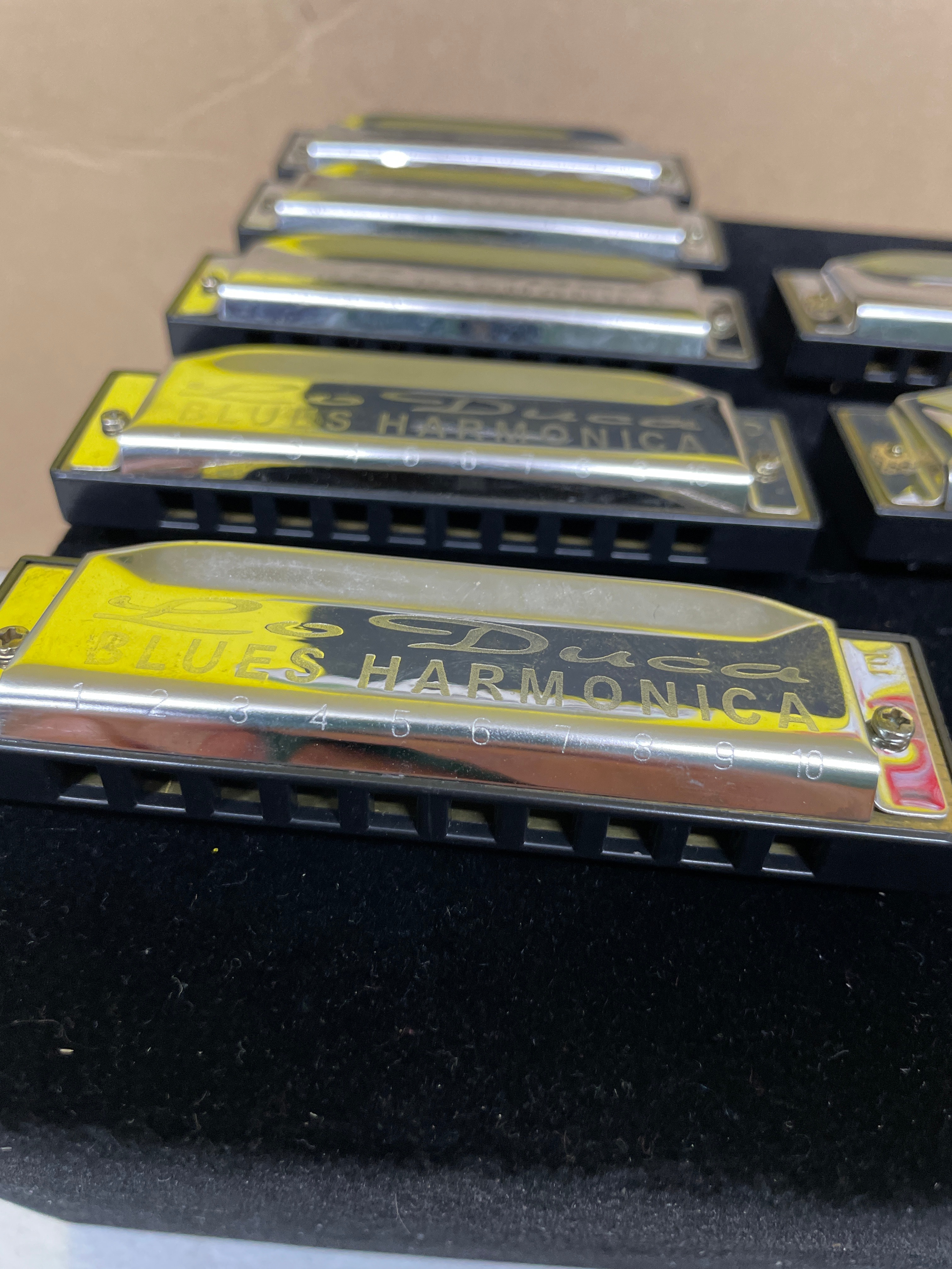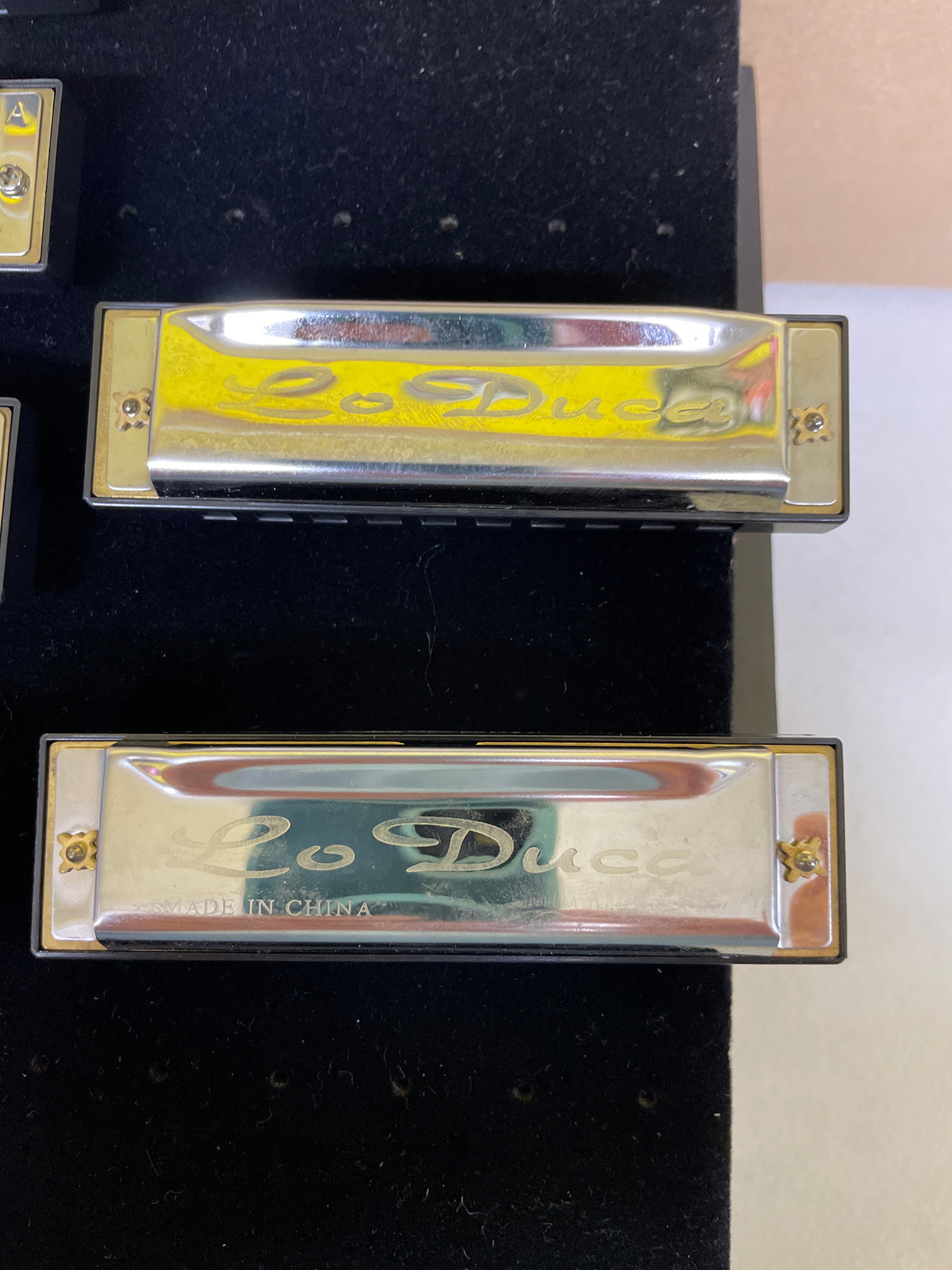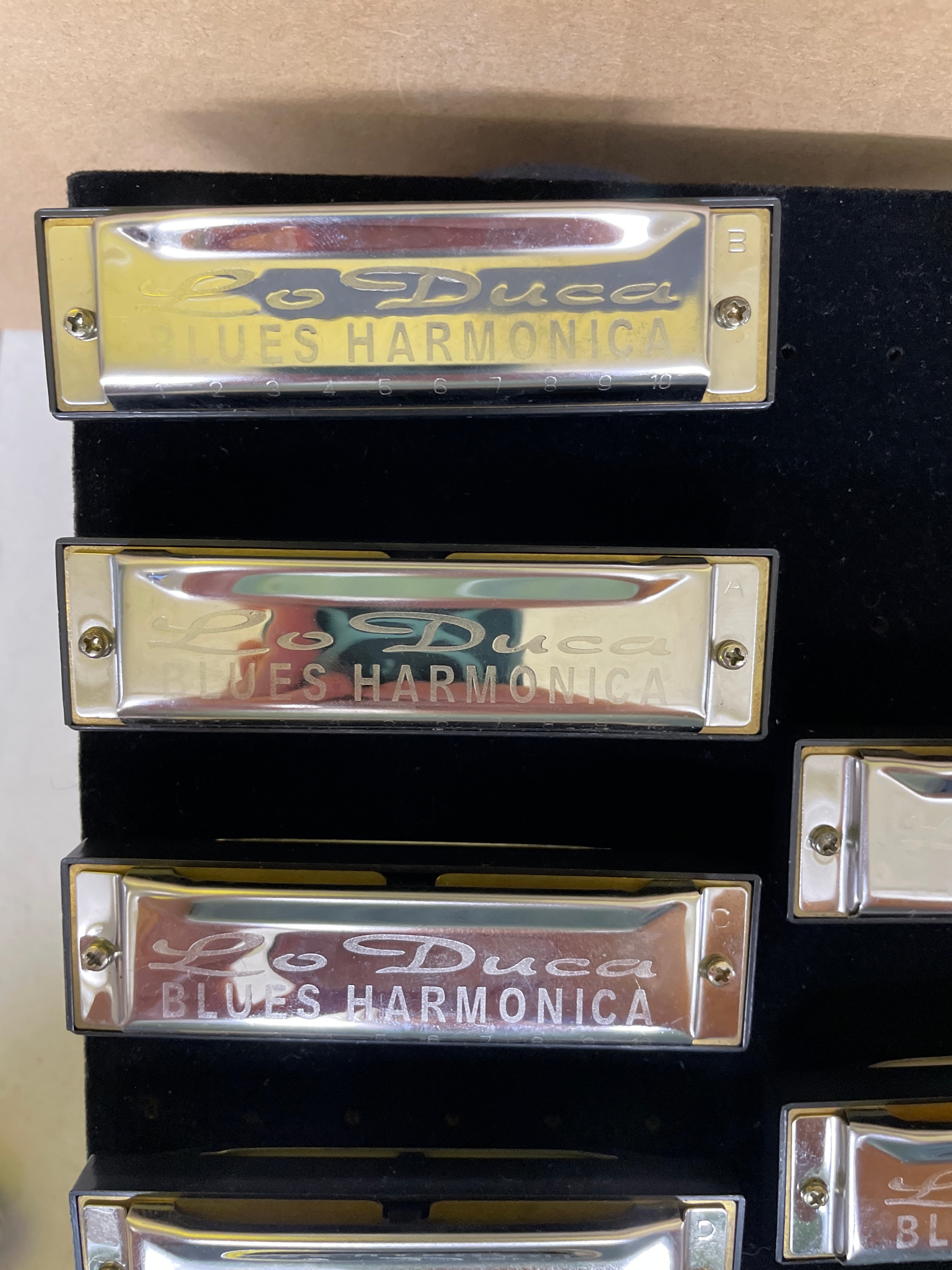 A set of twelve Lo Duca ‘Blues Harmonica’ diatonic harmonicas, housed within a black zippered, fabric-covered hard case featuring a fitted interior. Each harmonica consists of polished silver-tone metal cover plates over black plastic combs, consistently marked “Lo Duca BLUES HARMONICA” with visible hole numbers (1-10). Individual key designations include C, D, E, F, G, A, and B. At least one harmonica is explicitly marked “MADE IN CHINA.”