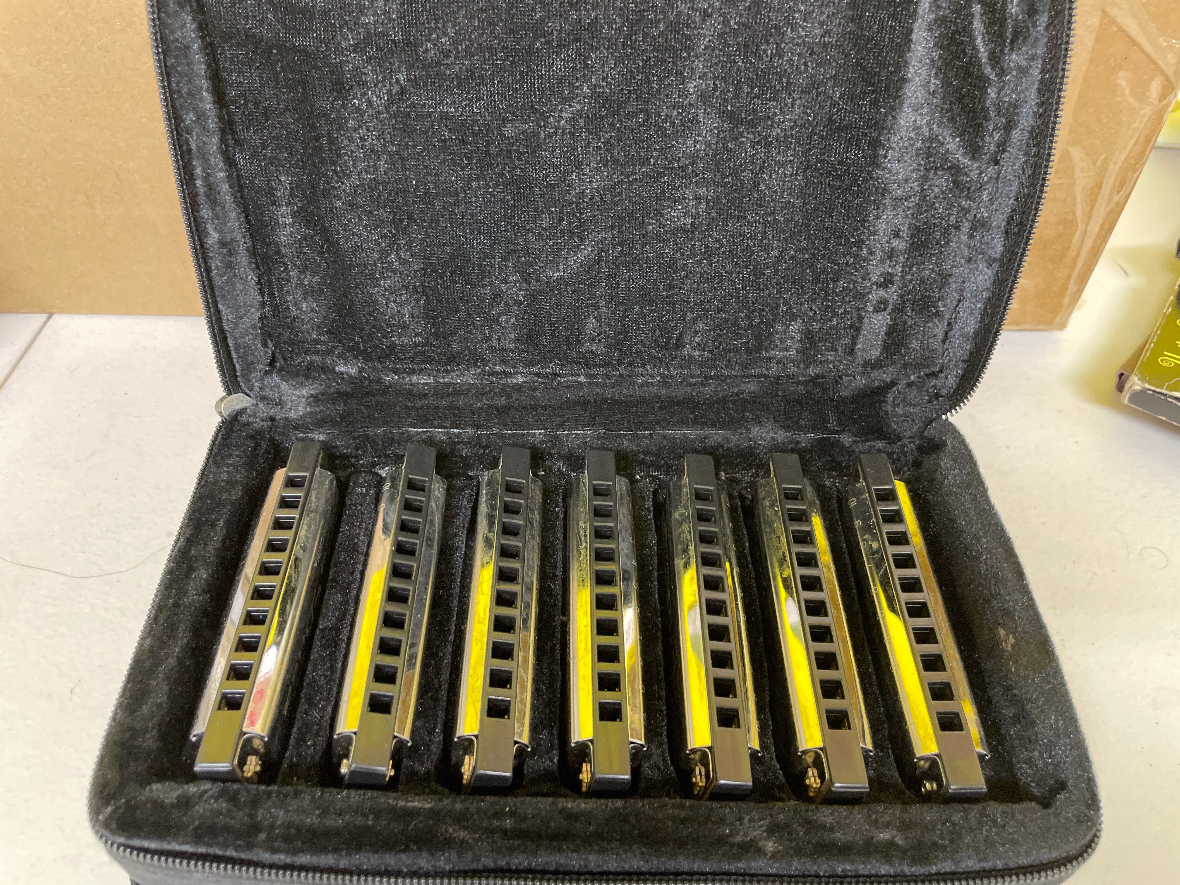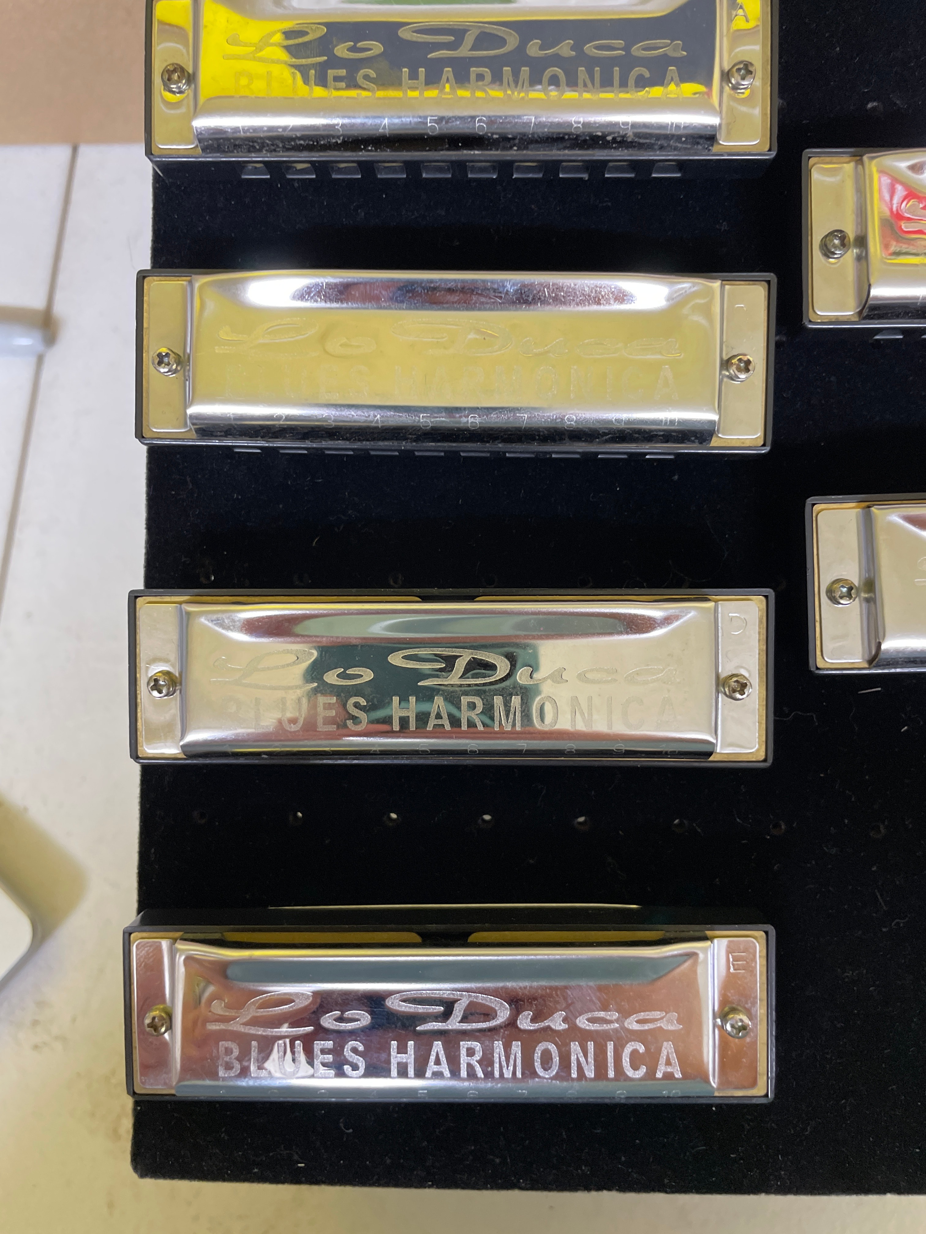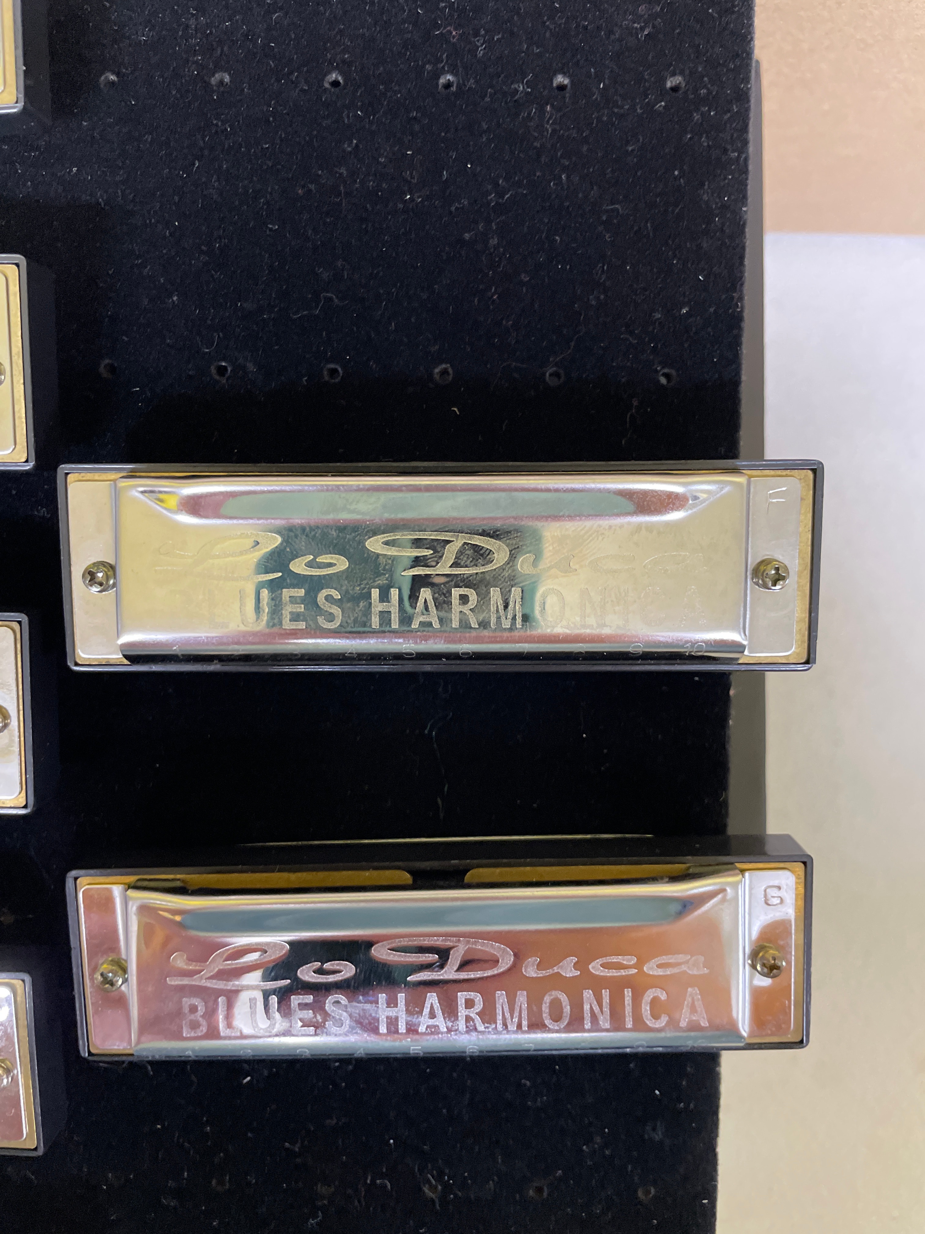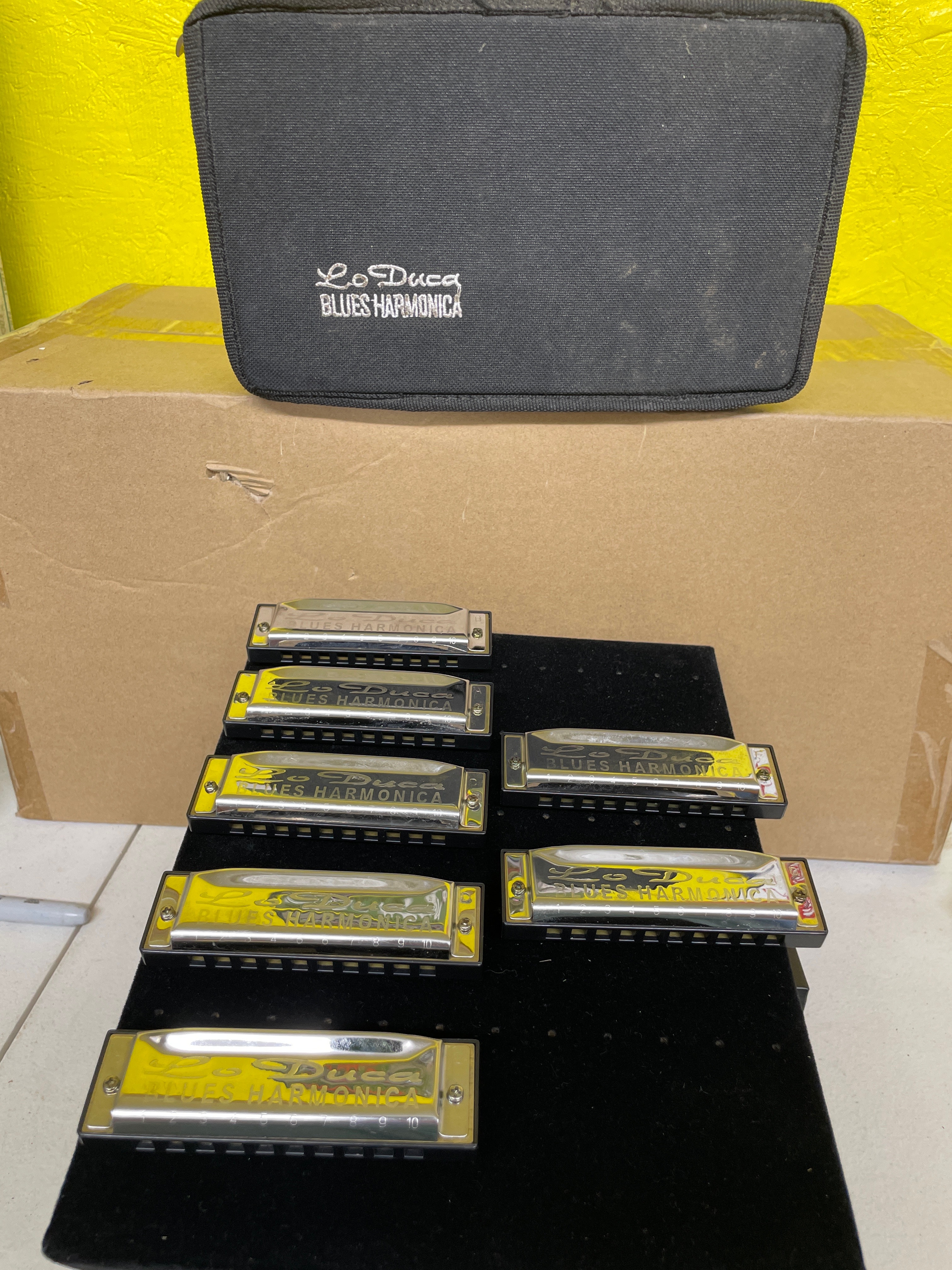 A set of twelve Lo Duca ‘Blues Harmonica’ diatonic harmonicas, housed within a black zippered, fabric-covered hard case featuring a fitted interior. Each harmonica consists of polished silver-tone metal cover plates over black plastic combs, consistently marked “Lo Duca BLUES HARMONICA” with visible hole numbers (1-10). Individual key designations include C, D, E, F, G, A, and B. At least one harmonica is explicitly marked “MADE IN CHINA.”