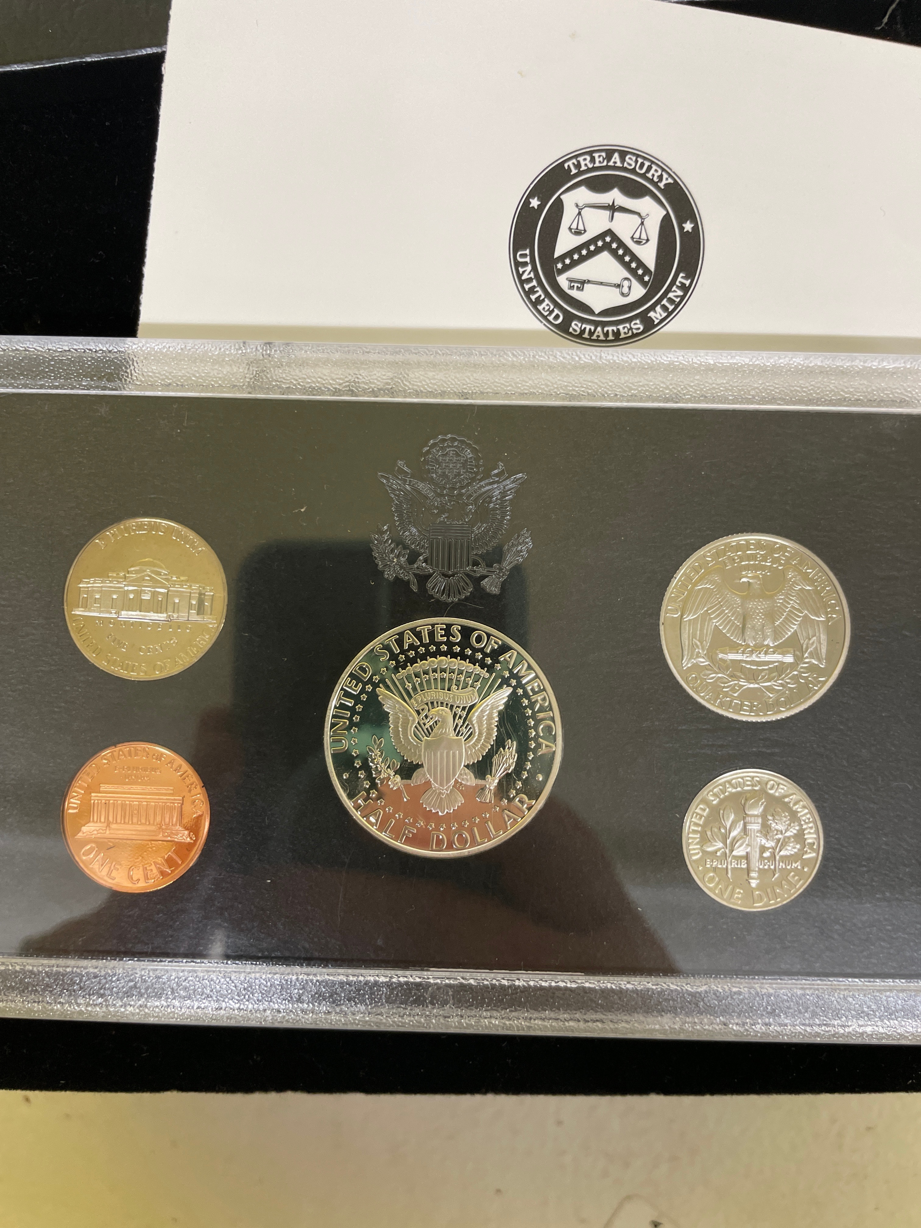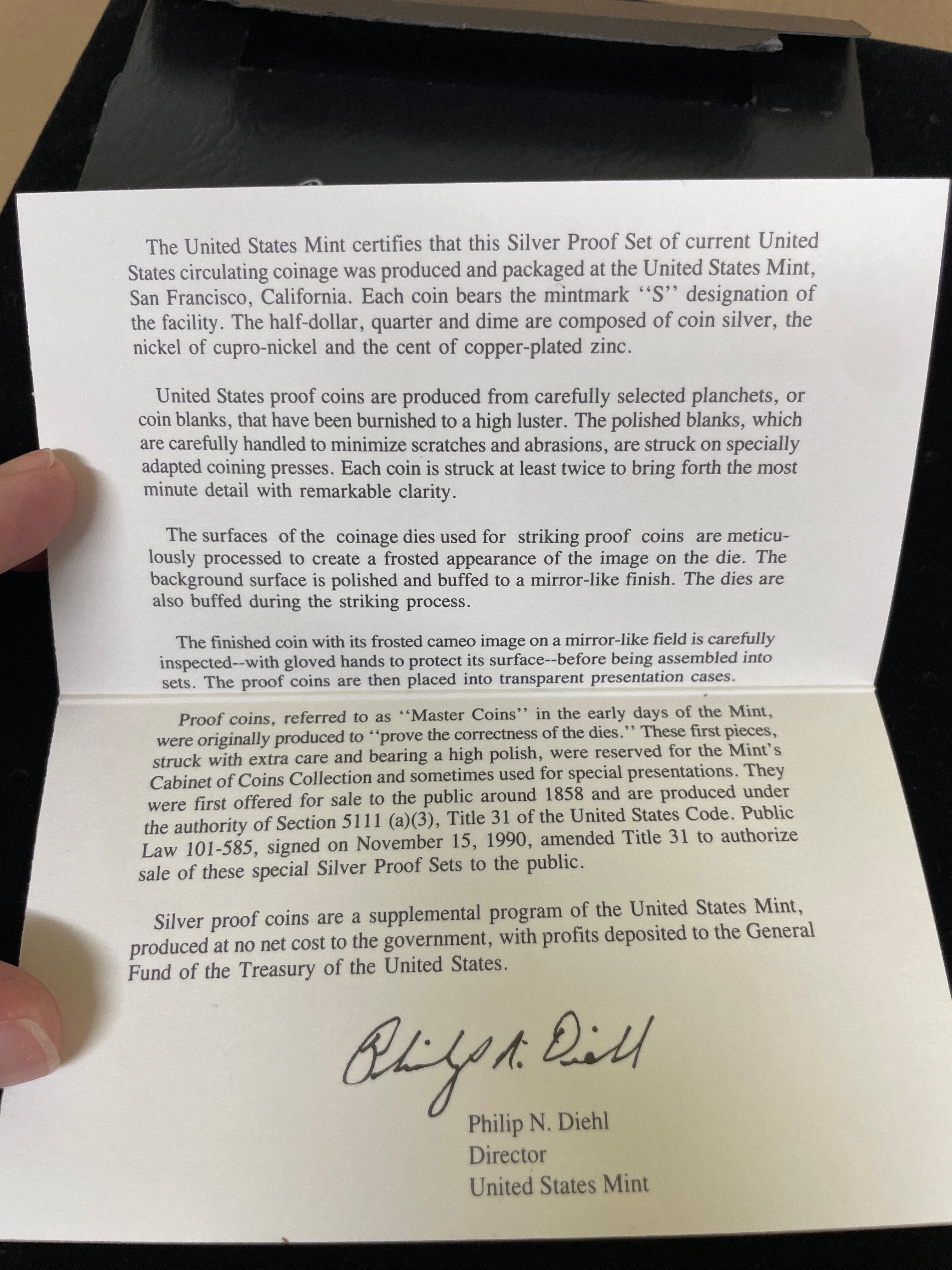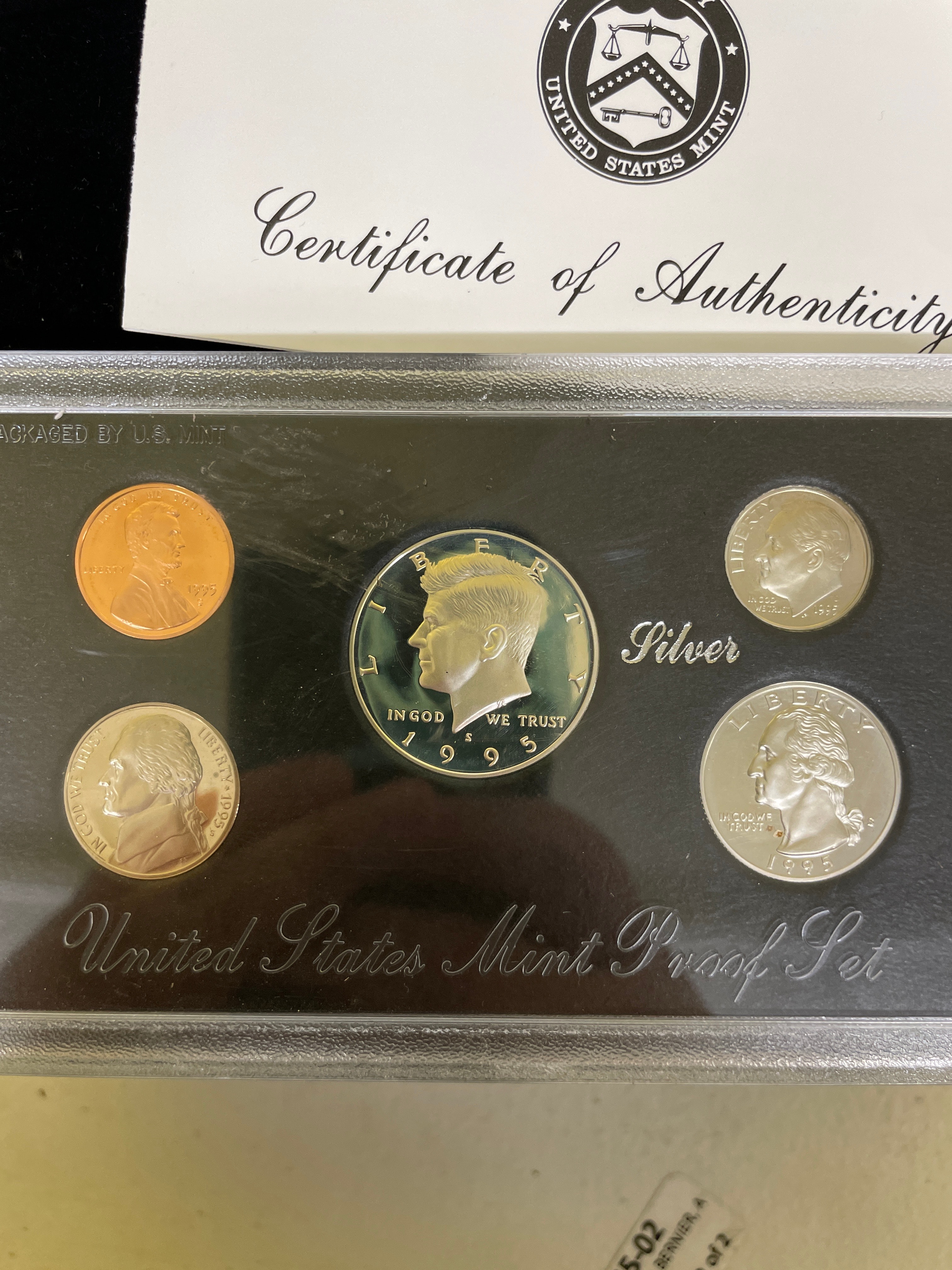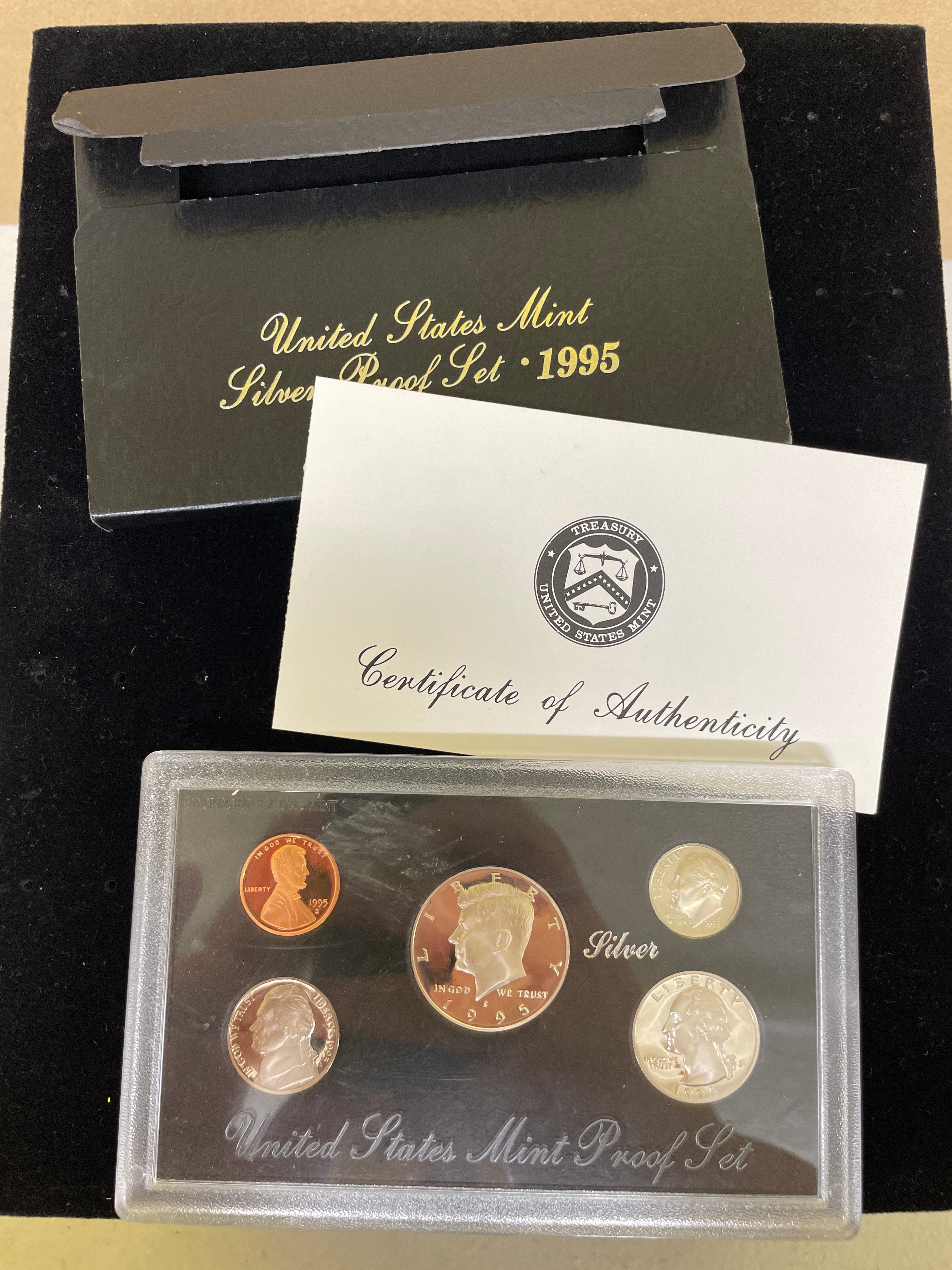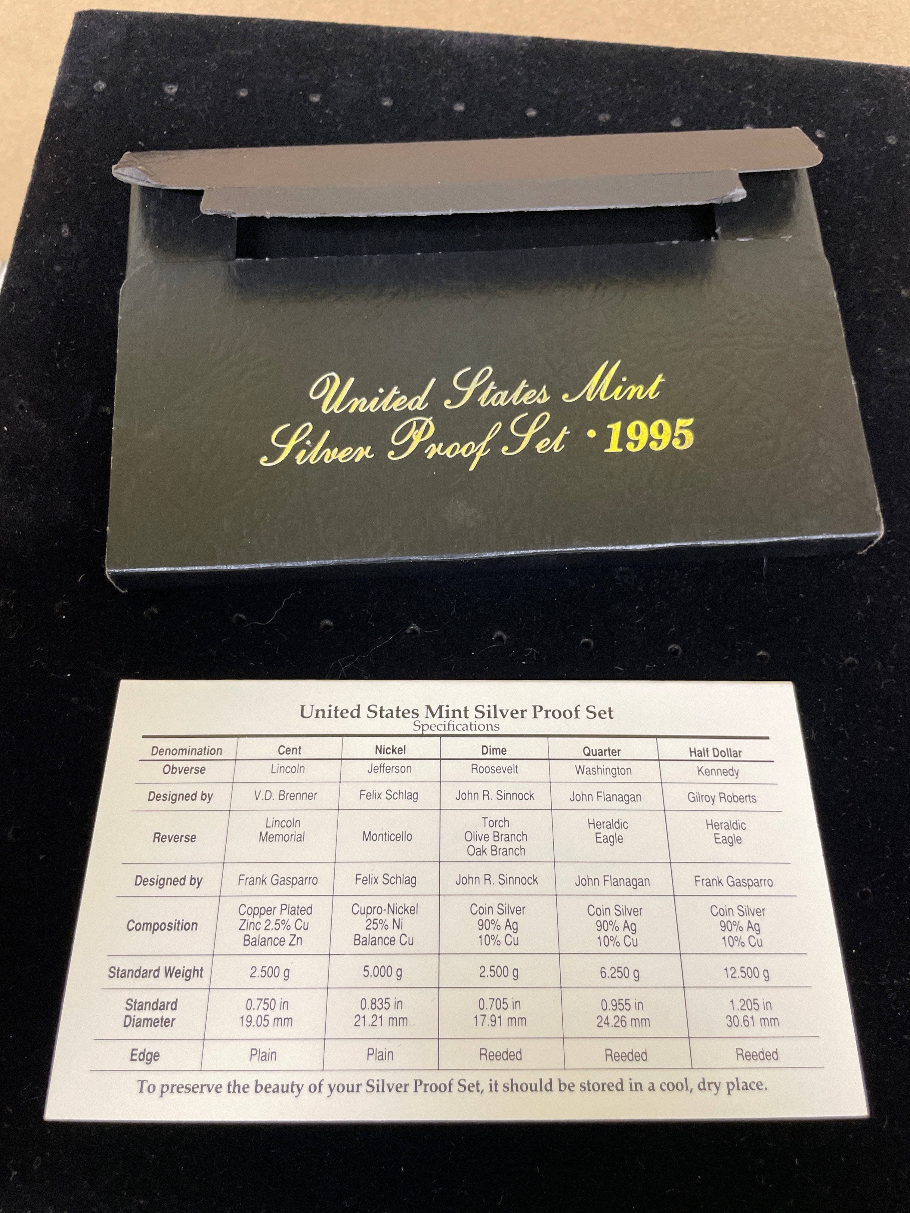 A 1995 United States Mint Silver Proof Set, presented in its original black velvet-lined outer box with gold-foil text reading “United States Mint Silver Proof Set • 1995”. The set includes five modern US circulating coin denominations – a Lincoln cent, Jefferson nickel, Roosevelt dime, Washington quarter, and Kennedy half dollar – all dated “1995.” These coins are encapsulated within a clear, sealed plastic display case against a black background. An accompanying “Certificate of Authenticity” from the United States Mint confirms the dime, quarter, and half dollar are composed of 90% silver, while the cent is copper-plated zinc and the nickel is cupro-nickel. The coins exhibit a distinct proof finish with highly reflective fields and frosted devices, and were produced at the San Francisco Mint.