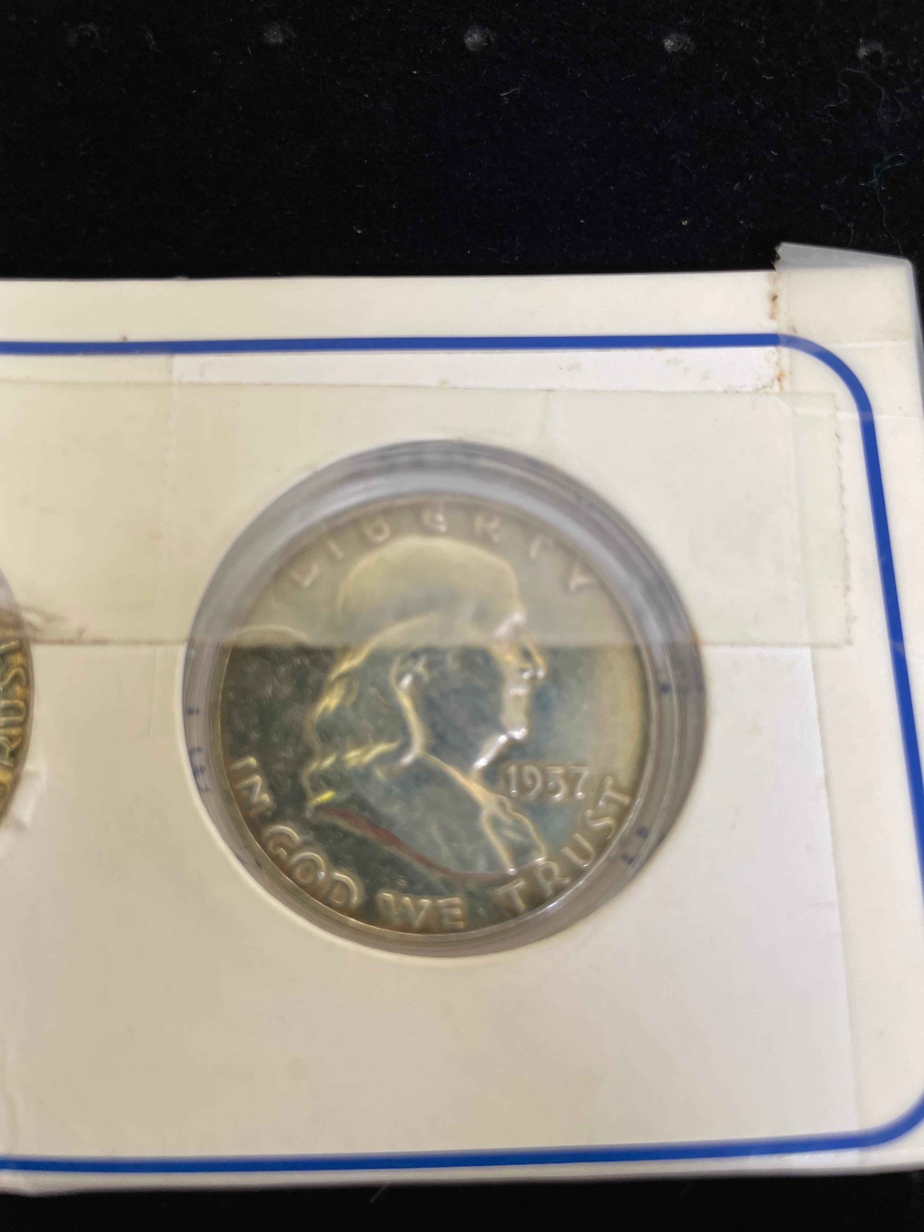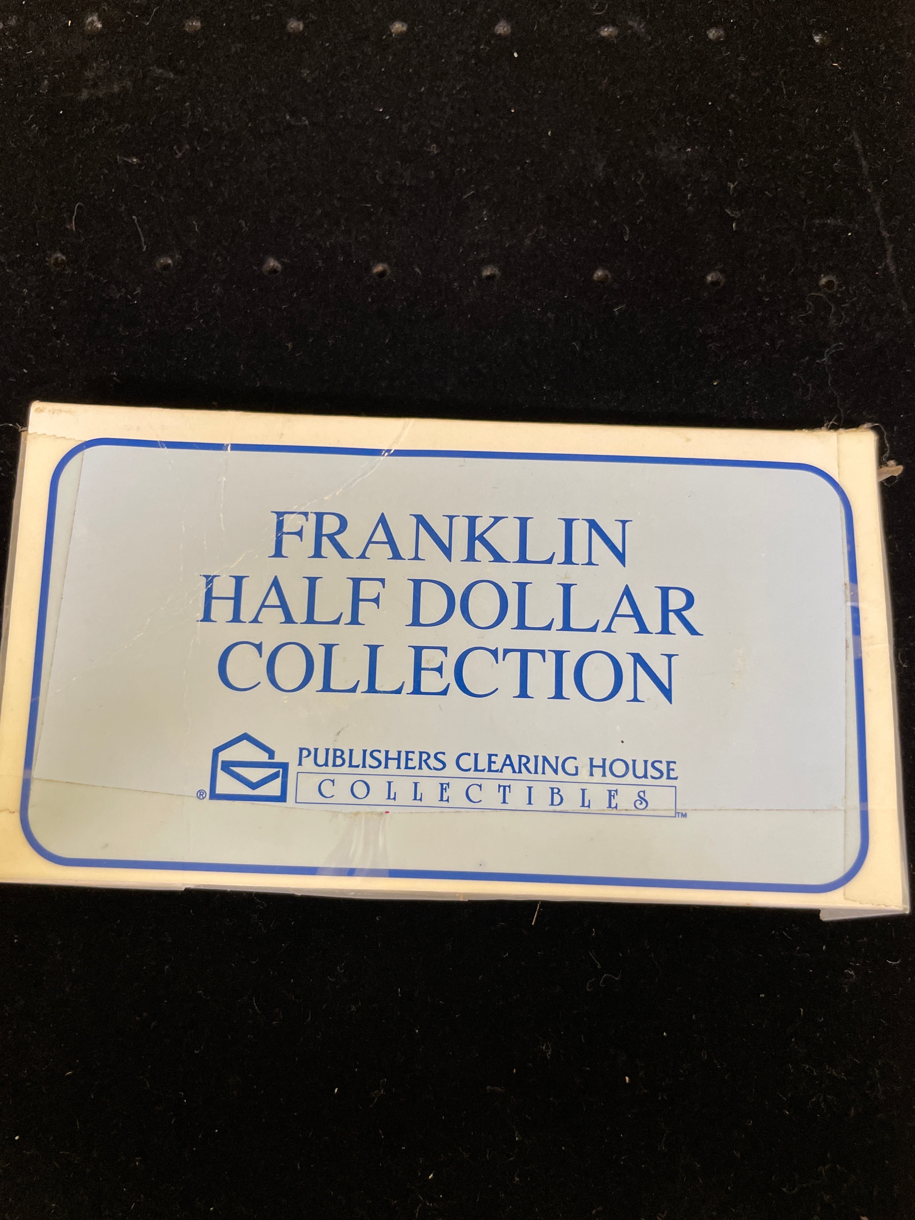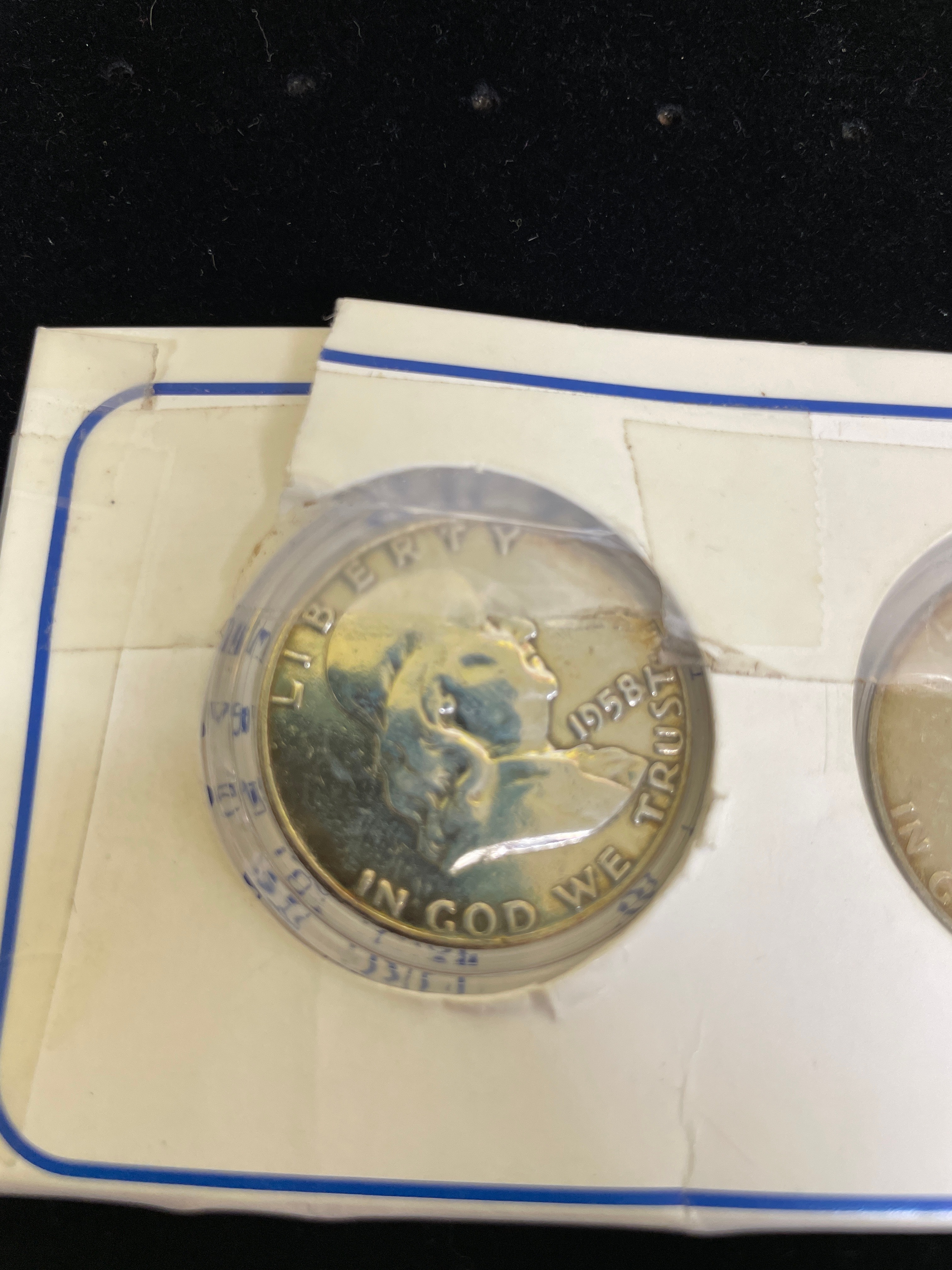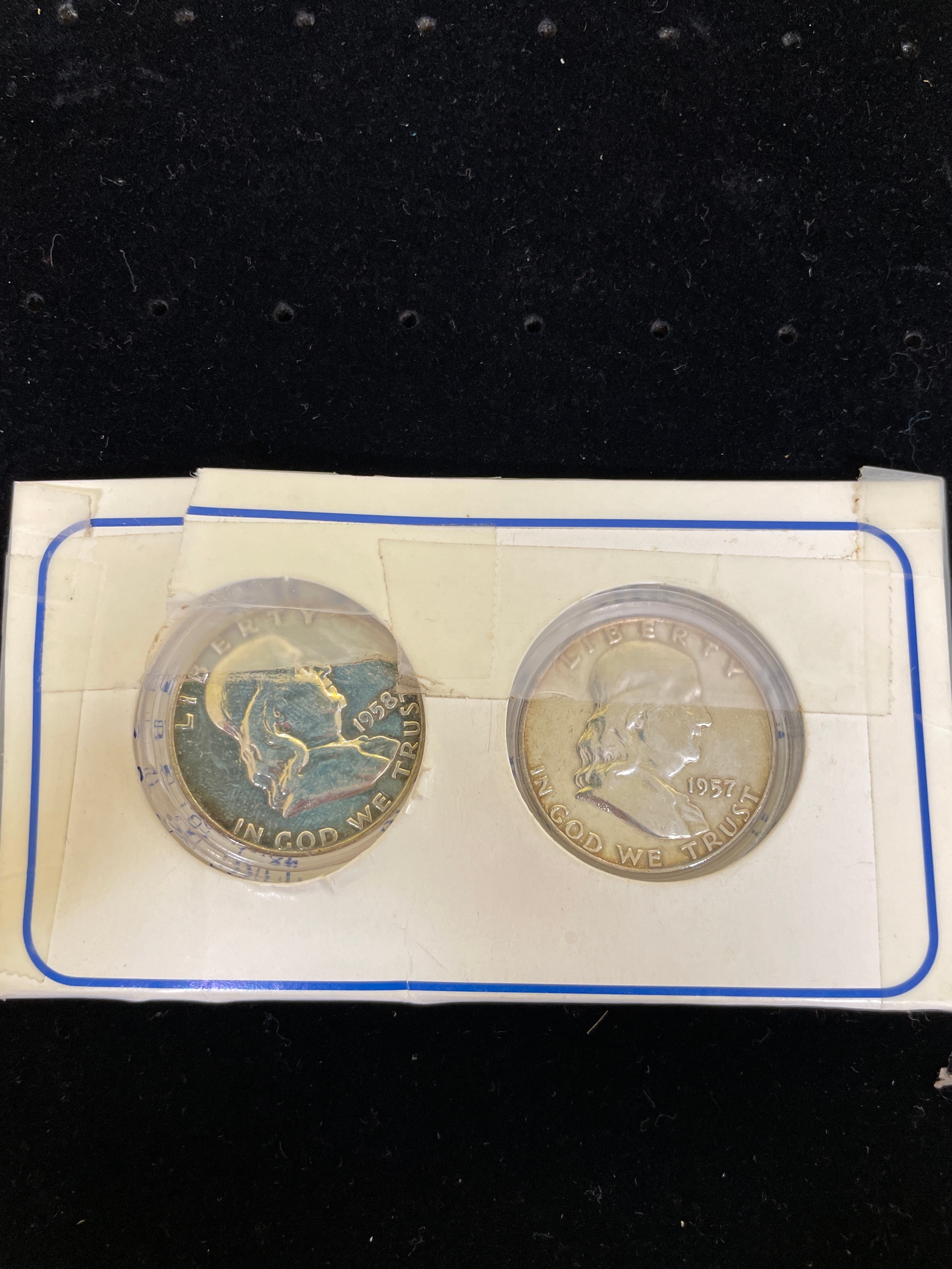 A two-piece United States coin collection featuring Franklin Half Dollars, dated 1957 and 1958. Both silver-colored coins prominently display a left-facing bust of Benjamin Franklin, encircled by the inscriptions “LIBERTY” at the top and “IN GOD WE TRUST” at the bottom, with their specific dates to the right of the bust. Each coin is individually encapsulated in clear plastic and set within a folded cardboard holder, sealed under a larger plastic overlay. The reverse of the holder is marked “FRANKLIN HALF DOLLAR COLLECTION” and features the “PUBLISHERS CLEARING HOUSE COLLECTIBLES®” logo.