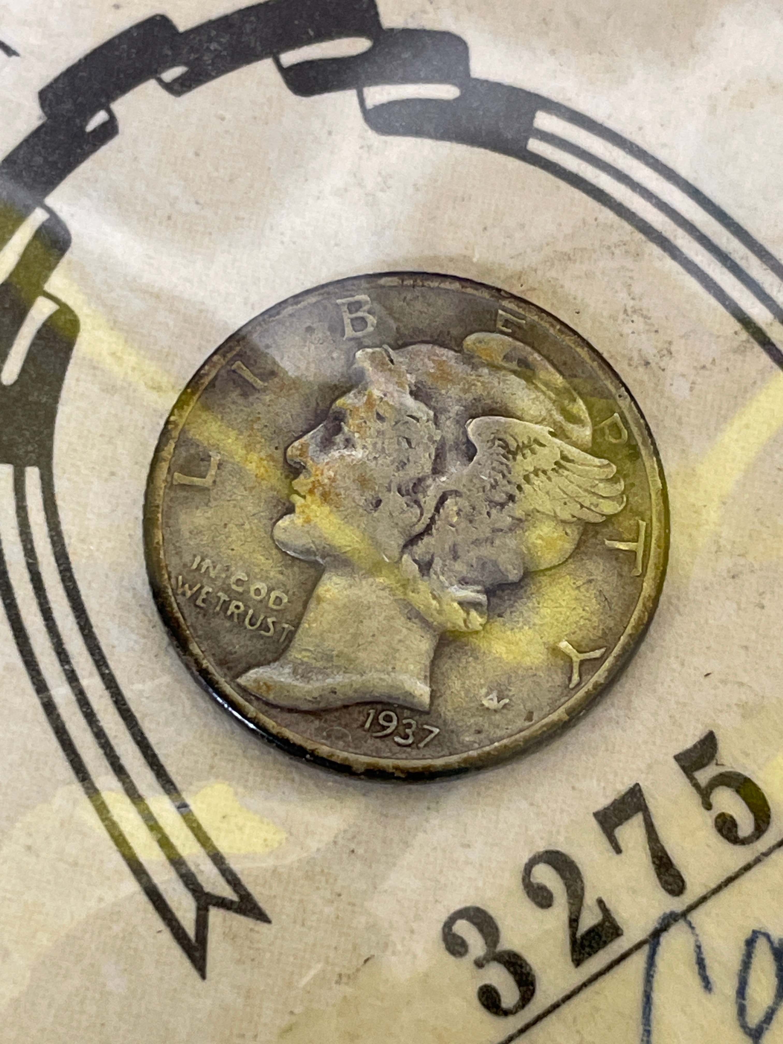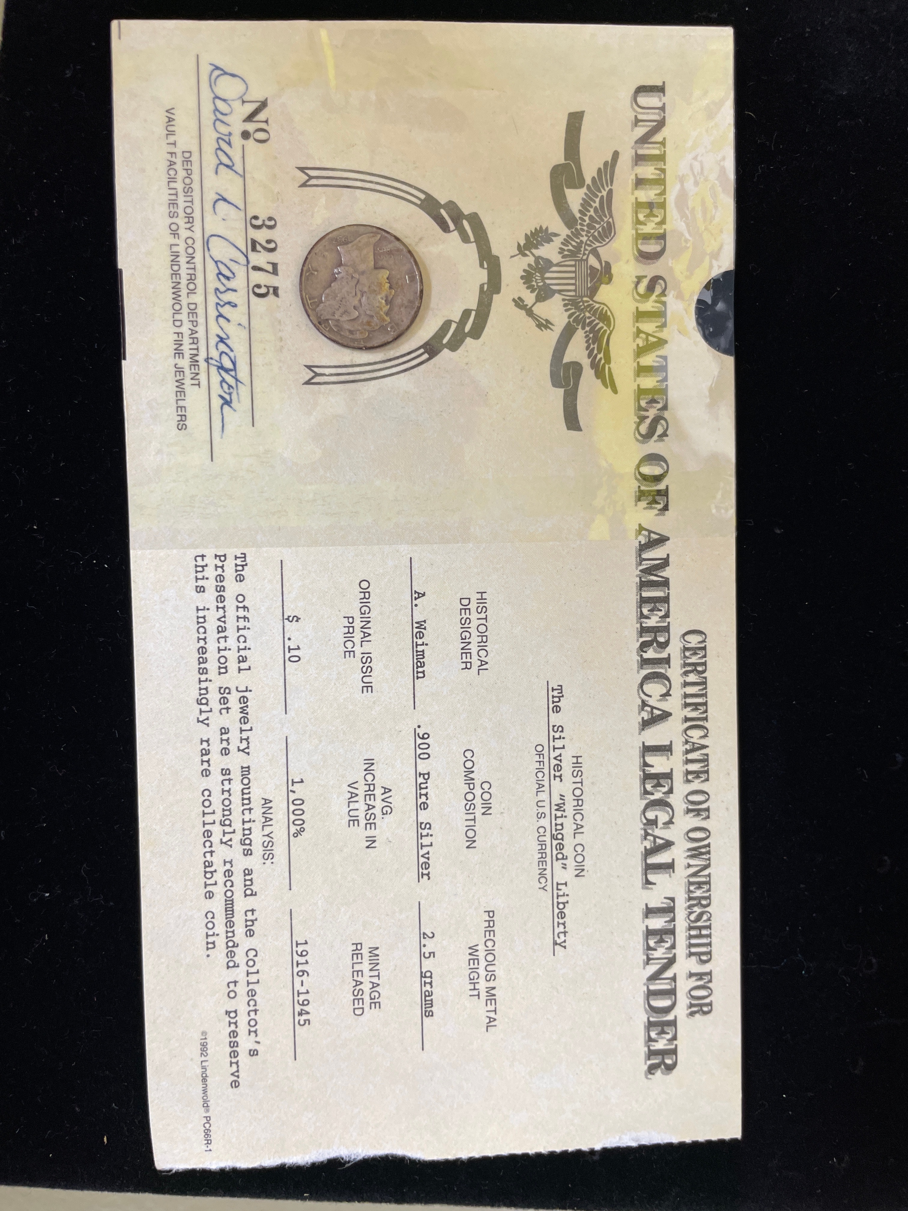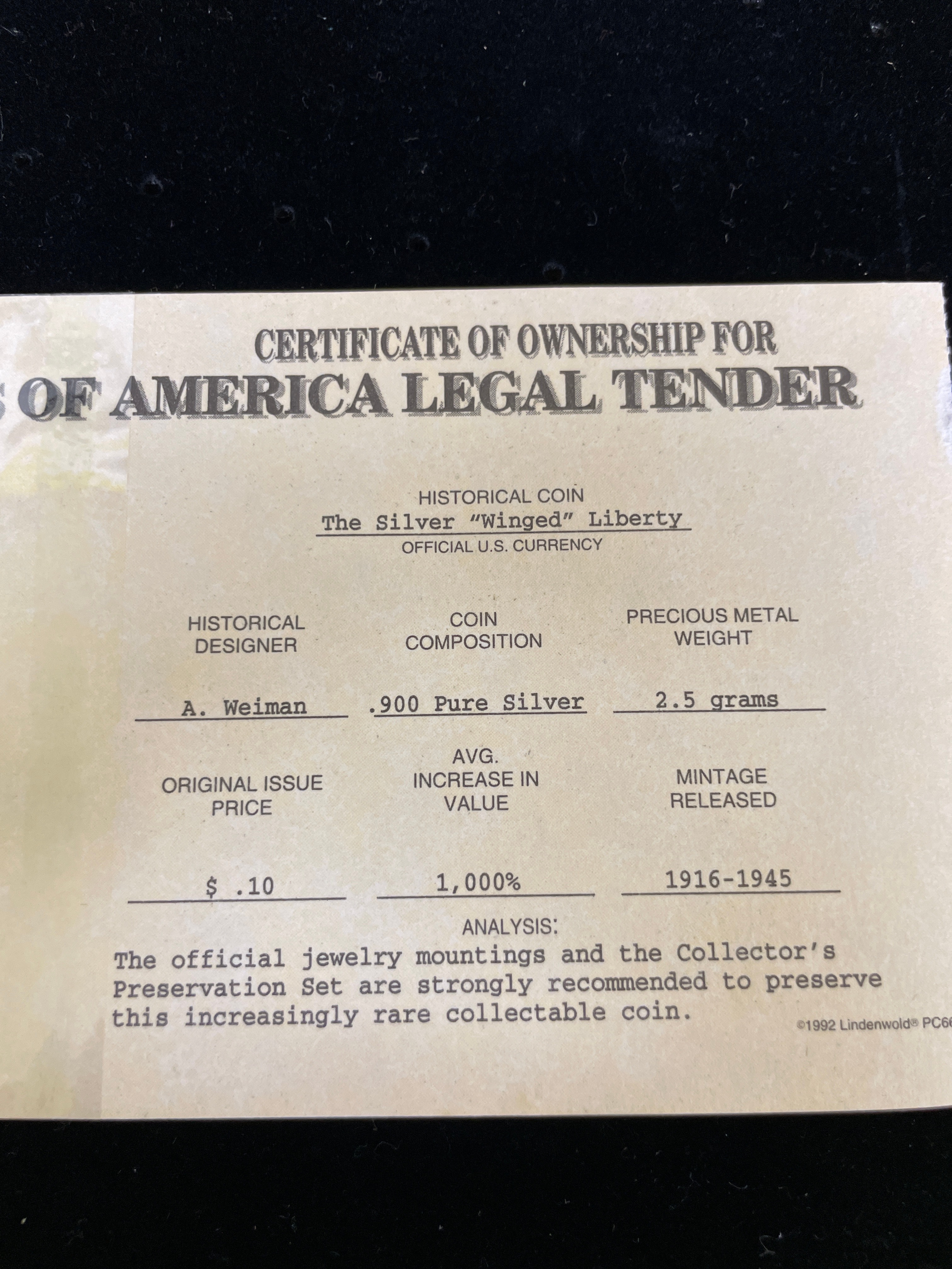 A 1937 United States "Winged Liberty" (Mercury) Dime, designed by A. Weinman, identified by the designer’s initial "B". The coin is encapsulated within a "Certificate of Ownership" issued by Lindenwold Fine Jewelers, copyrighted 1992. The certificate details the coin as .900 pure silver, with a mintage period of 1916-1945. The certificate features the handwritten name "Carol L Carrington" and the number "3275". The coin is presented within a plastic holder alongside its certificate.