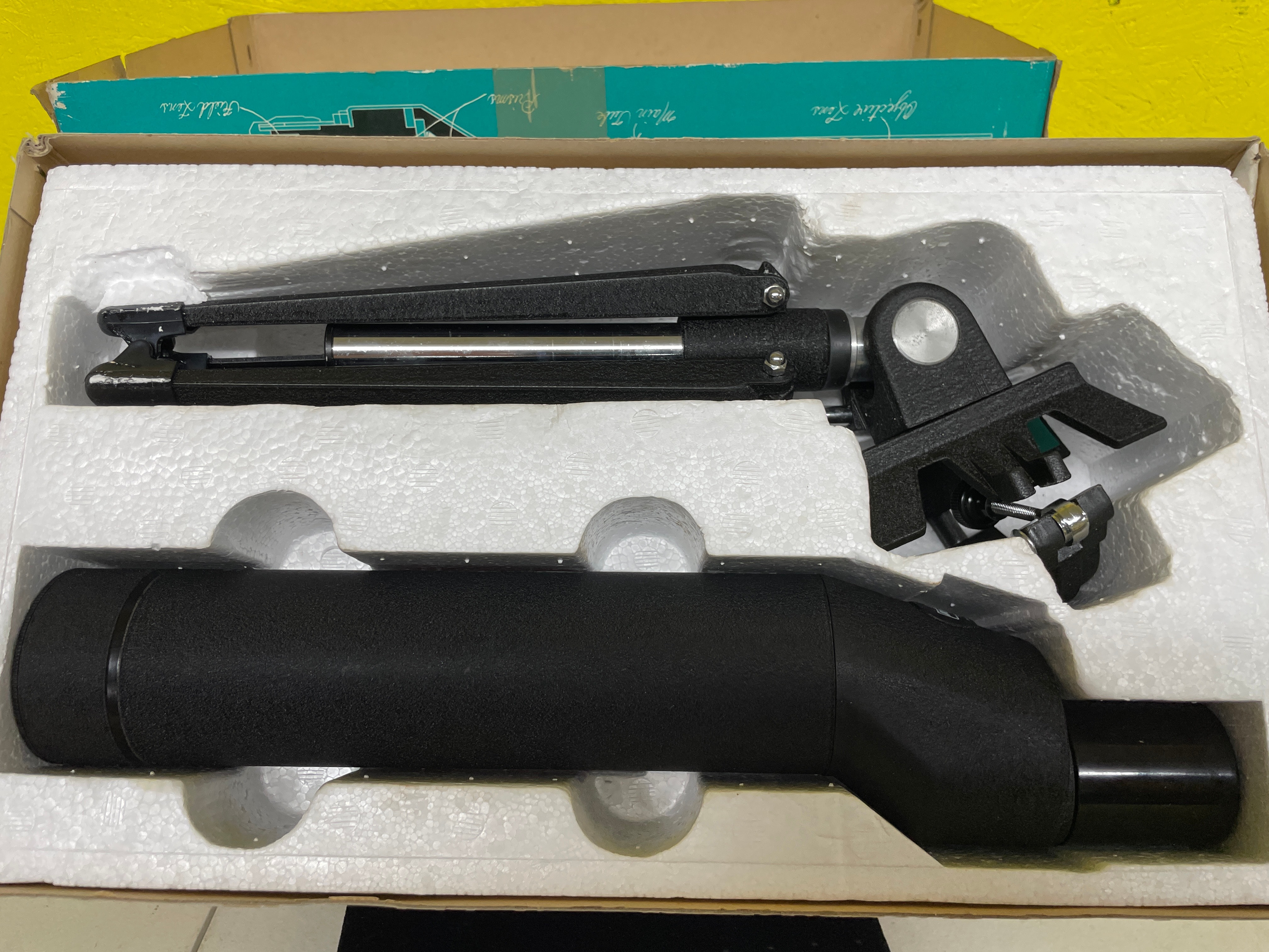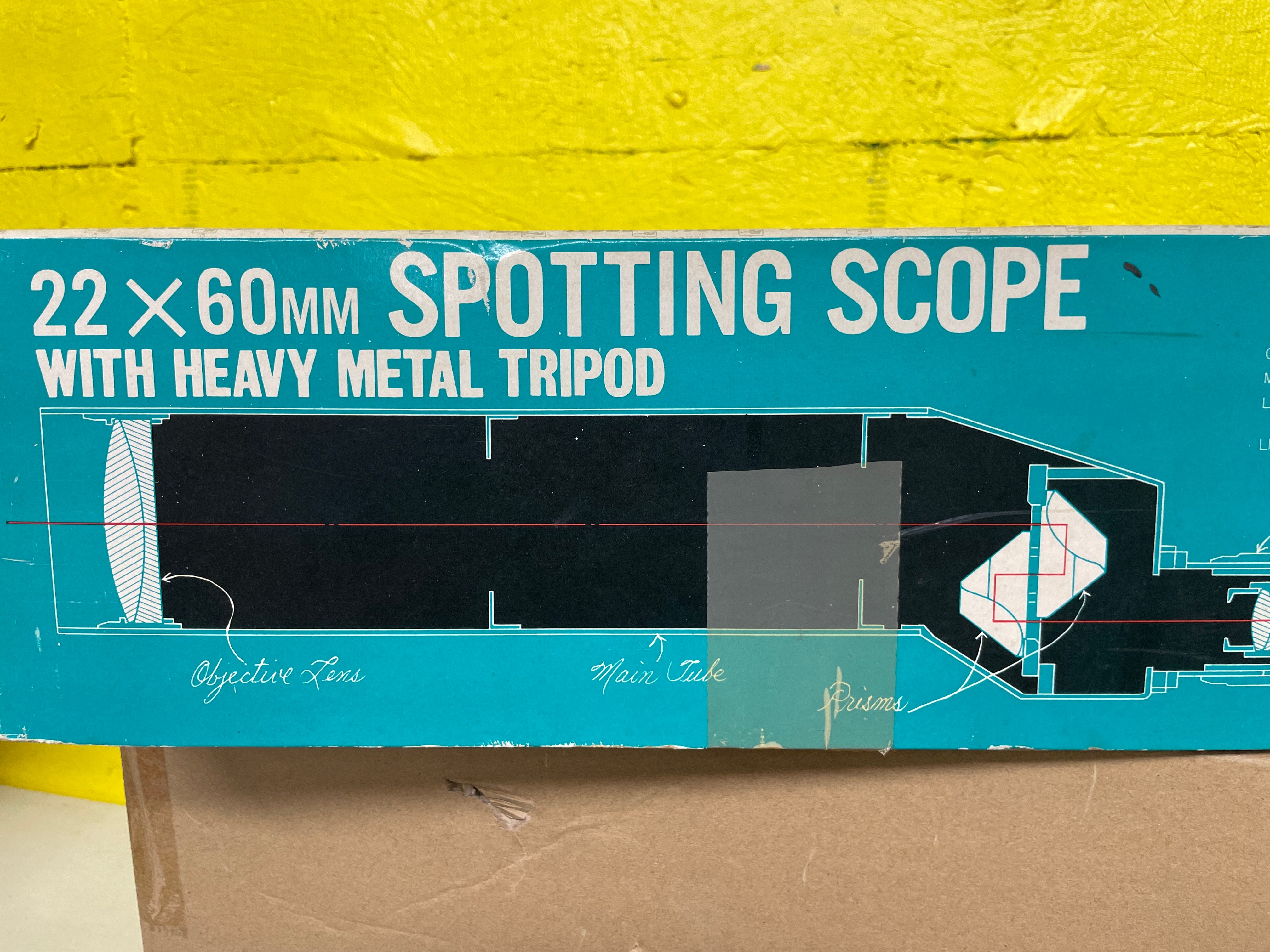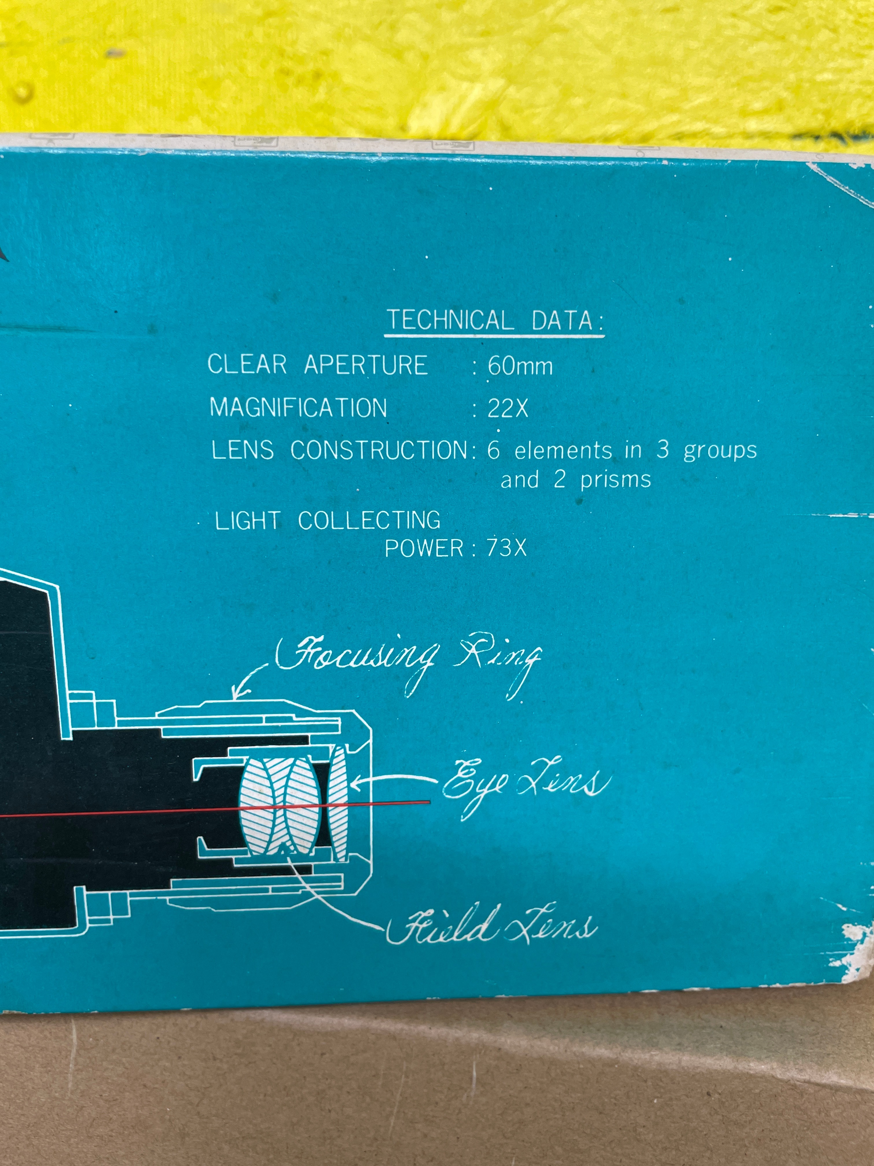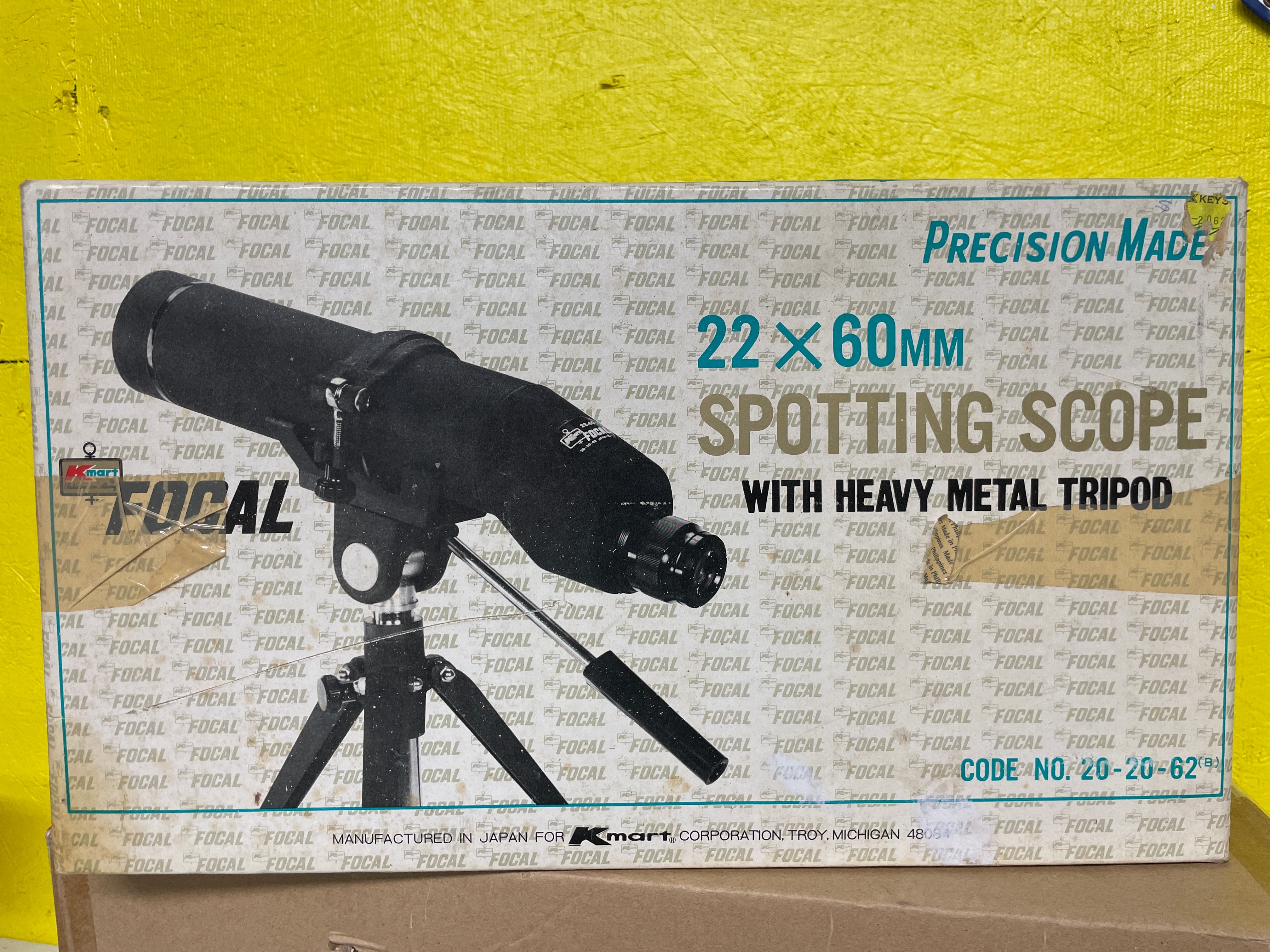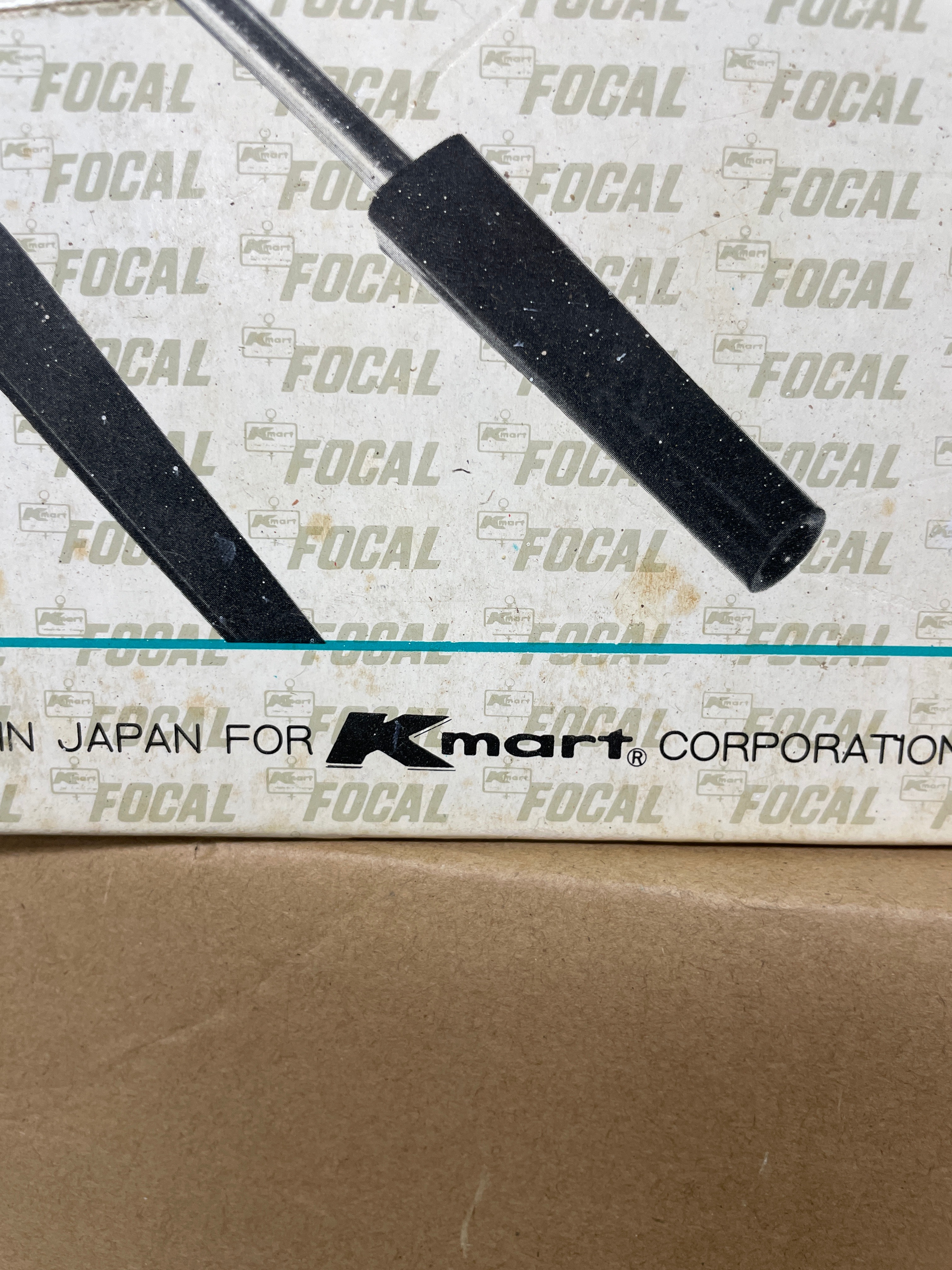 A vintage Focal Kmart 22x60mm spotting scope kit, manufactured in Japan for Kmart Corporation, likely from the mid-to-late 20th century. The kit includes a black-finished spotting scope, possibly metal and/or plastic with a textured body, and a black heavy metal tripod, both nested in original styrofoam inserts. The cardboard box is extensively marked “FOCAL, ” “PRECISION MADE, ” and includes technical data such as “CLEAR APERTURE: 60mm, ” “MAGNIFICATION: 22X, ” and “LIGHT COLLECTING POWER: 73X, ” with “CODE NO: 20-20-62” also visible.