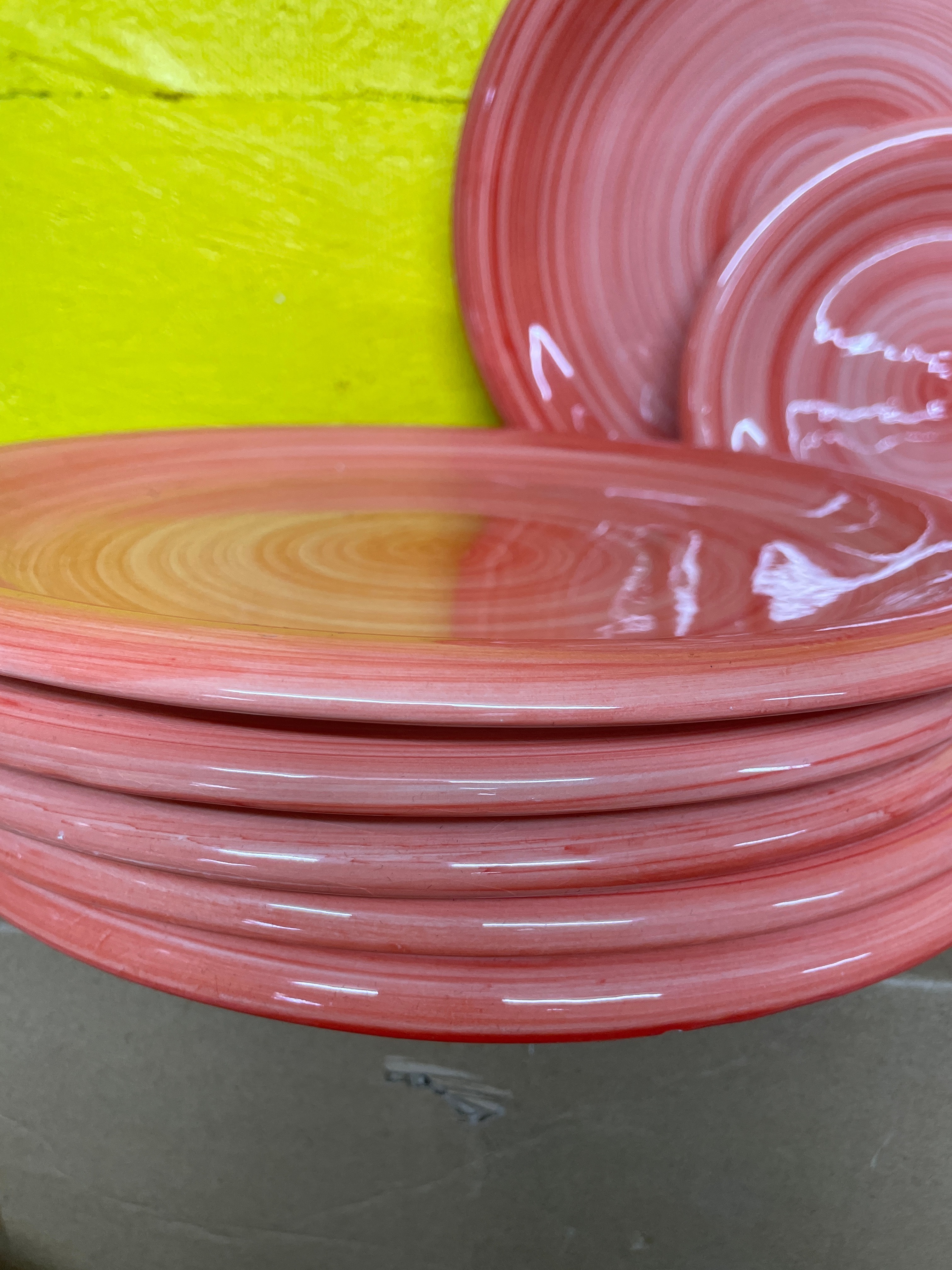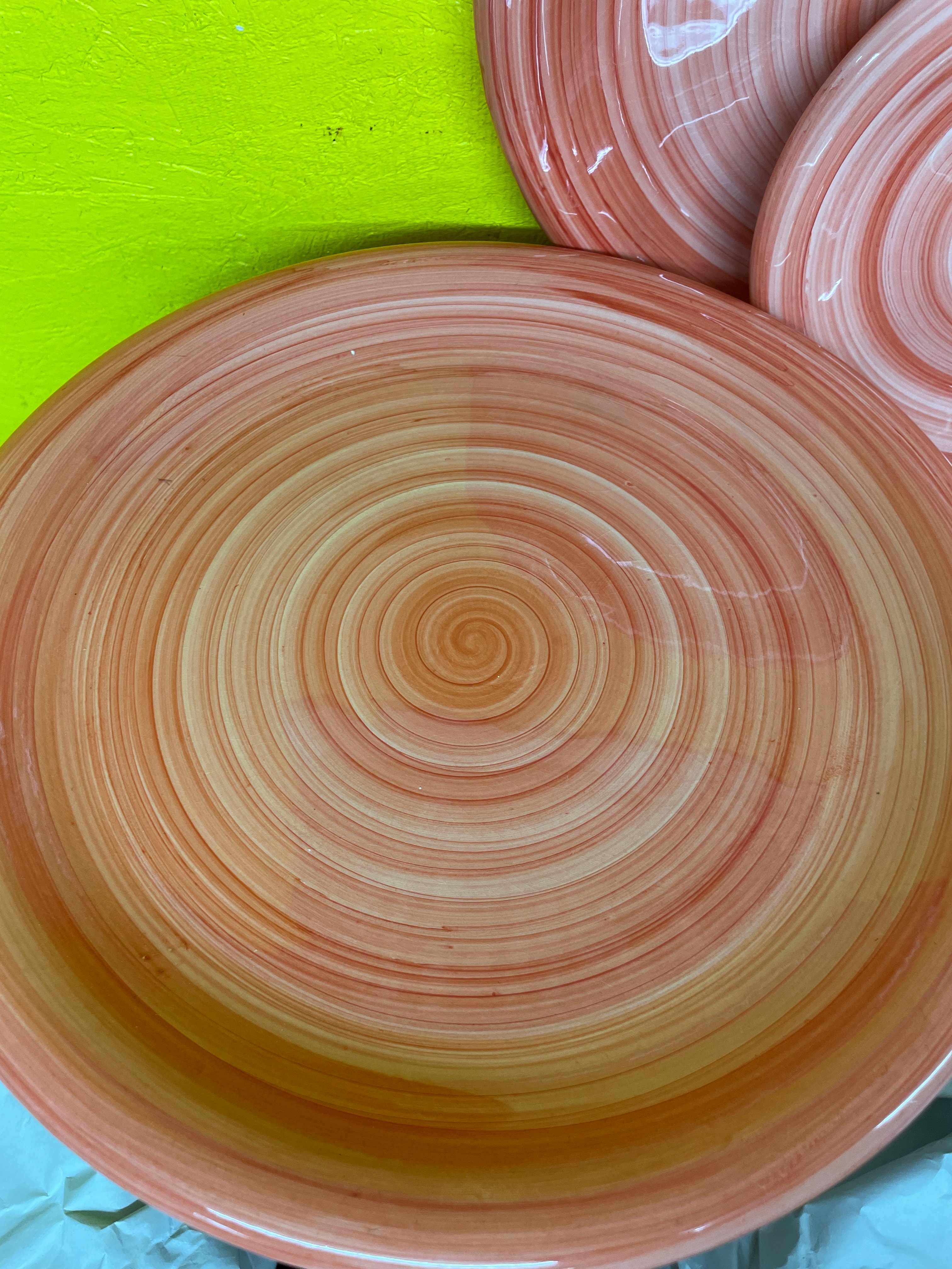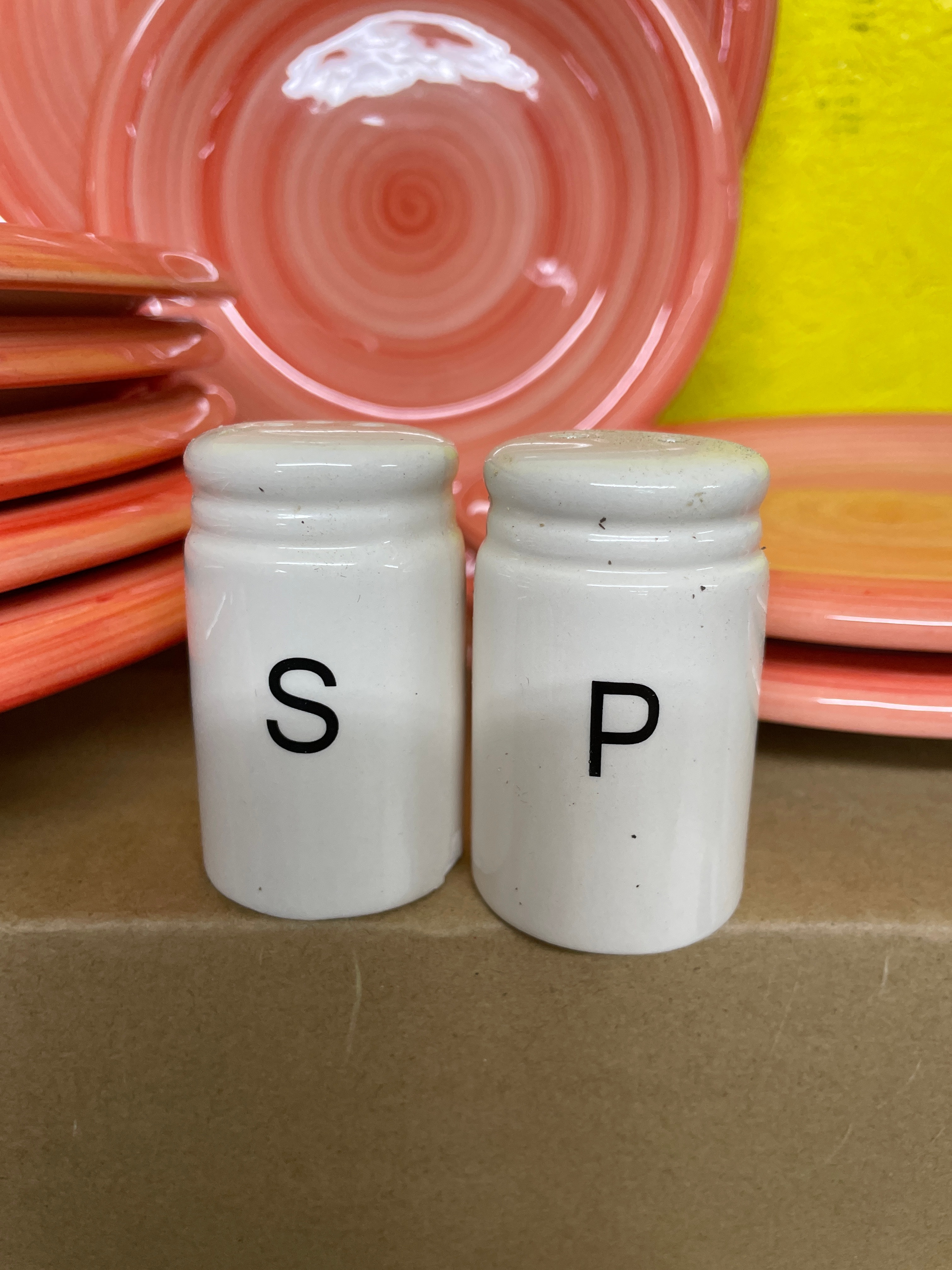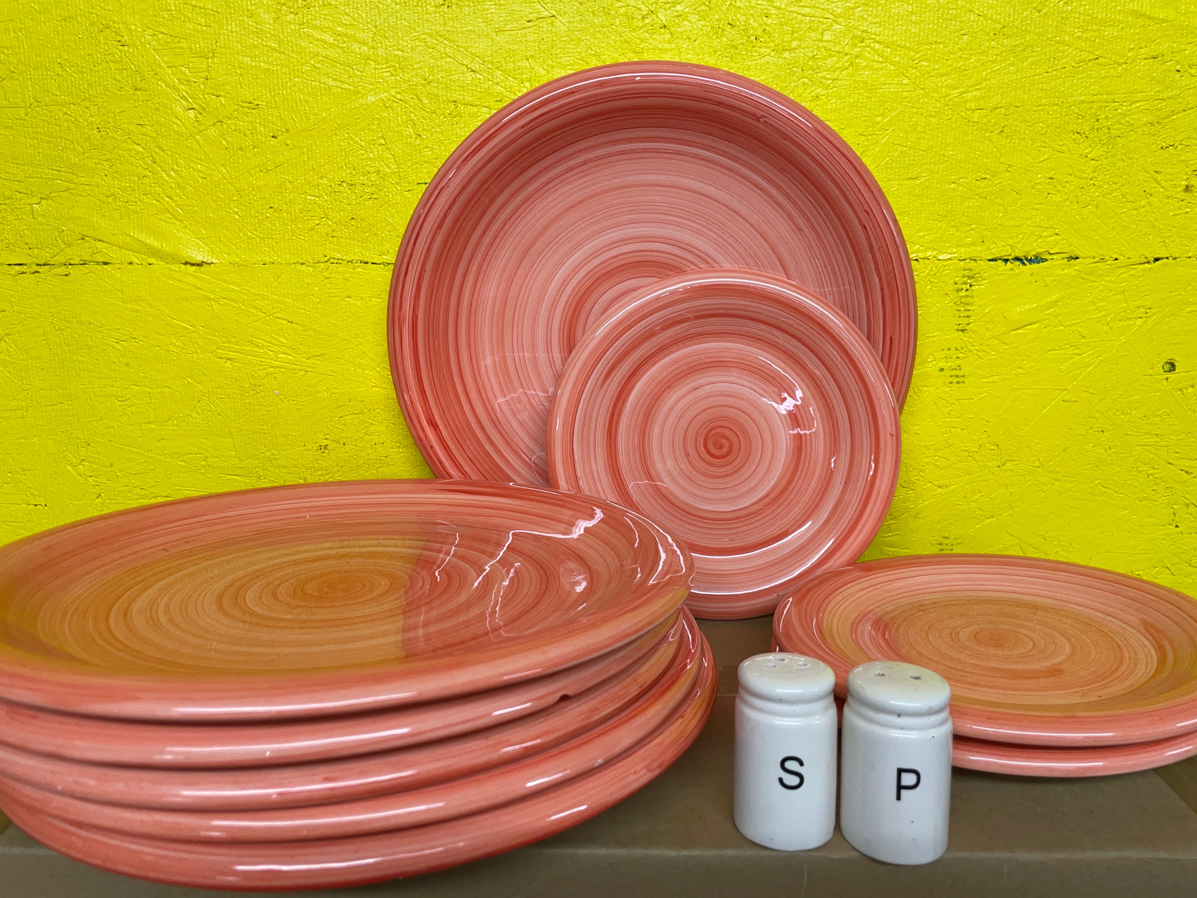 A contemporary dinnerware set by Tabletops Unlimited in the ‘Spirale Red’ pattern, featuring a distinctive hand-painted, concentric spiral design in shades of coral and peach. Manufactured in China, the ceramic pieces are marked as safe for dishwasher, oven, and microwave use. The collection includes various sizes of plates, accompanied by two white ceramic salt and pepper shakers, individually marked ‘S’ and ‘P’.