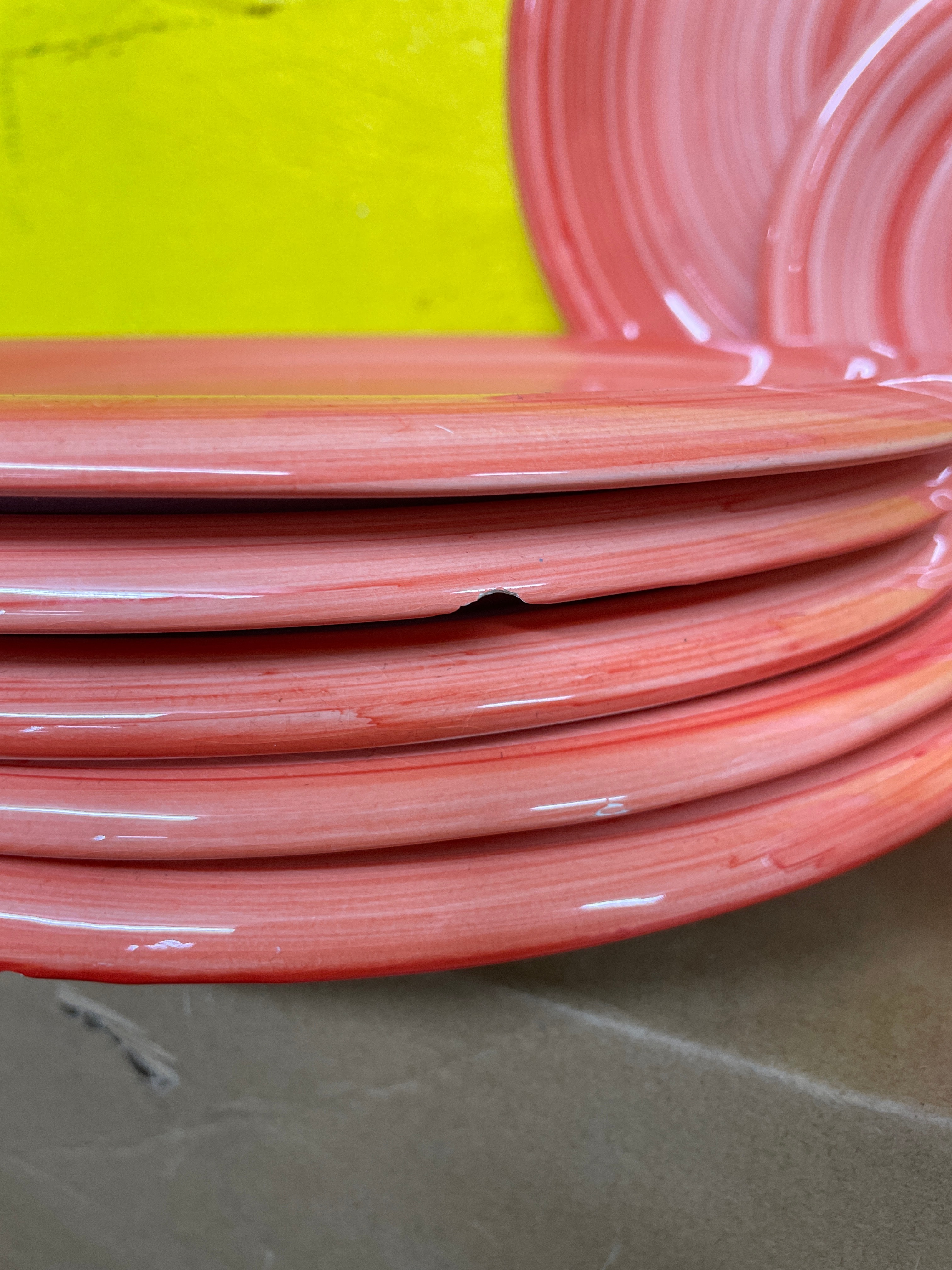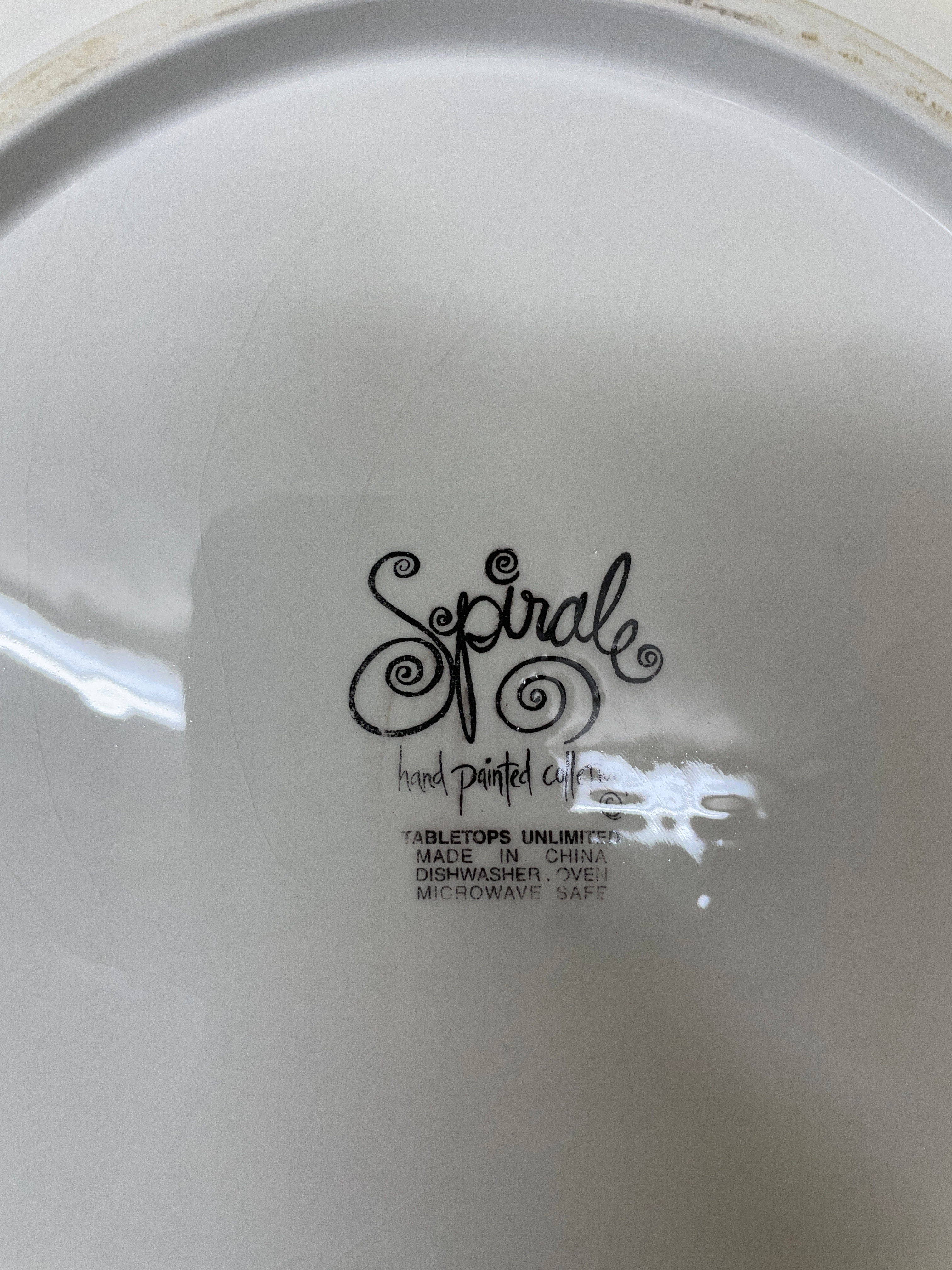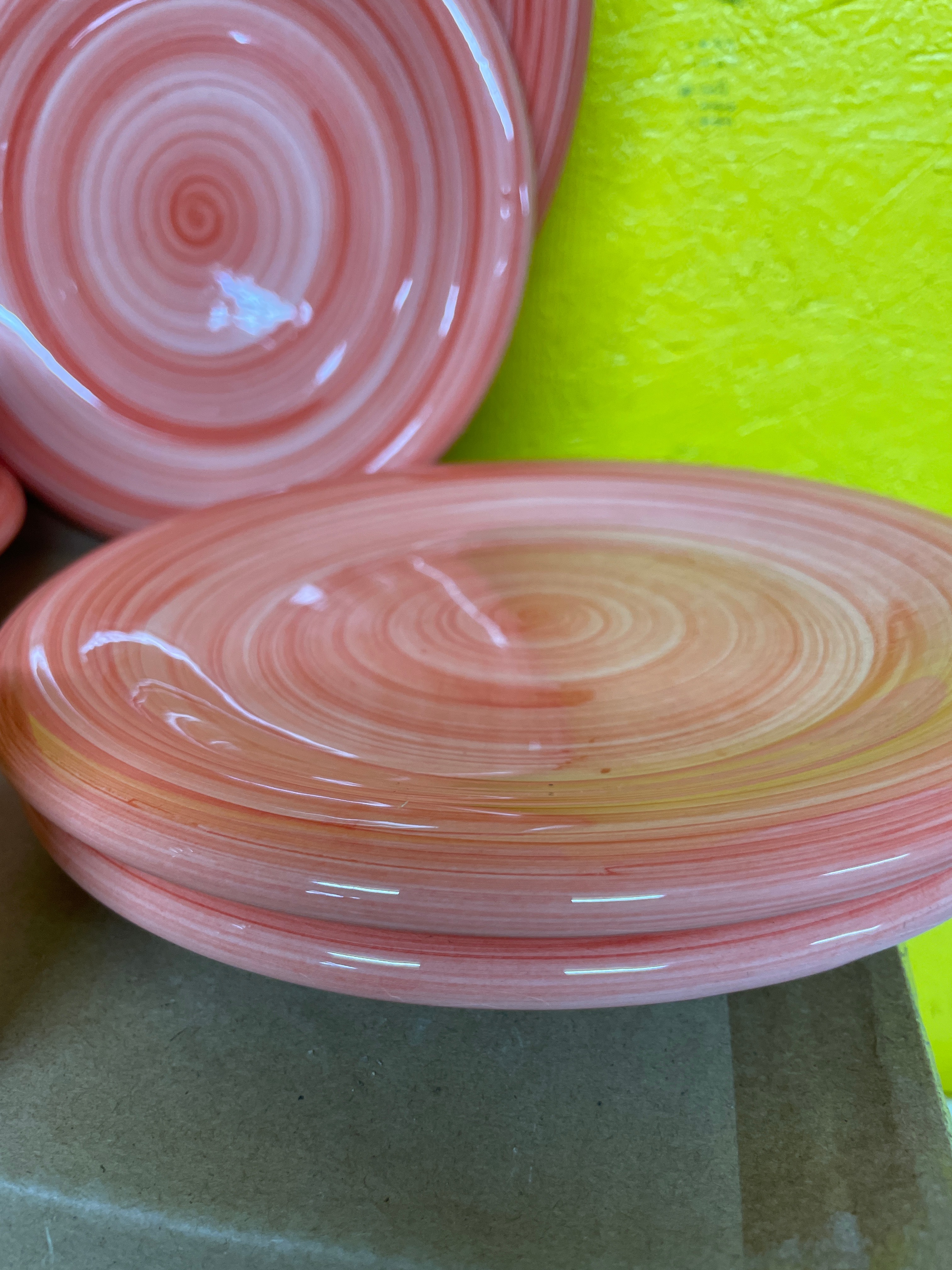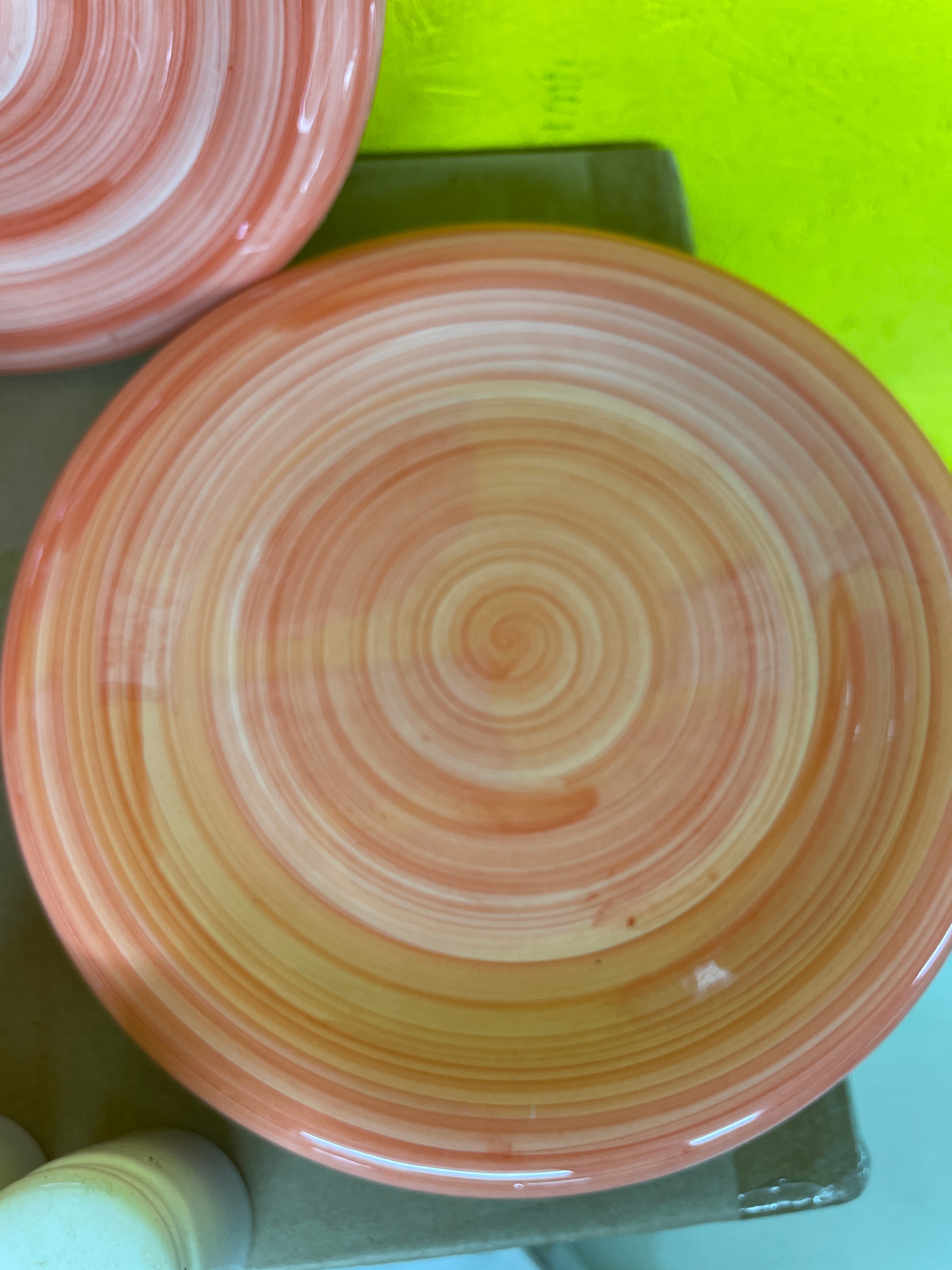 A contemporary dinnerware set by Tabletops Unlimited in the ‘Spirale Red’ pattern, featuring a distinctive hand-painted, concentric spiral design in shades of coral and peach. Manufactured in China, the ceramic pieces are marked as safe for dishwasher, oven, and microwave use. The collection includes various sizes of plates, accompanied by two white ceramic salt and pepper shakers, individually marked ‘S’ and ‘P’.