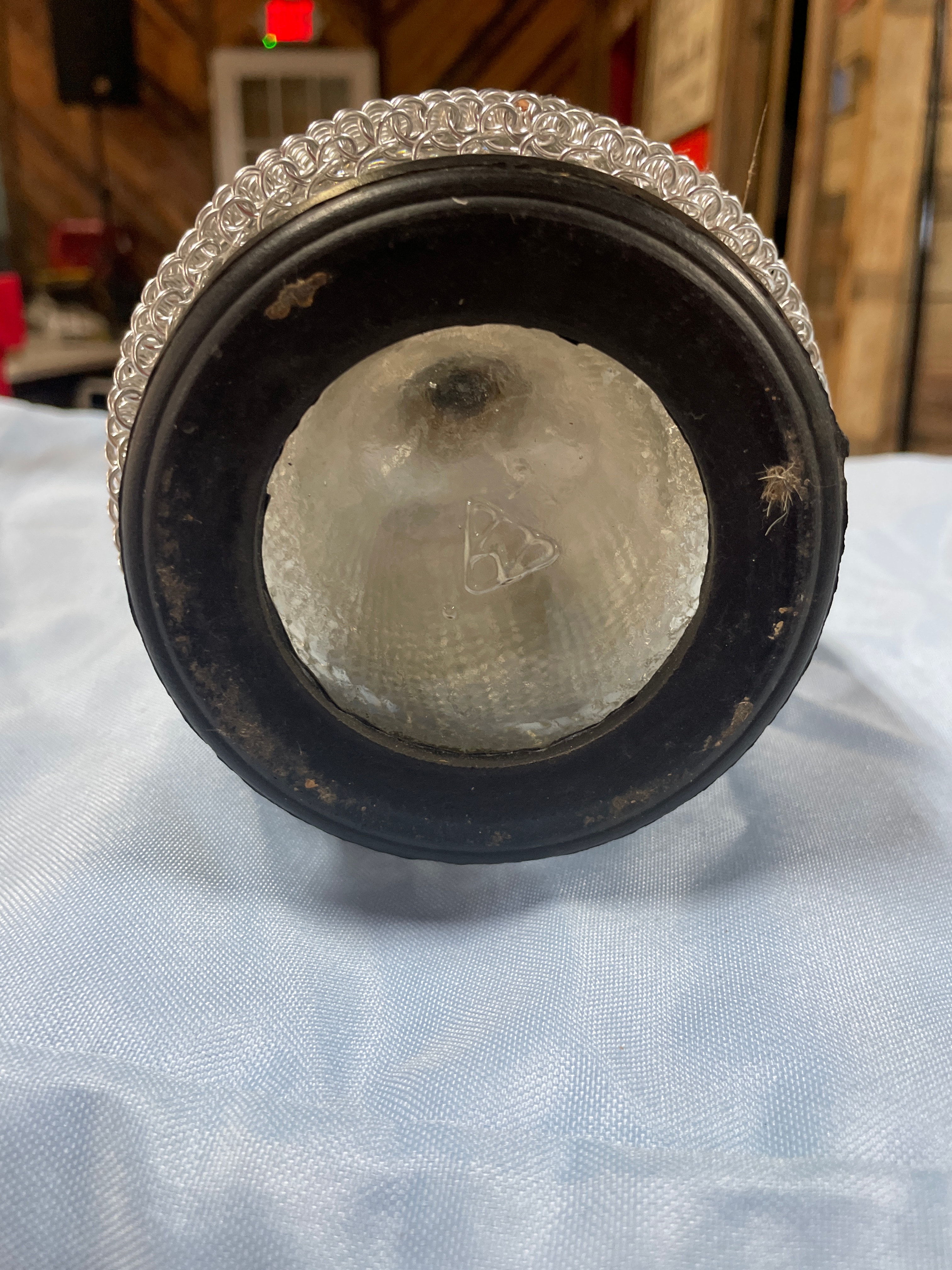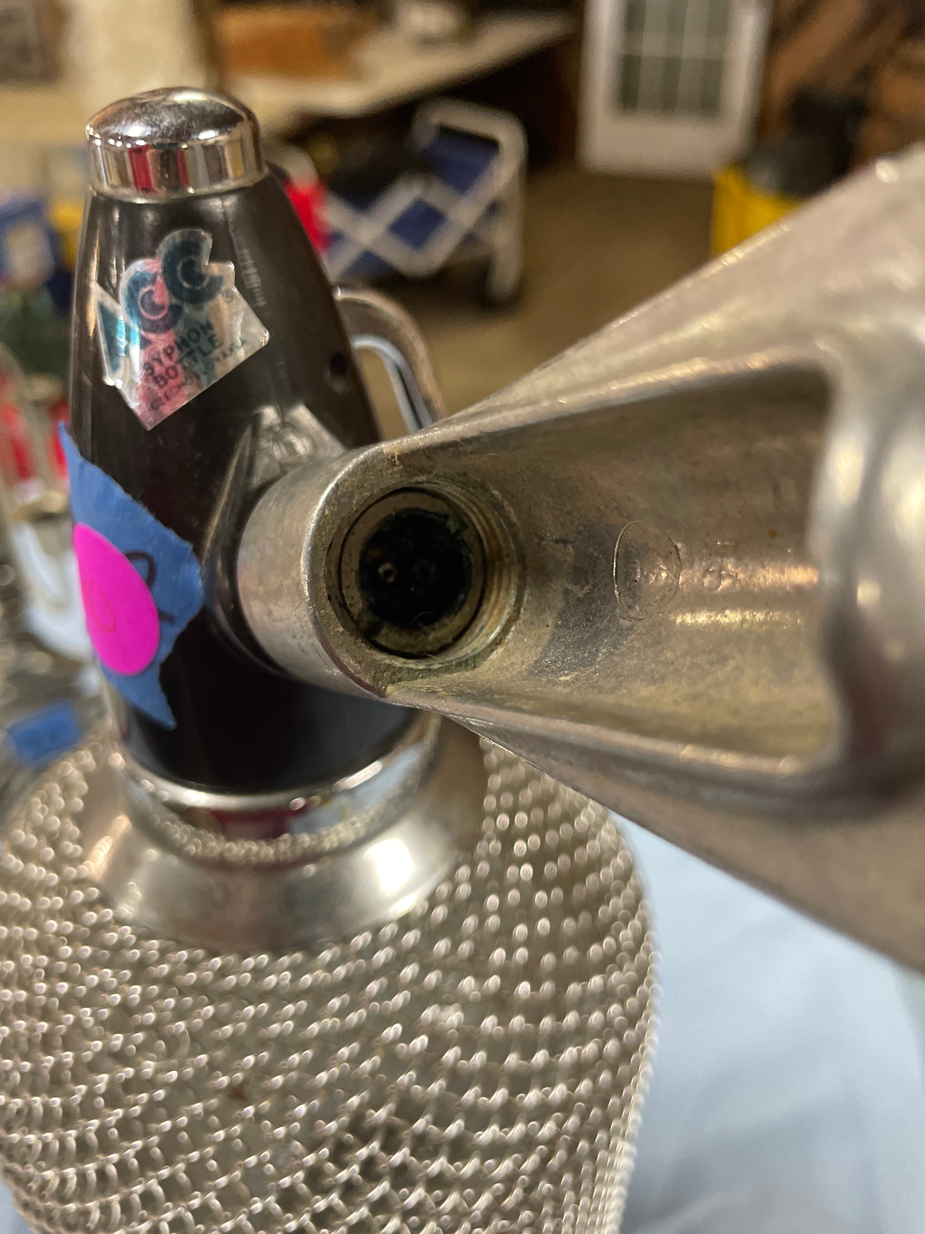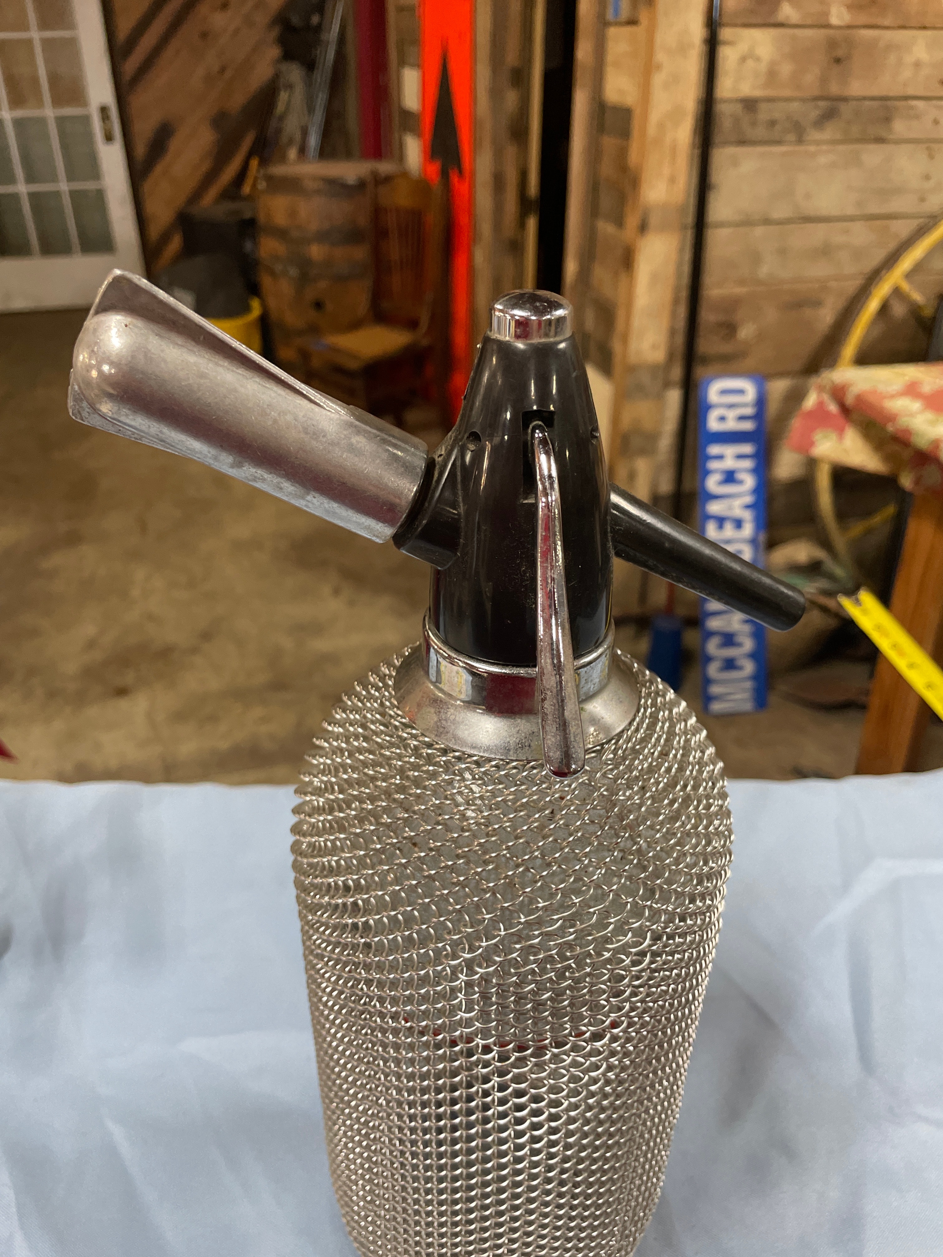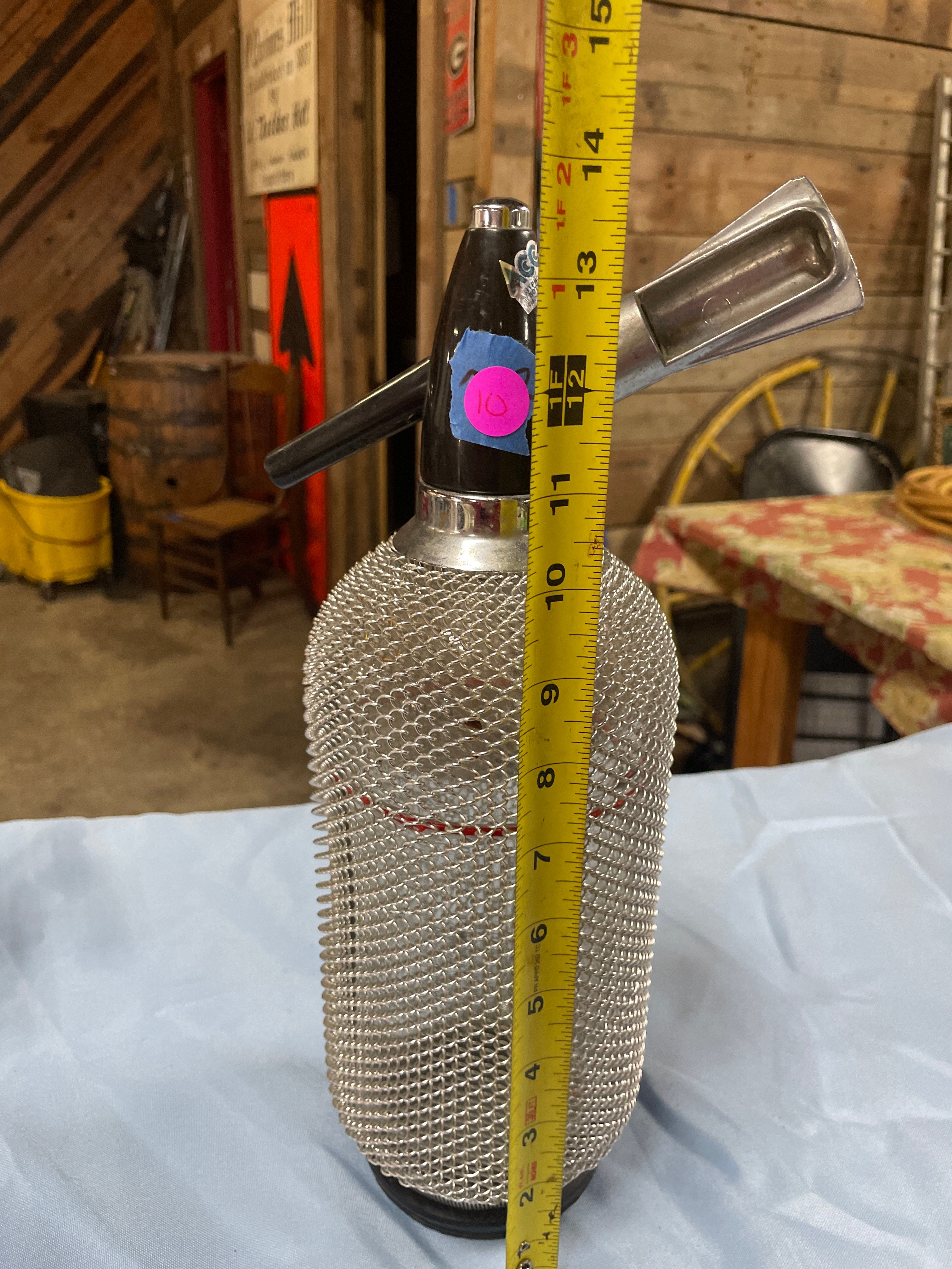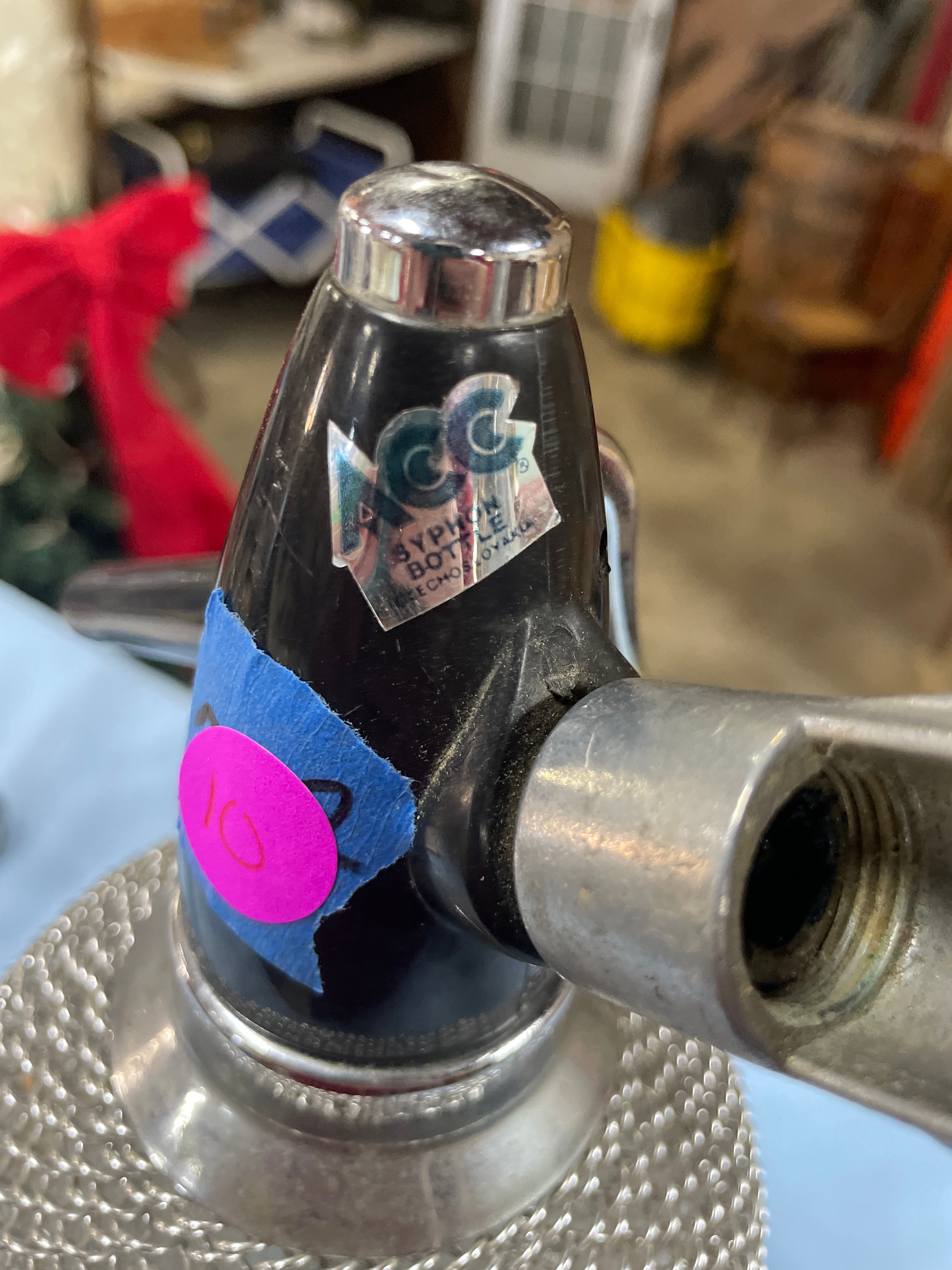 A single silver metal mesh and black seltzer bottle, labeled “AGC SYPHON BOTTLE CZECHOSLOVAKIA” on the black top and embossed with a “BB” symbol on its clear glass bottom, measures approximately 13 inches tall.