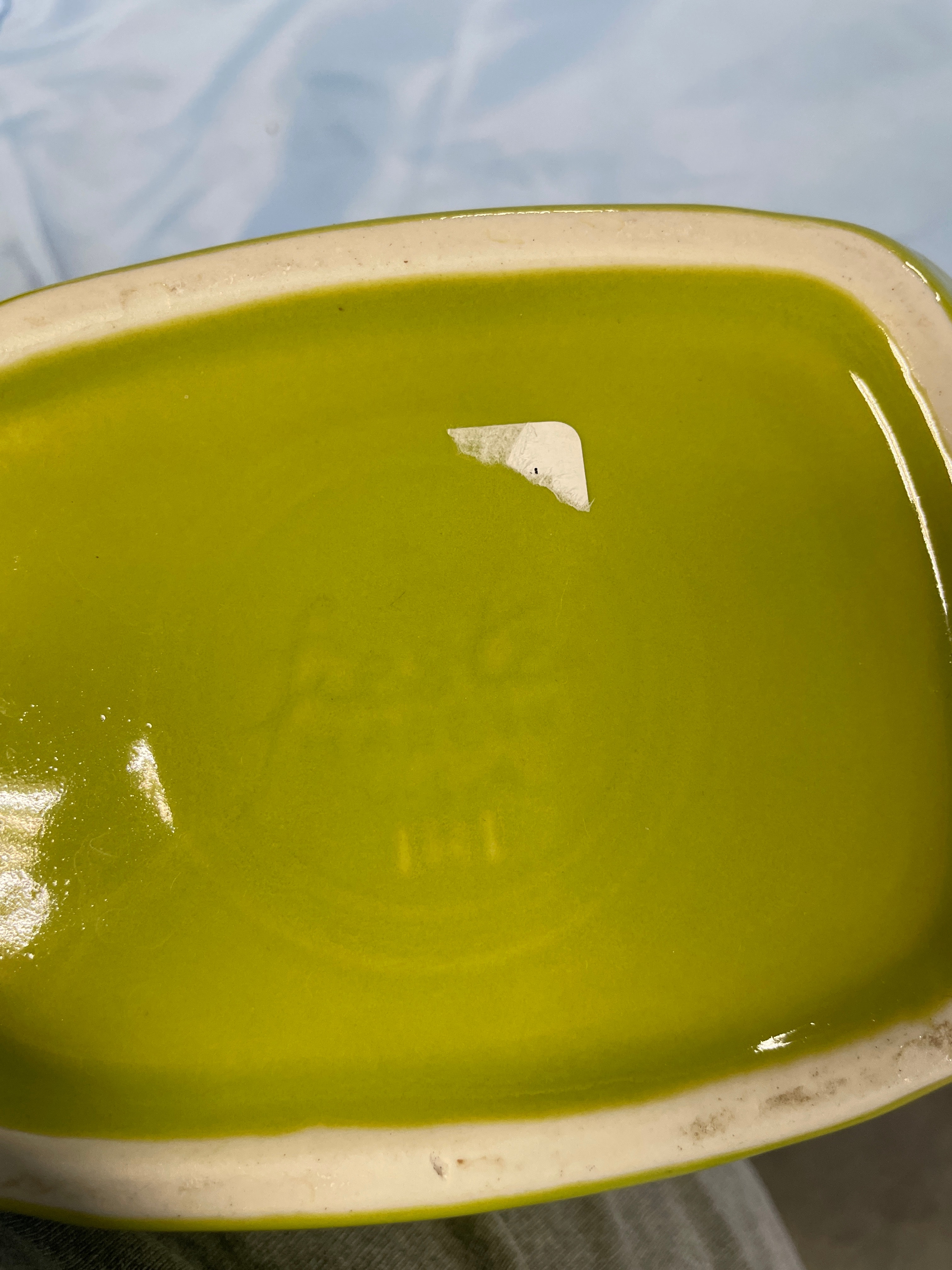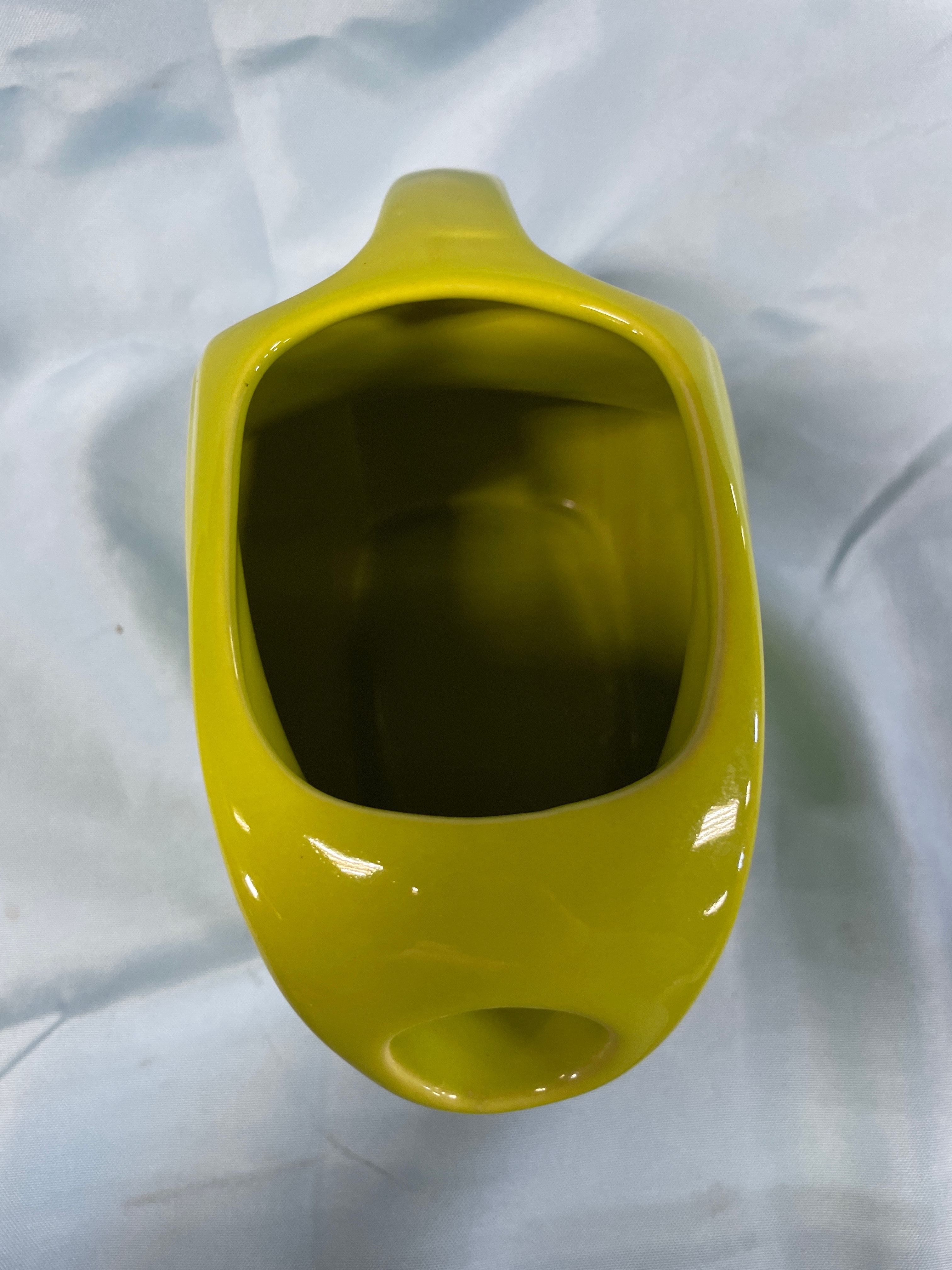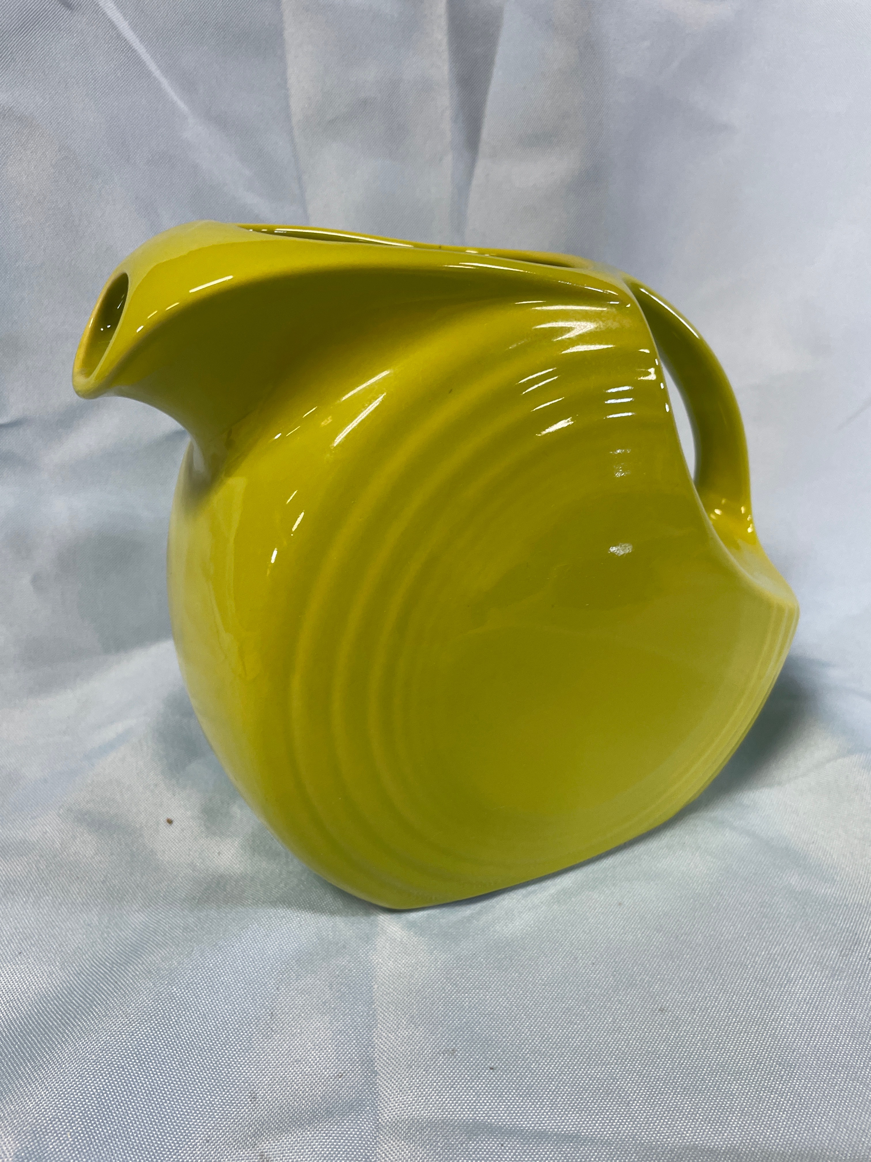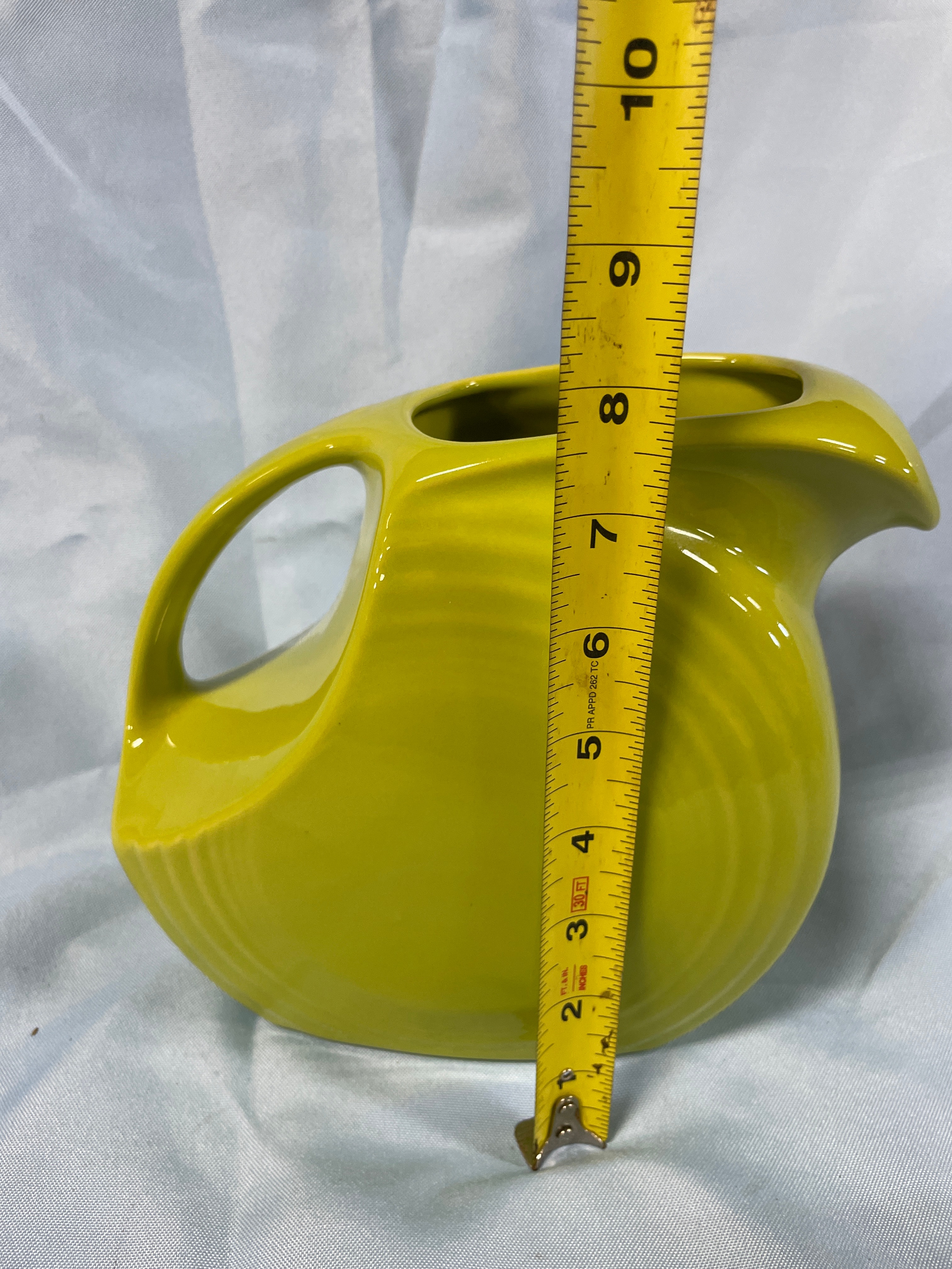 A chartreuse/yellow-green ceramic pitcher with ‘Fiesta’ and ‘191’ impressed on the bottom, measuring approximately 7-1/4 inches tall.
