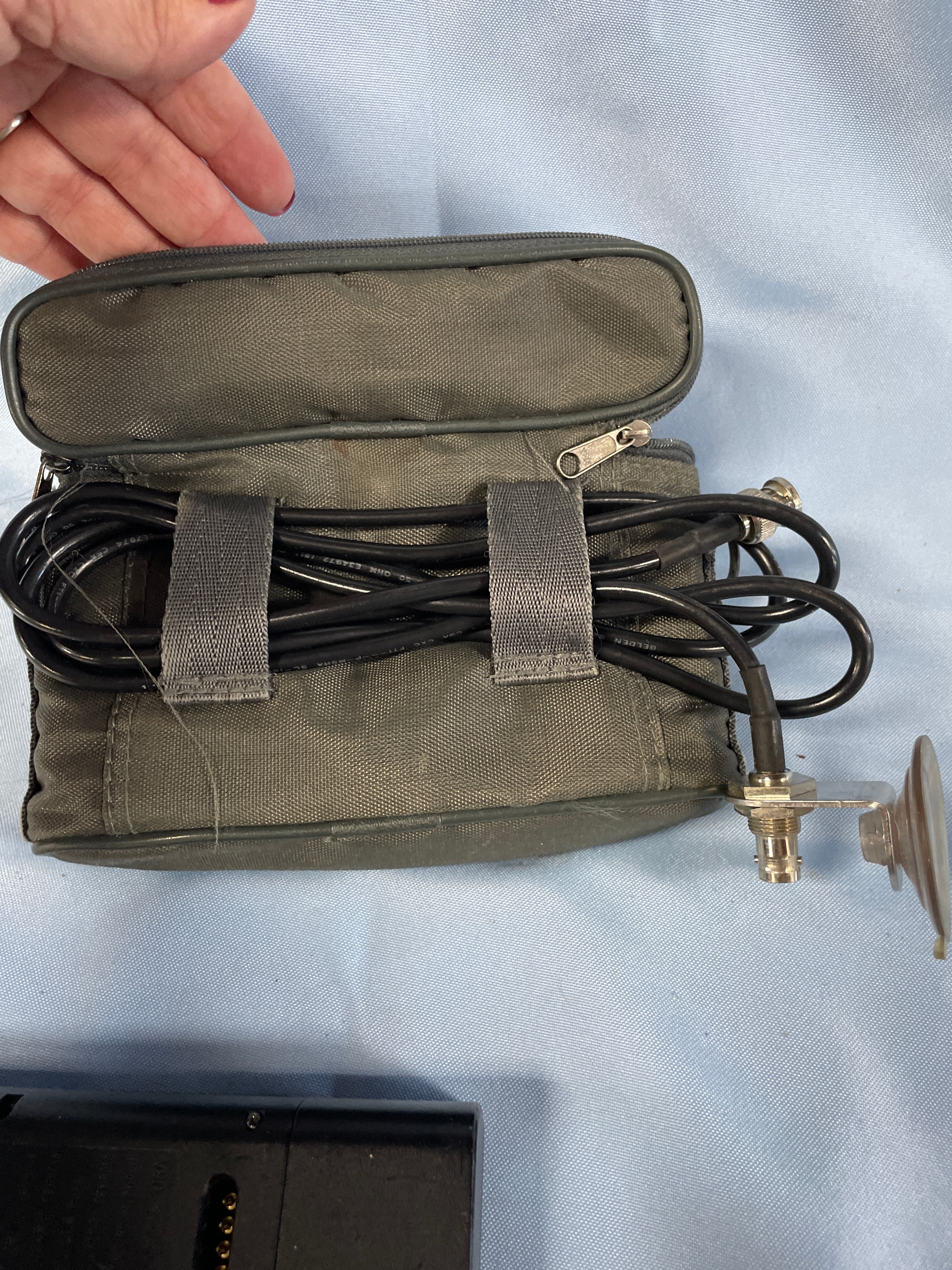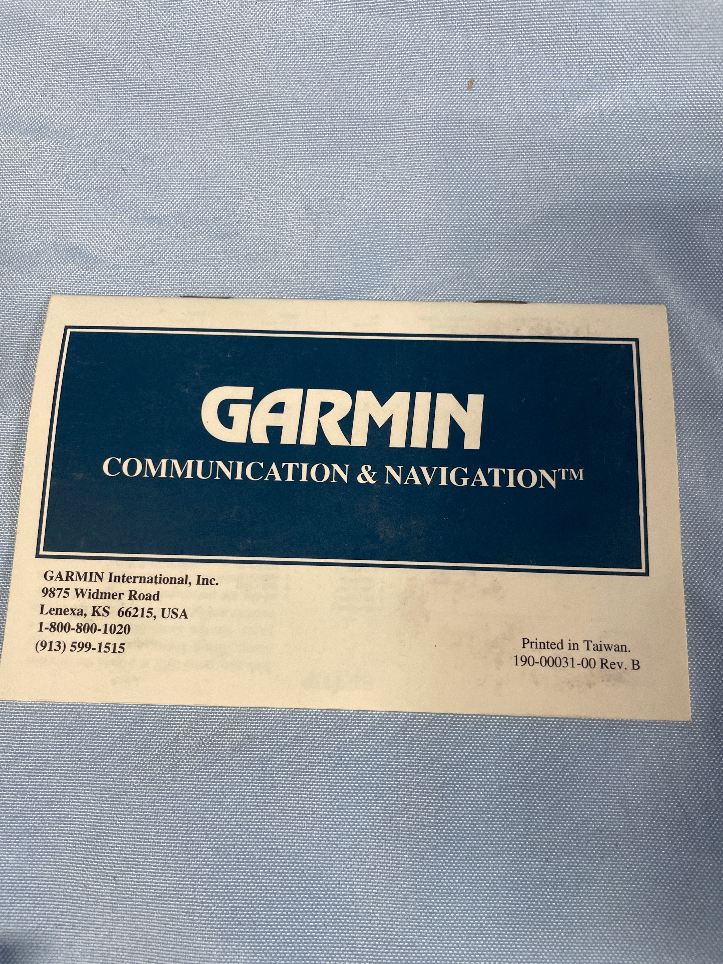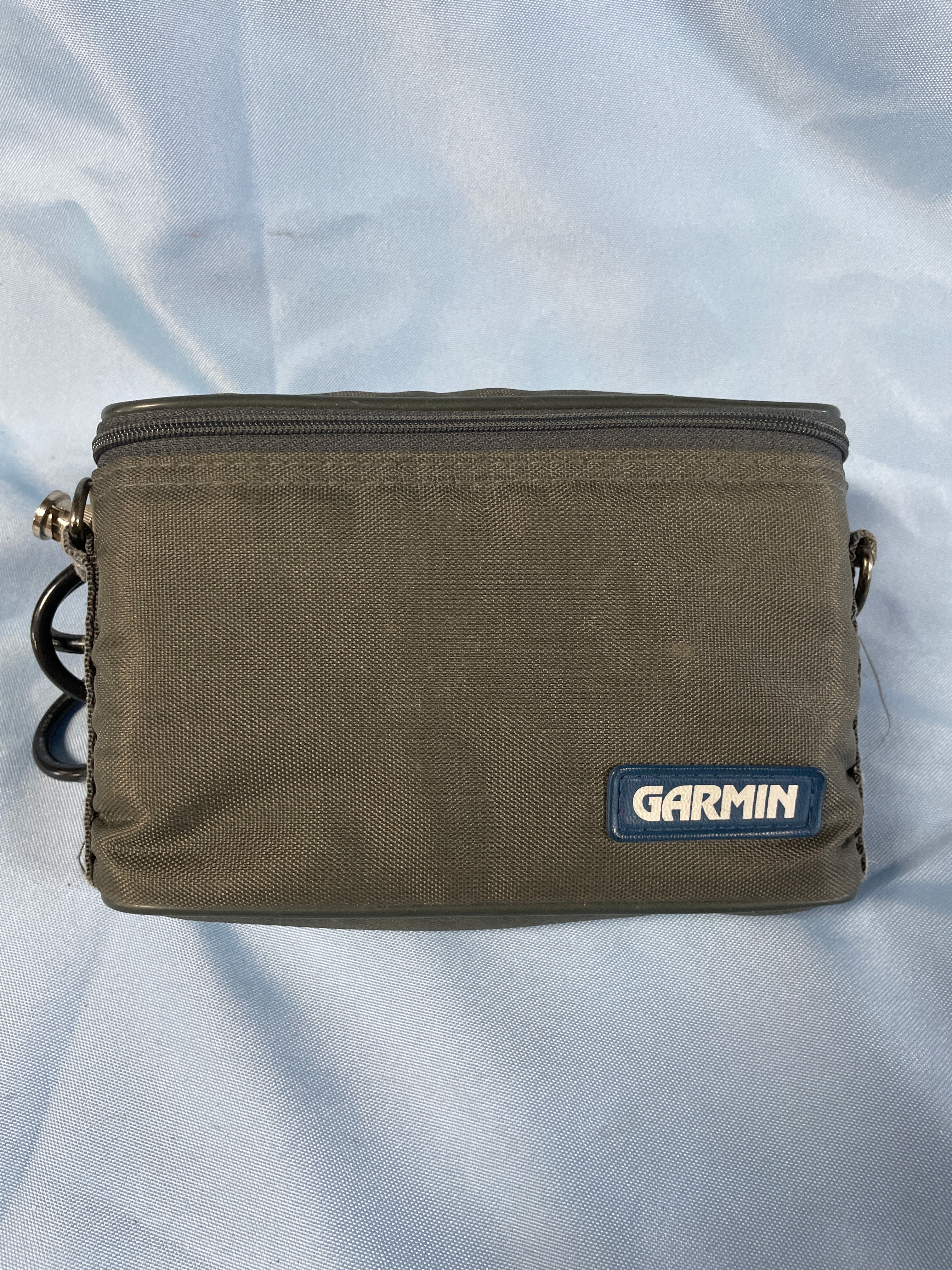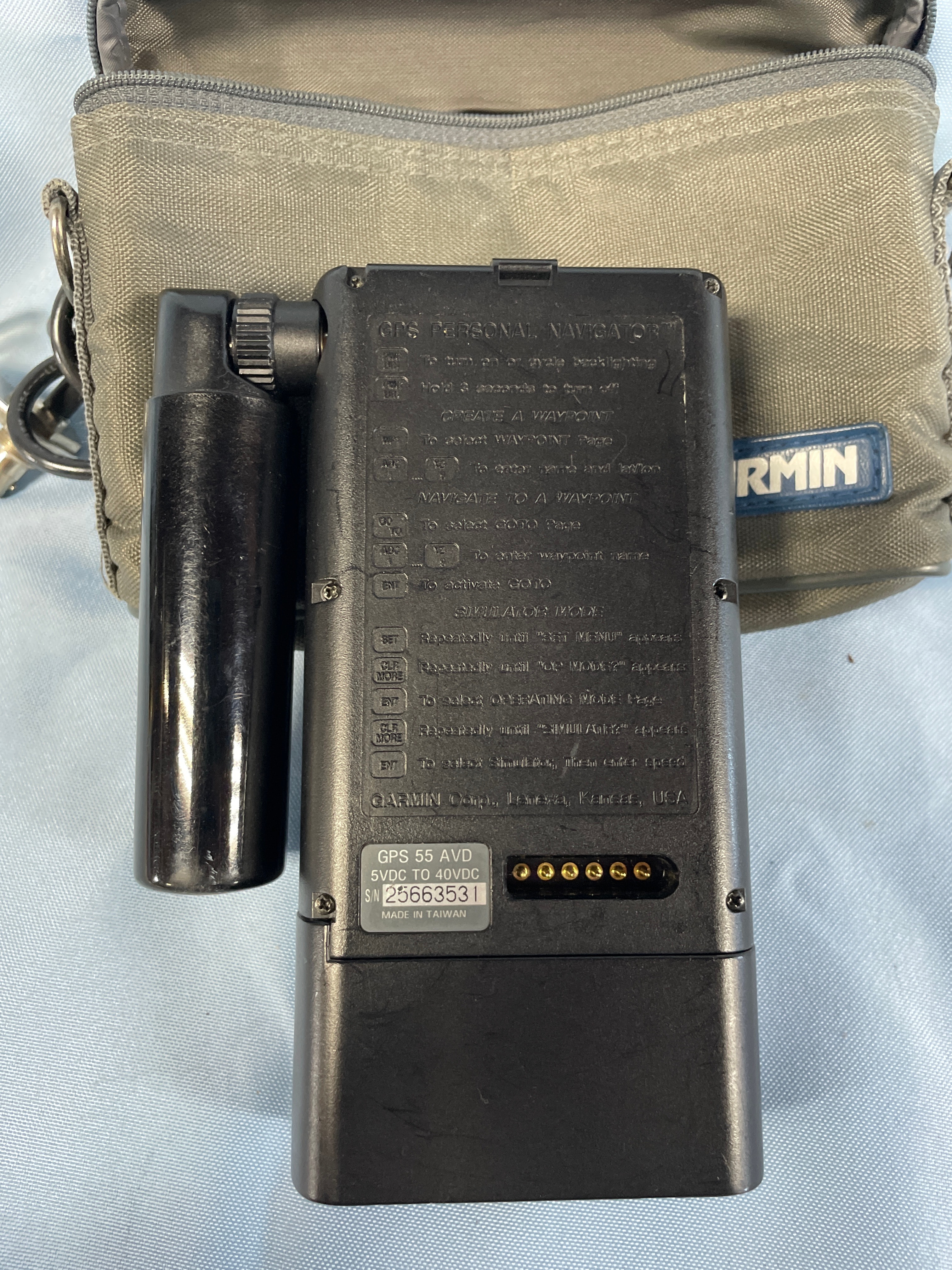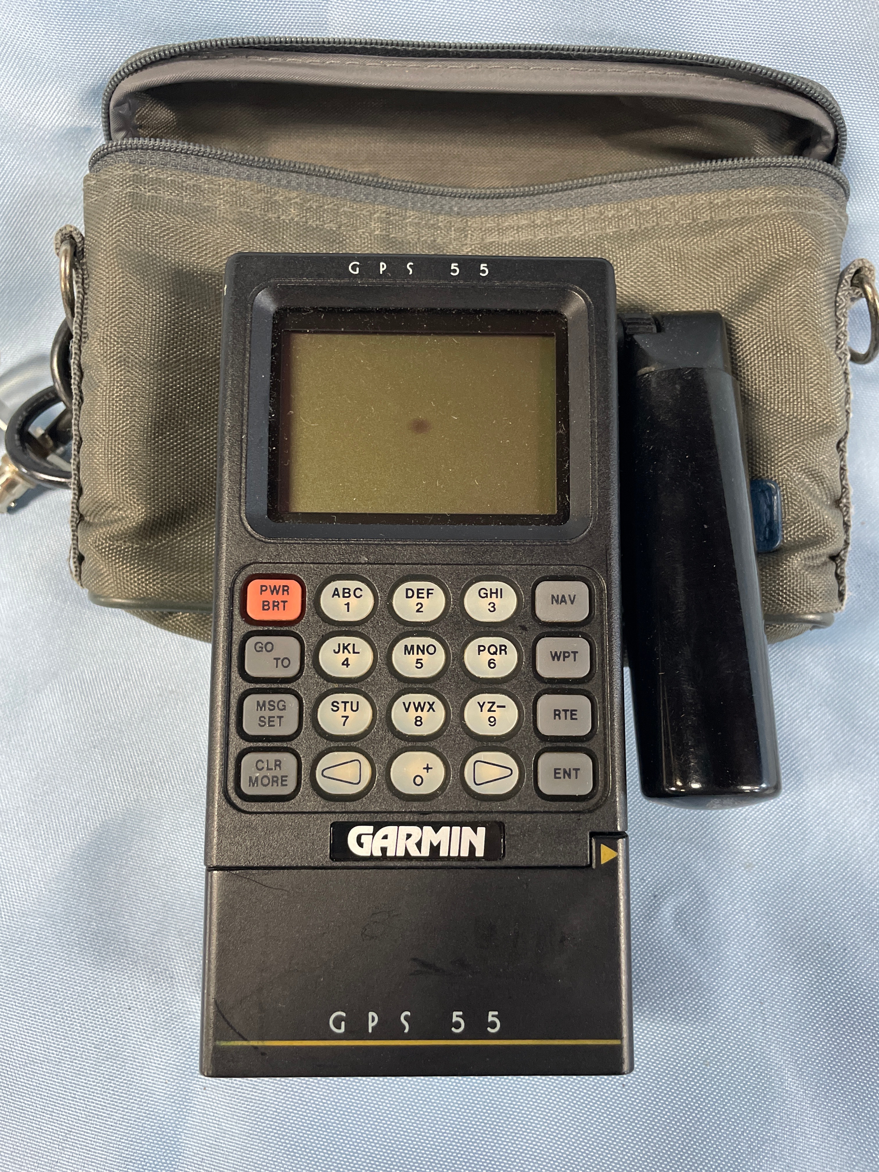 A black Garmin GPS 55 personal navigator (SN 556353) with a gray screen and labeled buttons, an olive green “GARMIN” zippered case, a black cable with suction cup, and a “GARMIN COMMUNICATION & NAVIGATION” manual.
