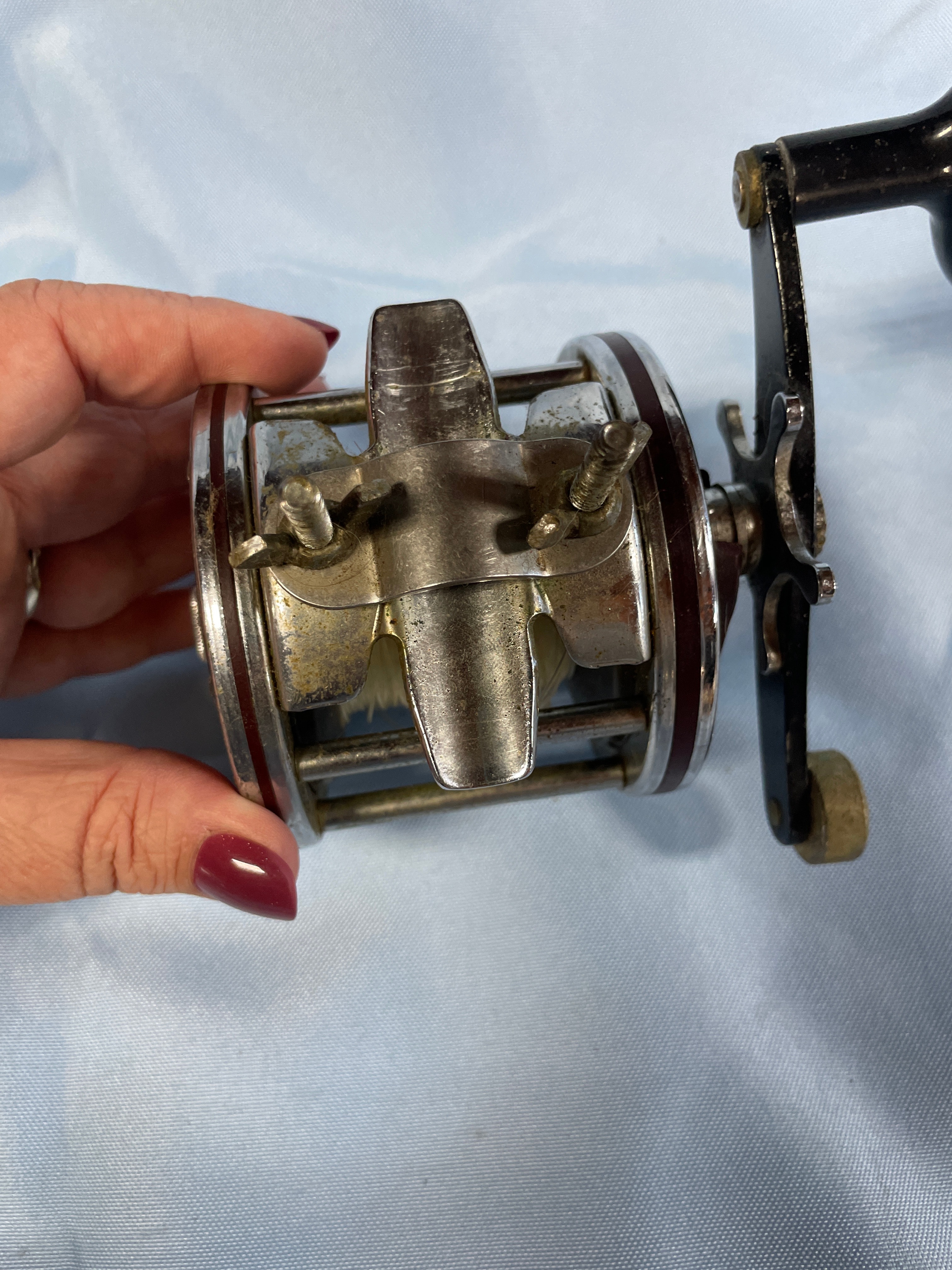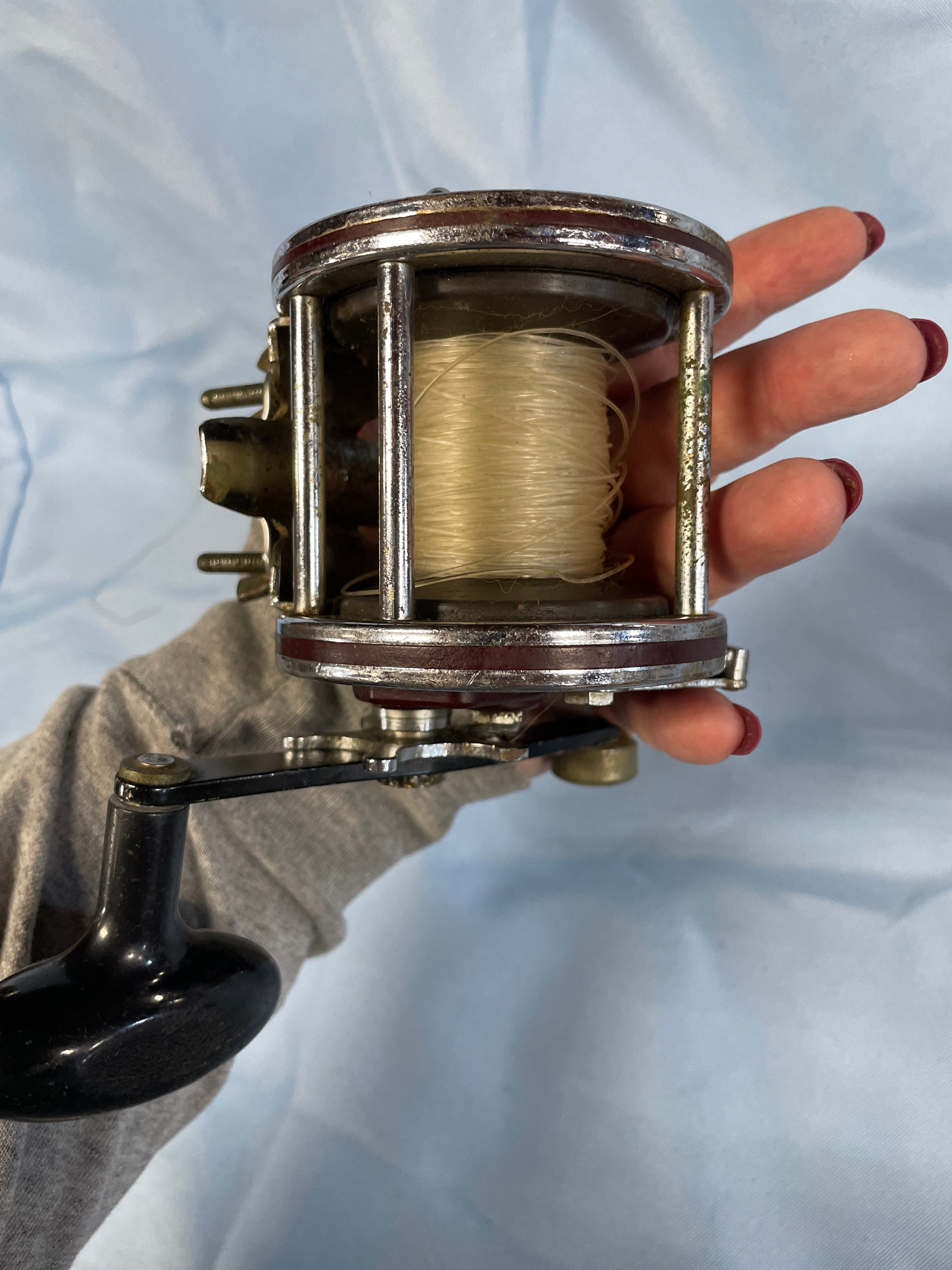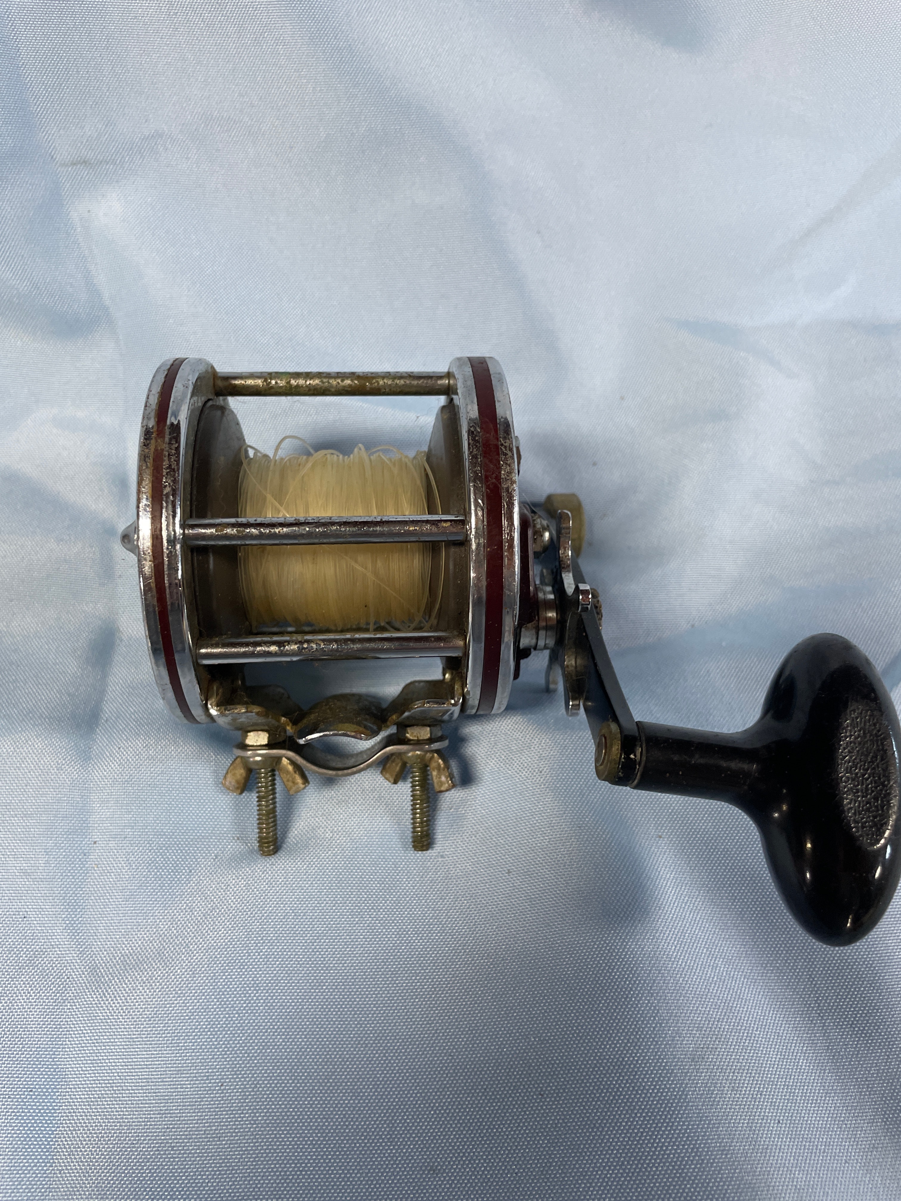 A silver, dark red, and black fishing reel with light yellow line, marked ‘PENN REEL 3/0 H’, ‘SPECIAL SENATOR’, and ‘USA’.