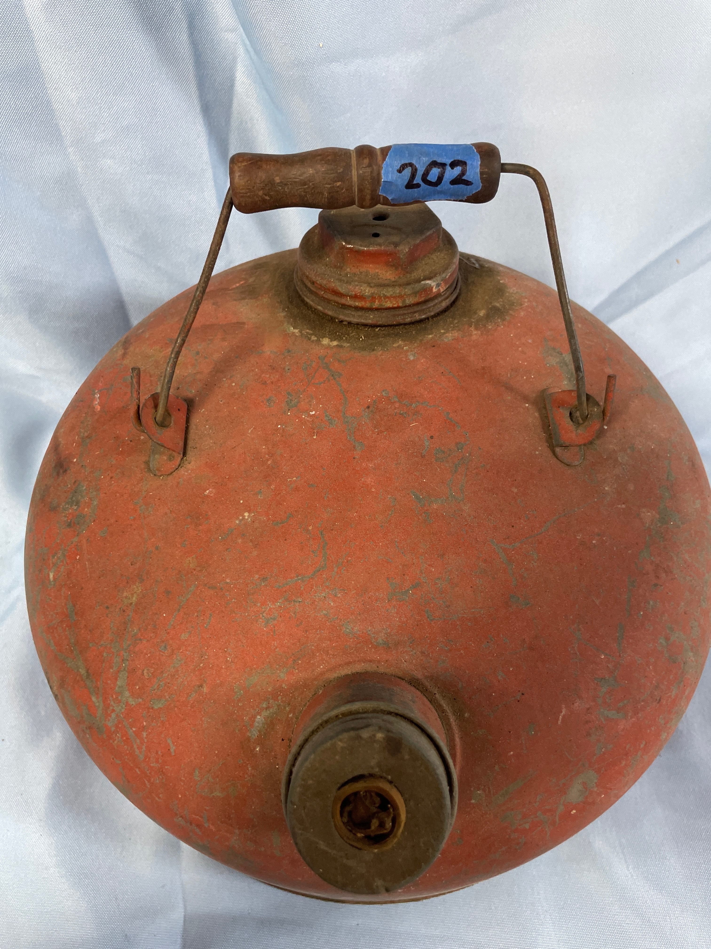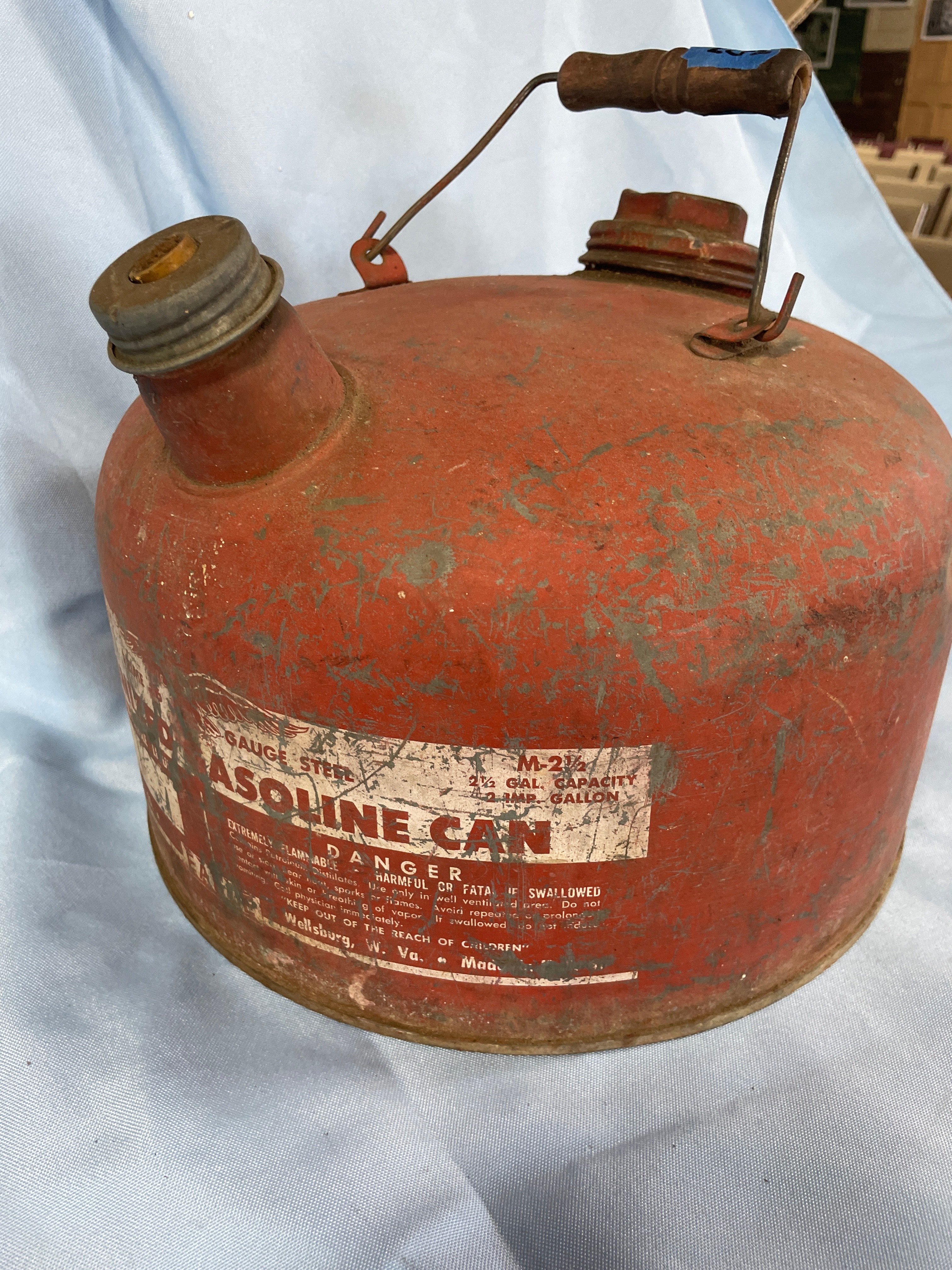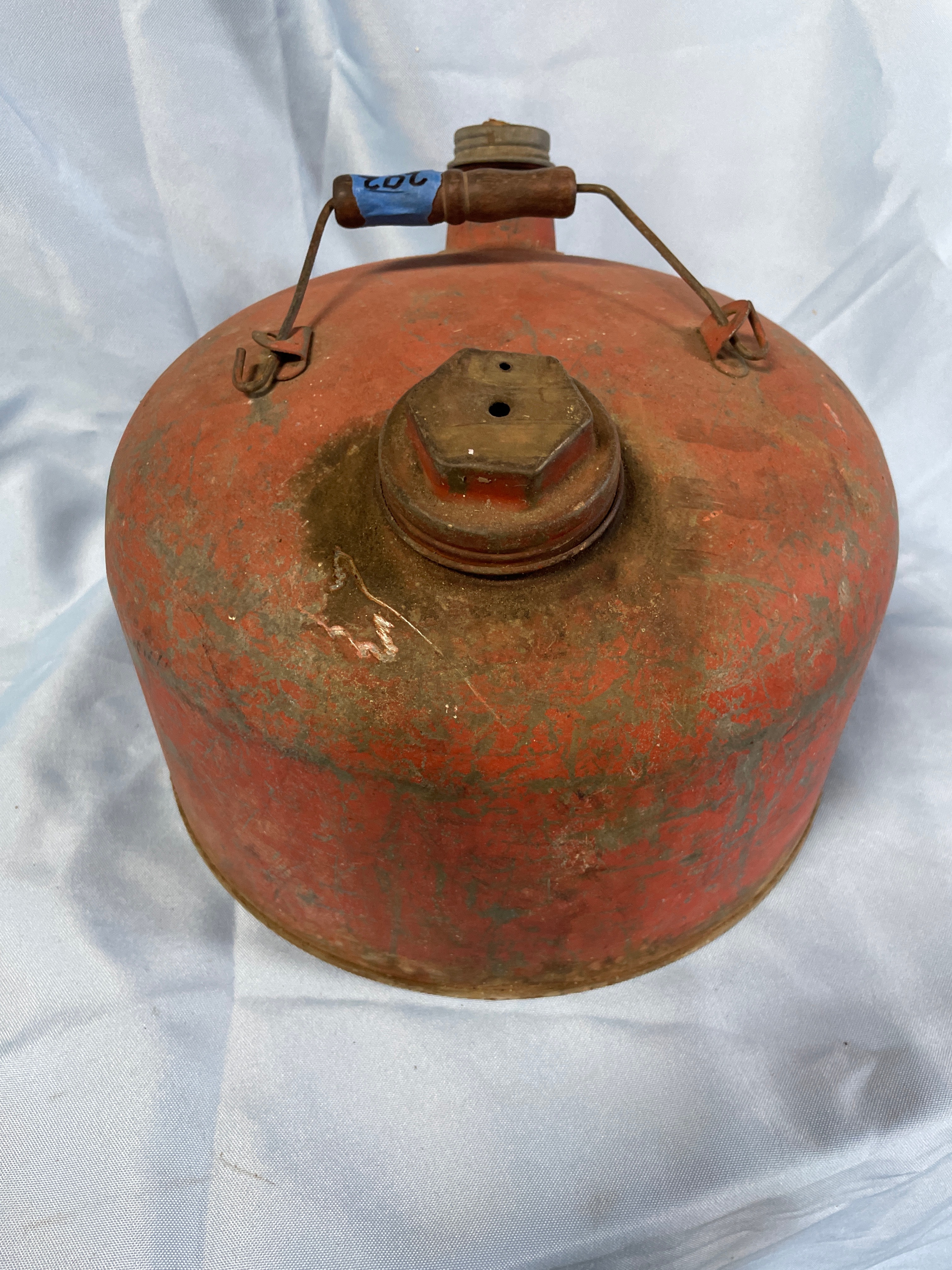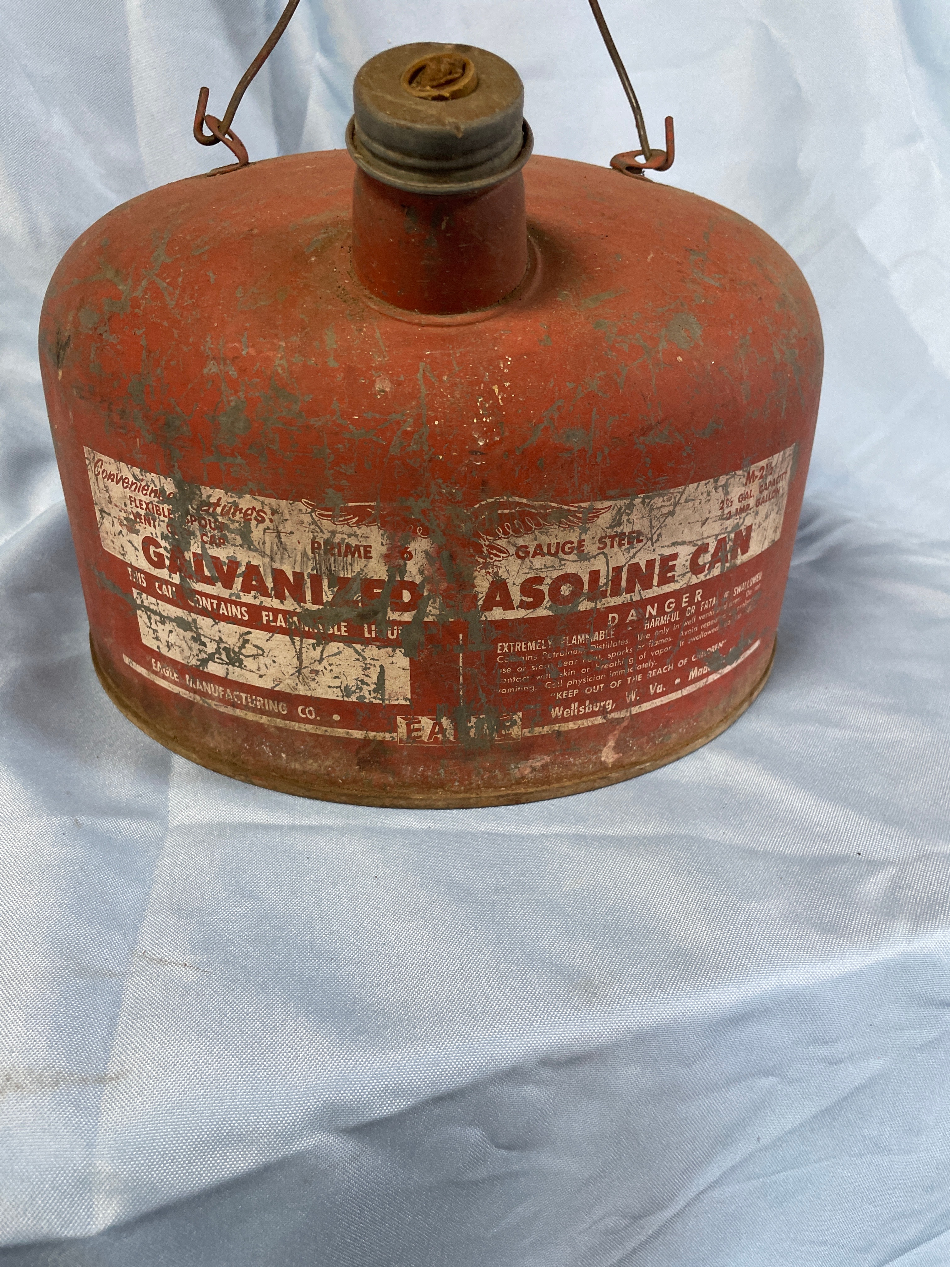 ** A weathered, red metal gasoline can with a wooden handle, labeled "GAUGE STEEL, " "M-2½, " "2½ GAL. CAPACITY, " "GALVANIZED GASOLINE CAN, " and "EARLY MANUFACTURING CO."